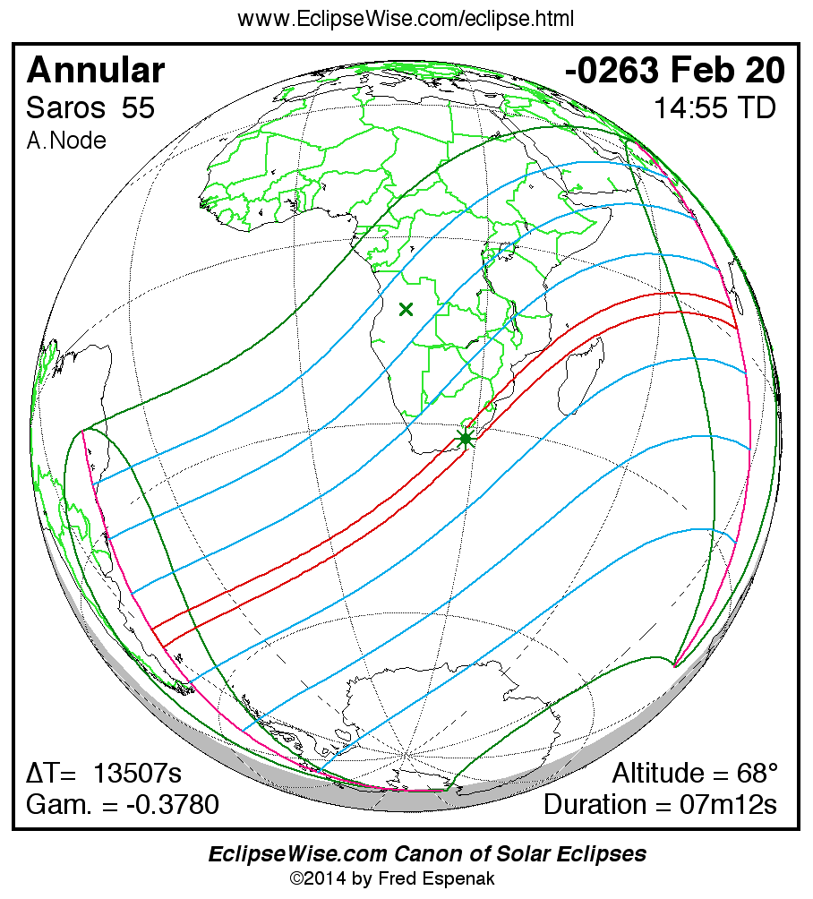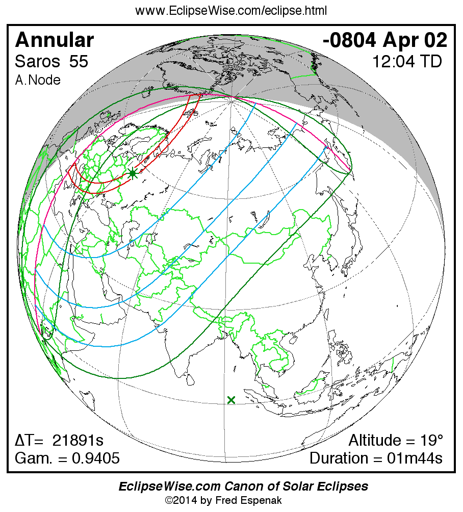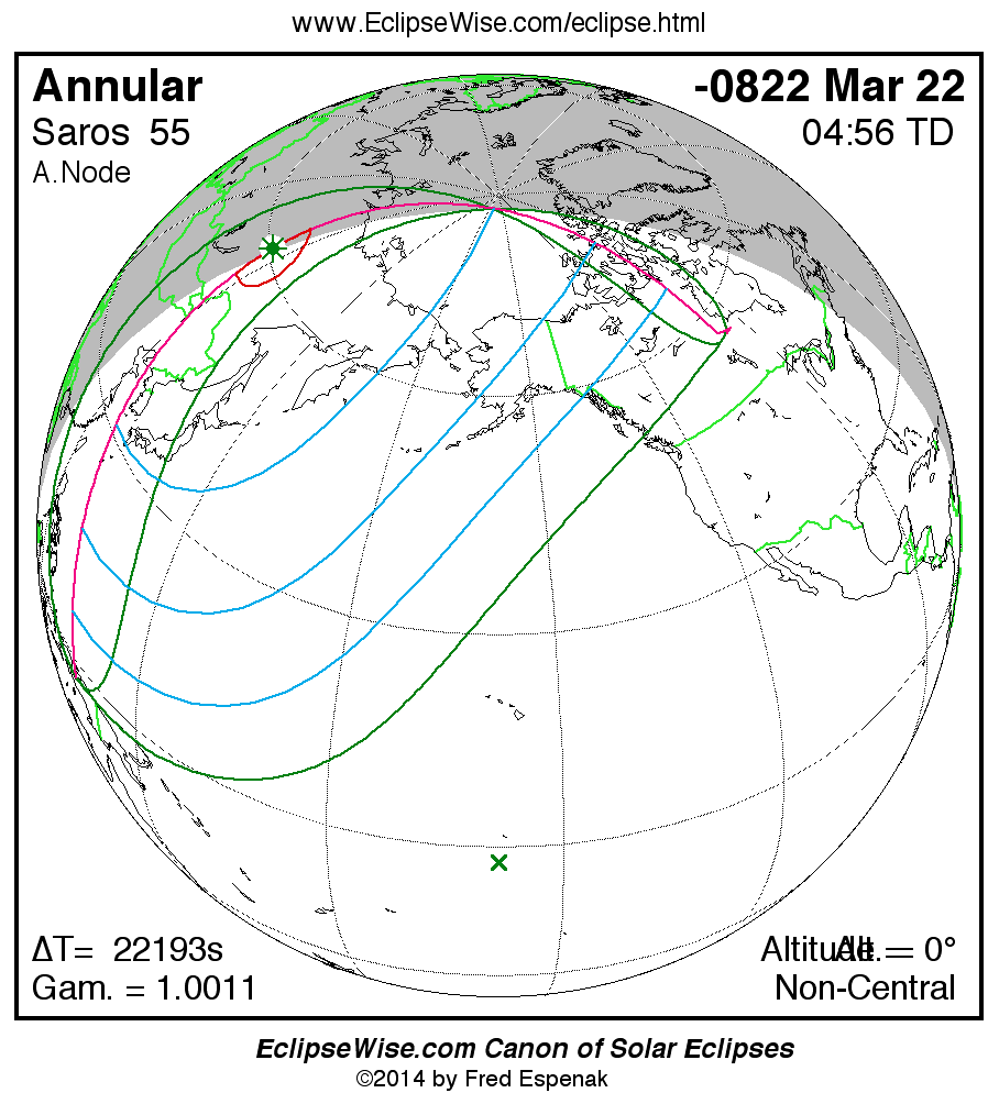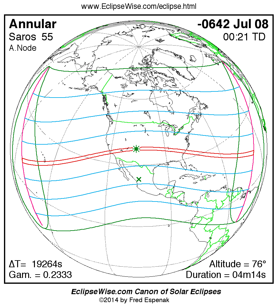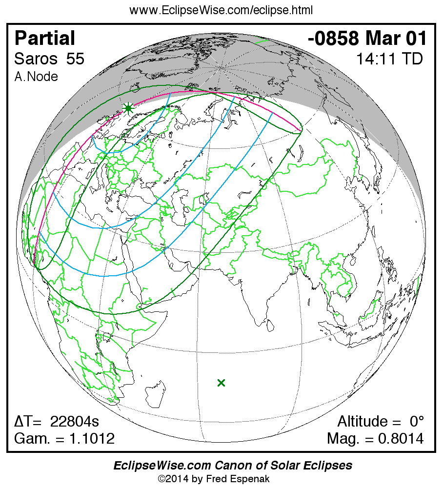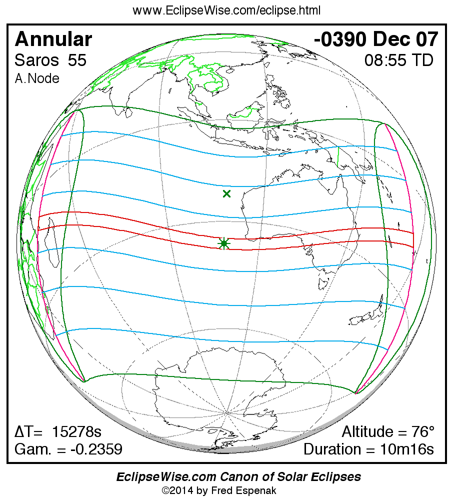 A panorama of all solar eclipses belonging to Saros 55 is presented here. Each map depicts the geographic region of visibility for a single eclipse. For central eclipses, the total or annular path is plotted in either blue (total) or red (annular). The date and time is given for the instant of Greatest Eclipse. Every map serves as a hyperlink to the EclipseWise Prime page for that eclipse where a larger map and complete details for the eclipse can be found. Visit the Key to Solar Eclipse Maps for a detailed explanation of these maps. Near the bottom of the page are a series of hyperlinks for more on solar eclipses.