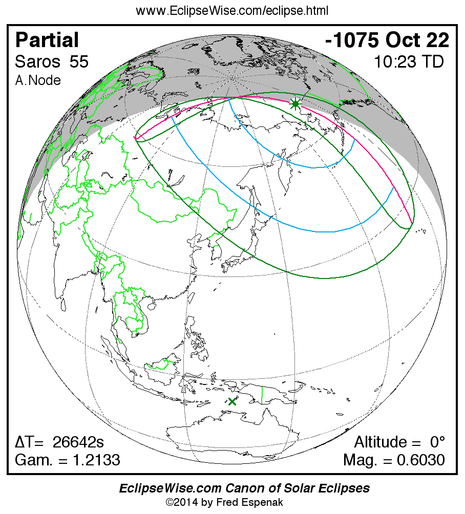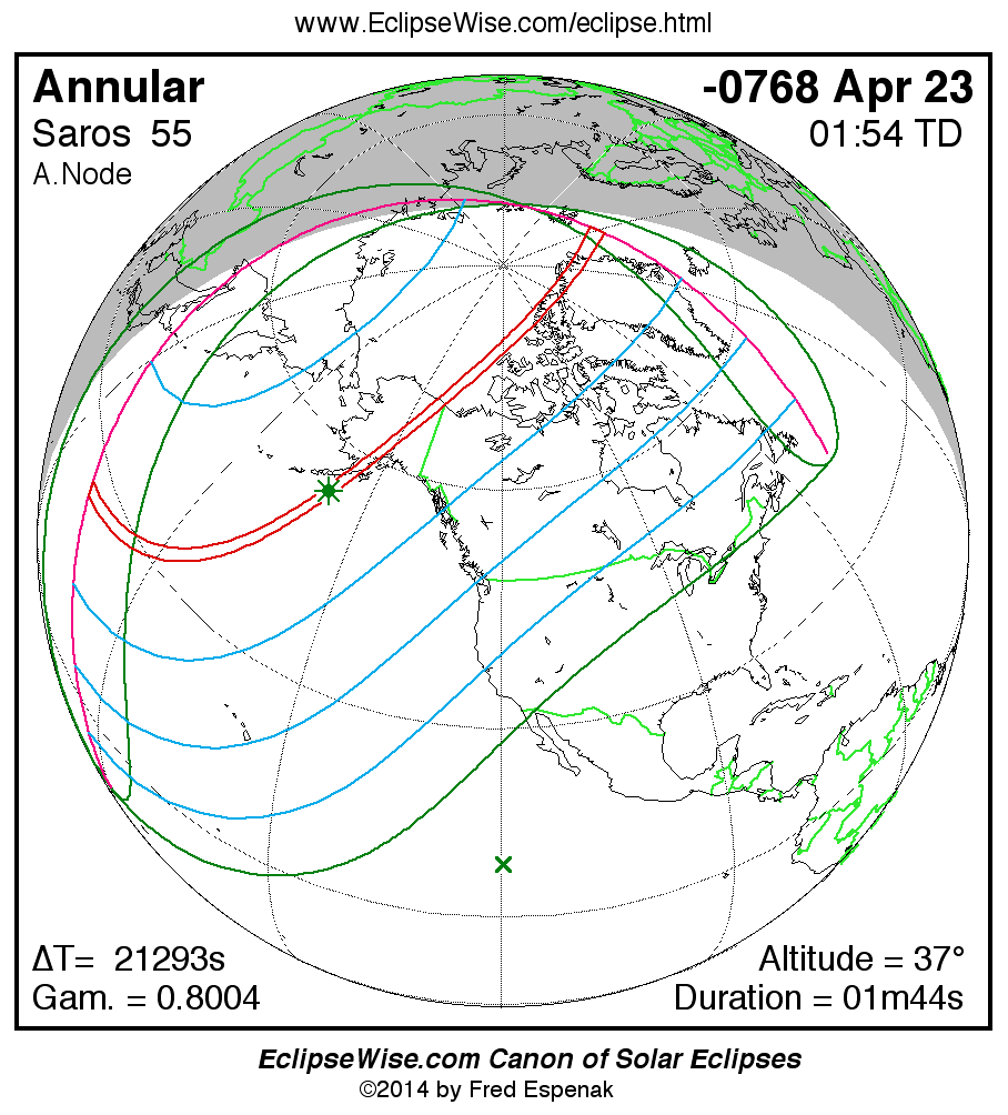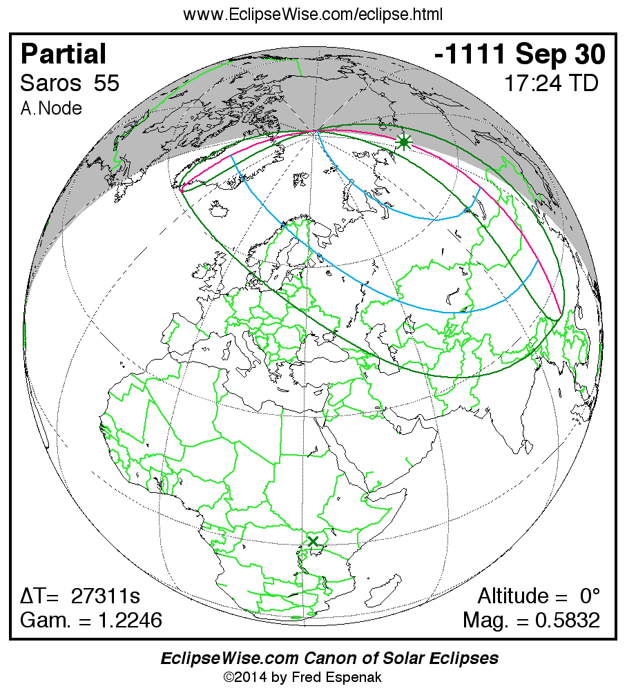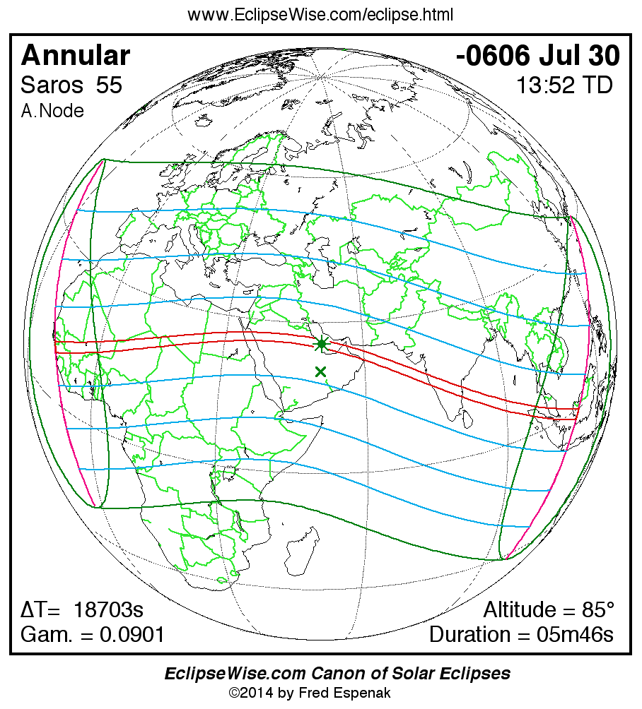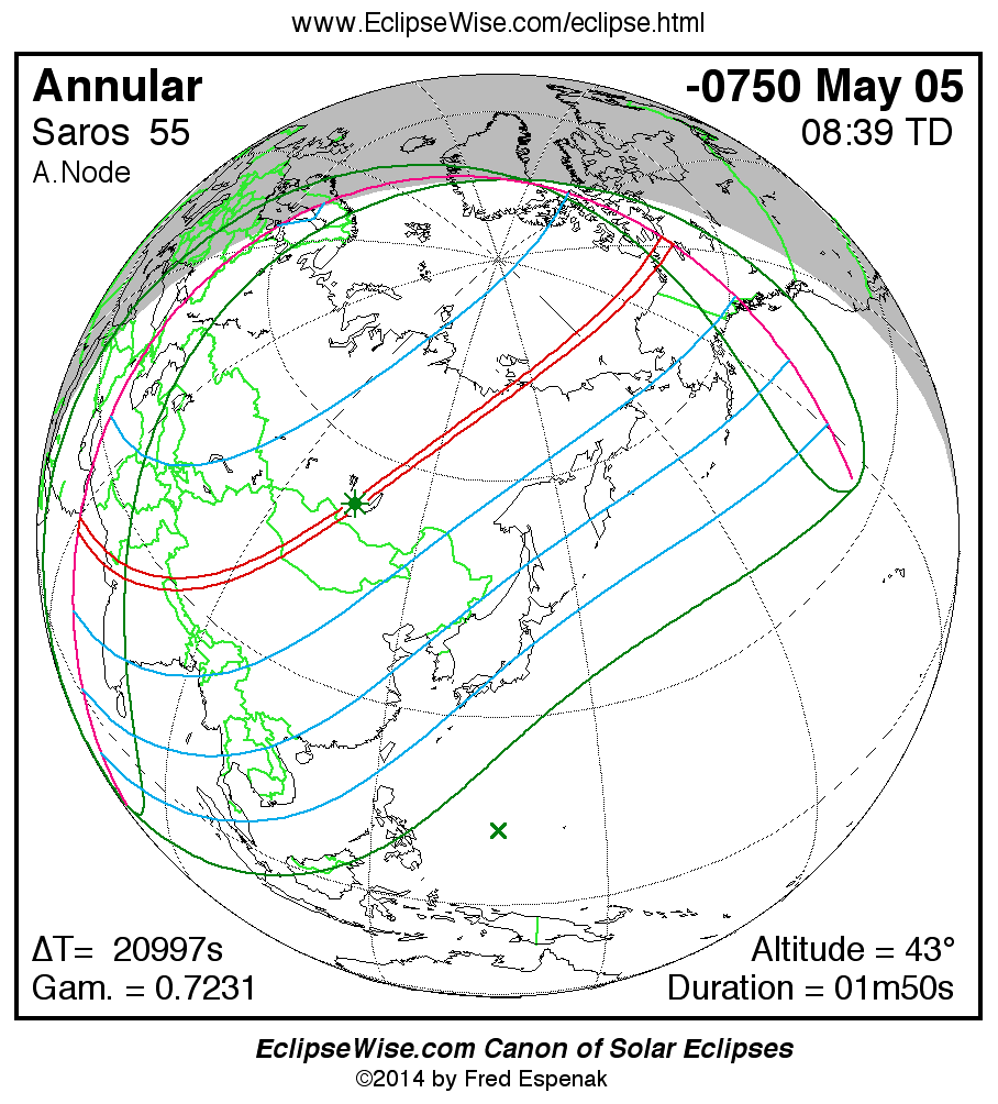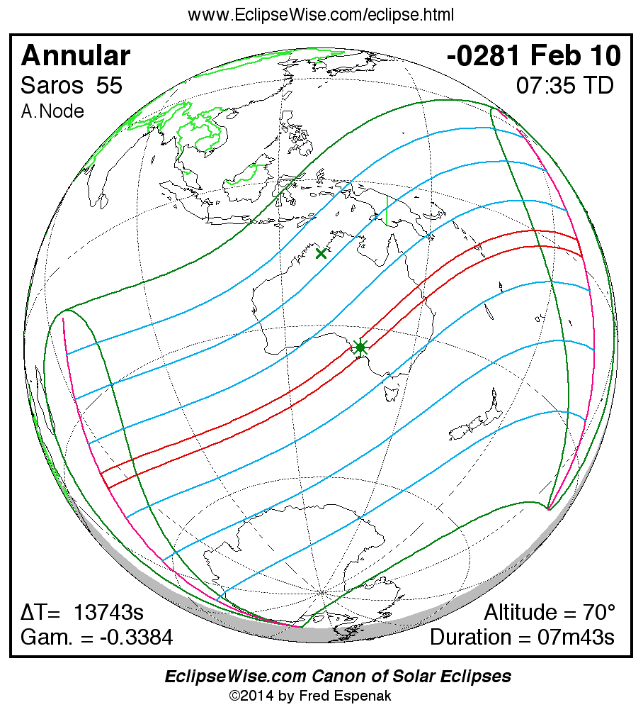 A panorama of all solar eclipses belonging to Saros 55 is presented here. Each map depicts the geographic region of visibility for a single eclipse. For central eclipses, the total or annular path is plotted in either blue (total) or red (annular). The date and time is given for the instant of Greatest Eclipse. Every map serves as a hyperlink to the EclipseWise Prime page for that eclipse where a larger map and complete details for the eclipse can be found. Visit the Key to Solar Eclipse Maps for a detailed explanation of these maps. Near the bottom of the page are a series of hyperlinks for more on solar eclipses.