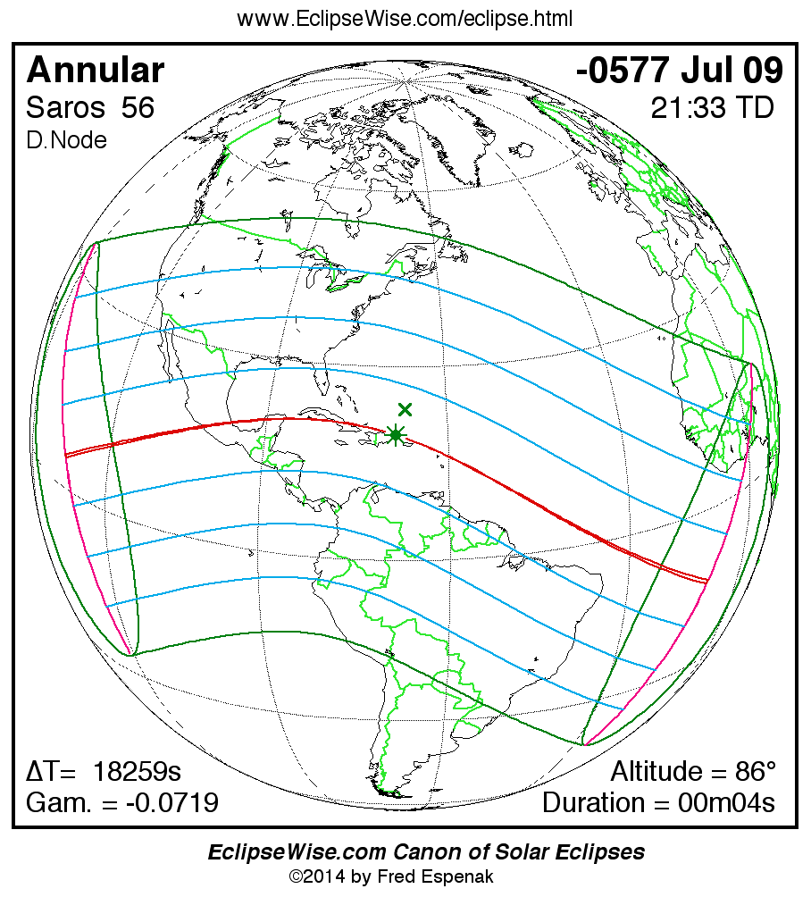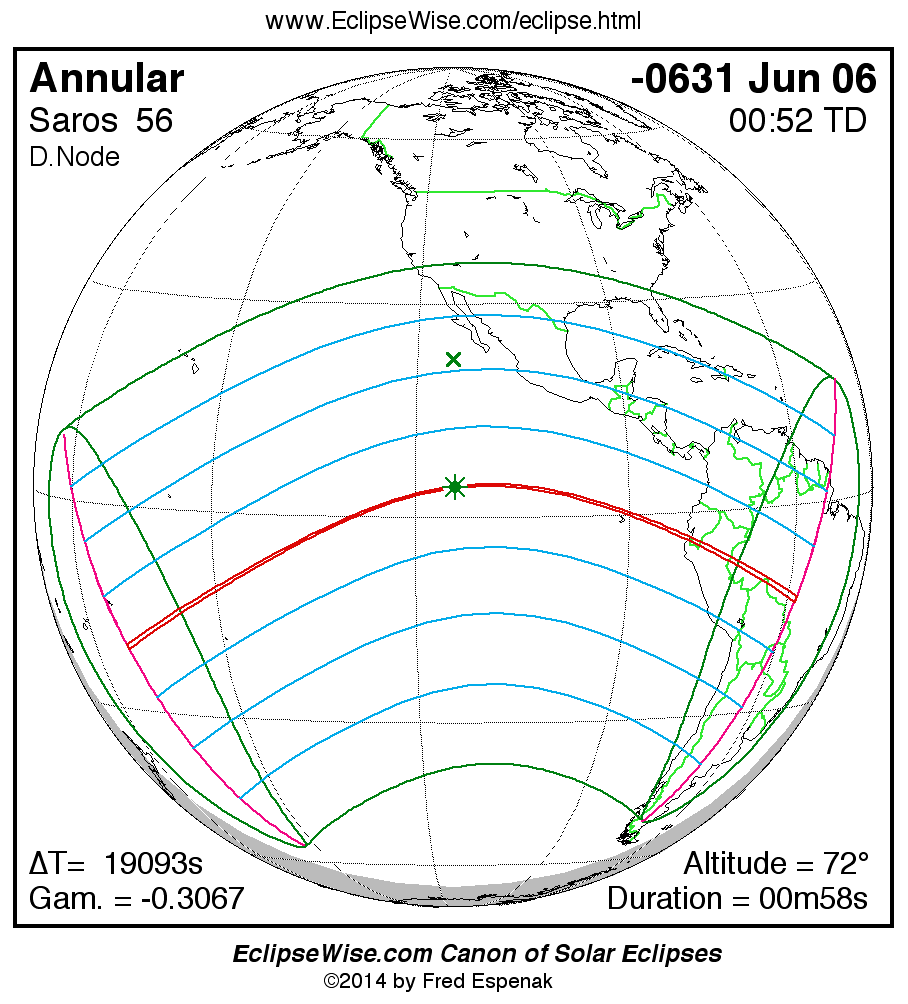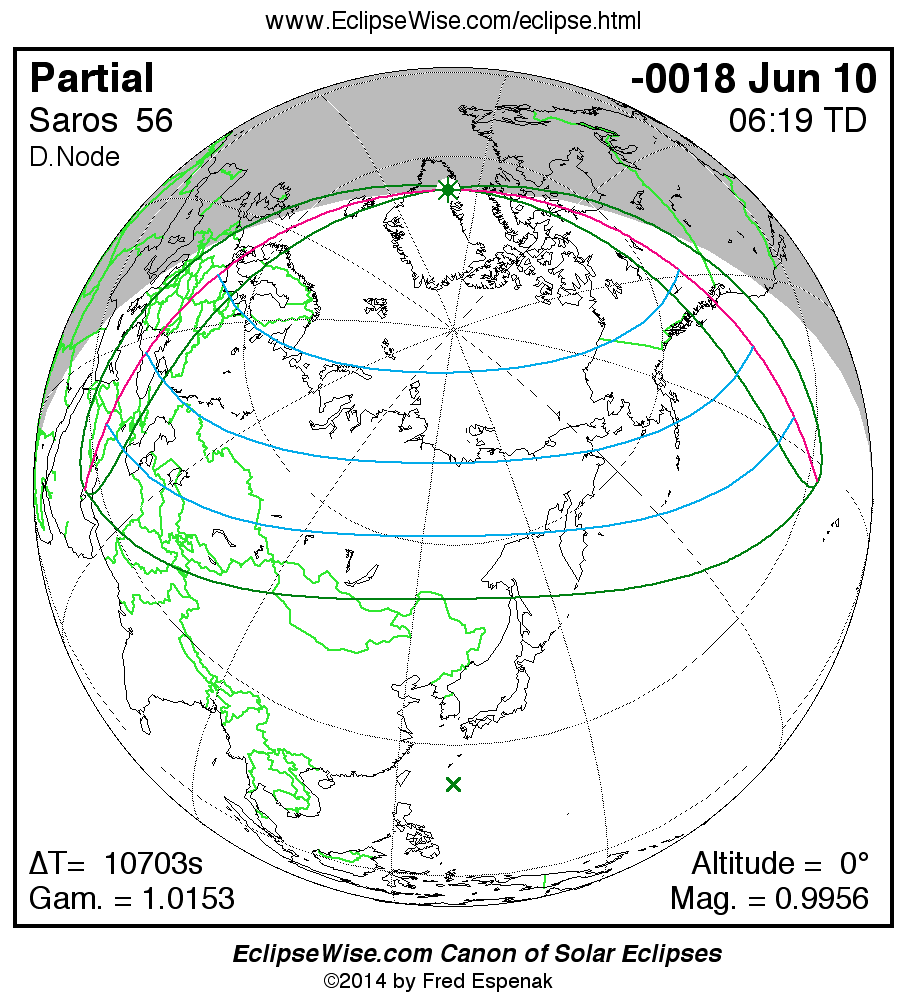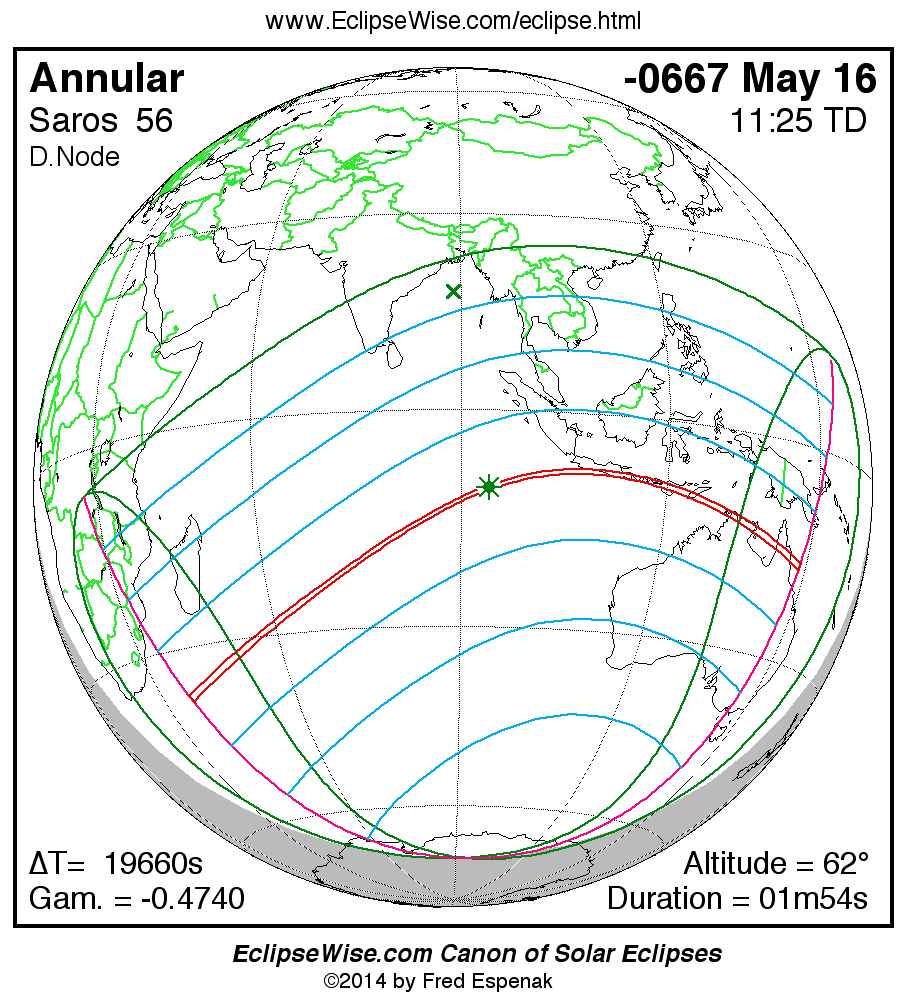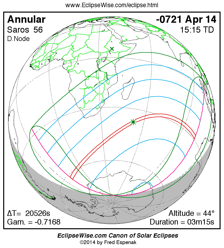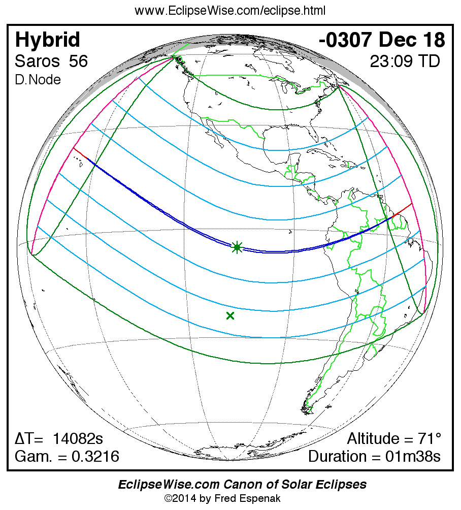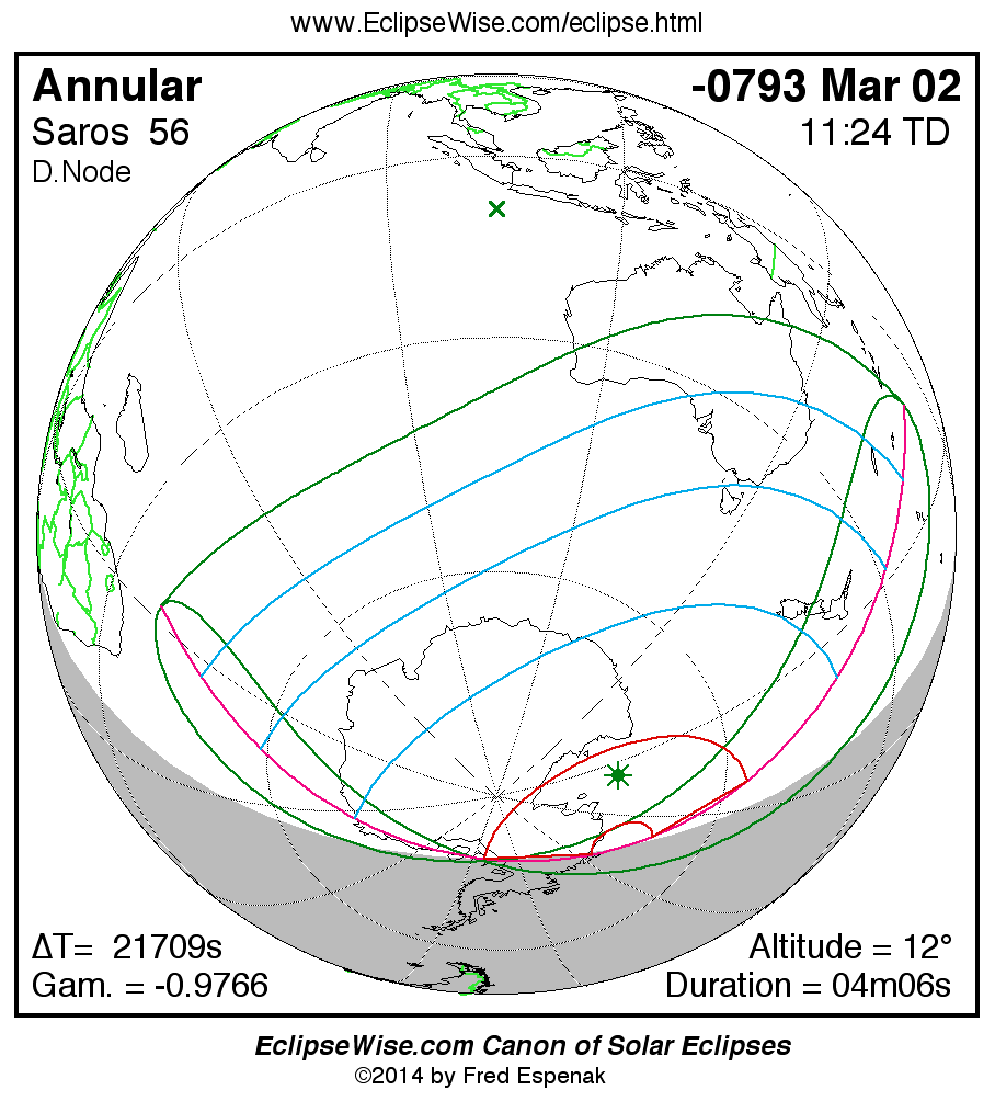 A panorama of all solar eclipses belonging to Saros 56 is presented here. Each map depicts the geographic region of visibility for a single eclipse. For central eclipses, the total or annular path is plotted in either blue (total) or red (annular). The date and time is given for the instant of Greatest Eclipse. Every map serves as a hyperlink to the EclipseWise Prime page for that eclipse where a larger map and complete details for the eclipse can be found. Visit the Key to Solar Eclipse Maps for a detailed explanation of these maps. Near the bottom of the page are a series of hyperlinks for more on solar eclipses.