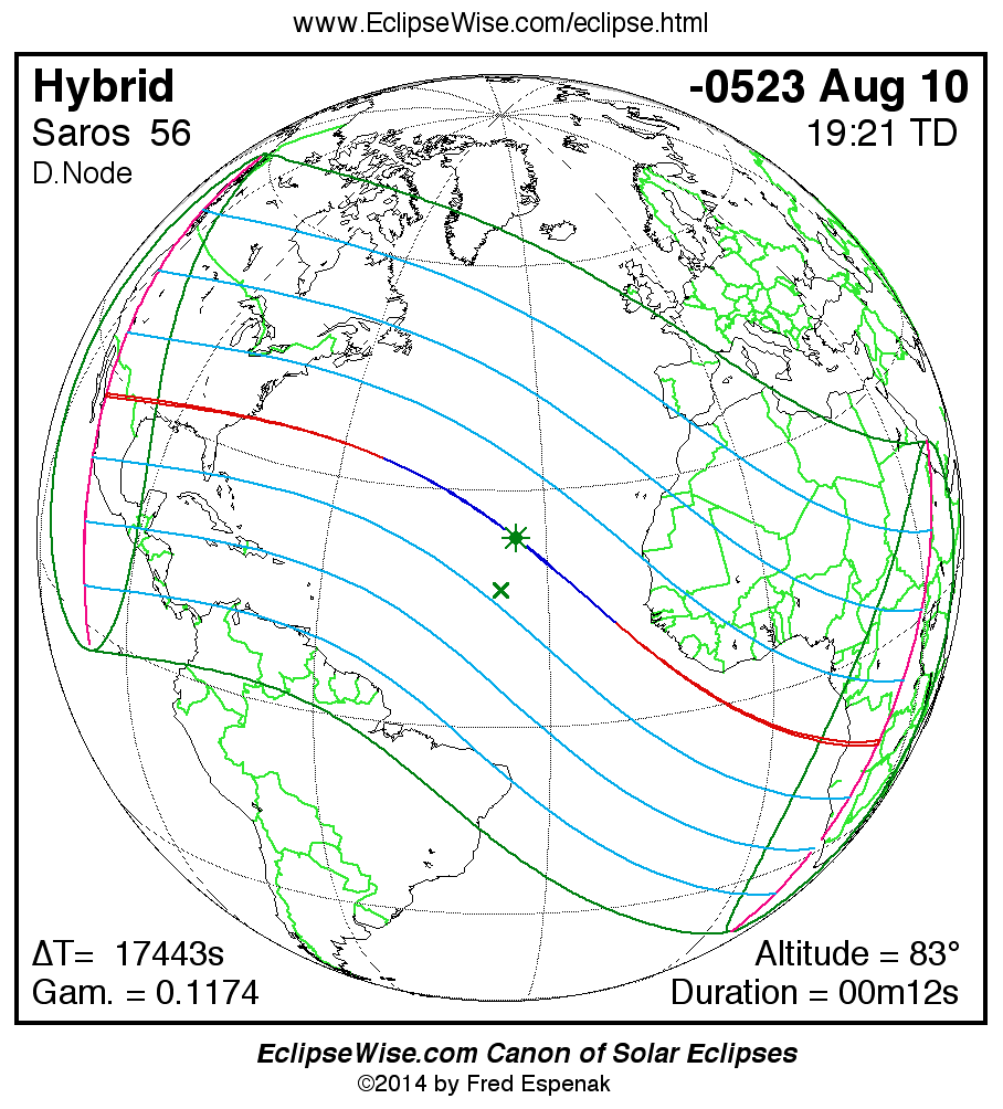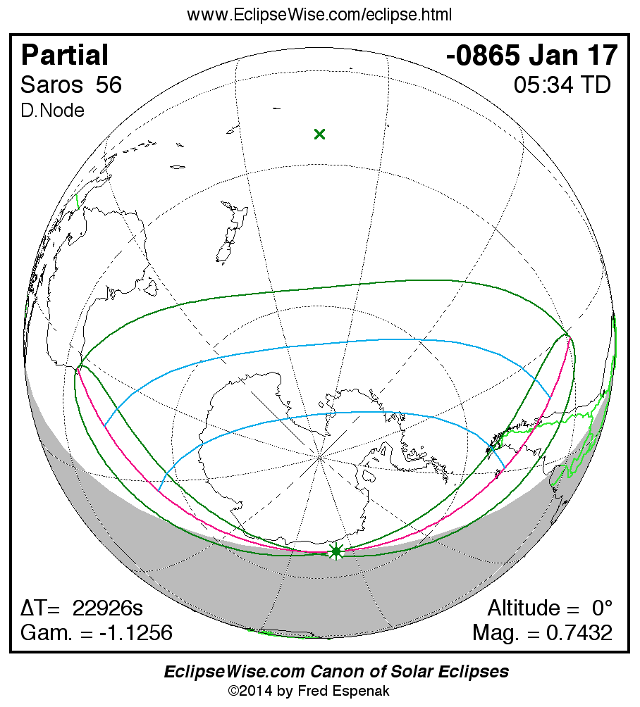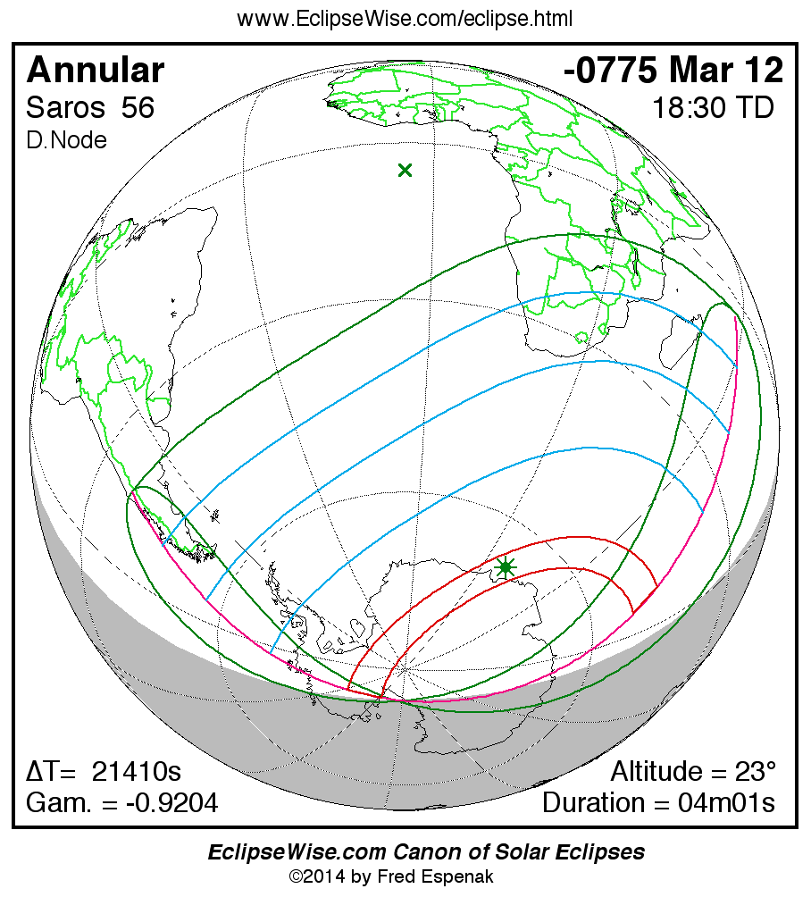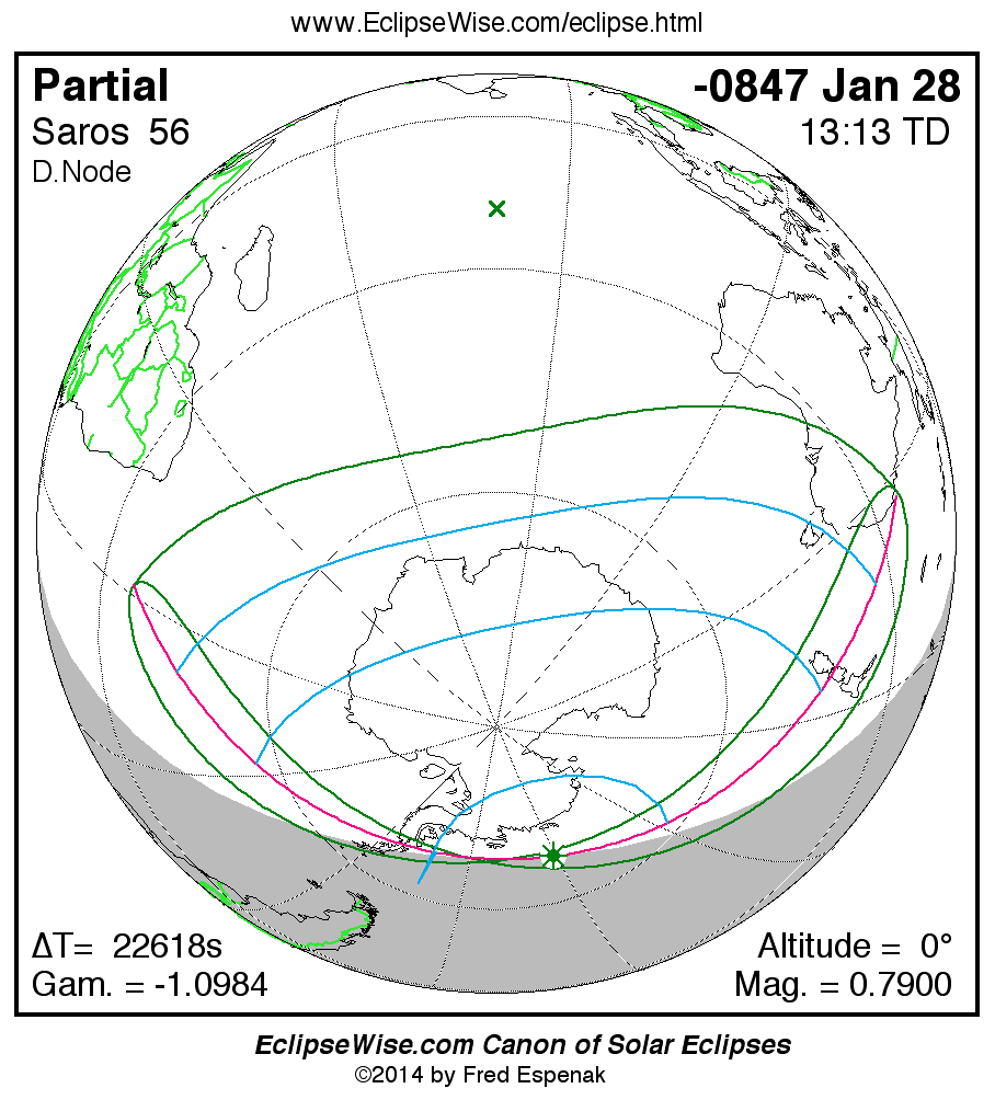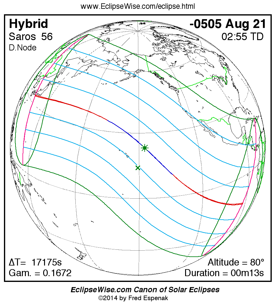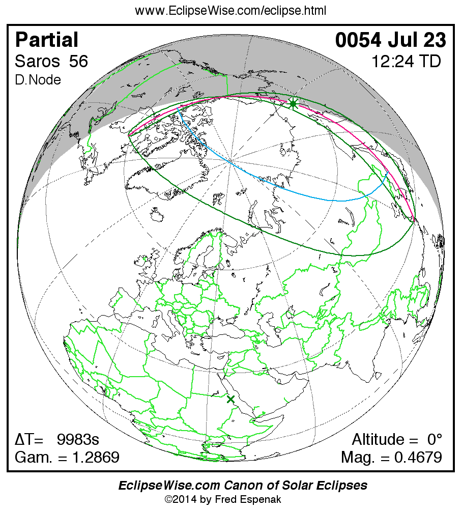 A panorama of all solar eclipses belonging to Saros 56 is presented here. Each map depicts the geographic region of visibility for a single eclipse. For central eclipses, the total or annular path is plotted in either blue (total) or red (annular). The date and time is given for the instant of Greatest Eclipse. Every map serves as a hyperlink to the EclipseWise Prime page for that eclipse where a larger map and complete details for the eclipse can be found. Visit the Key to Solar Eclipse Maps for a detailed explanation of these maps. Near the bottom of the page are a series of hyperlinks for more on solar eclipses.