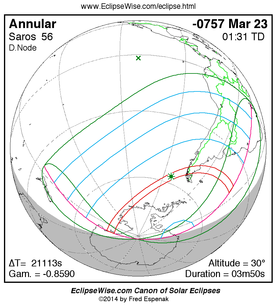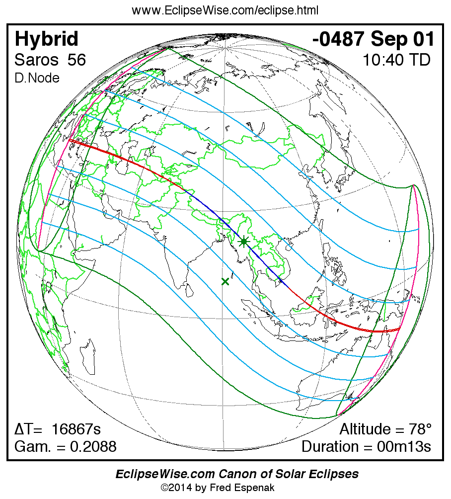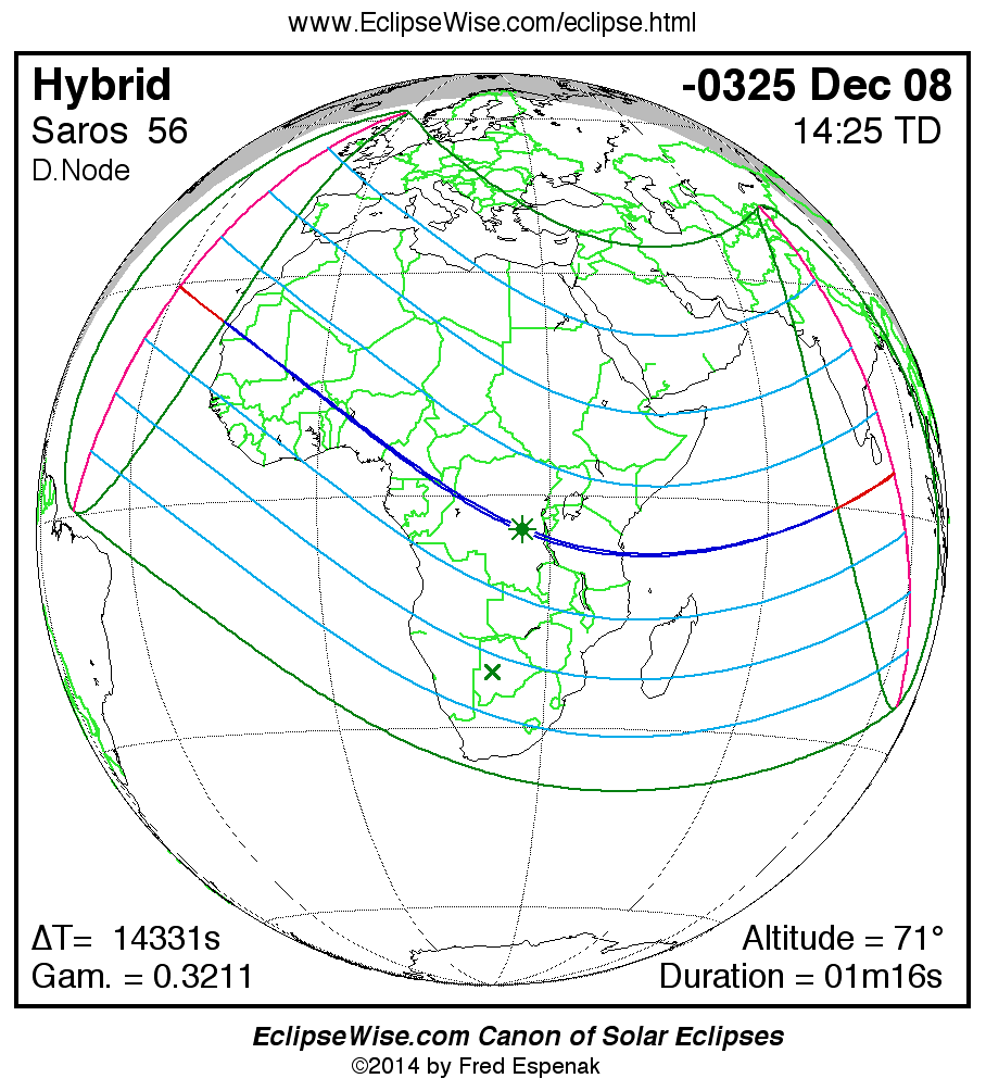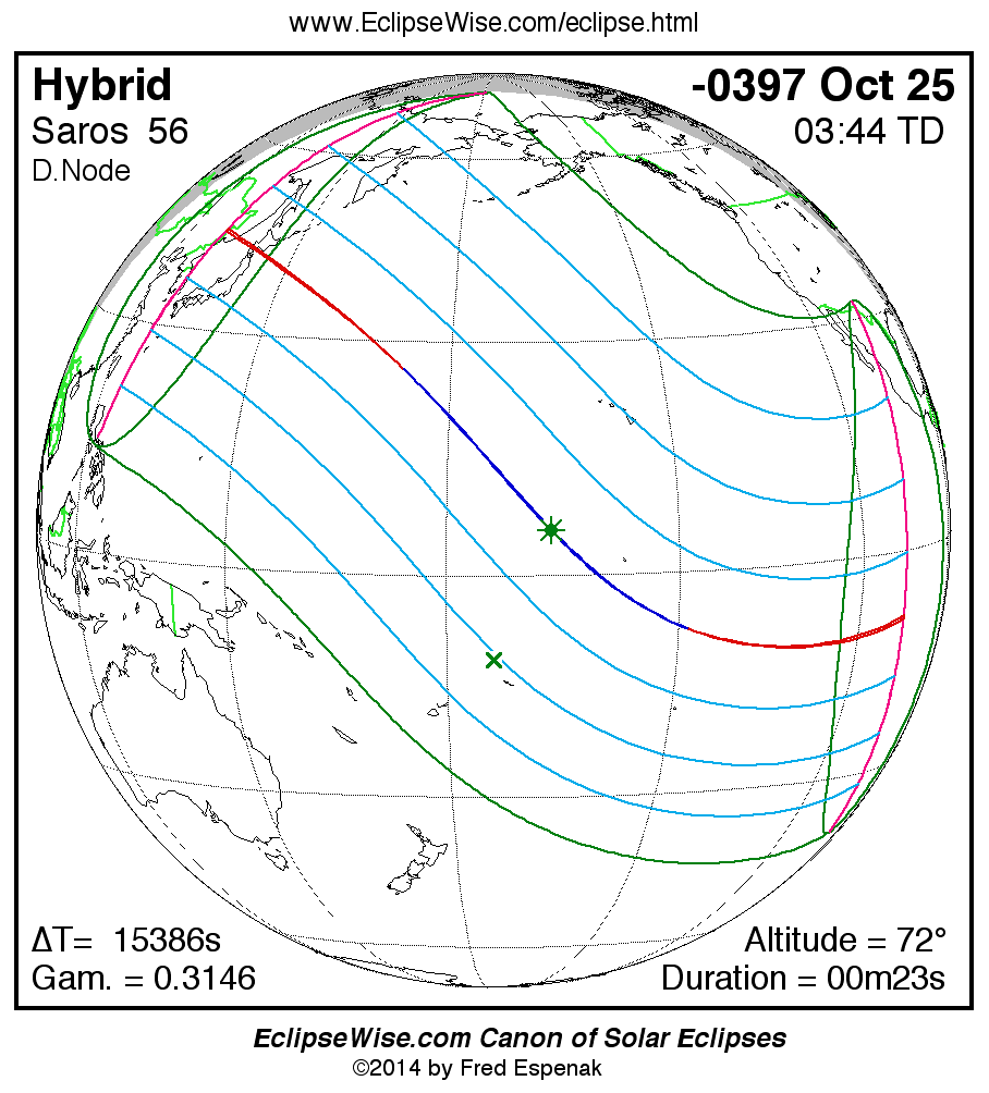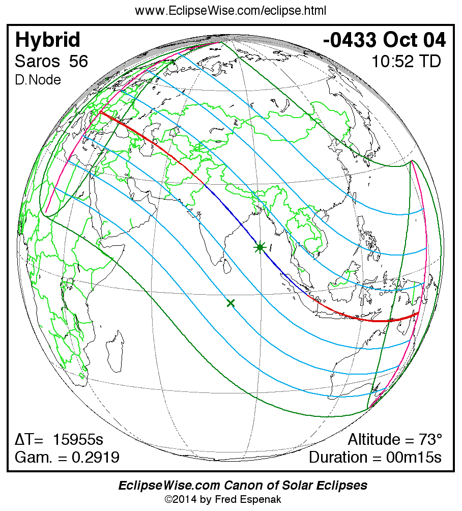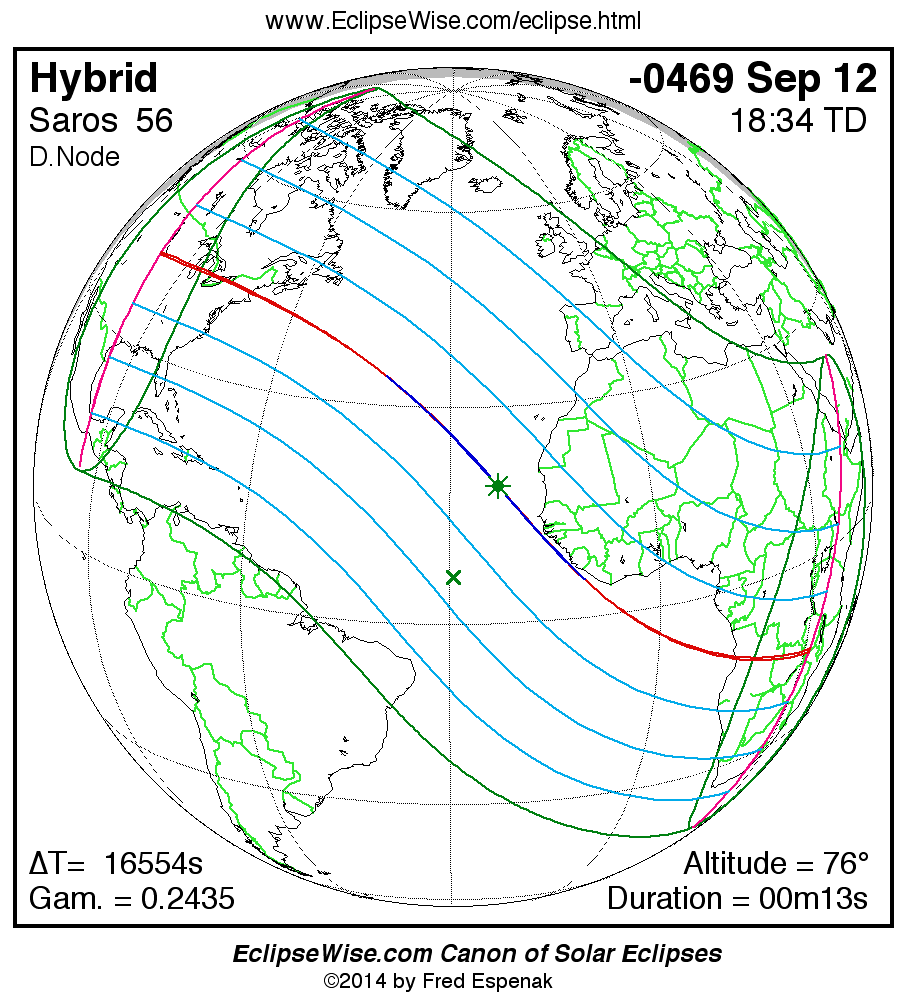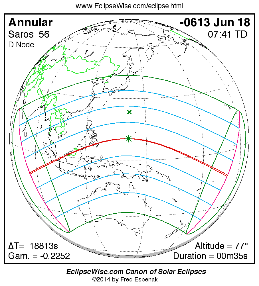 A panorama of all solar eclipses belonging to Saros 56 is presented here. Each map depicts the geographic region of visibility for a single eclipse. For central eclipses, the total or annular path is plotted in either blue (total) or red (annular). The date and time is given for the instant of Greatest Eclipse. Every map serves as a hyperlink to the EclipseWise Prime page for that eclipse where a larger map and complete details for the eclipse can be found. Visit the Key to Solar Eclipse Maps for a detailed explanation of these maps. Near the bottom of the page are a series of hyperlinks for more on solar eclipses.