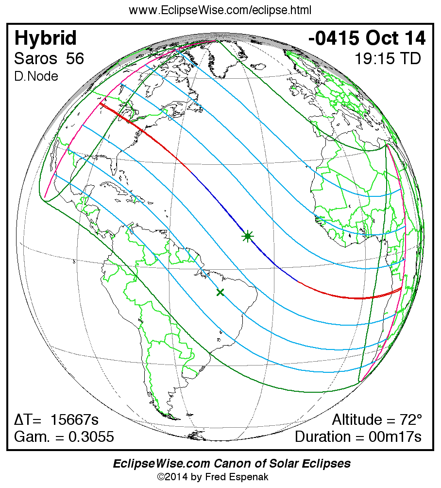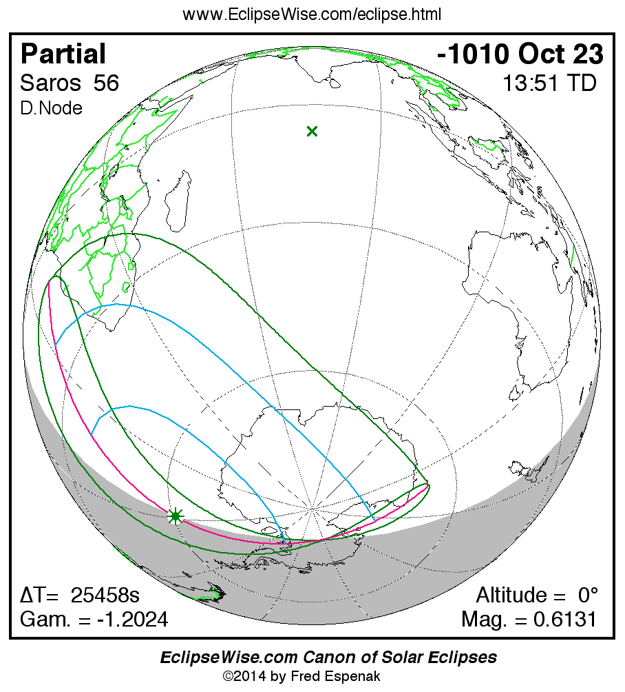 The Saros panorama below is arranged in horizontal rows of 3 eclipses. So one eclipse to the left or right is a difference of 1 Saros cycle, and one eclipse above or below is a difference of 1 exeligmos. By scanning a column of the table, it reveals how the geographic visibility of eclipses separated by an exeligmos slowly changes.