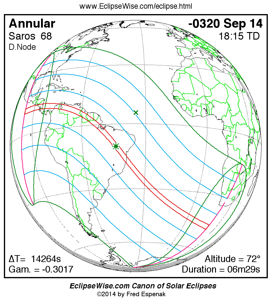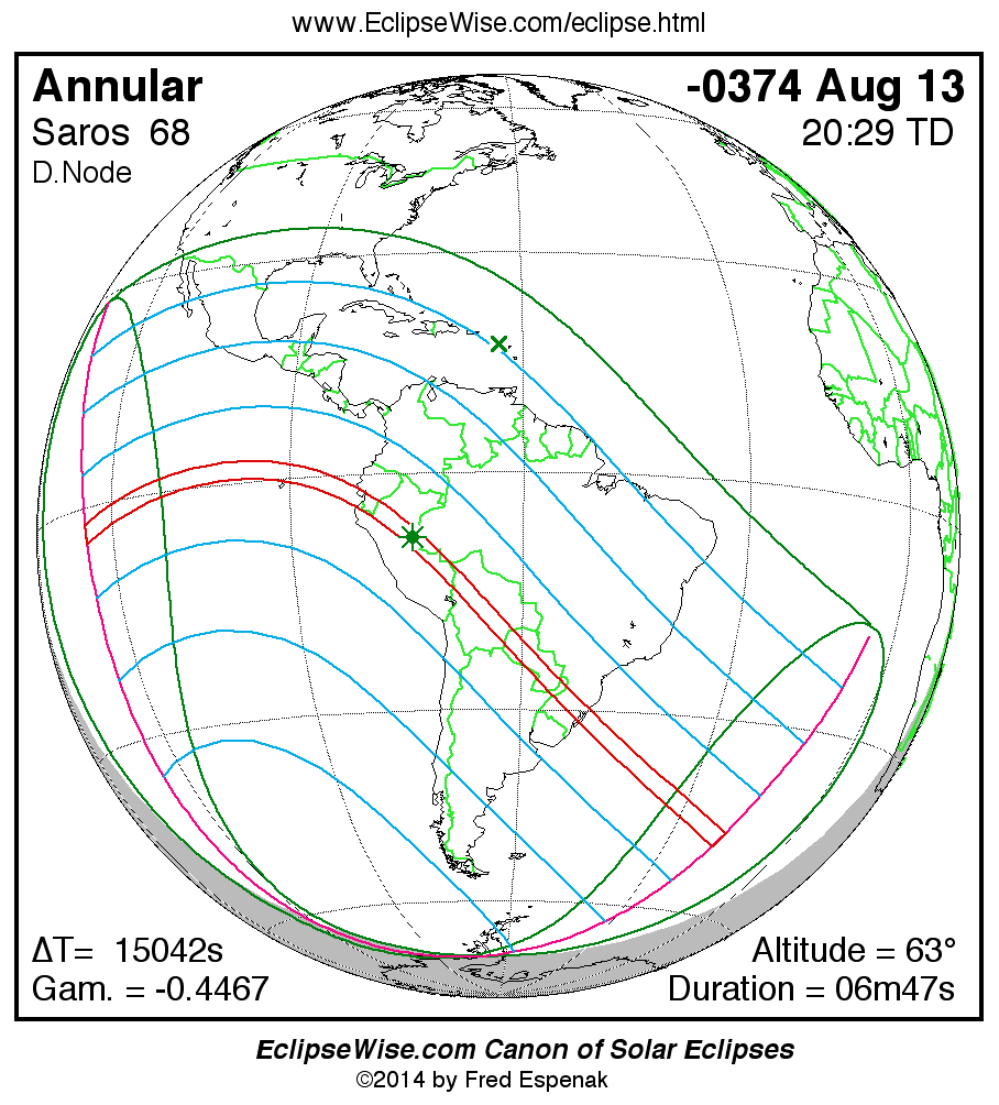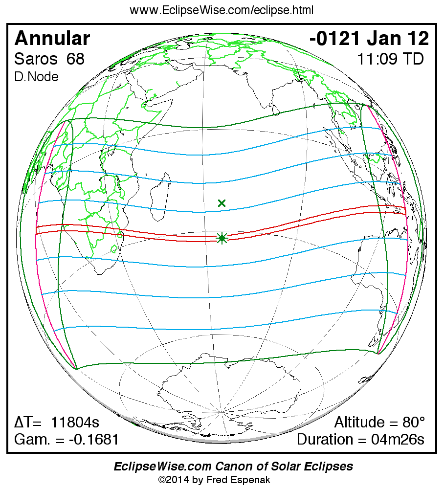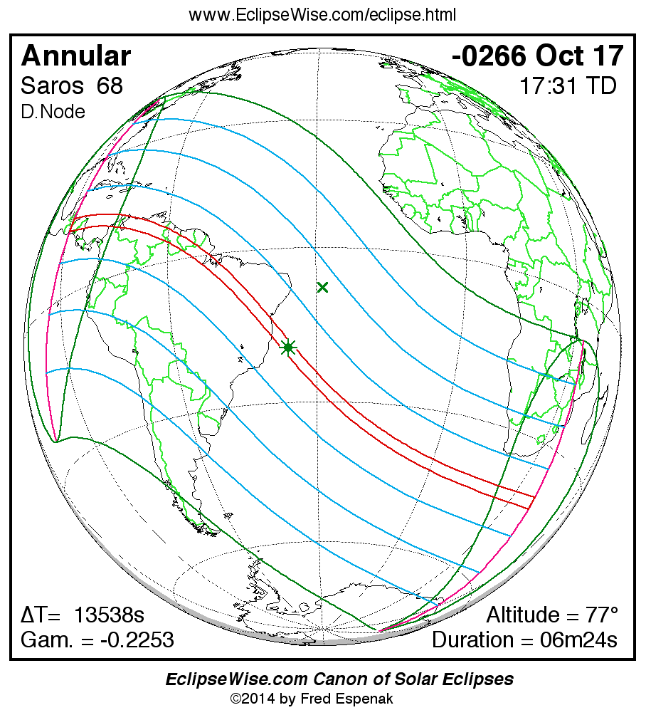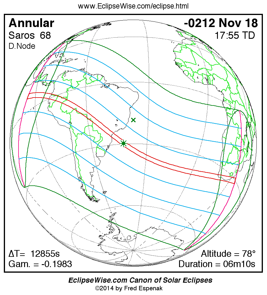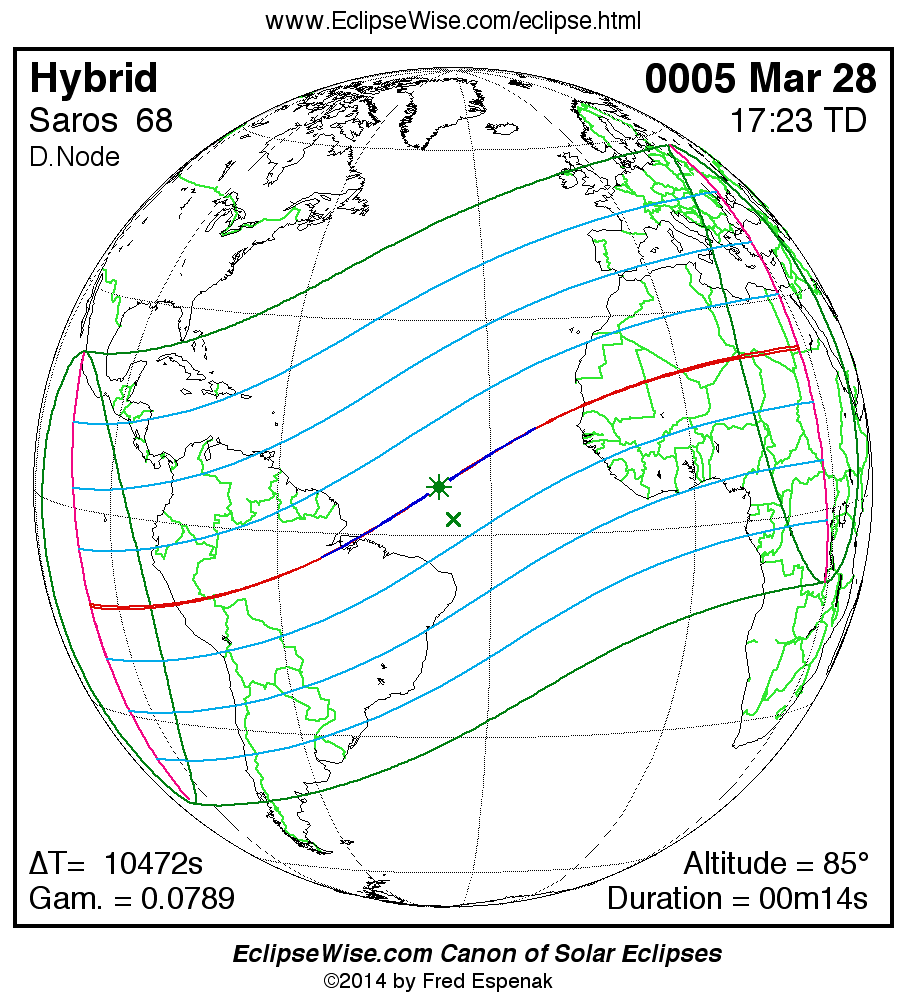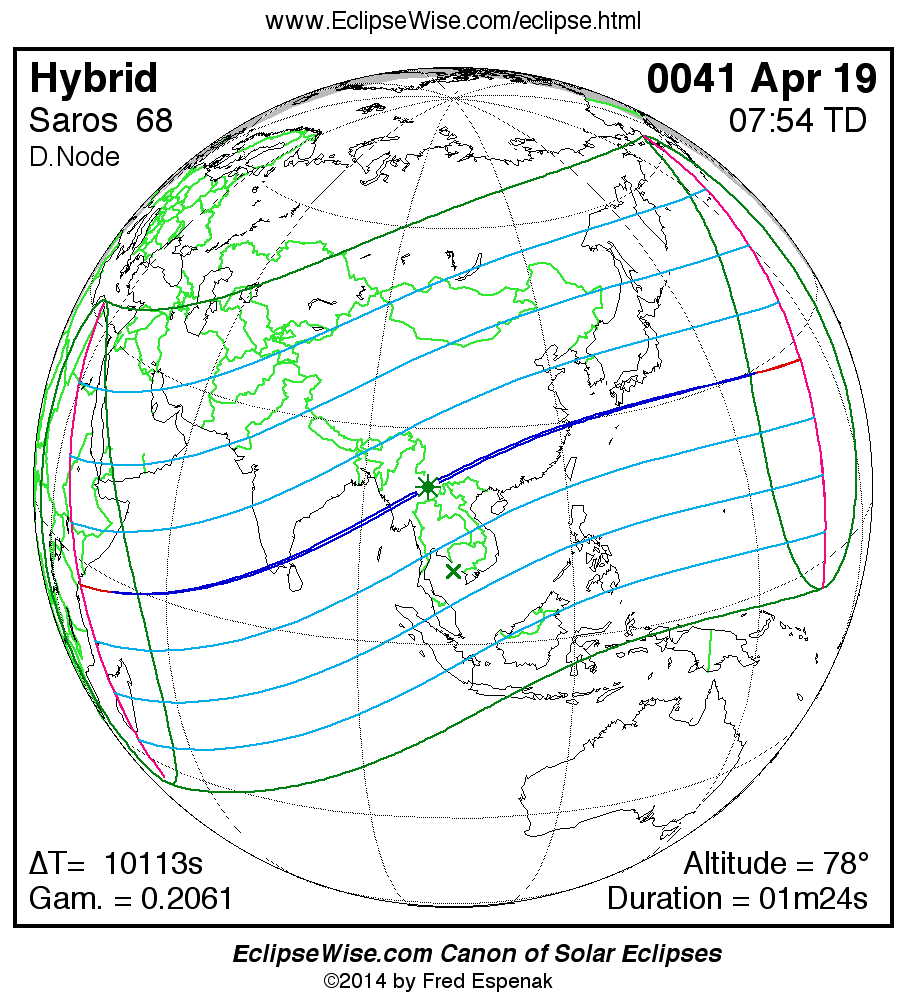 A panorama of all solar eclipses belonging to Saros 68 is presented here. Each map depicts the geographic region of visibility for a single eclipse. For central eclipses, the total or annular path is plotted in either blue (total) or red (annular). The date and time is given for the instant of Greatest Eclipse. Every map serves as a hyperlink to the EclipseWise Prime page for that eclipse where a larger map and complete details for the eclipse can be found. Visit the Key to Solar Eclipse Maps for a detailed explanation of these maps. Near the bottom of the page are a series of hyperlinks for more on solar eclipses.