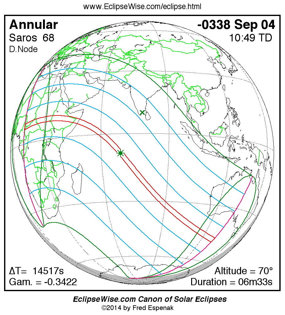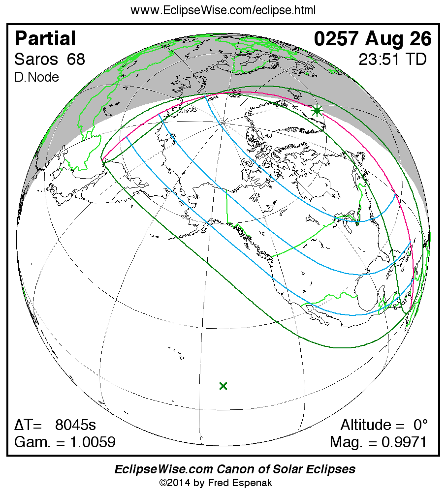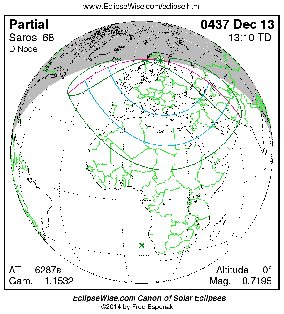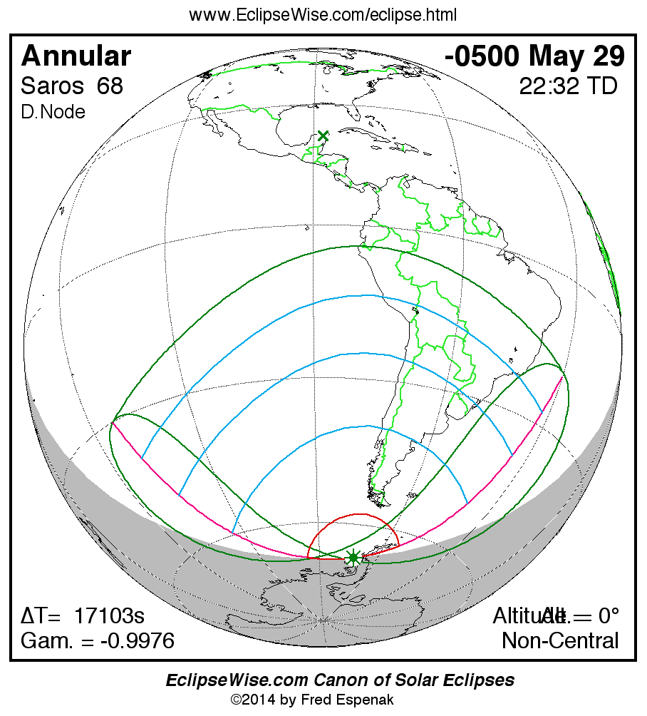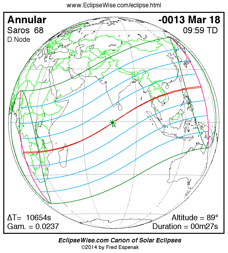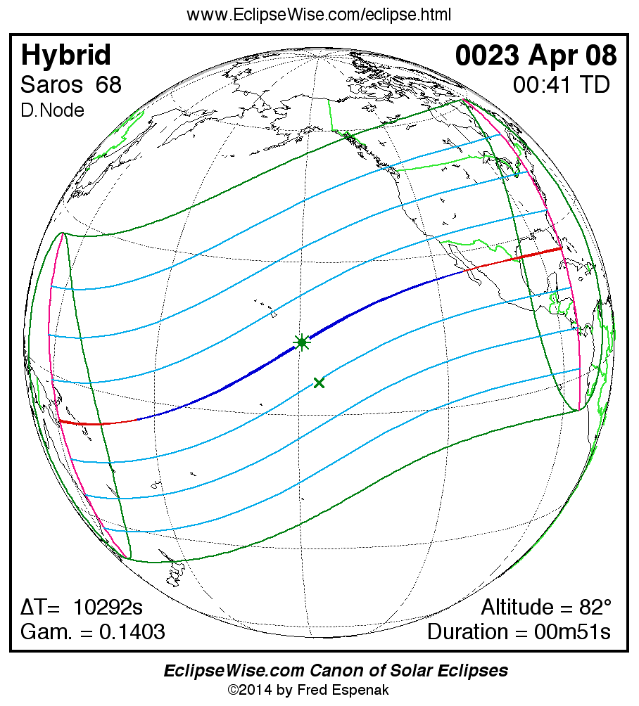 A panorama of all solar eclipses belonging to Saros 68 is presented here. Each map depicts the geographic region of visibility for a single eclipse. For central eclipses, the total or annular path is plotted in either blue (total) or red (annular). The date and time is given for the instant of Greatest Eclipse. Every map serves as a hyperlink to the EclipseWise Prime page for that eclipse where a larger map and complete details for the eclipse can be found. Visit the Key to Solar Eclipse Maps for a detailed explanation of these maps. Near the bottom of the page are a series of hyperlinks for more on solar eclipses.
