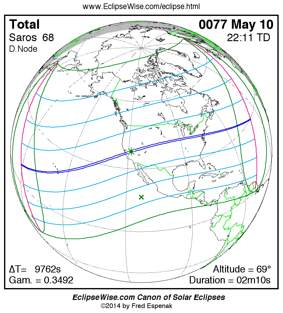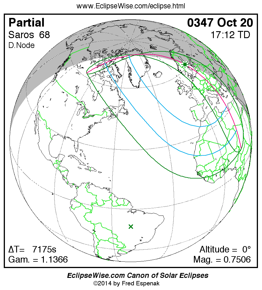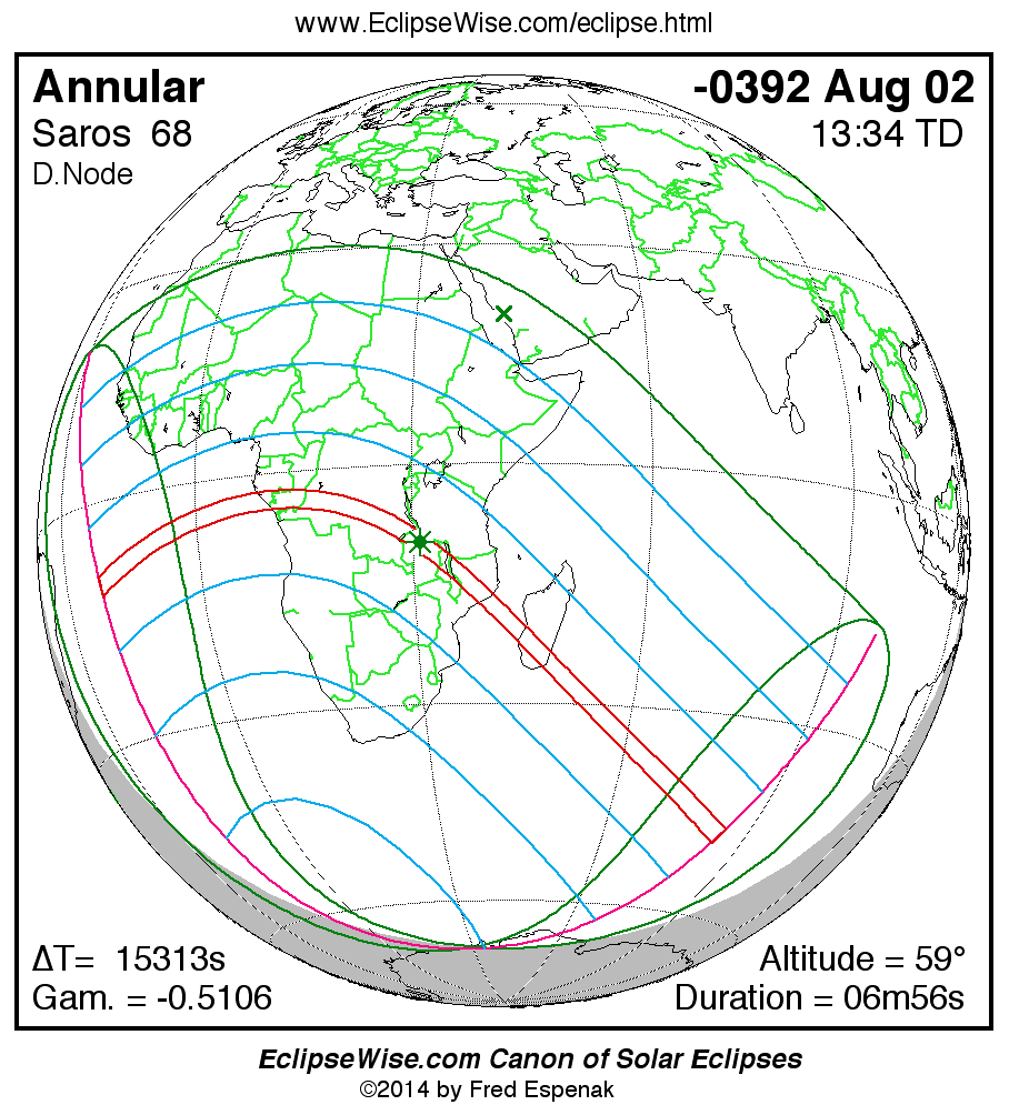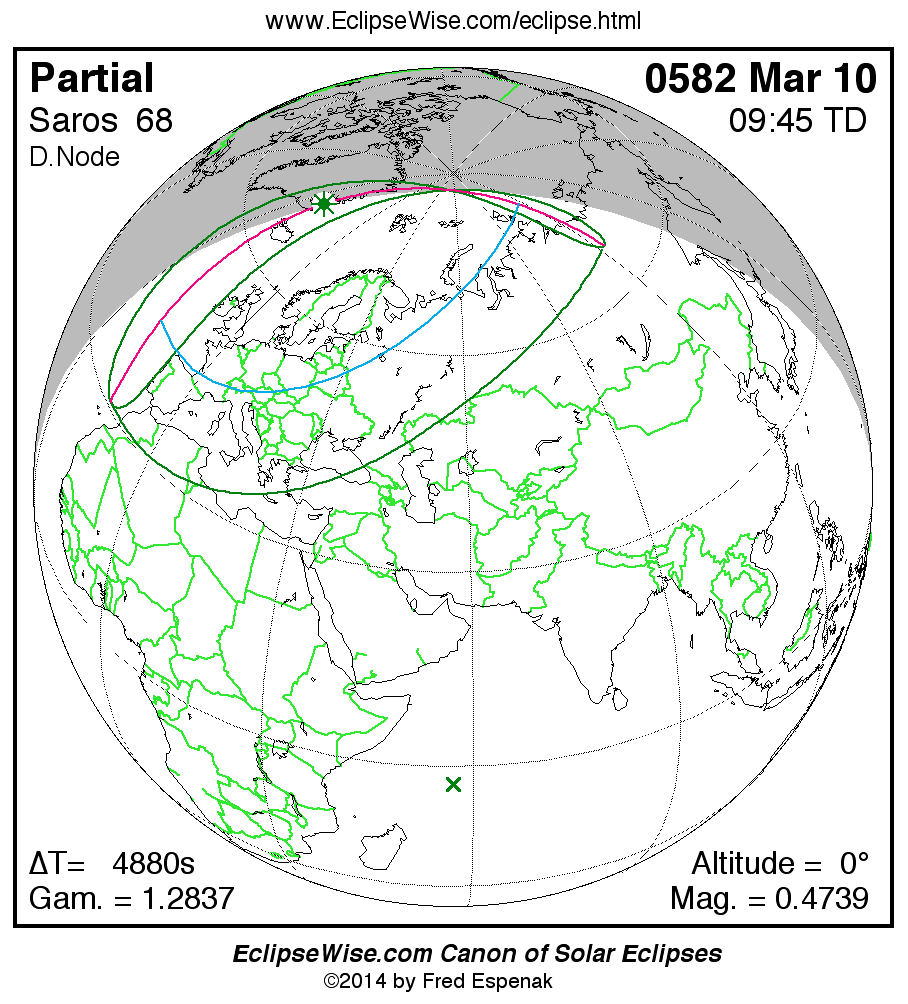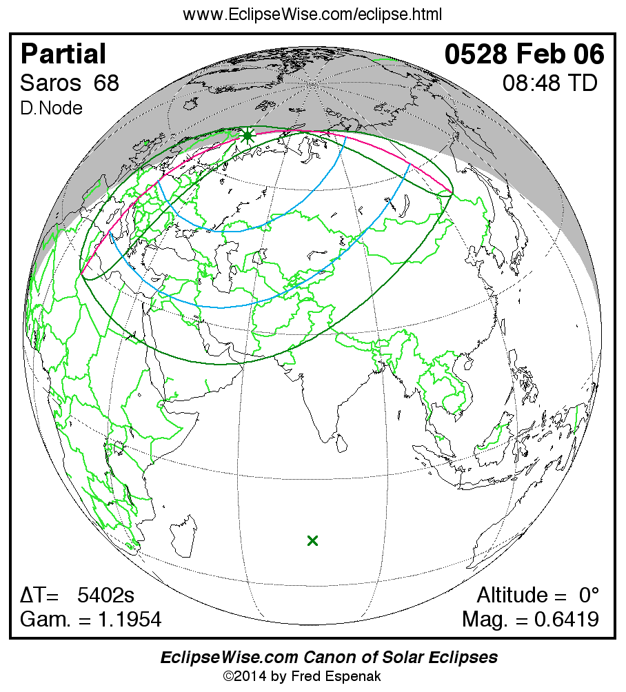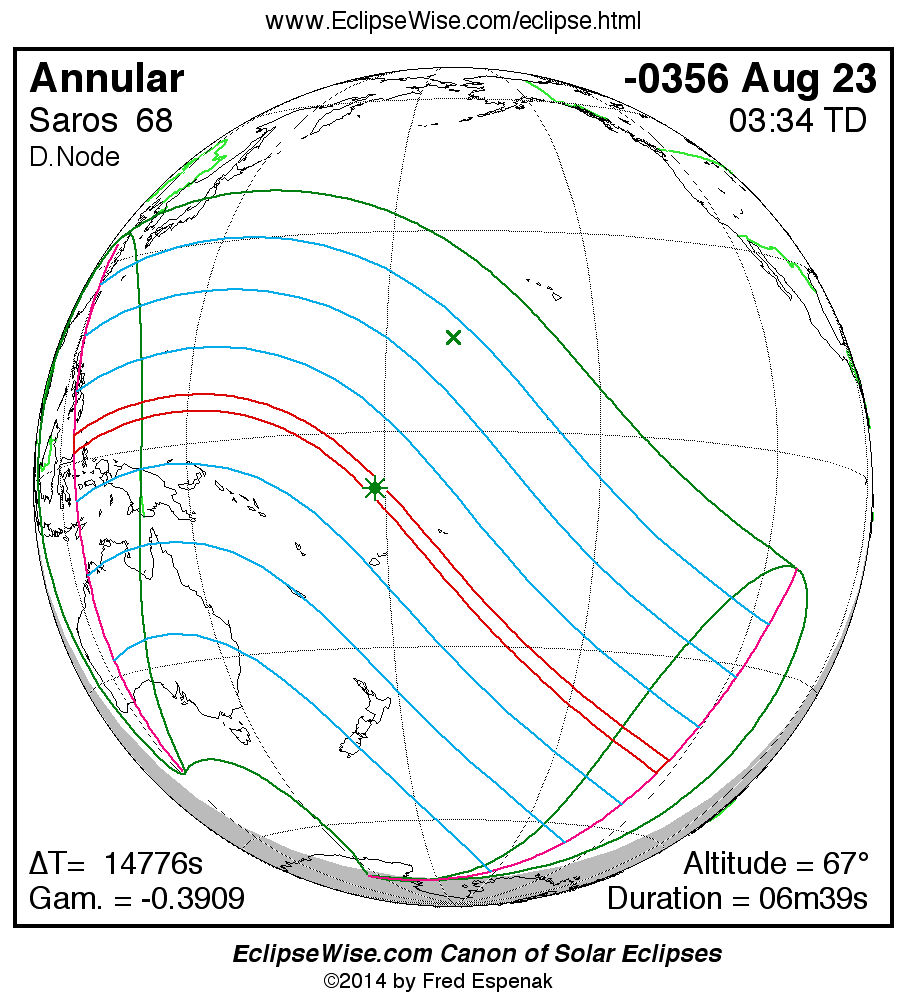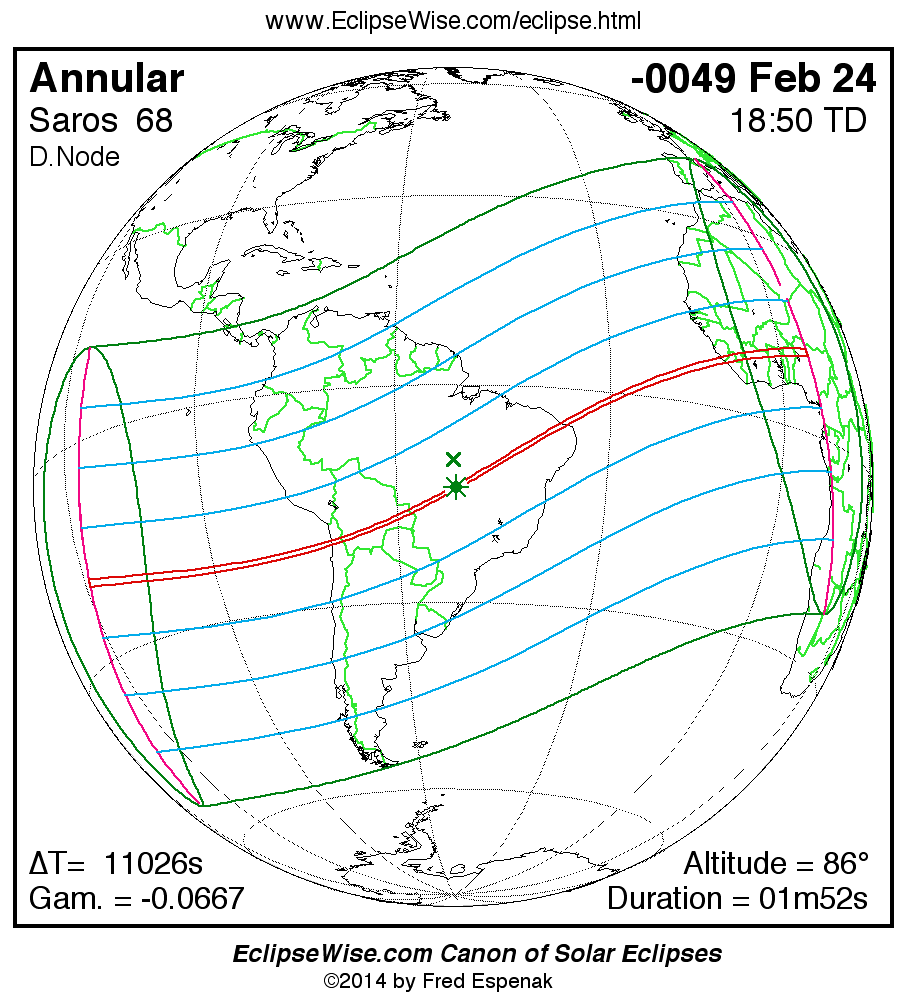 A panorama of all solar eclipses belonging to Saros 68 is presented here. Each map depicts the geographic region of visibility for a single eclipse. For central eclipses, the total or annular path is plotted in either blue (total) or red (annular). The date and time is given for the instant of Greatest Eclipse. Every map serves as a hyperlink to the EclipseWise Prime page for that eclipse where a larger map and complete details for the eclipse can be found. Visit the Key to Solar Eclipse Maps for a detailed explanation of these maps. Near the bottom of the page are a series of hyperlinks for more on solar eclipses.