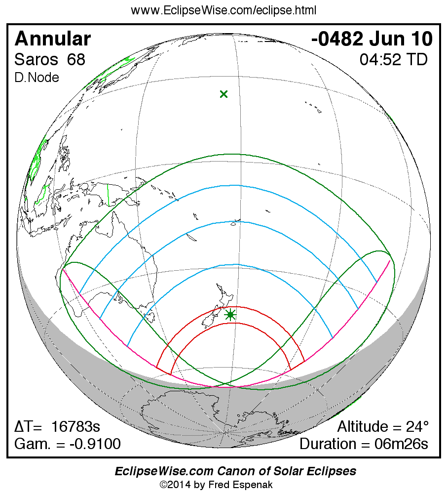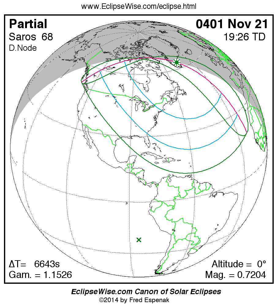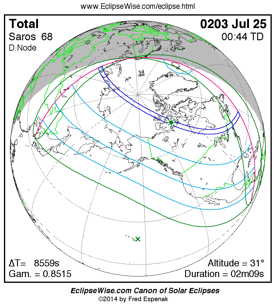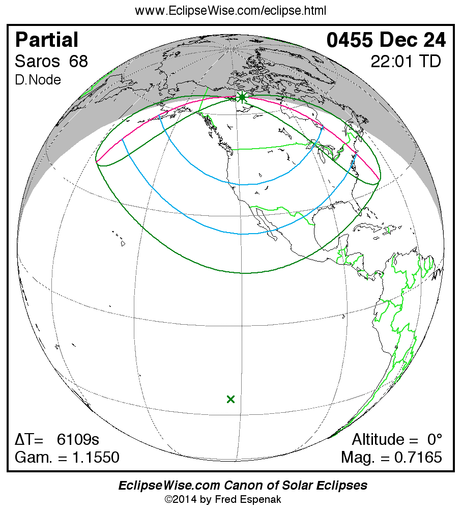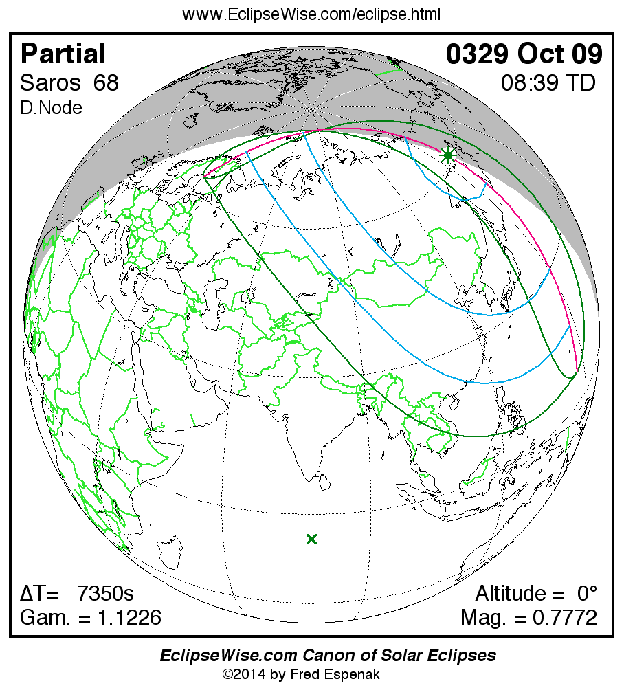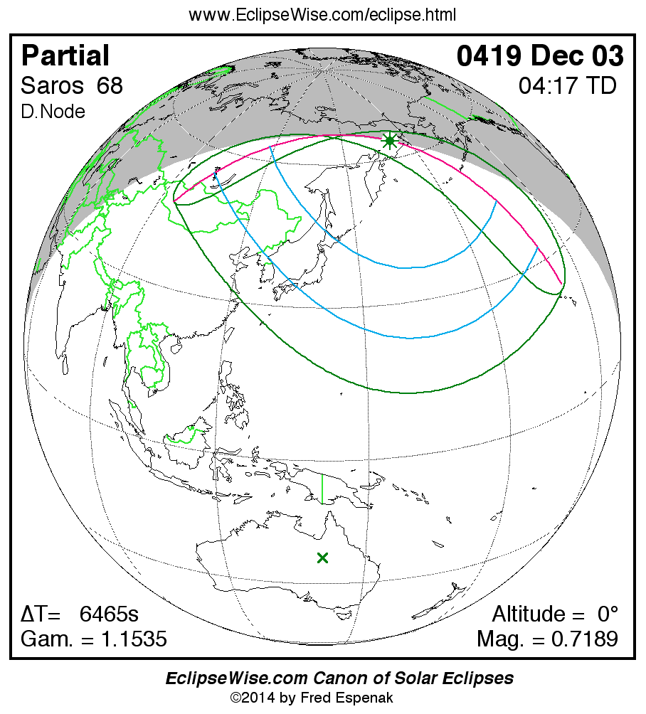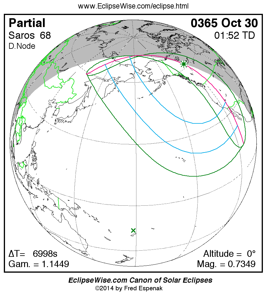 A panorama of all solar eclipses belonging to Saros 68 is presented here. Each map depicts the geographic region of visibility for a single eclipse. For central eclipses, the total or annular path is plotted in either blue (total) or red (annular). The date and time is given for the instant of Greatest Eclipse. Every map serves as a hyperlink to the EclipseWise Prime page for that eclipse where a larger map and complete details for the eclipse can be found. Visit the Key to Solar Eclipse Maps for a detailed explanation of these maps. Near the bottom of the page are a series of hyperlinks for more on solar eclipses.