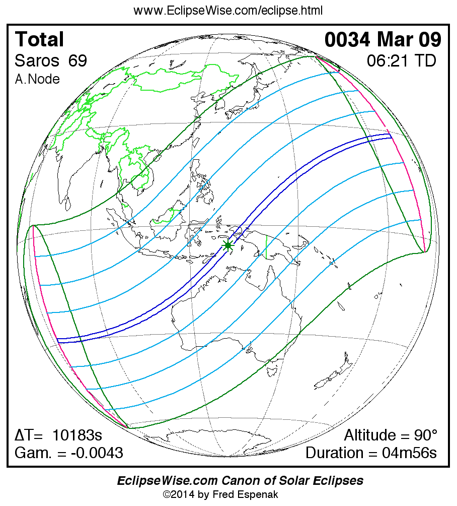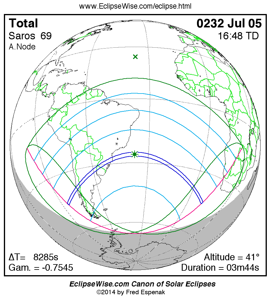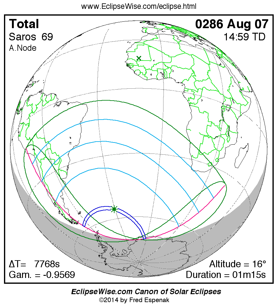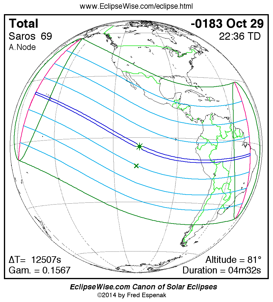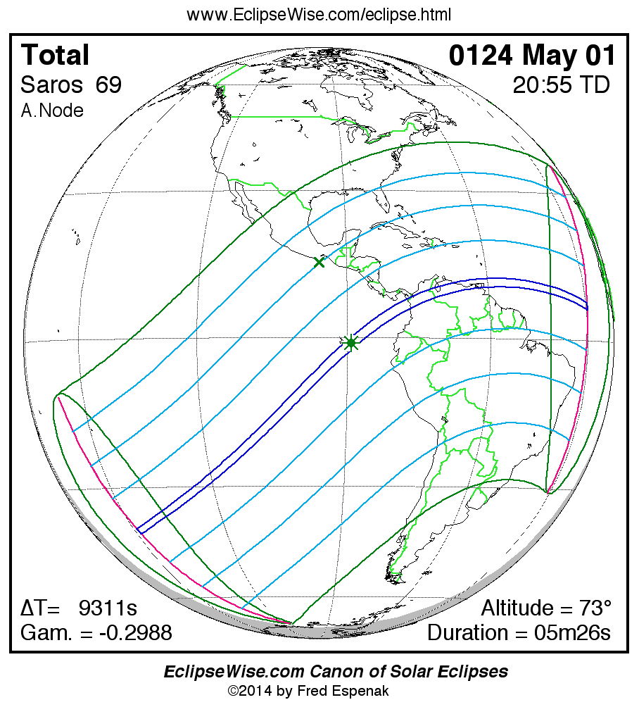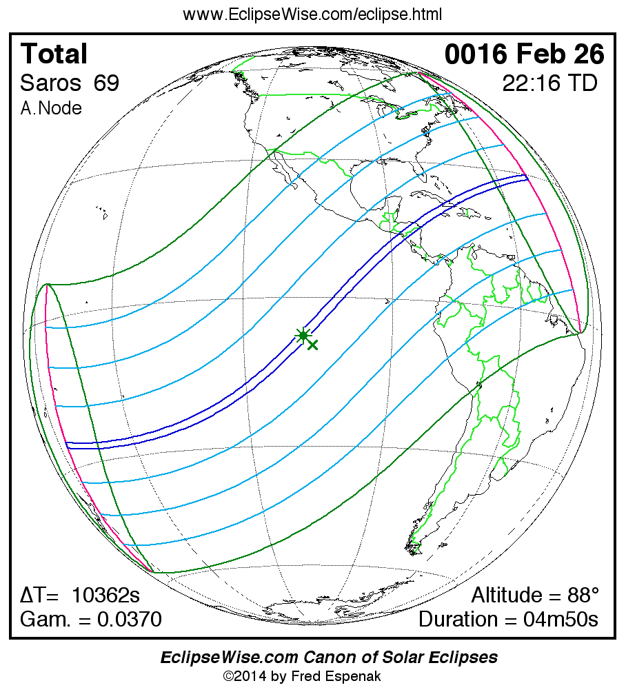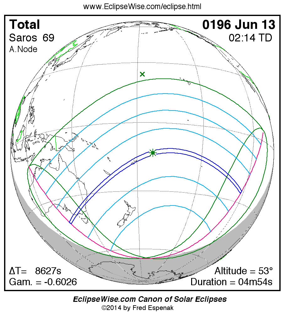 A panorama of all solar eclipses belonging to Saros 69 is presented here. Each map depicts the geographic region of visibility for a single eclipse. For central eclipses, the total or annular path is plotted in either blue (total) or red (annular). The date and time is given for the instant of Greatest Eclipse. Every map serves as a hyperlink to the EclipseWise Prime page for that eclipse where a larger map and complete details for the eclipse can be found. Visit the Key to Solar Eclipse Maps for a detailed explanation of these maps. Near the bottom of the page are a series of hyperlinks for more on solar eclipses.