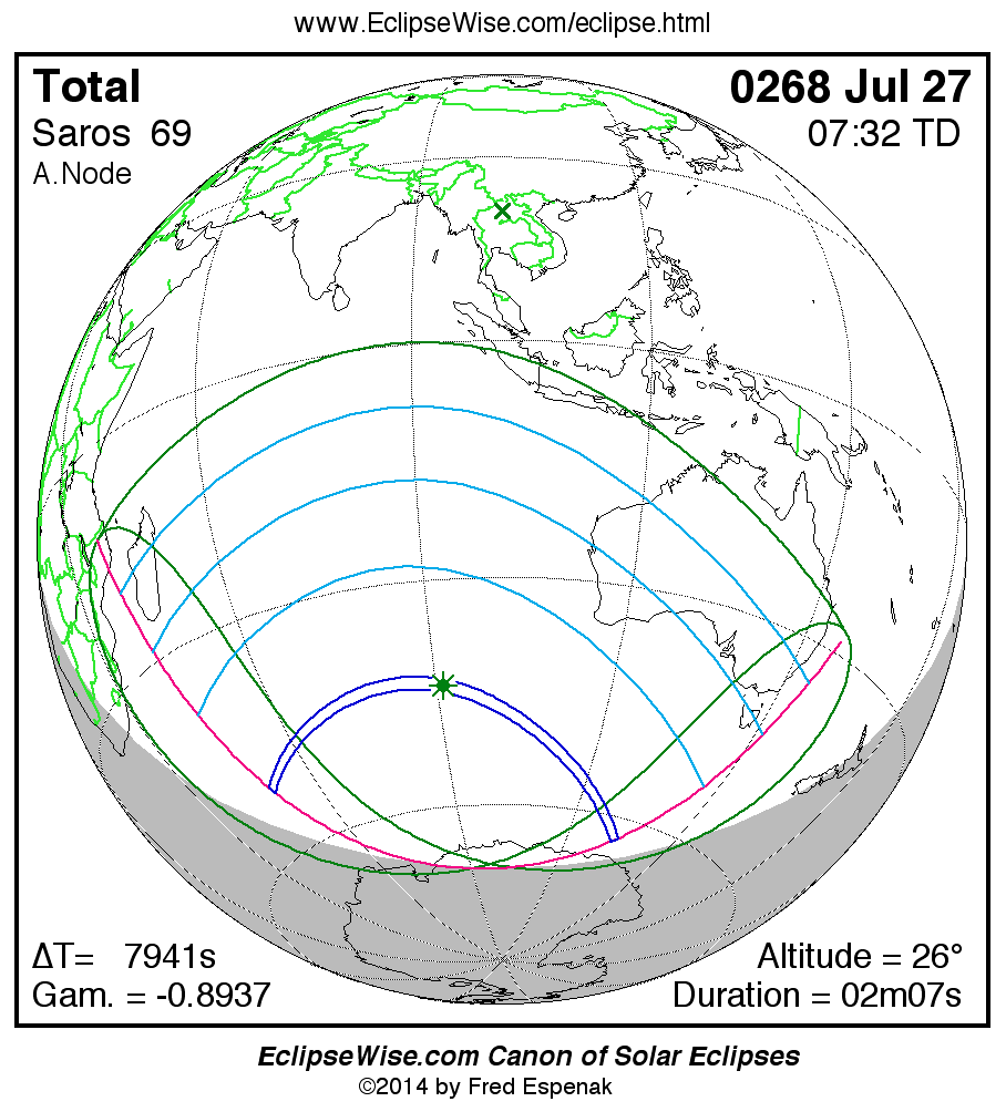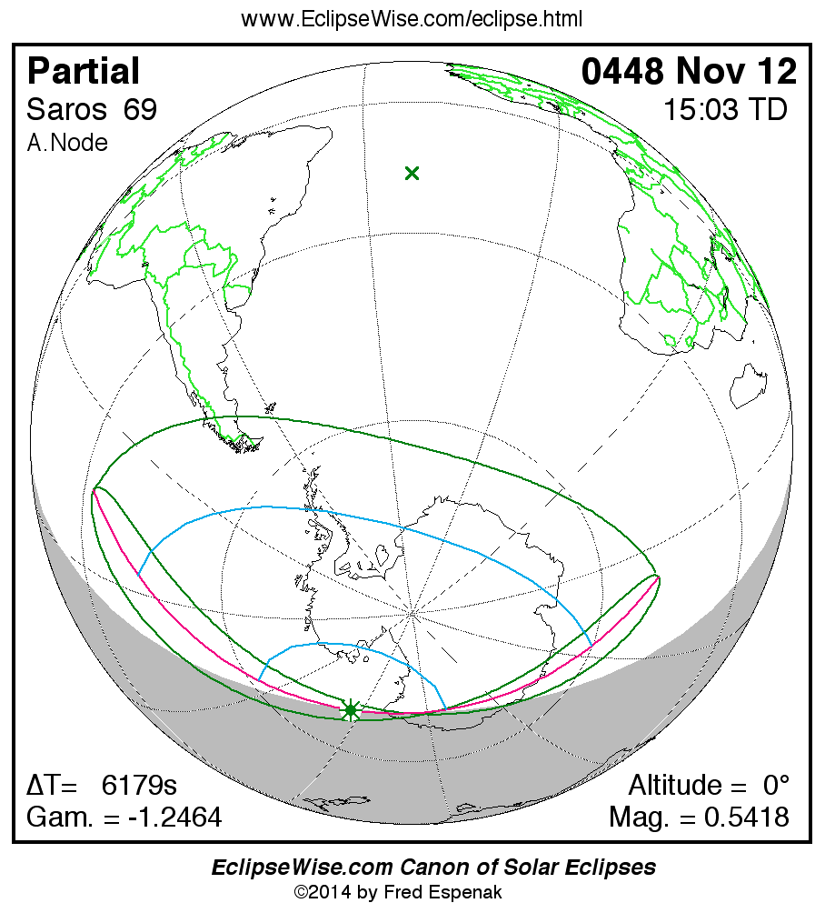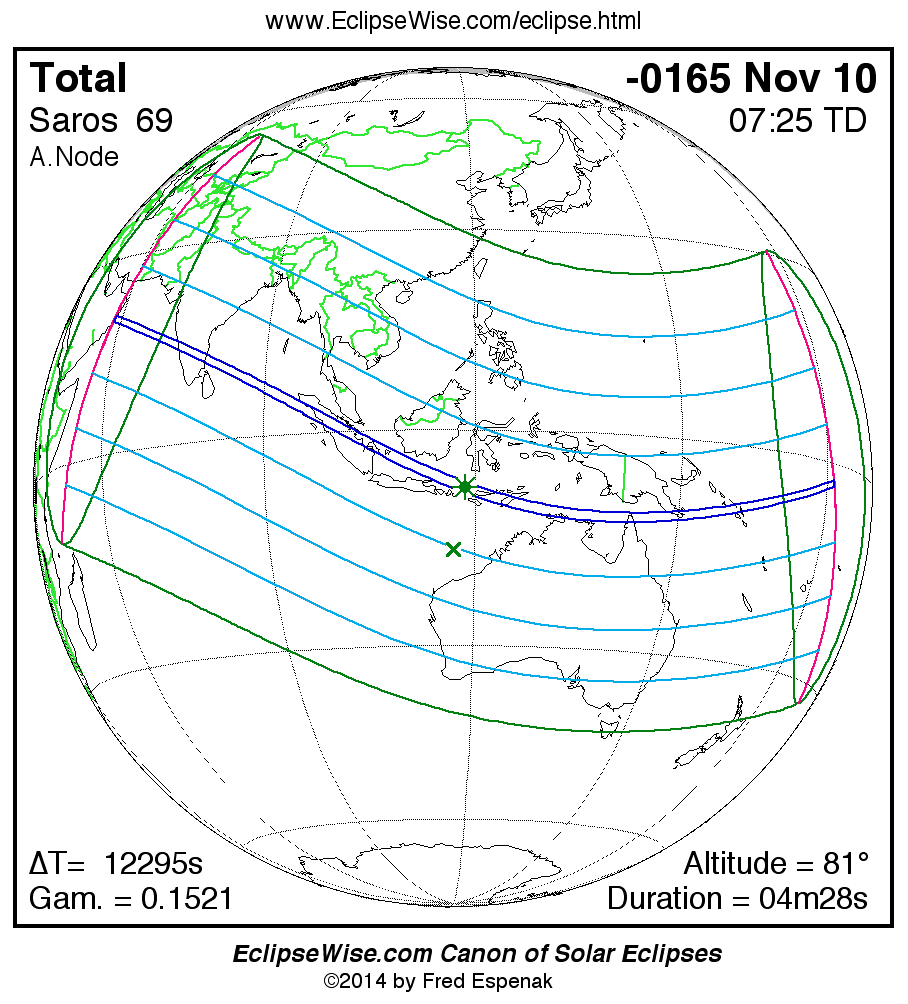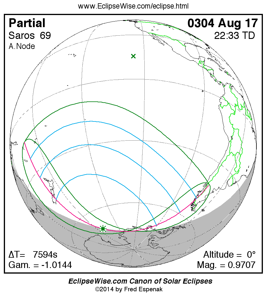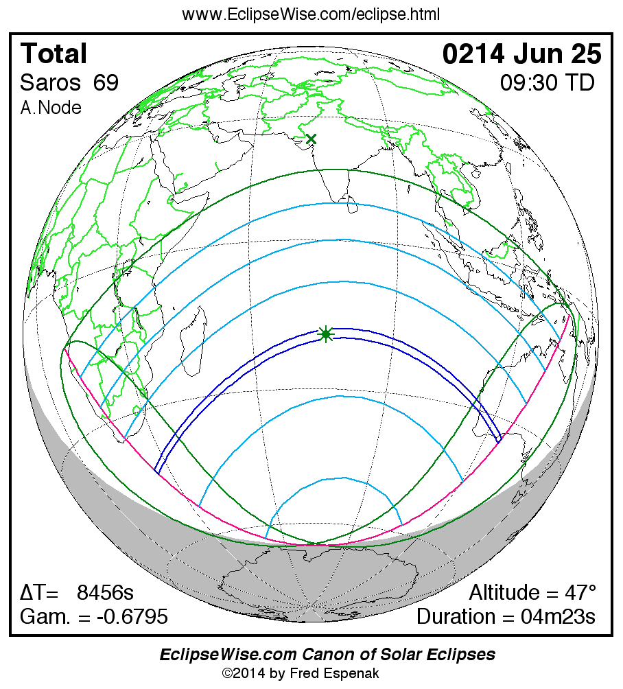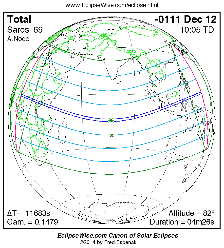 A panorama of all solar eclipses belonging to Saros 69 is presented here. Each map depicts the geographic region of visibility for a single eclipse. For central eclipses, the total or annular path is plotted in either blue (total) or red (annular). The date and time is given for the instant of Greatest Eclipse. Every map serves as a hyperlink to the EclipseWise Prime page for that eclipse where a larger map and complete details for the eclipse can be found. Visit the Key to Solar Eclipse Maps for a detailed explanation of these maps. Near the bottom of the page are a series of hyperlinks for more on solar eclipses.