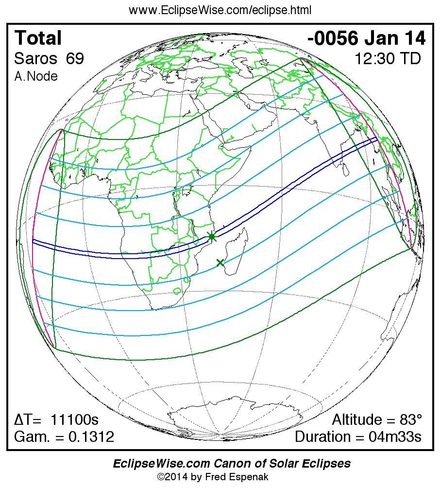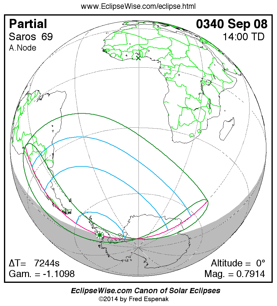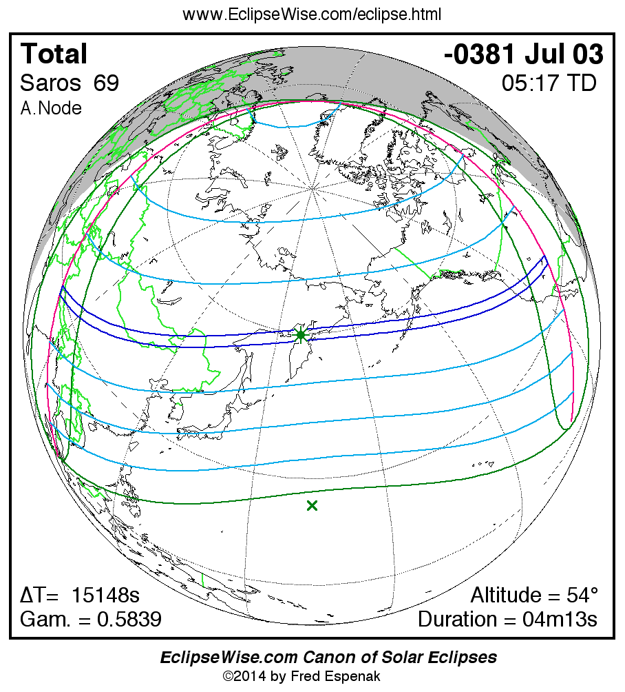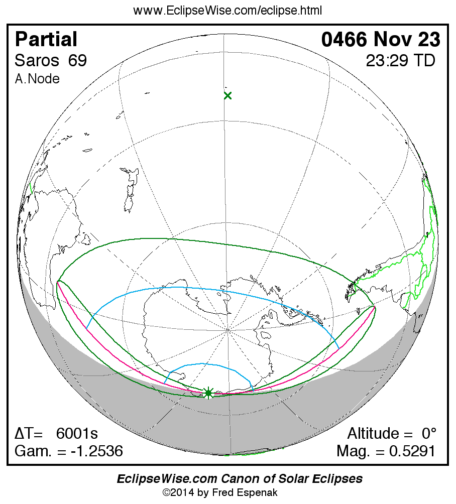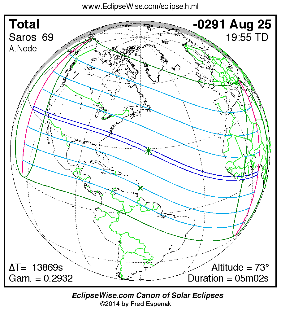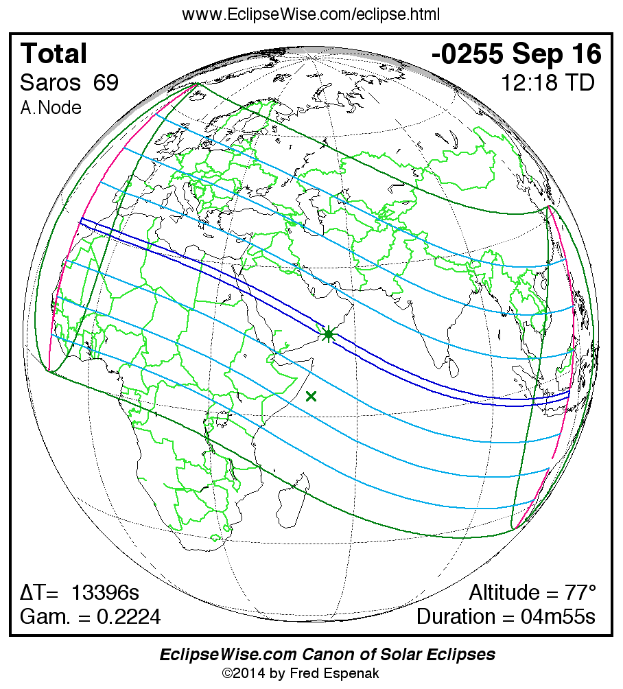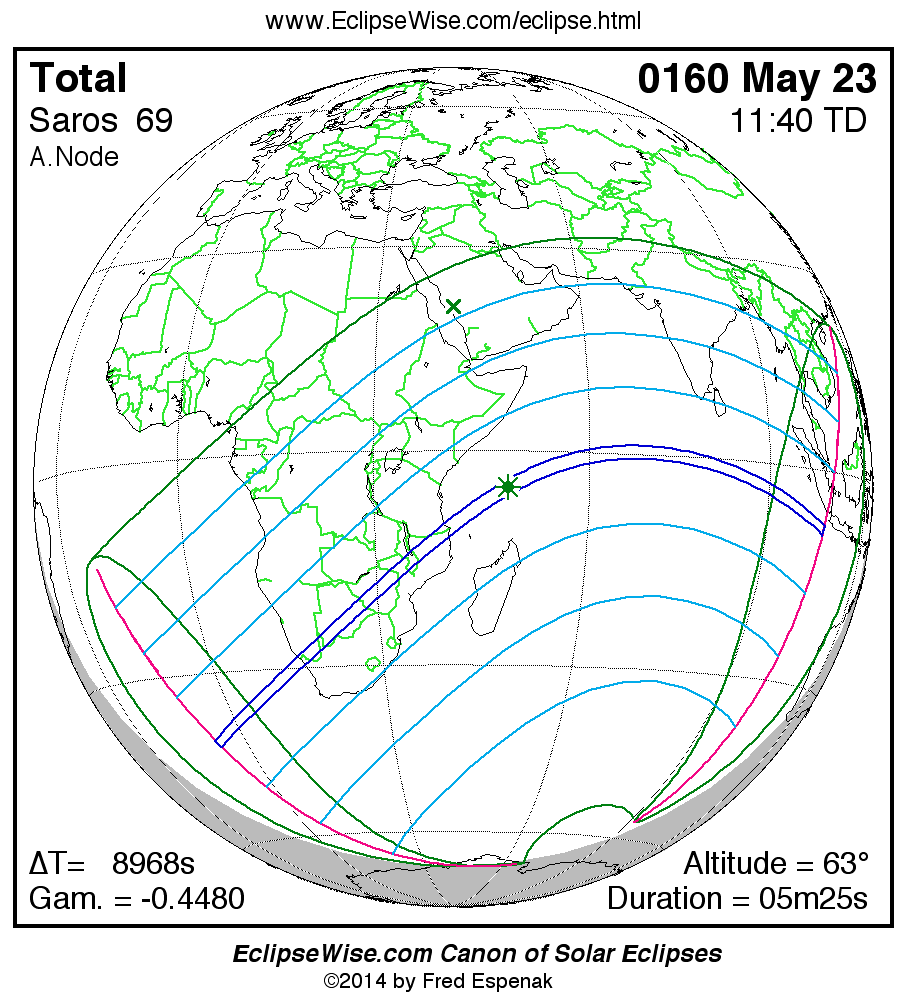 A panorama of all solar eclipses belonging to Saros 69 is presented here. Each map depicts the geographic region of visibility for a single eclipse. For central eclipses, the total or annular path is plotted in either blue (total) or red (annular). The date and time is given for the instant of Greatest Eclipse. Every map serves as a hyperlink to the EclipseWise Prime page for that eclipse where a larger map and complete details for the eclipse can be found. Visit the Key to Solar Eclipse Maps for a detailed explanation of these maps. Near the bottom of the page are a series of hyperlinks for more on solar eclipses.