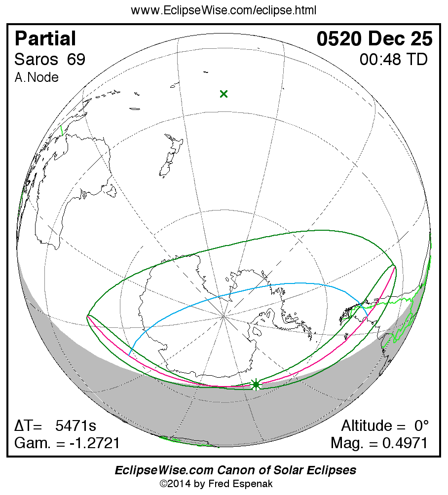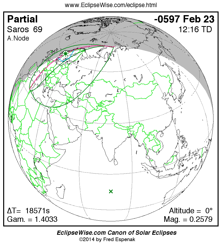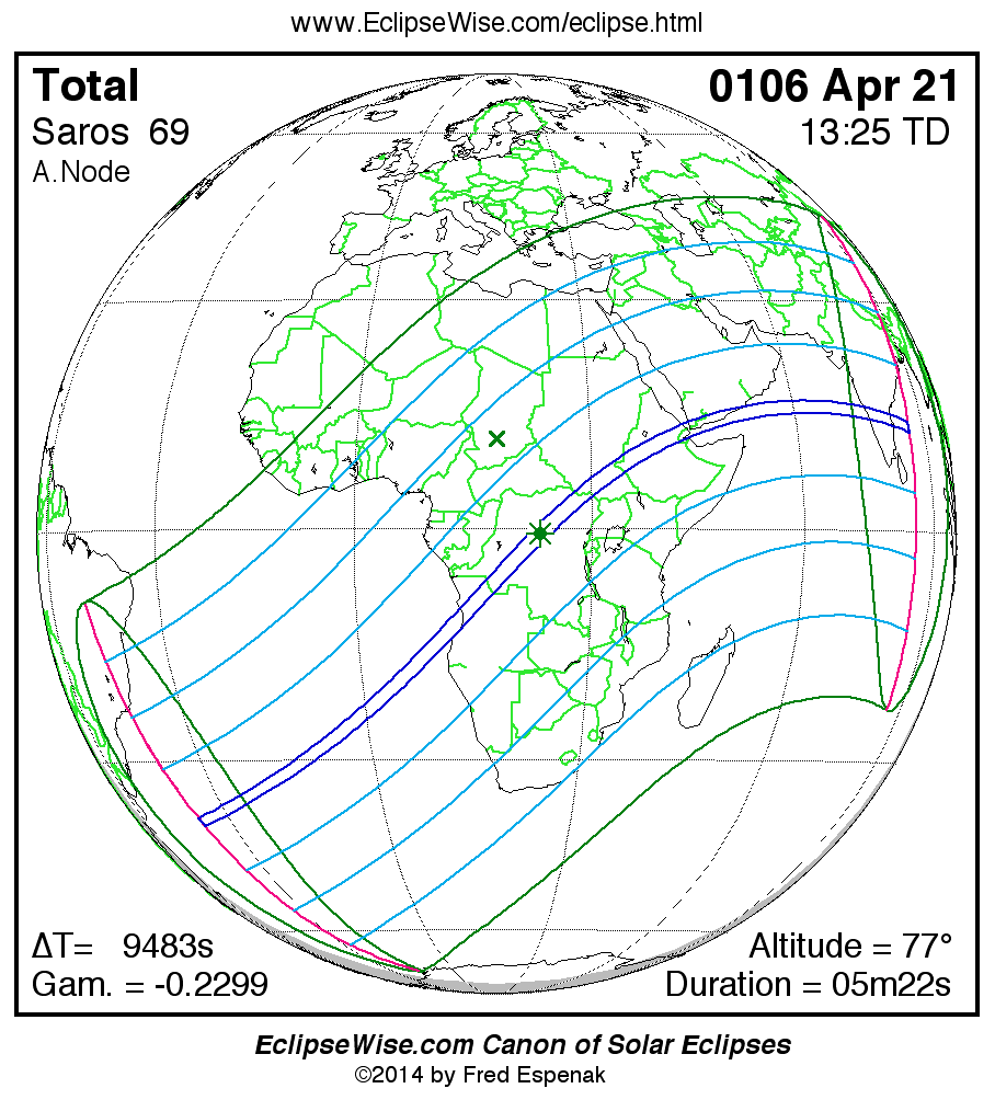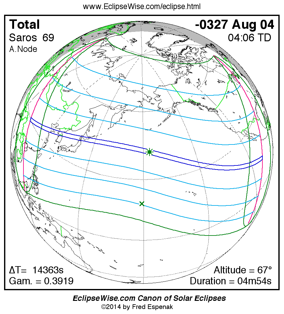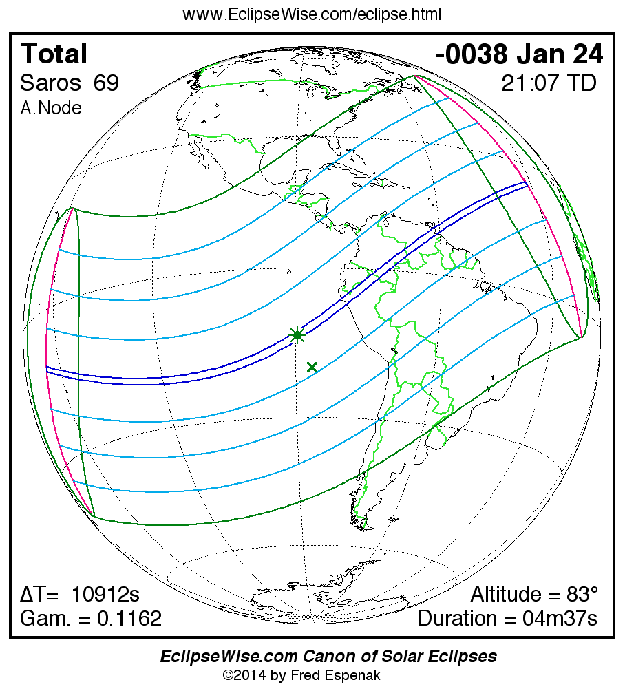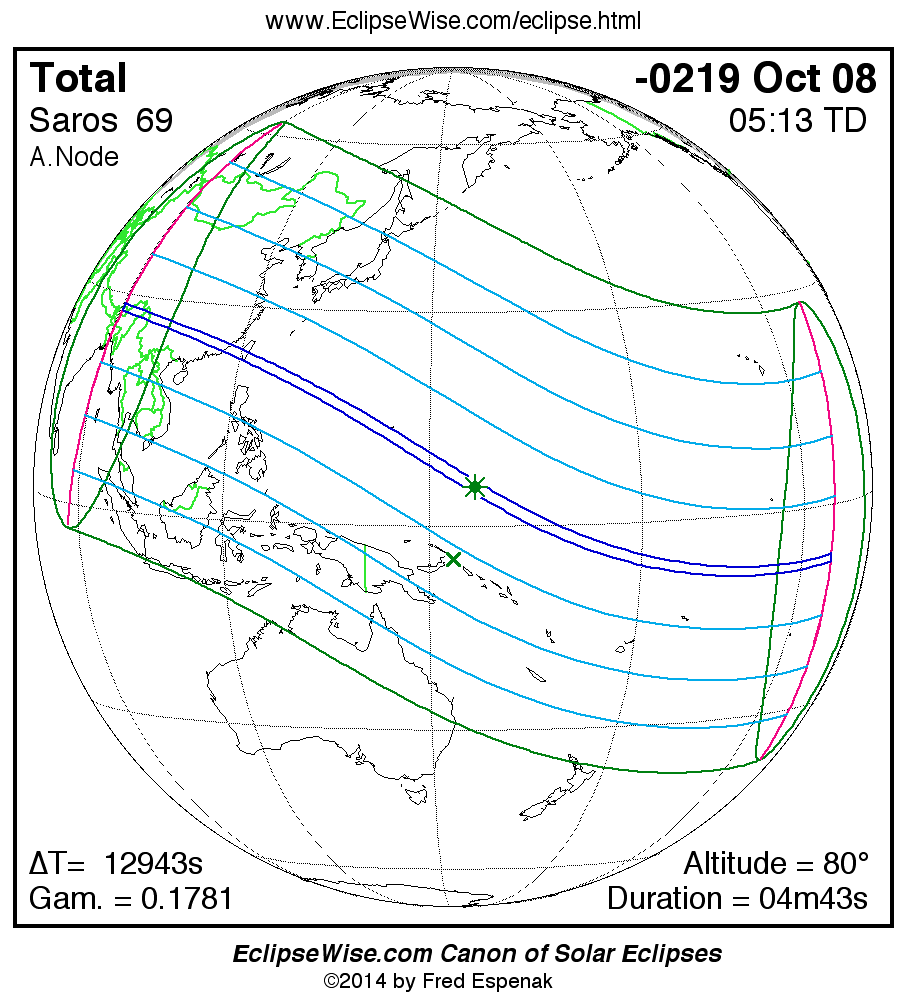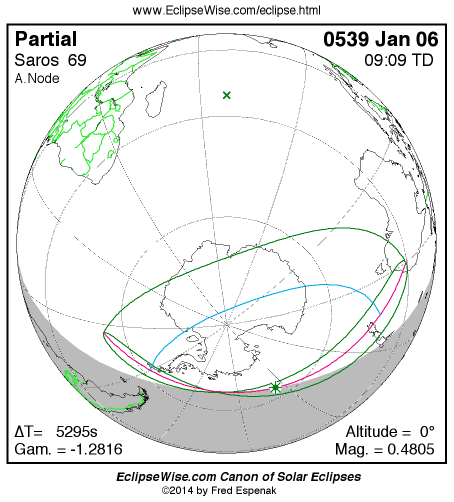 A panorama of all solar eclipses belonging to Saros 69 is presented here. Each map depicts the geographic region of visibility for a single eclipse. For central eclipses, the total or annular path is plotted in either blue (total) or red (annular). The date and time is given for the instant of Greatest Eclipse. Every map serves as a hyperlink to the EclipseWise Prime page for that eclipse where a larger map and complete details for the eclipse can be found. Visit the Key to Solar Eclipse Maps for a detailed explanation of these maps. Near the bottom of the page are a series of hyperlinks for more on solar eclipses.