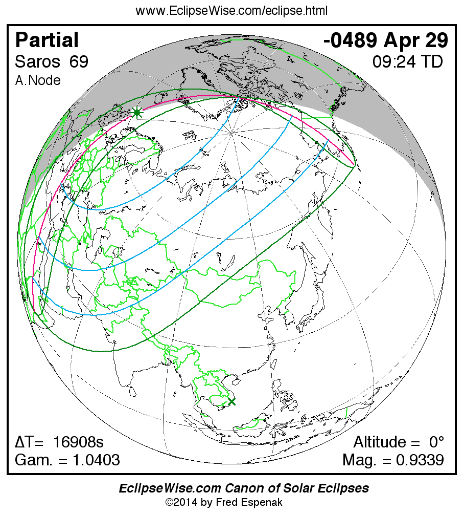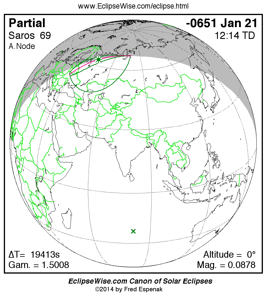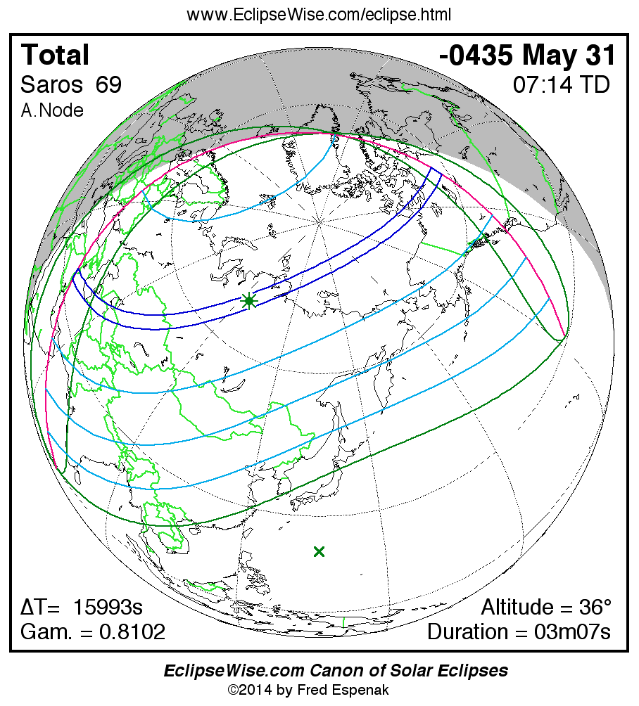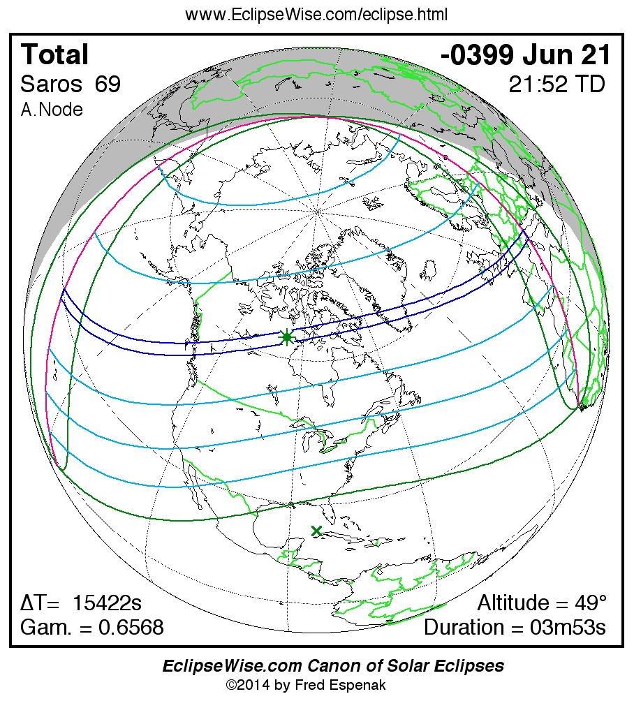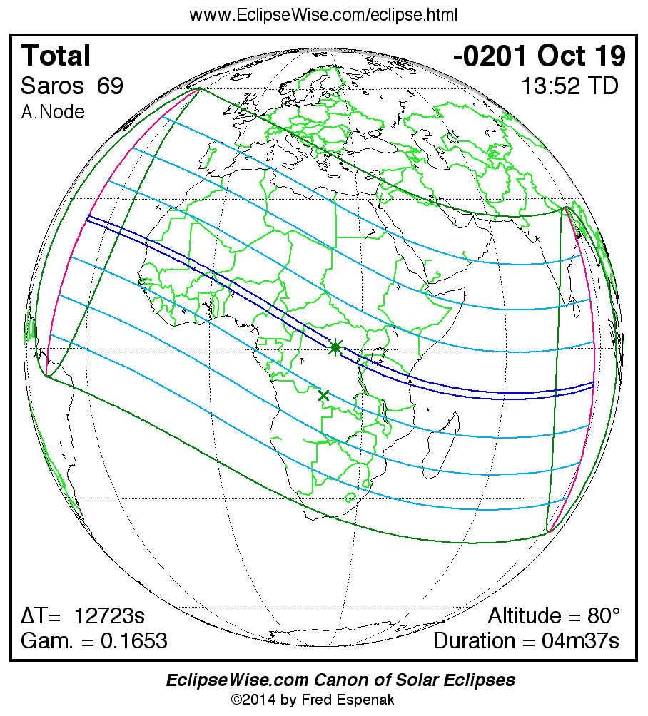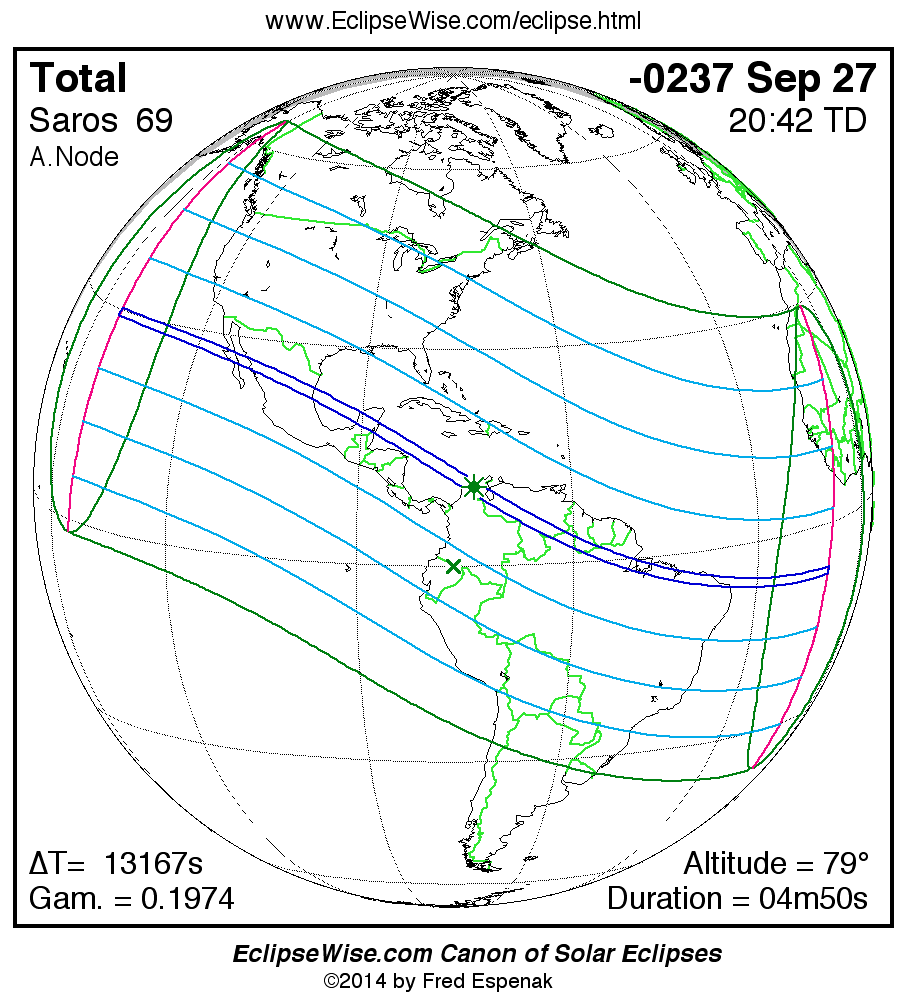 A panorama of all solar eclipses belonging to Saros 69 is presented here. Each map depicts the geographic region of visibility for a single eclipse. For central eclipses, the total or annular path is plotted in either blue (total) or red (annular). The date and time is given for the instant of Greatest Eclipse. Every map serves as a hyperlink to the EclipseWise Prime page for that eclipse where a larger map and complete details for the eclipse can be found. Visit the Key to Solar Eclipse Maps for a detailed explanation of these maps. Near the bottom of the page are a series of hyperlinks for more on solar eclipses.