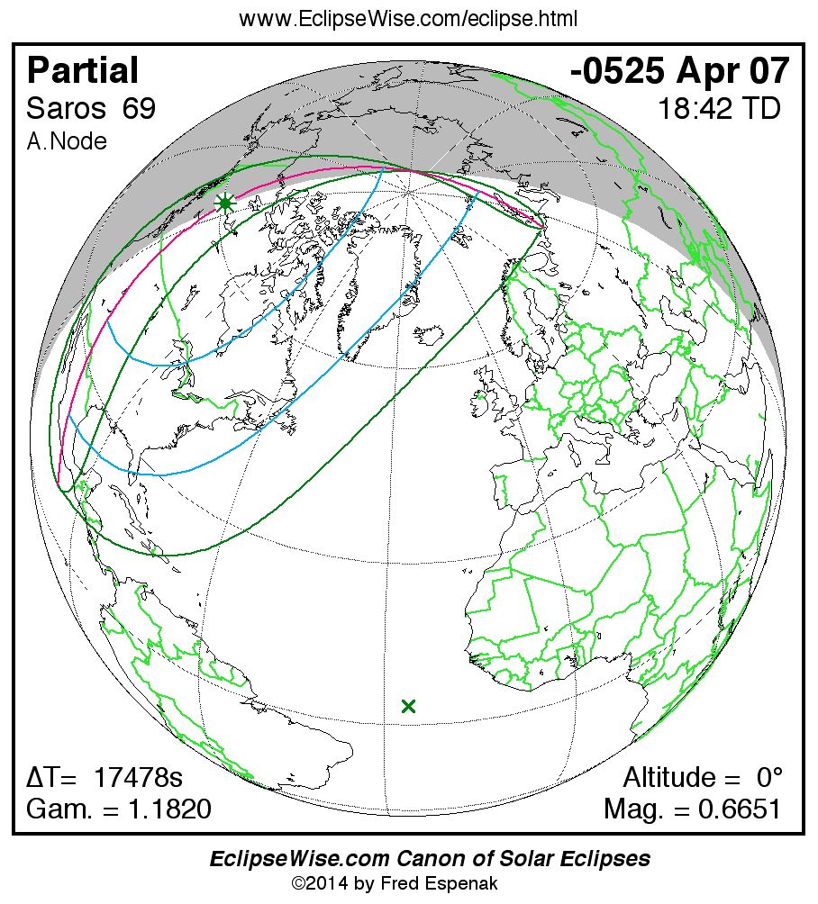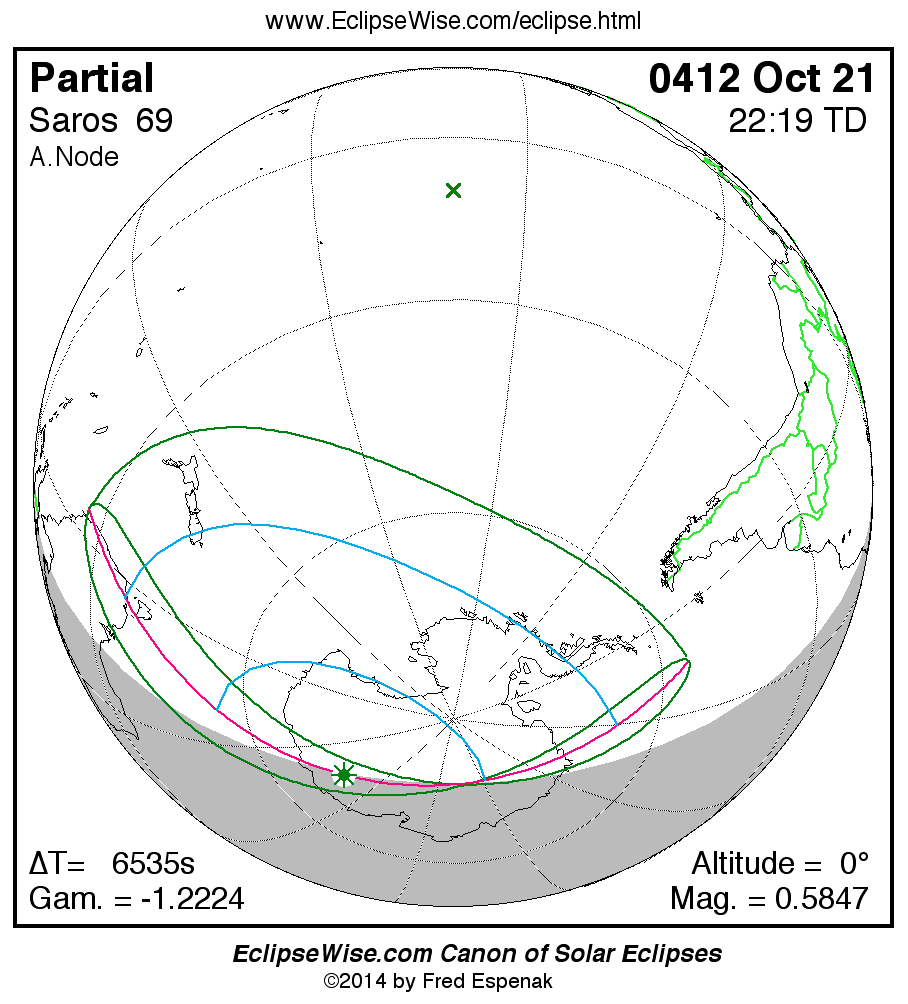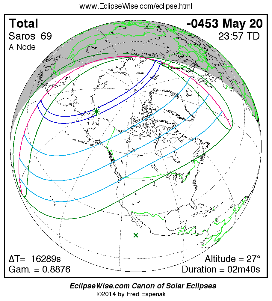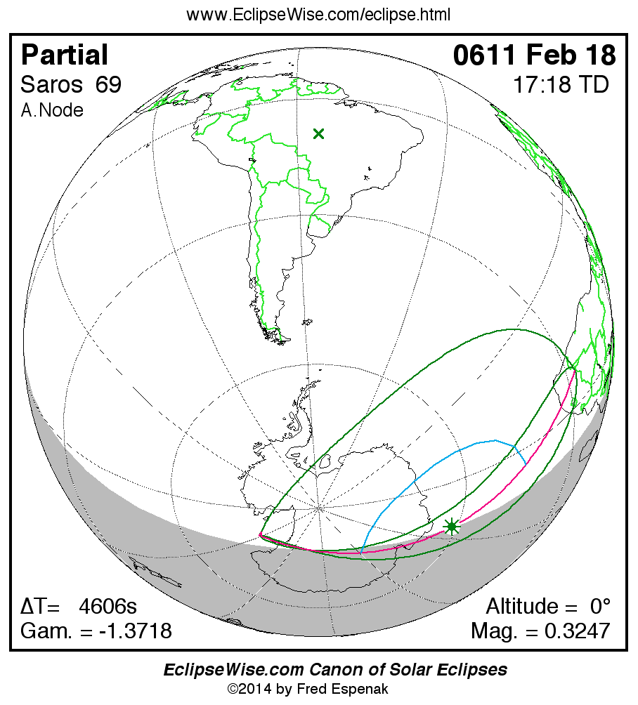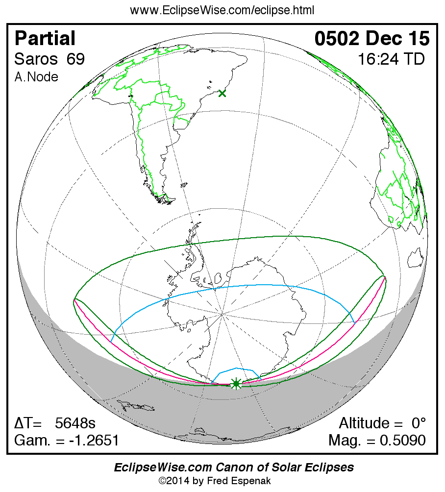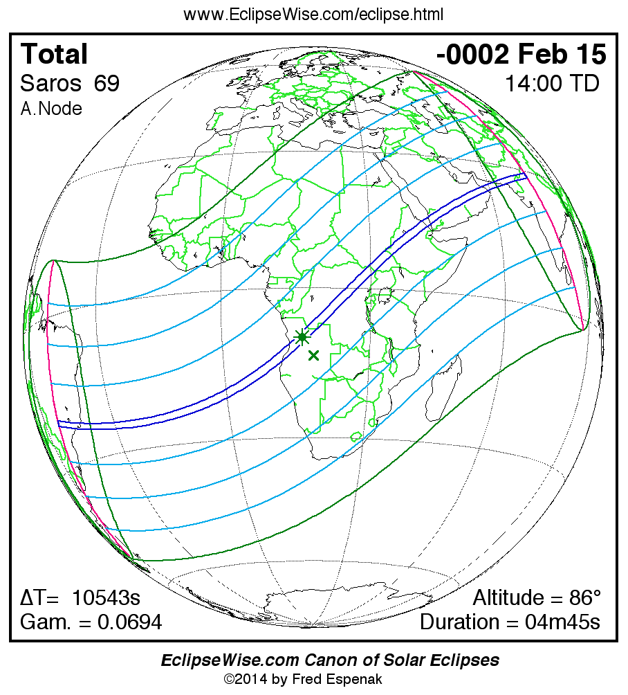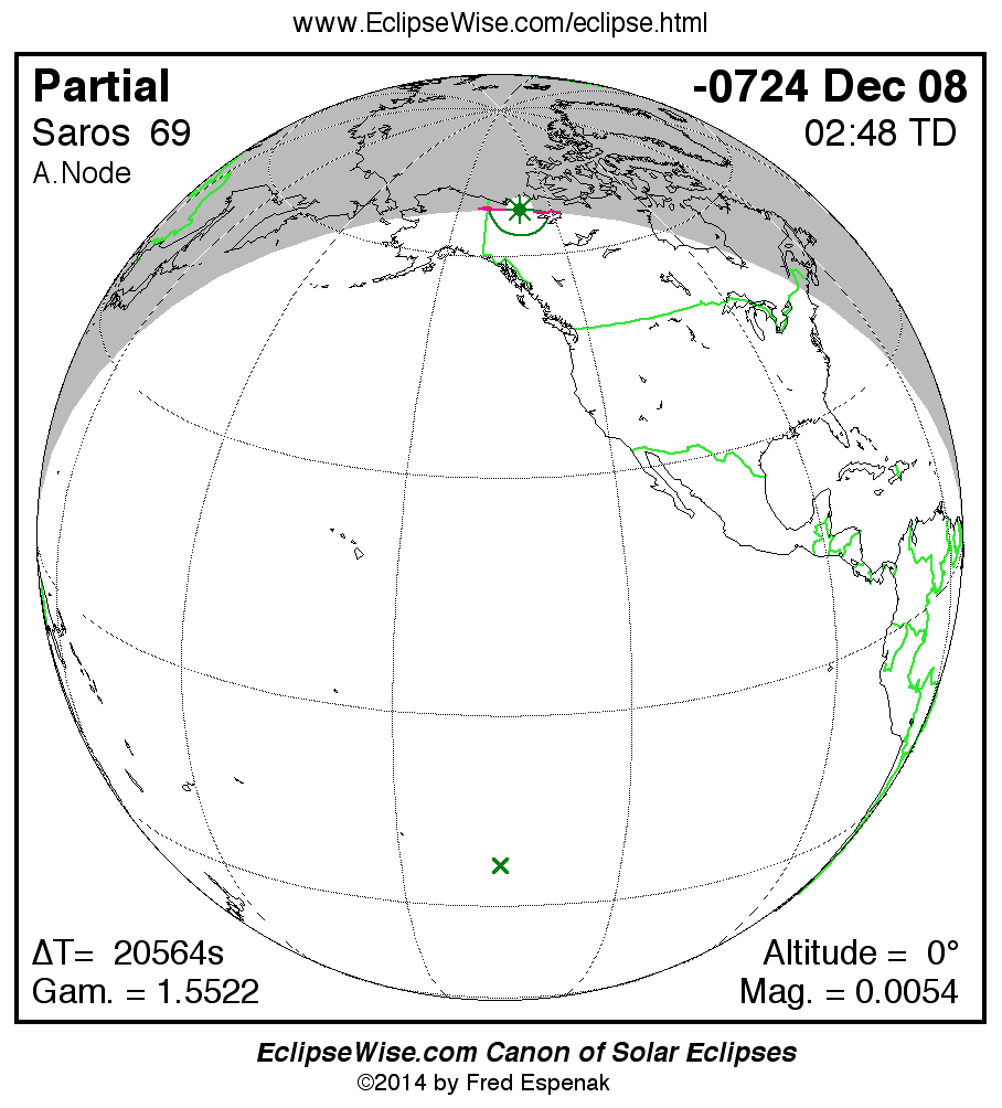 A panorama of all solar eclipses belonging to Saros 69 is presented here. Each map depicts the geographic region of visibility for a single eclipse. For central eclipses, the total or annular path is plotted in either blue (total) or red (annular). The date and time is given for the instant of Greatest Eclipse. Every map serves as a hyperlink to the EclipseWise Prime page for that eclipse where a larger map and complete details for the eclipse can be found. Visit the Key to Solar Eclipse Maps for a detailed explanation of these maps. Near the bottom of the page are a series of hyperlinks for more on solar eclipses.