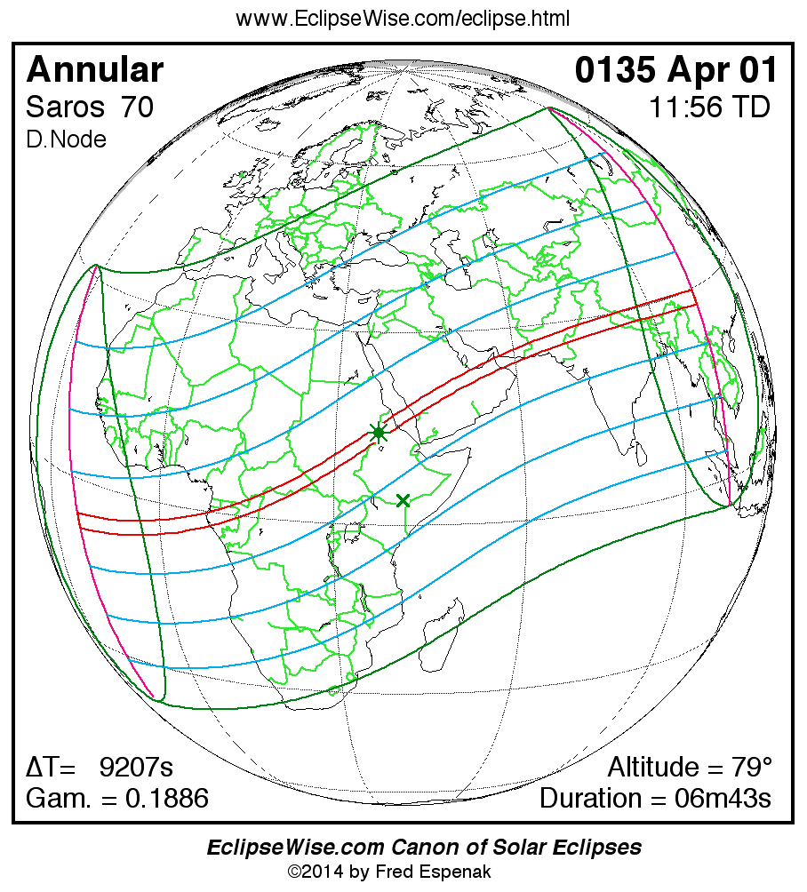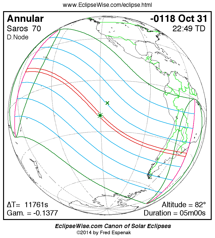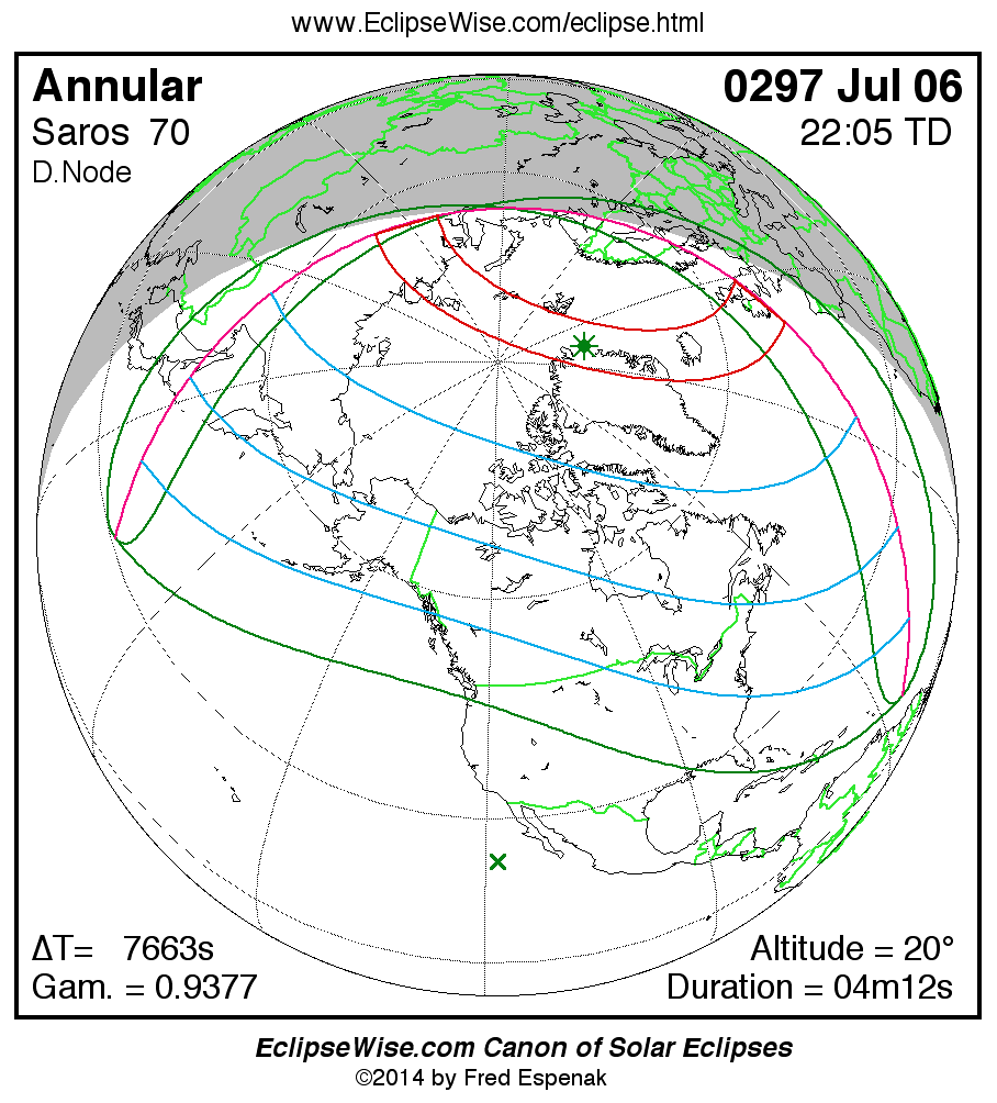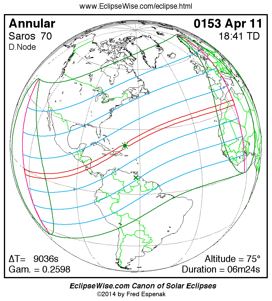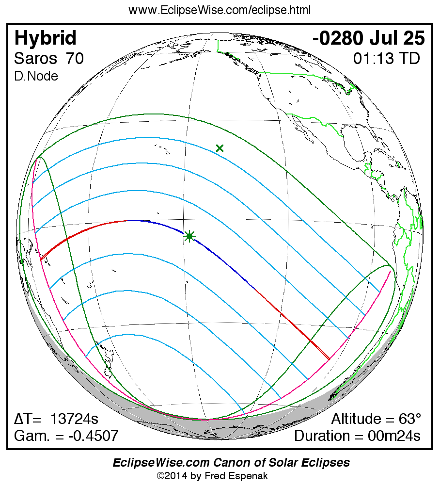 A panorama of all solar eclipses belonging to Saros 70 is presented here. Each map depicts the geographic region of visibility for a single eclipse. For central eclipses, the total or annular path is plotted in either blue (total) or red (annular). The date and time is given for the instant of Greatest Eclipse. Every map serves as a hyperlink to the EclipseWise Prime page for that eclipse where a larger map and complete details for the eclipse can be found. Visit the Key to Solar Eclipse Maps for a detailed explanation of these maps. Near the bottom of the page are a series of hyperlinks for more on solar eclipses.