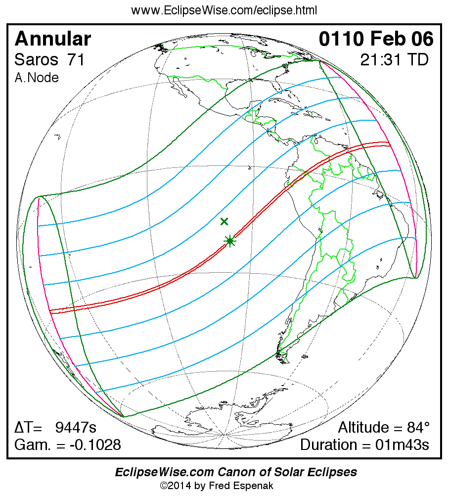 A panorama of all solar eclipses belonging to Saros 71 is presented here. Each map depicts the geographic region of visibility for a single eclipse. For central eclipses, the total or annular path is plotted in either blue (total) or red (annular). The date and time is given for the instant of Greatest Eclipse. Every map serves as a hyperlink to the EclipseWise Prime page for that eclipse where a larger map and complete details for the eclipse can be found. Visit the Key to Solar Eclipse Maps for a detailed explanation of these maps. Near the bottom of the page are a series of hyperlinks for more on solar eclipses.