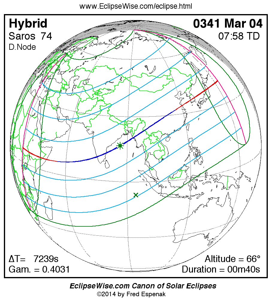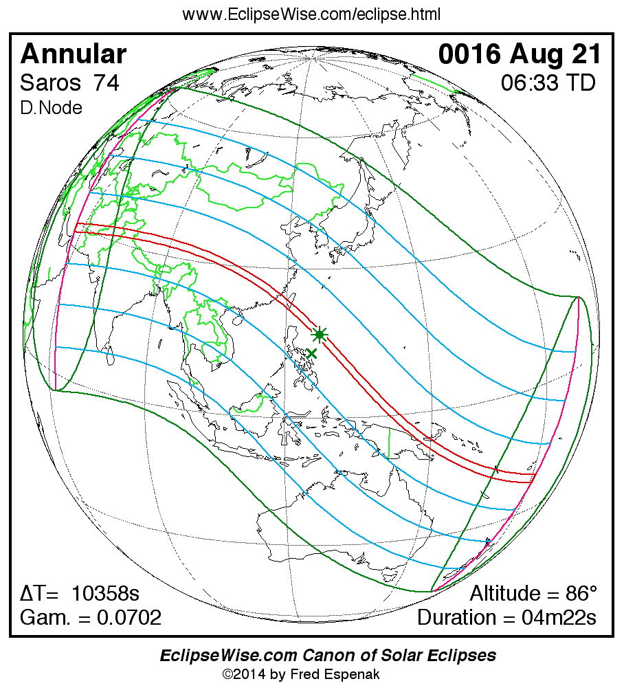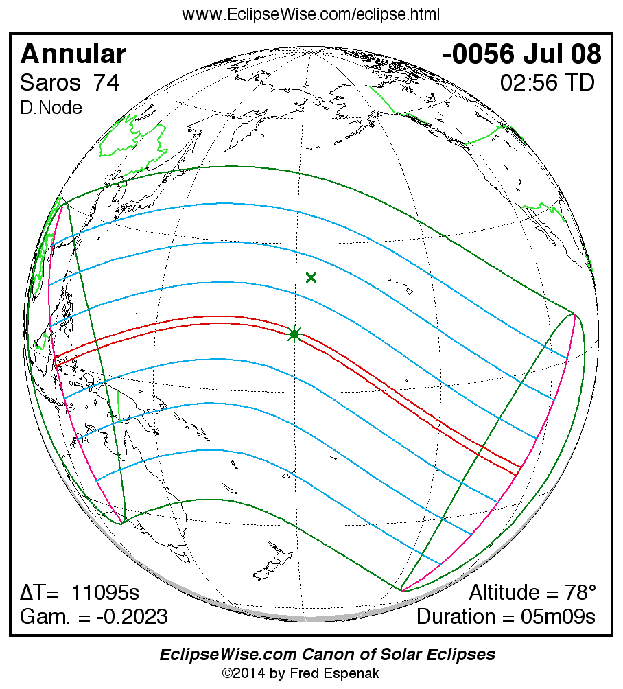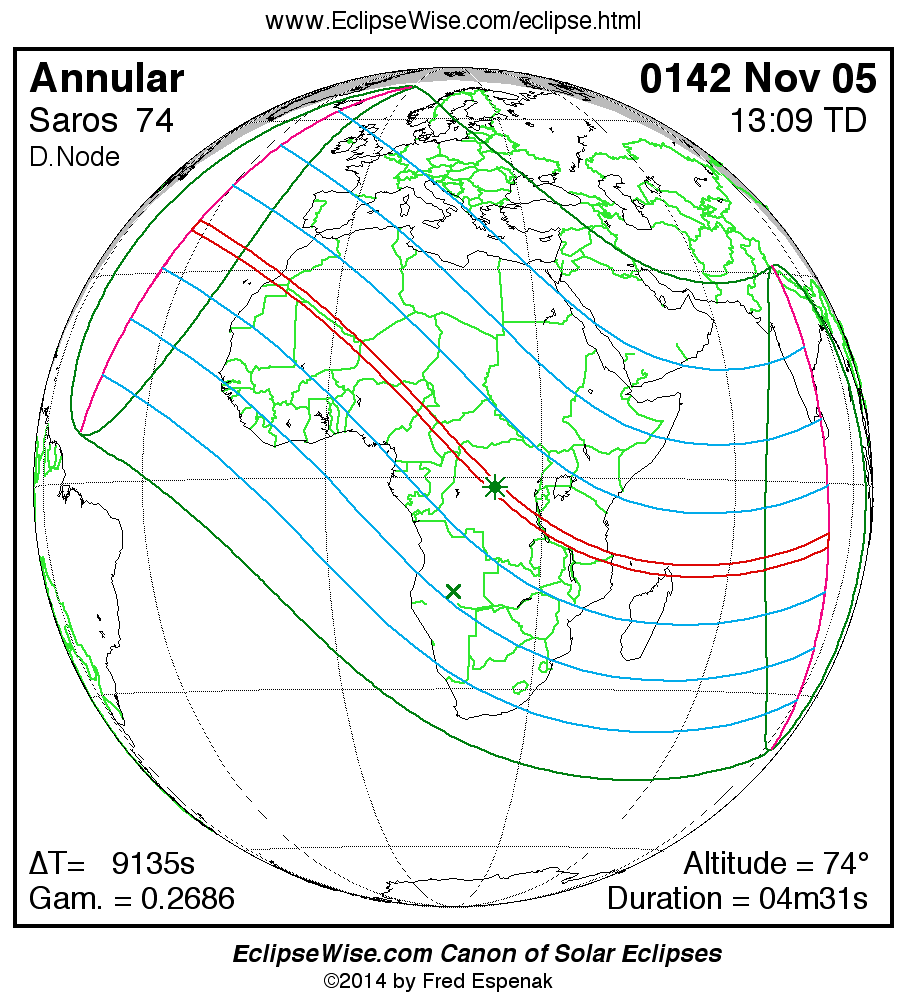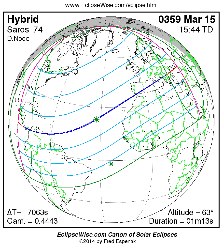 A panorama of all solar eclipses belonging to Saros 74 is presented here. Each map depicts the geographic region of visibility for a single eclipse. For central eclipses, the total or annular path is plotted in either blue (total) or red (annular). The date and time is given for the instant of Greatest Eclipse. Every map serves as a hyperlink to the EclipseWise Prime page for that eclipse where a larger map and complete details for the eclipse can be found. Visit the Key to Solar Eclipse Maps for a detailed explanation of these maps. Near the bottom of the page are a series of hyperlinks for more on solar eclipses.