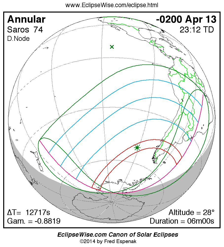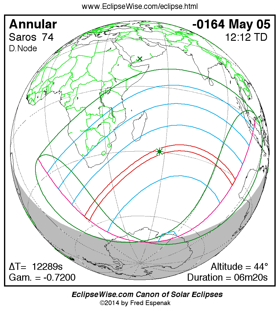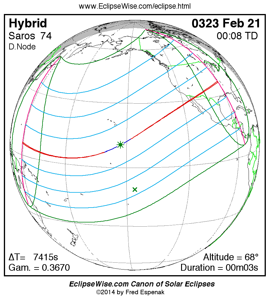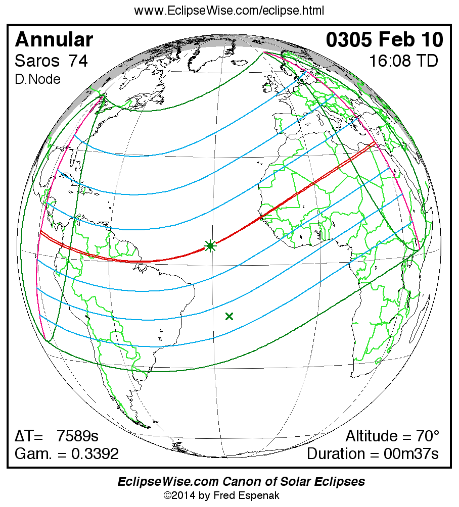 A panorama of all solar eclipses belonging to Saros 74 is presented here. Each map depicts the geographic region of visibility for a single eclipse. For central eclipses, the total or annular path is plotted in either blue (total) or red (annular). The date and time is given for the instant of Greatest Eclipse. Every map serves as a hyperlink to the EclipseWise Prime page for that eclipse where a larger map and complete details for the eclipse can be found. Visit the Key to Solar Eclipse Maps for a detailed explanation of these maps. Near the bottom of the page are a series of hyperlinks for more on solar eclipses.