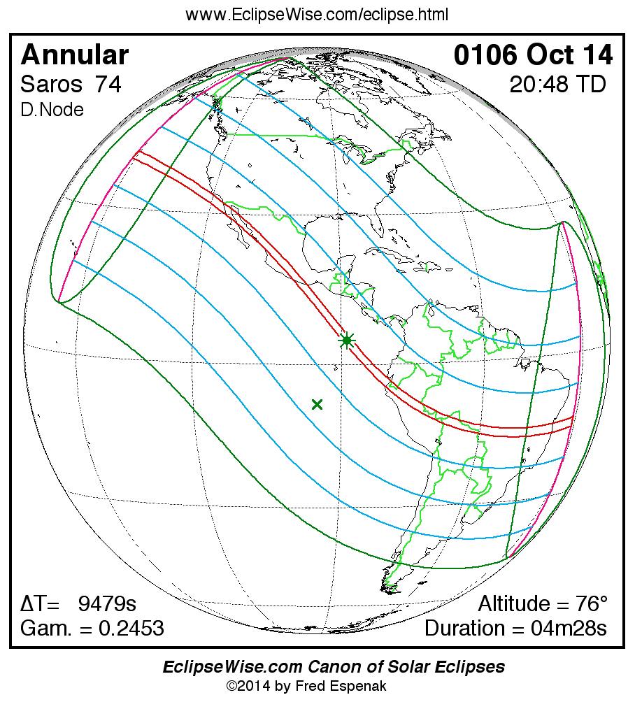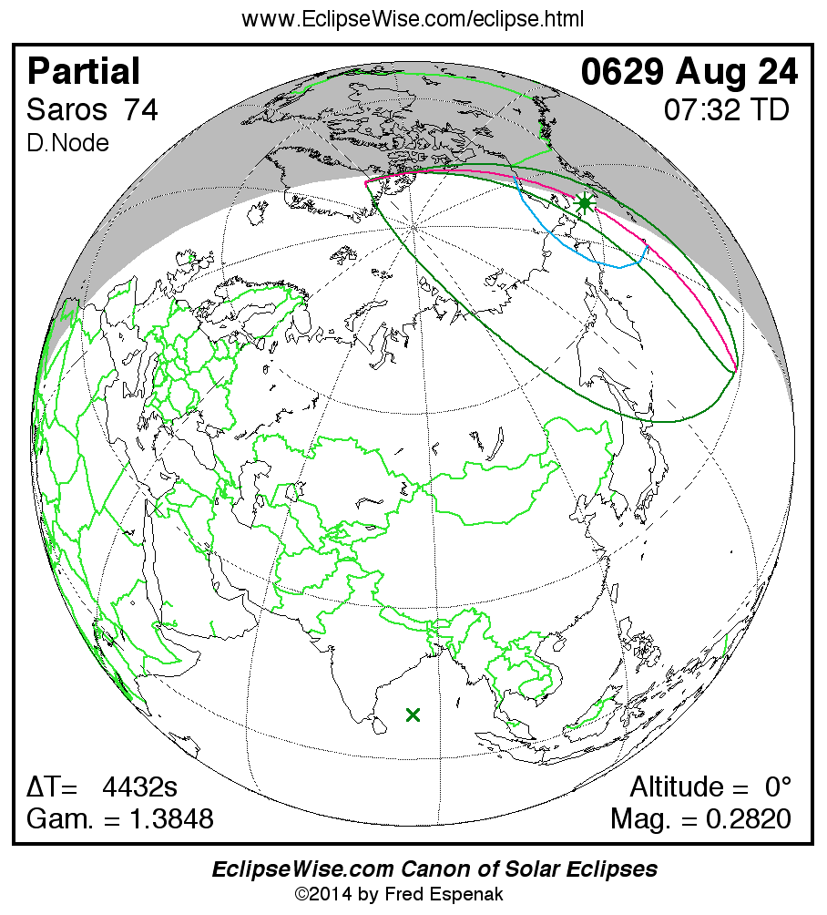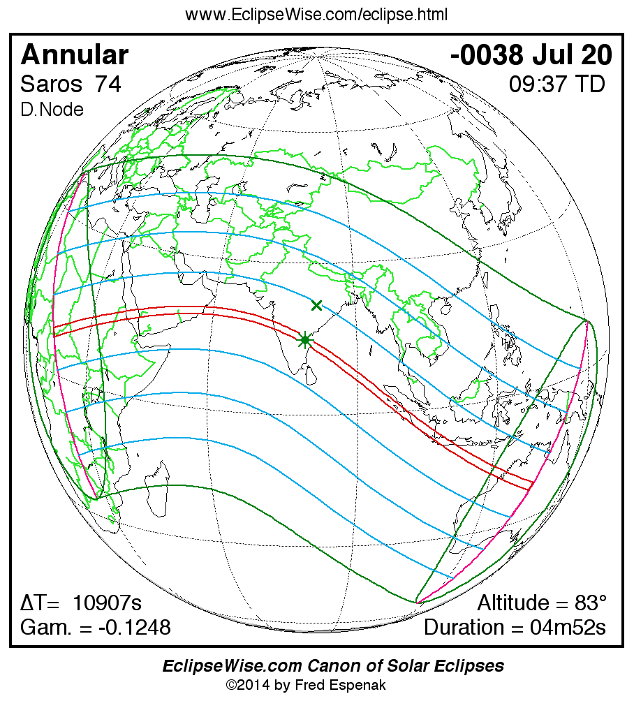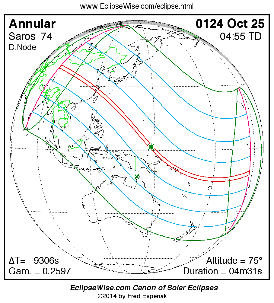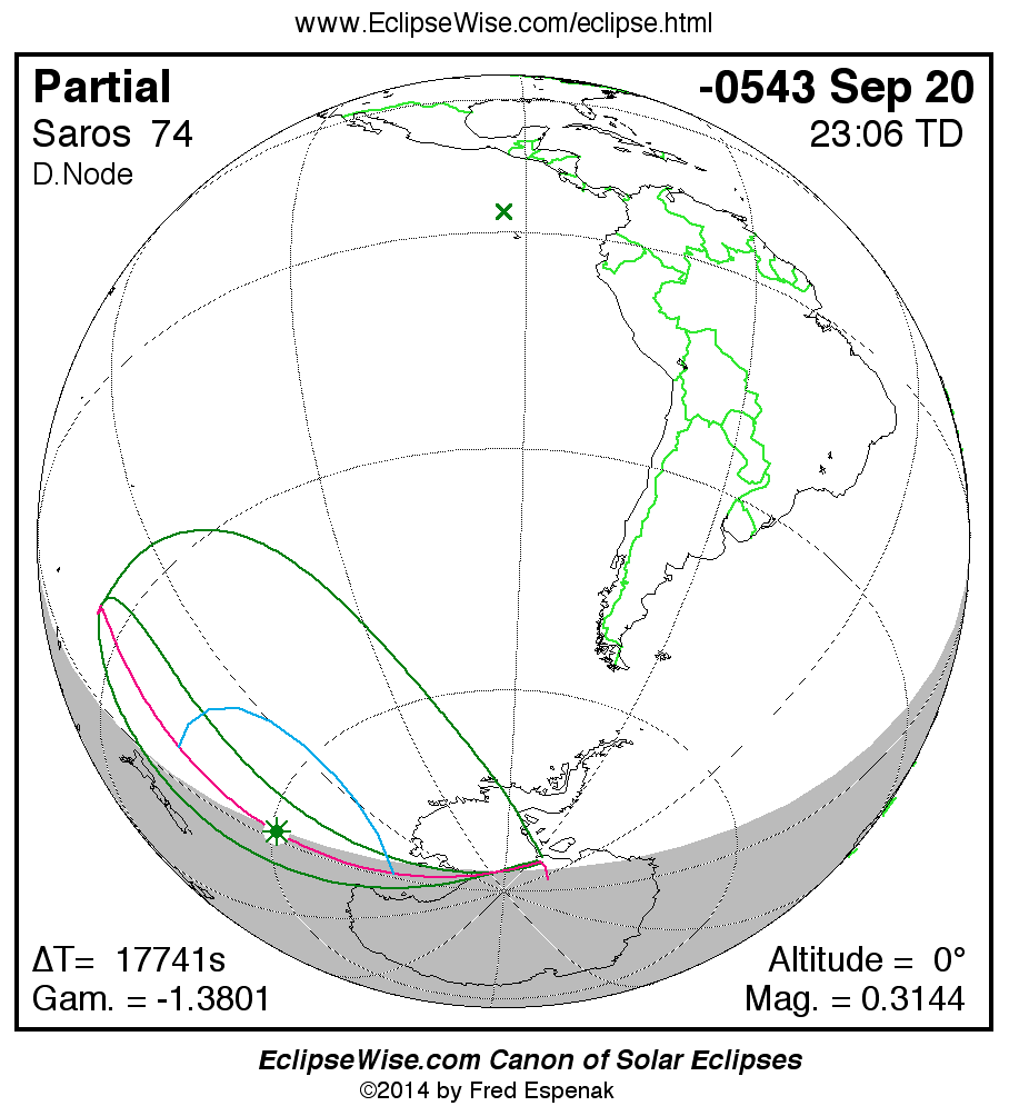 A panorama of all solar eclipses belonging to Saros 74 is presented here. Each map depicts the geographic region of visibility for a single eclipse. For central eclipses, the total or annular path is plotted in either blue (total) or red (annular). The date and time is given for the instant of Greatest Eclipse. Every map serves as a hyperlink to the EclipseWise Prime page for that eclipse where a larger map and complete details for the eclipse can be found. Visit the Key to Solar Eclipse Maps for a detailed explanation of these maps. Near the bottom of the page are a series of hyperlinks for more on solar eclipses.