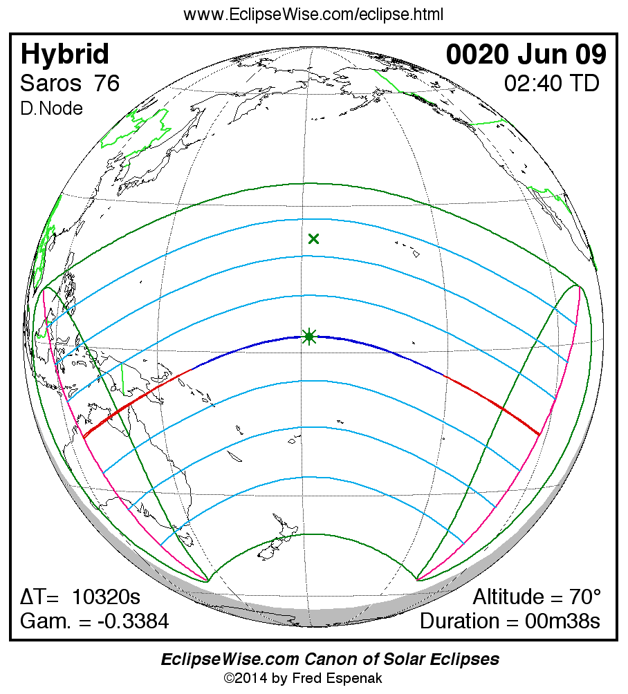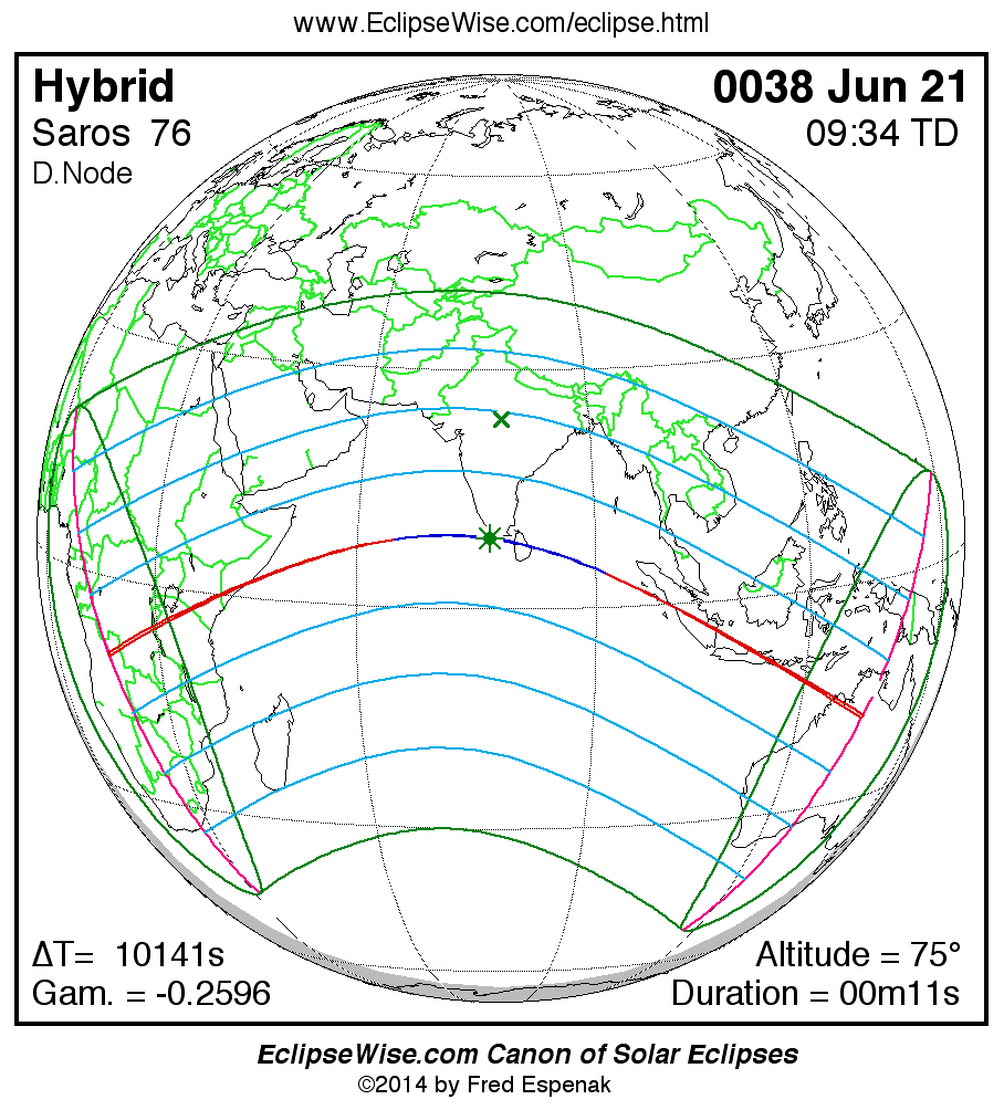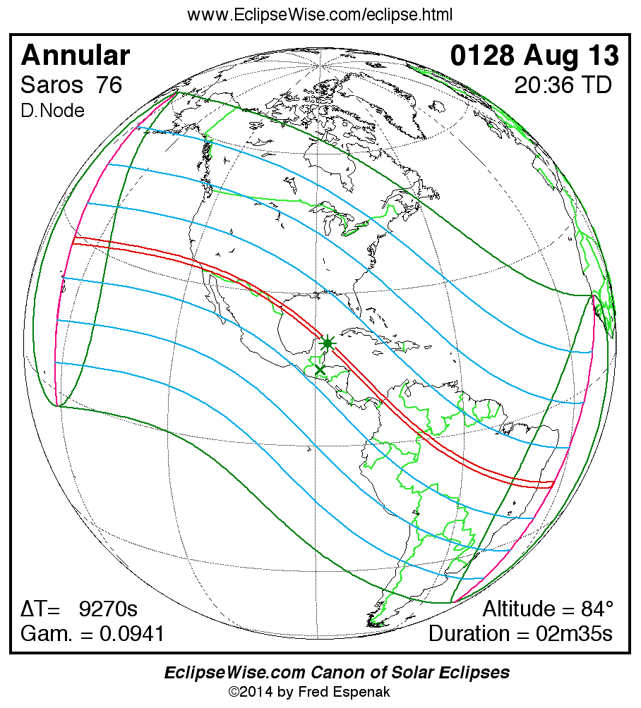 A panorama of all solar eclipses belonging to Saros 76 is presented here. Each map depicts the geographic region of visibility for a single eclipse. For central eclipses, the total or annular path is plotted in either blue (total) or red (annular). The date and time is given for the instant of Greatest Eclipse. Every map serves as a hyperlink to the EclipseWise Prime page for that eclipse where a larger map and complete details for the eclipse can be found. Visit the Key to Solar Eclipse Maps for a detailed explanation of these maps. Near the bottom of the page are a series of hyperlinks for more on solar eclipses.