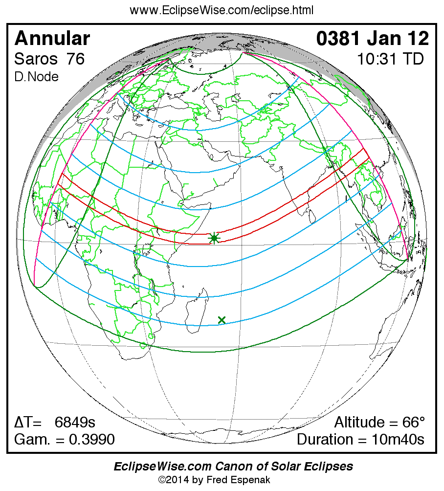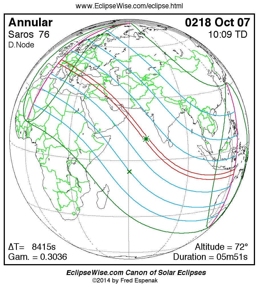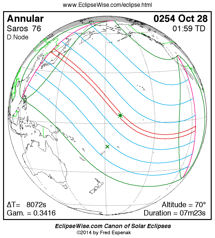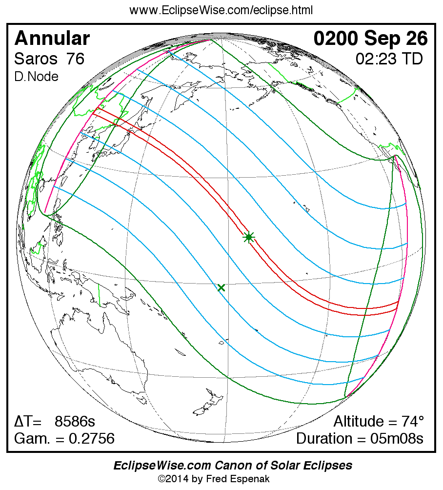 A panorama of all solar eclipses belonging to Saros 76 is presented here. Each map depicts the geographic region of visibility for a single eclipse. For central eclipses, the total or annular path is plotted in either blue (total) or red (annular). The date and time is given for the instant of Greatest Eclipse. Every map serves as a hyperlink to the EclipseWise Prime page for that eclipse where a larger map and complete details for the eclipse can be found. Visit the Key to Solar Eclipse Maps for a detailed explanation of these maps. Near the bottom of the page are a series of hyperlinks for more on solar eclipses.