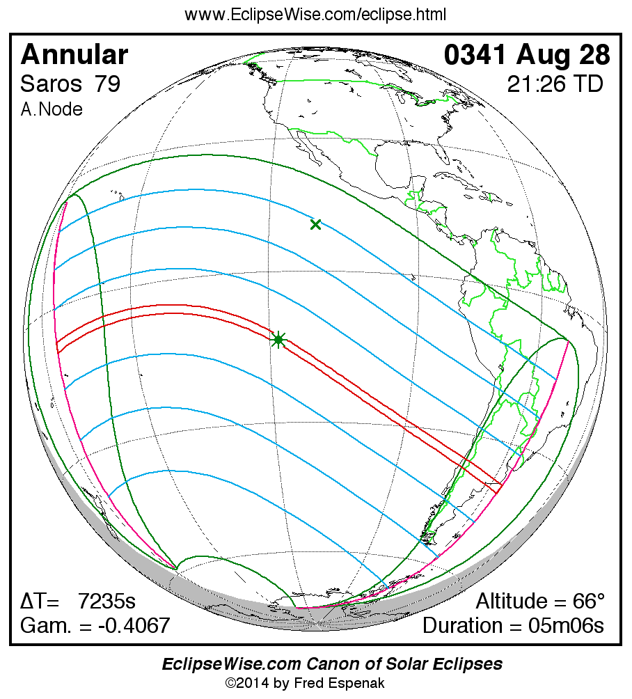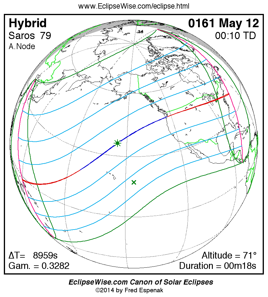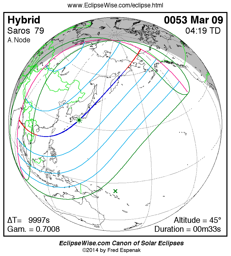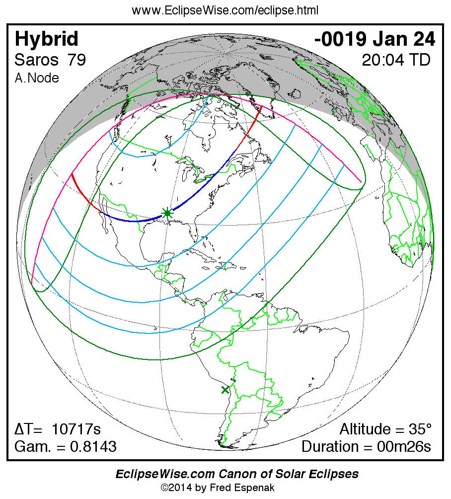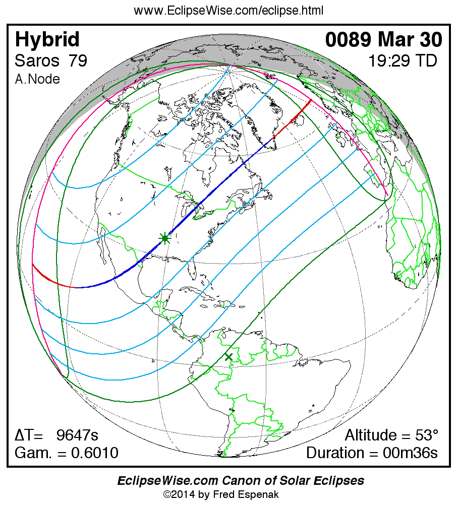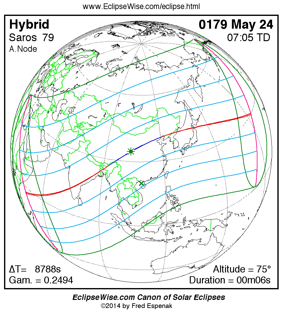 A panorama of all solar eclipses belonging to Saros 79 is presented here. Each map depicts the geographic region of visibility for a single eclipse. For central eclipses, the total or annular path is plotted in either blue (total) or red (annular). The date and time is given for the instant of Greatest Eclipse. Every map serves as a hyperlink to the EclipseWise Prime page for that eclipse where a larger map and complete details for the eclipse can be found. Visit the Key to Solar Eclipse Maps for a detailed explanation of these maps. Near the bottom of the page are a series of hyperlinks for more on solar eclipses.