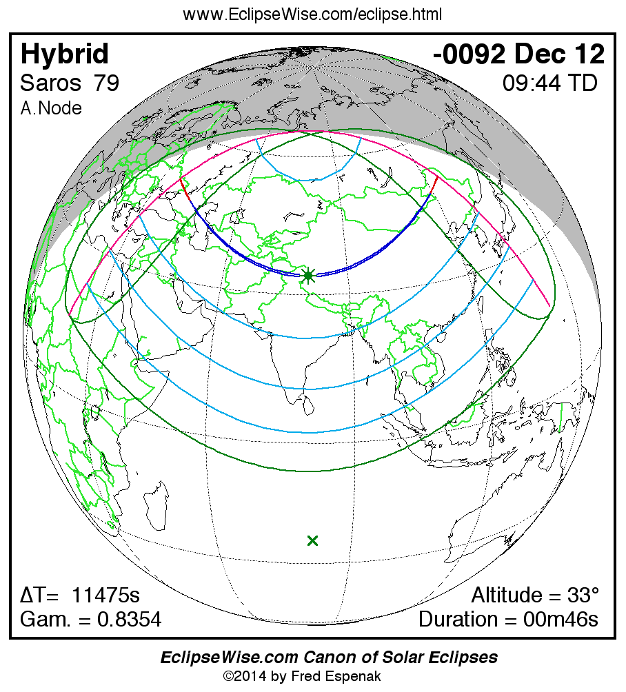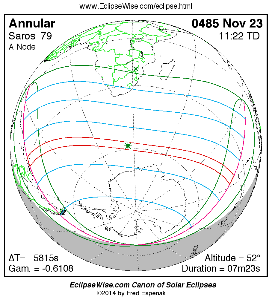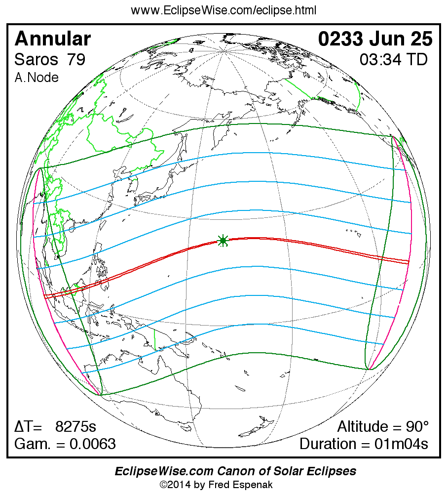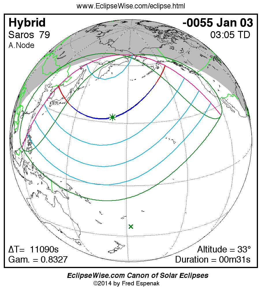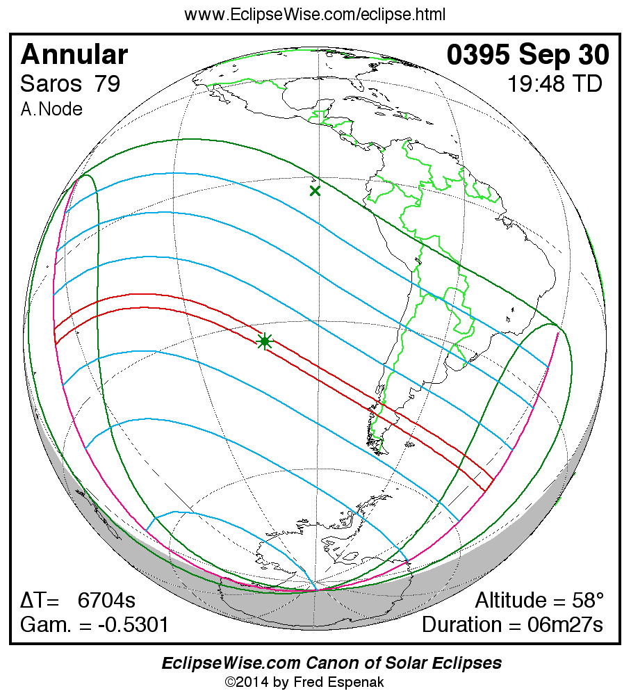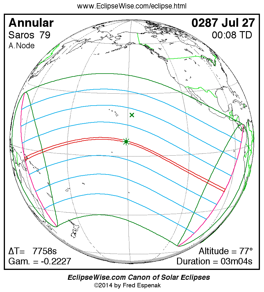 A panorama of all solar eclipses belonging to Saros 79 is presented here. Each map depicts the geographic region of visibility for a single eclipse. For central eclipses, the total or annular path is plotted in either blue (total) or red (annular). The date and time is given for the instant of Greatest Eclipse. Every map serves as a hyperlink to the EclipseWise Prime page for that eclipse where a larger map and complete details for the eclipse can be found. Visit the Key to Solar Eclipse Maps for a detailed explanation of these maps. Near the bottom of the page are a series of hyperlinks for more on solar eclipses.