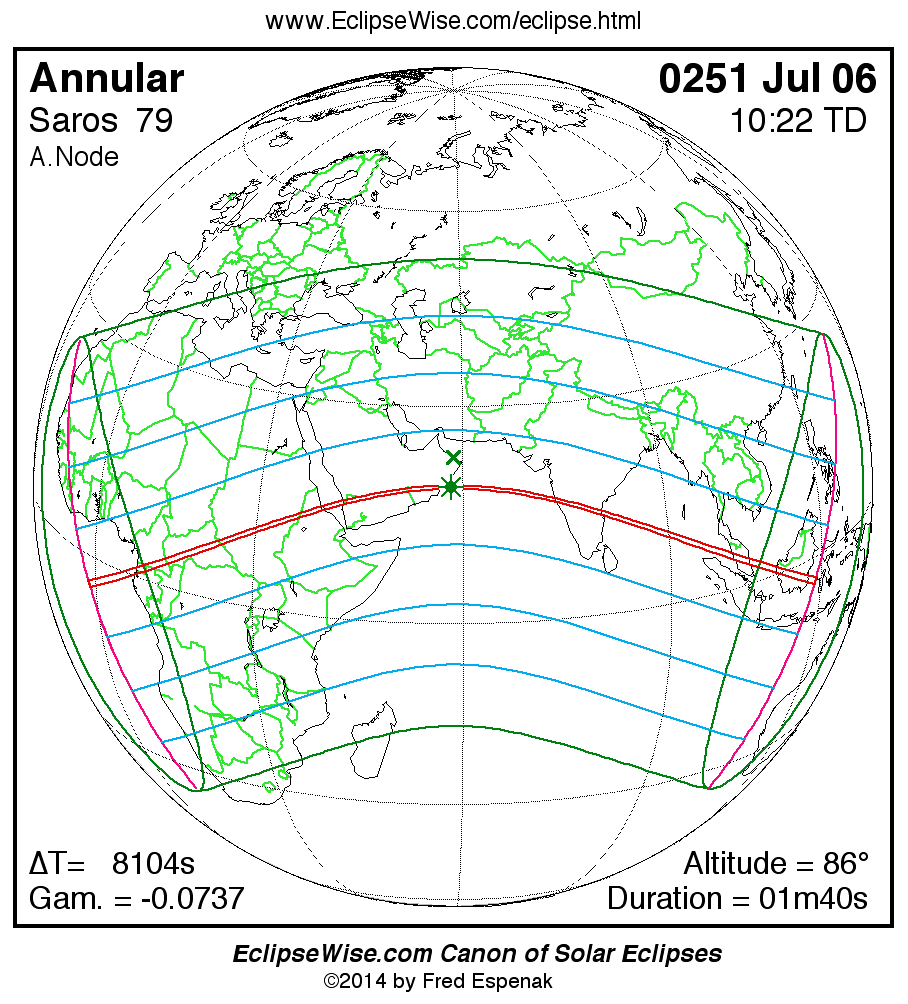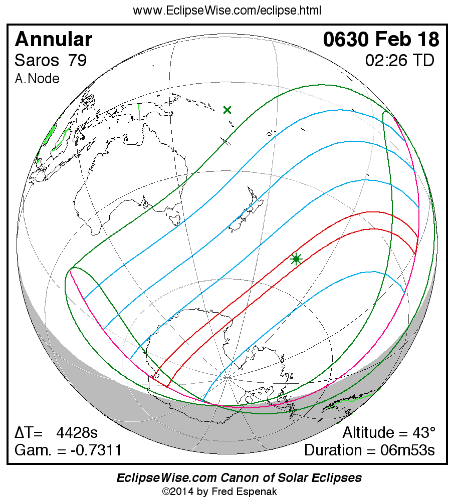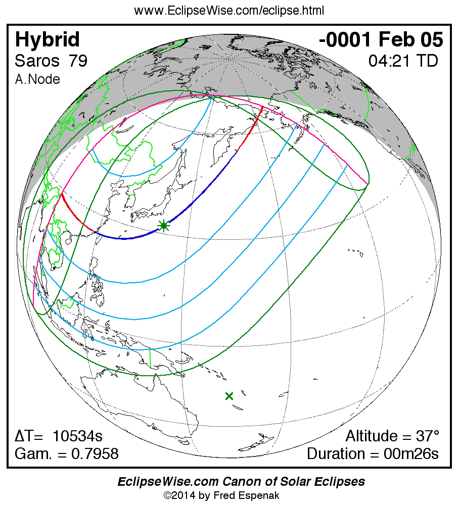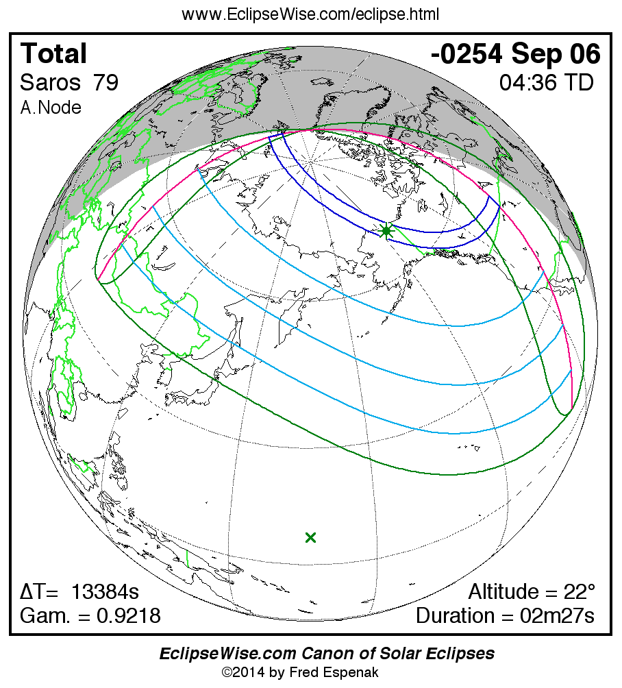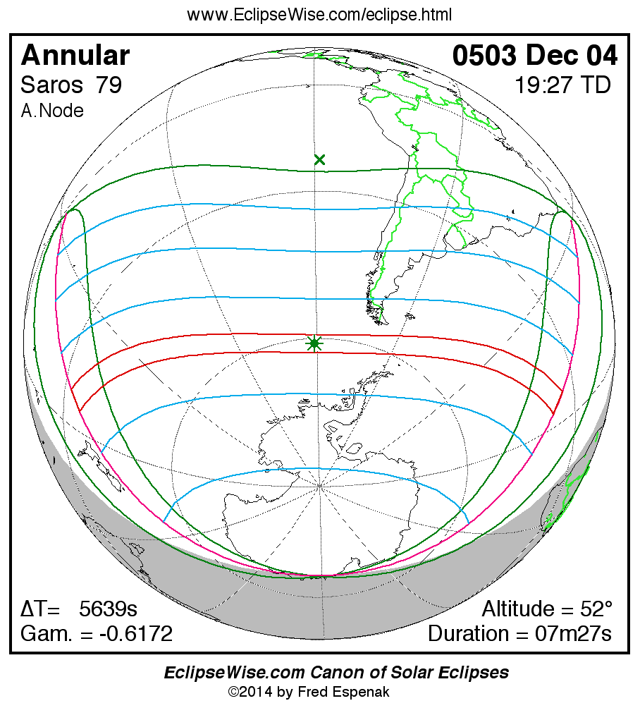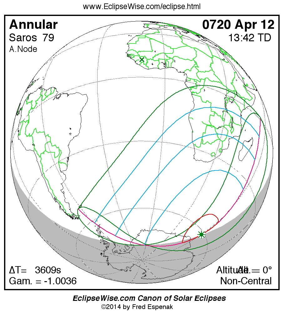 A panorama of all solar eclipses belonging to Saros 79 is presented here. Each map depicts the geographic region of visibility for a single eclipse. For central eclipses, the total or annular path is plotted in either blue (total) or red (annular). The date and time is given for the instant of Greatest Eclipse. Every map serves as a hyperlink to the EclipseWise Prime page for that eclipse where a larger map and complete details for the eclipse can be found. Visit the Key to Solar Eclipse Maps for a detailed explanation of these maps. Near the bottom of the page are a series of hyperlinks for more on solar eclipses.