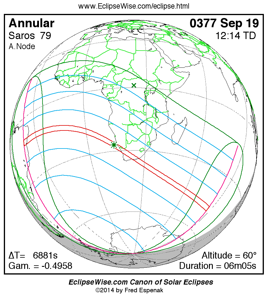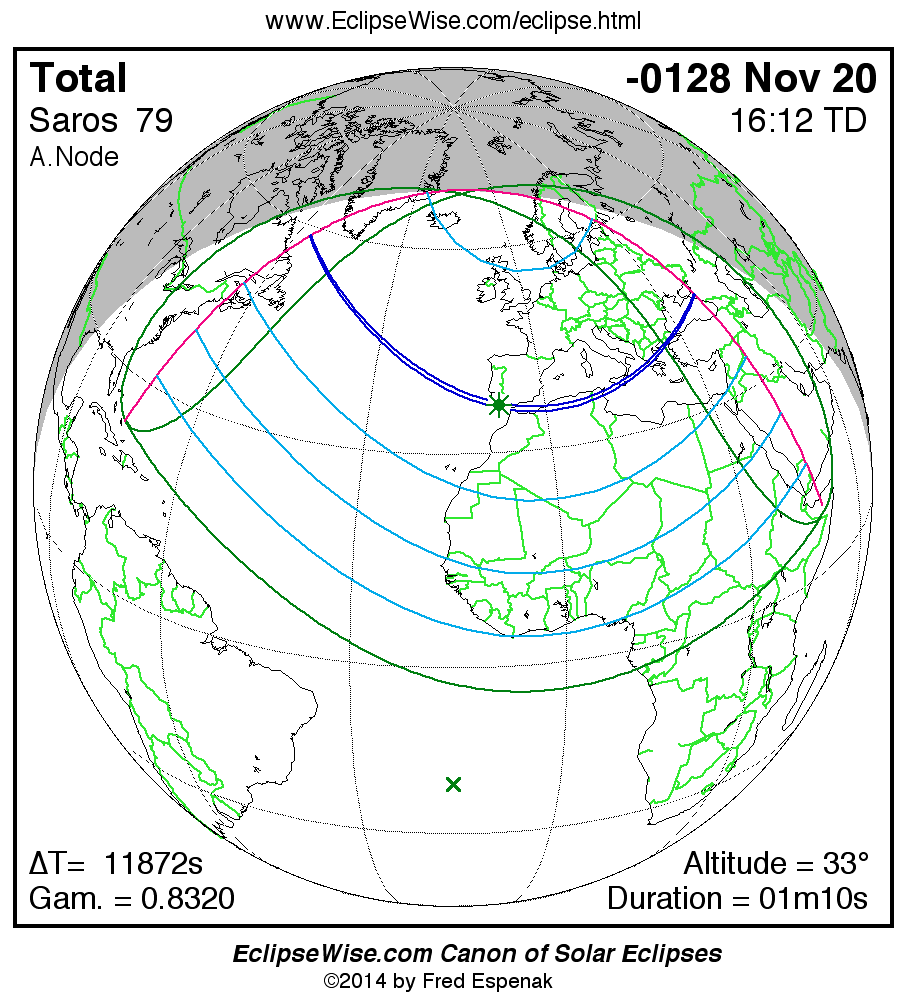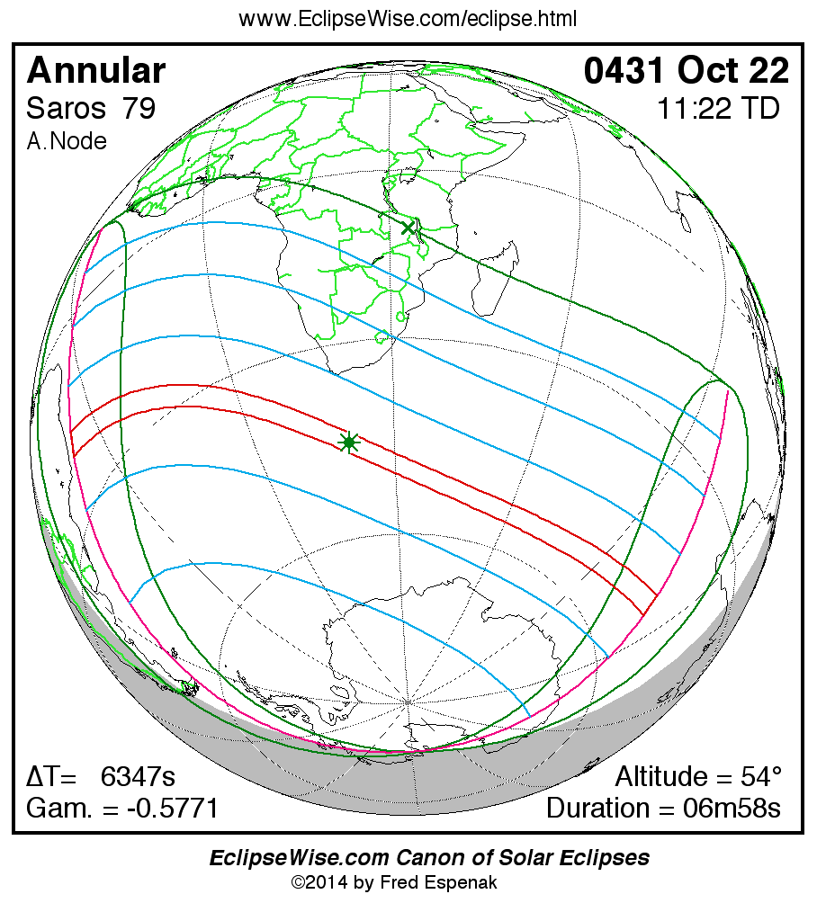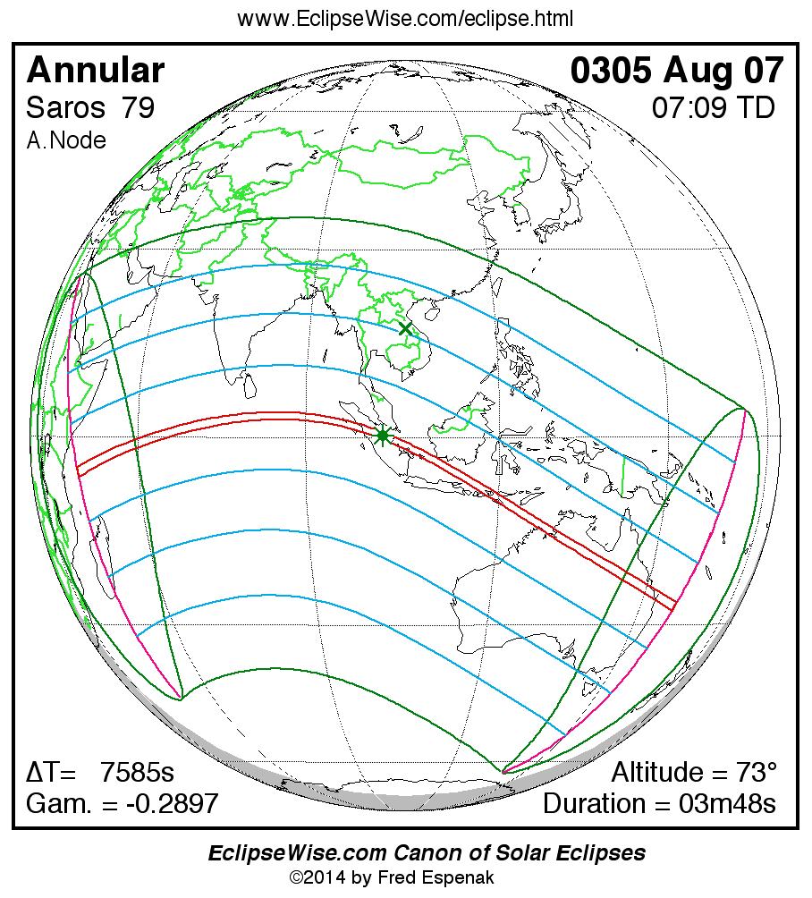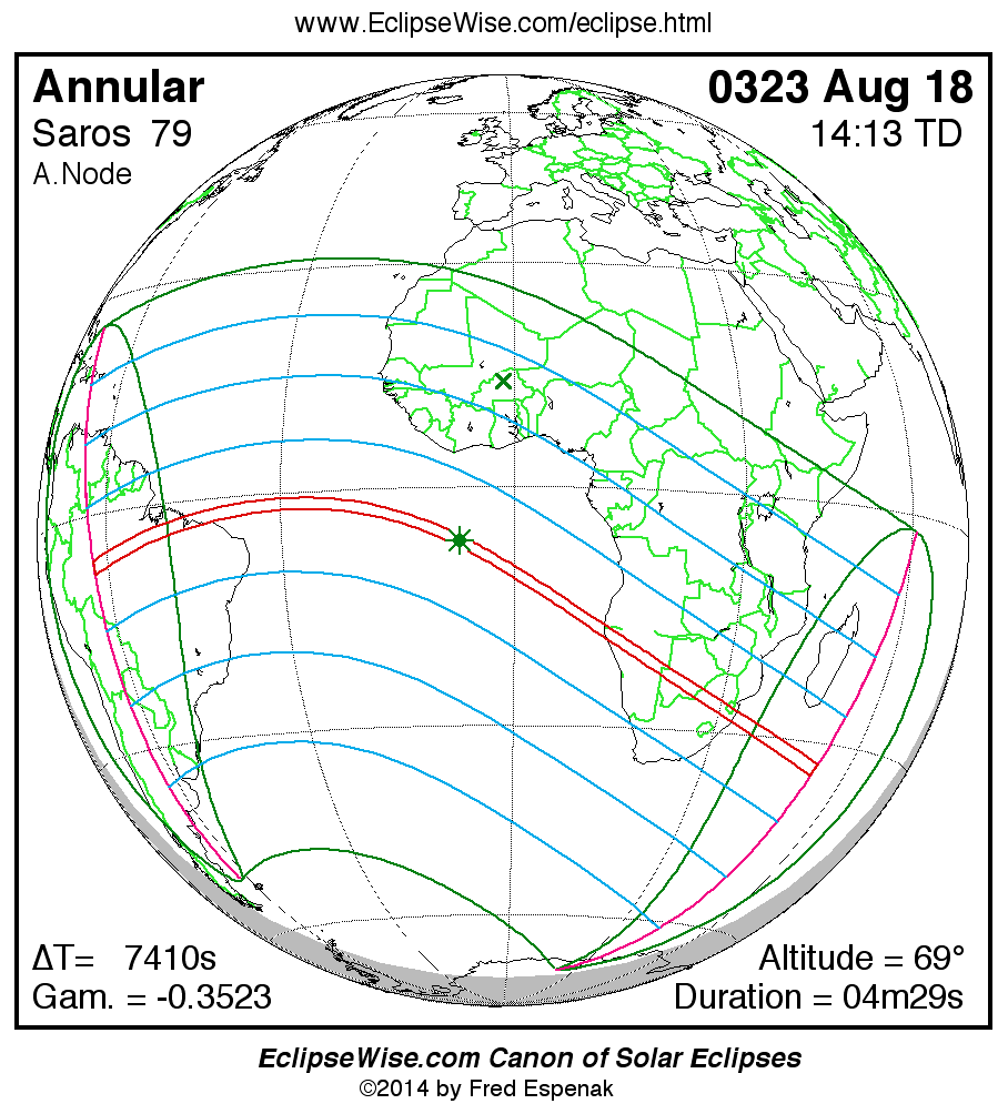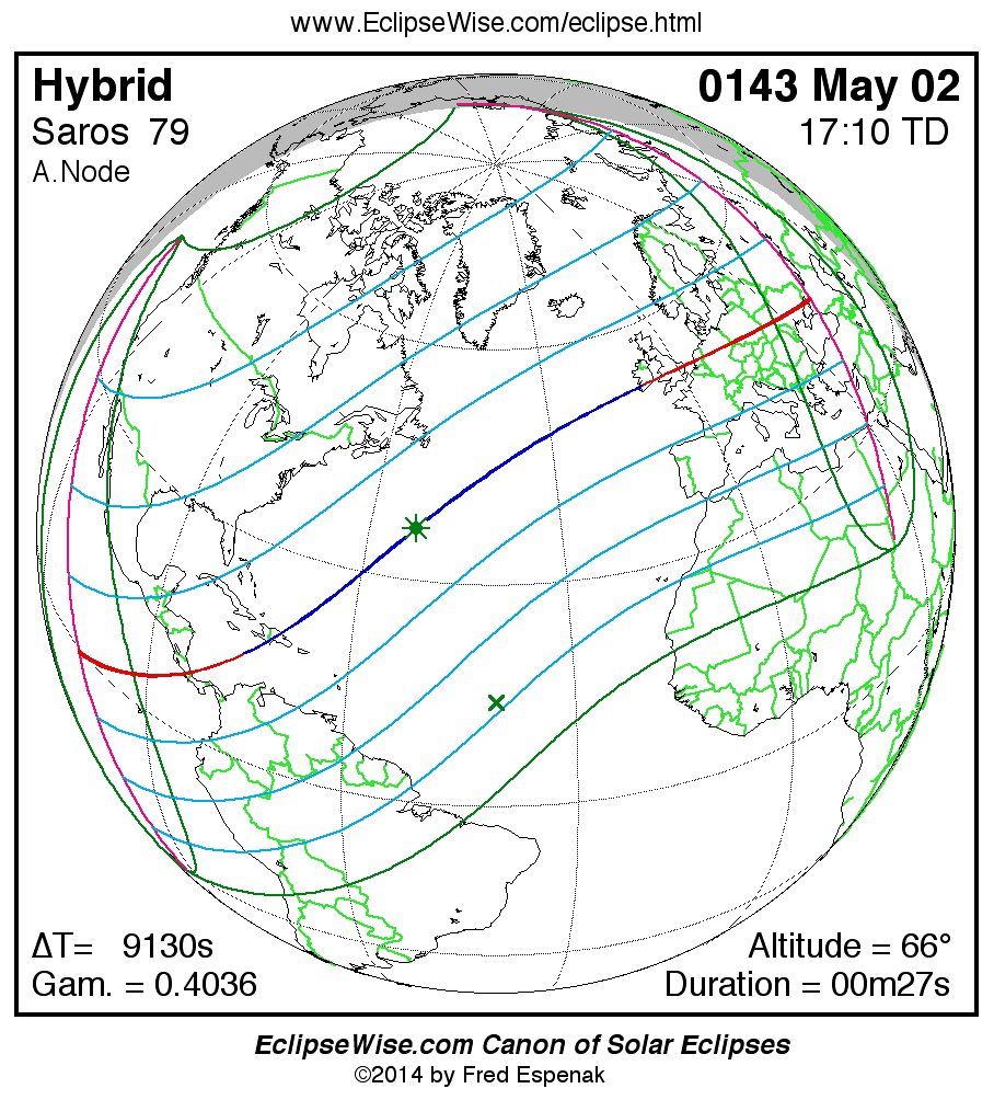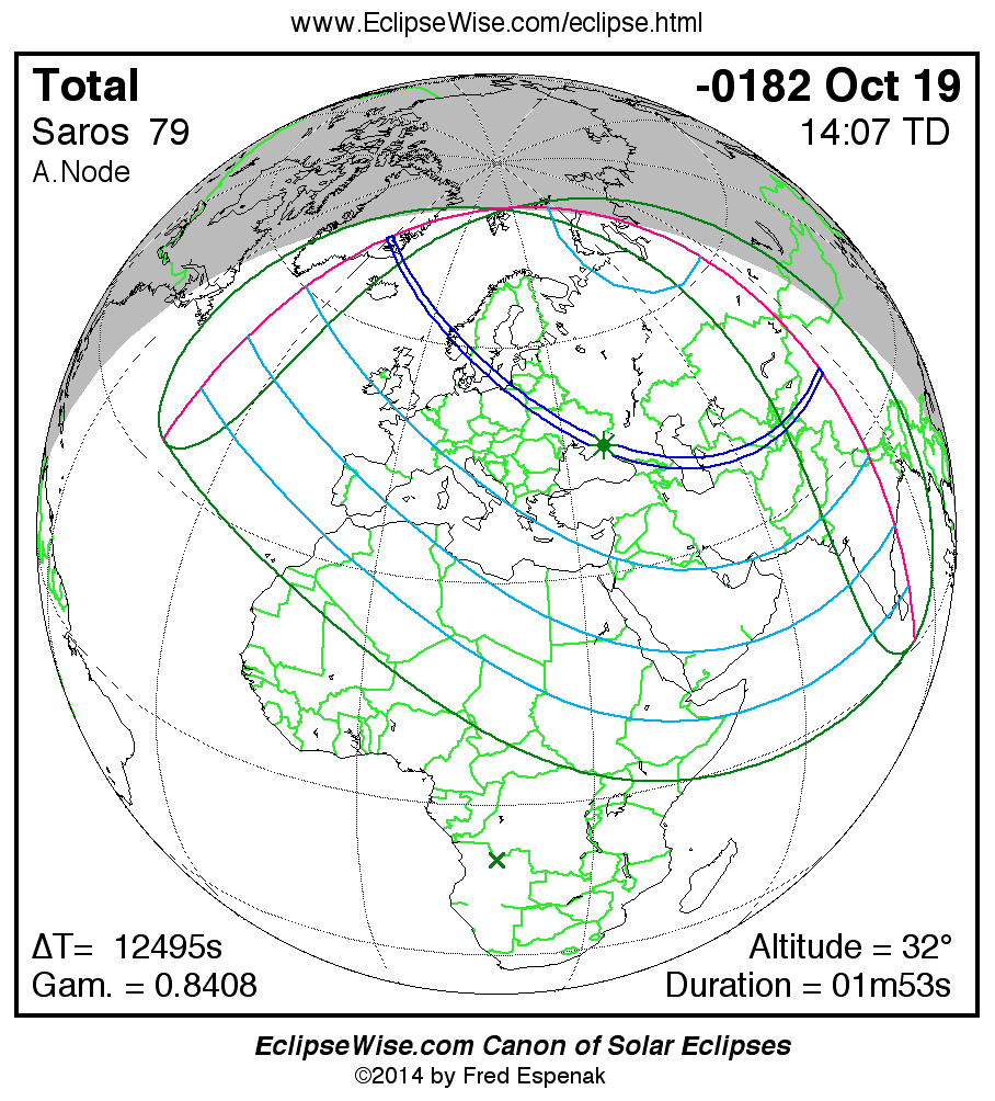 A panorama of all solar eclipses belonging to Saros 79 is presented here. Each map depicts the geographic region of visibility for a single eclipse. For central eclipses, the total or annular path is plotted in either blue (total) or red (annular). The date and time is given for the instant of Greatest Eclipse. Every map serves as a hyperlink to the EclipseWise Prime page for that eclipse where a larger map and complete details for the eclipse can be found. Visit the Key to Solar Eclipse Maps for a detailed explanation of these maps. Near the bottom of the page are a series of hyperlinks for more on solar eclipses.