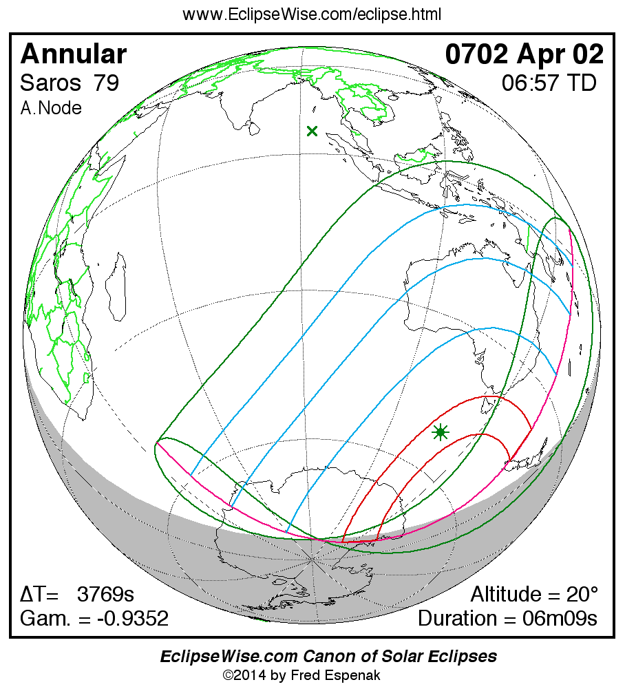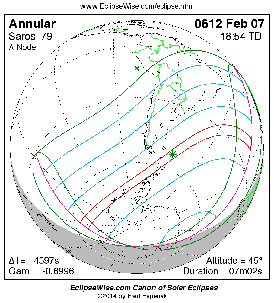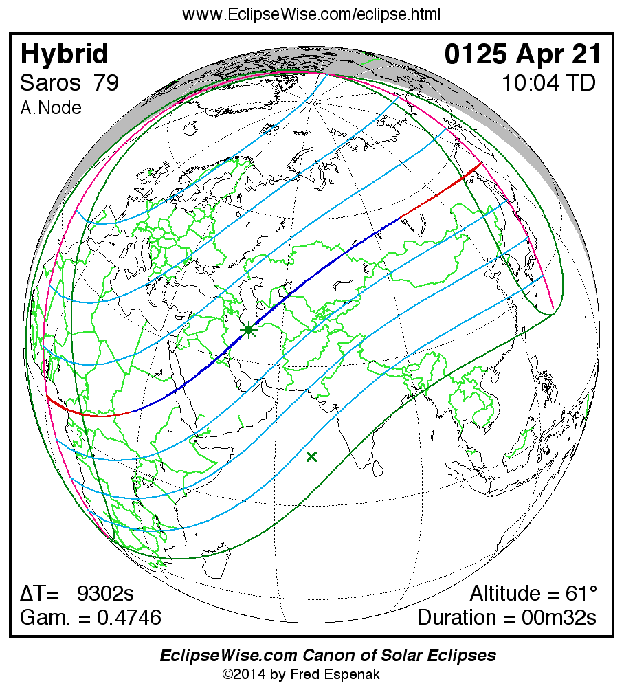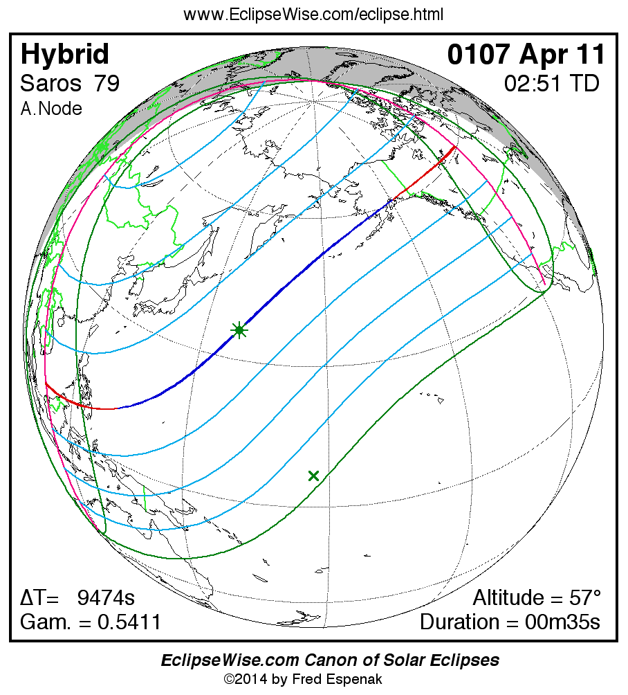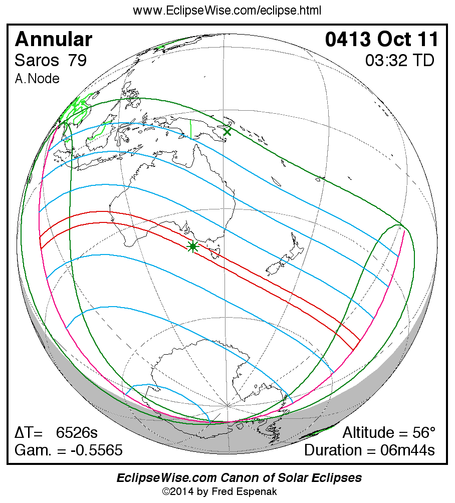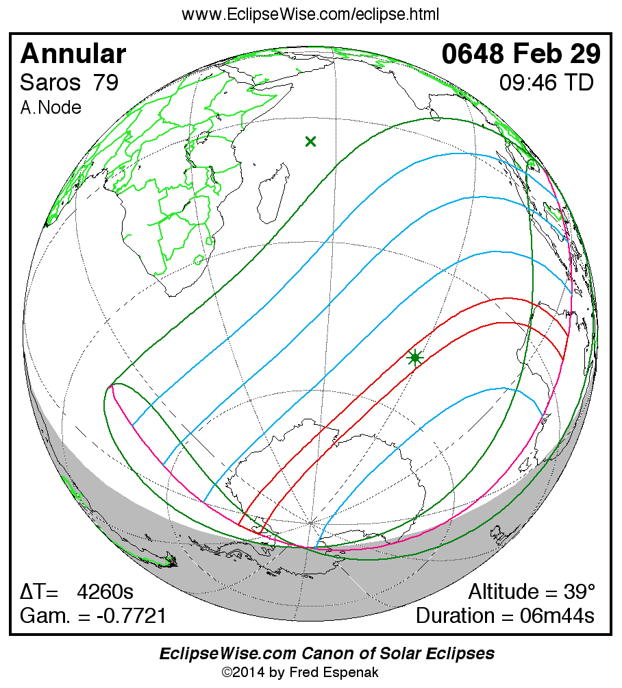 A panorama of all solar eclipses belonging to Saros 79 is presented here. Each map depicts the geographic region of visibility for a single eclipse. For central eclipses, the total or annular path is plotted in either blue (total) or red (annular). The date and time is given for the instant of Greatest Eclipse. Every map serves as a hyperlink to the EclipseWise Prime page for that eclipse where a larger map and complete details for the eclipse can be found. Visit the Key to Solar Eclipse Maps for a detailed explanation of these maps. Near the bottom of the page are a series of hyperlinks for more on solar eclipses.