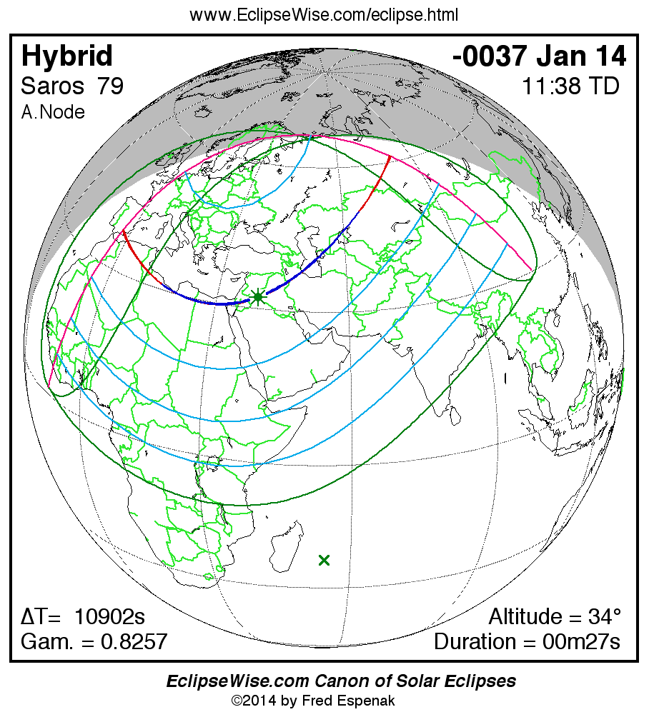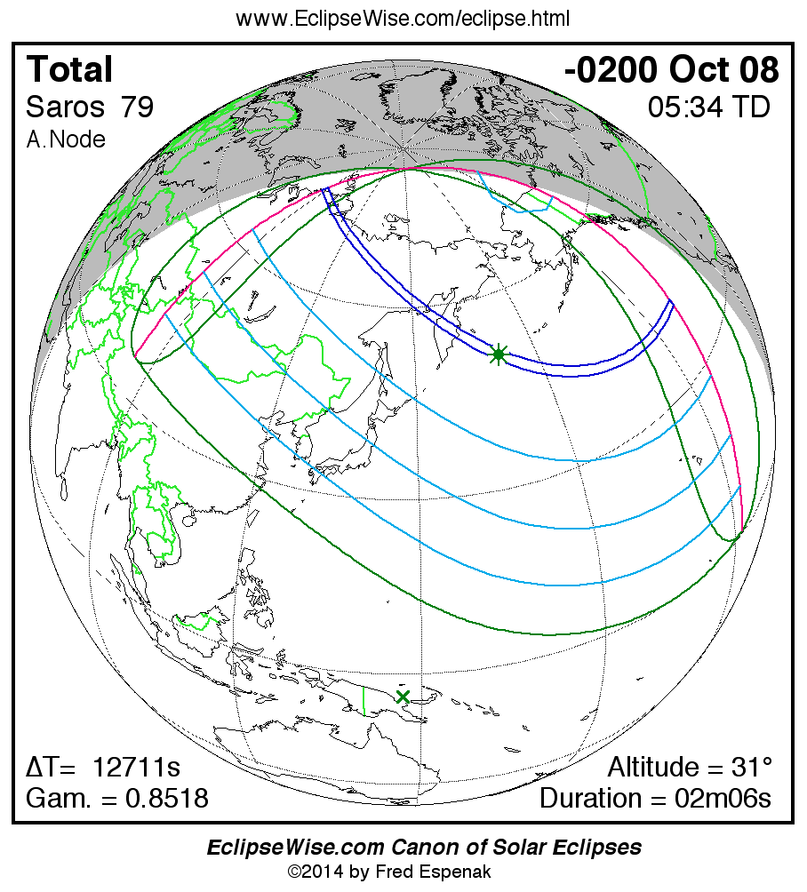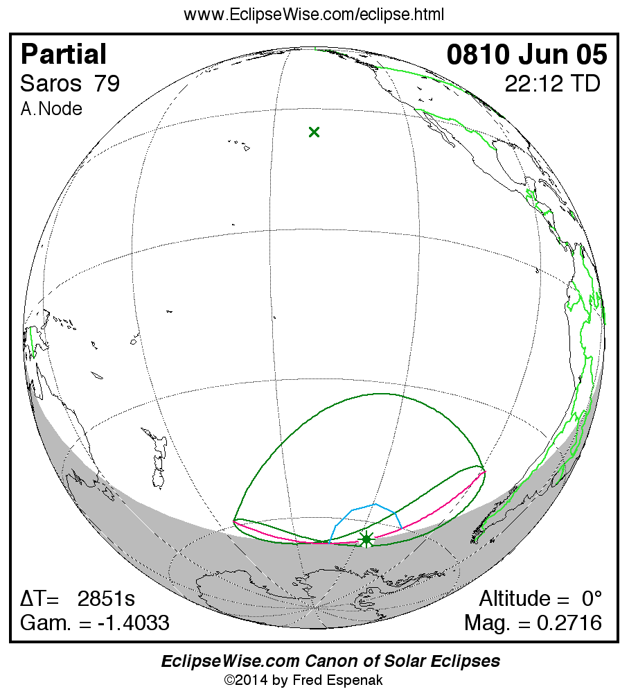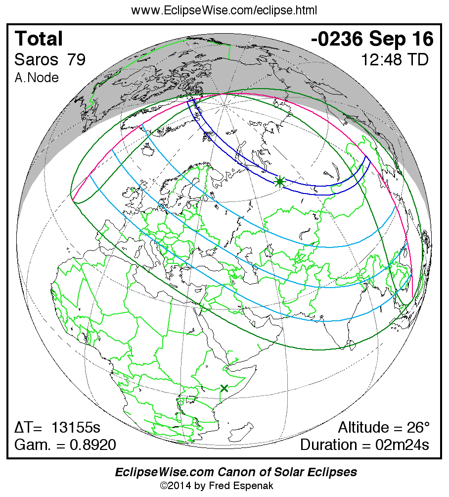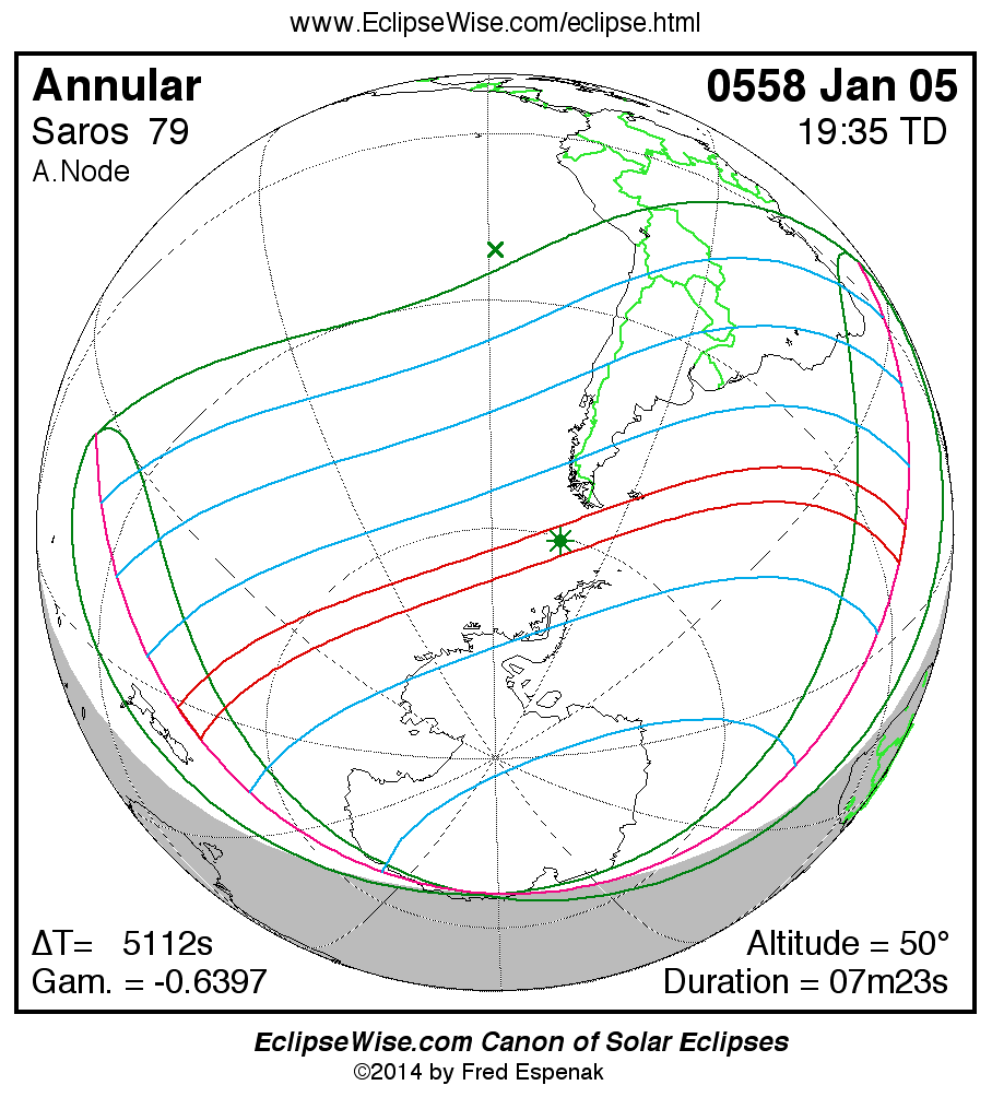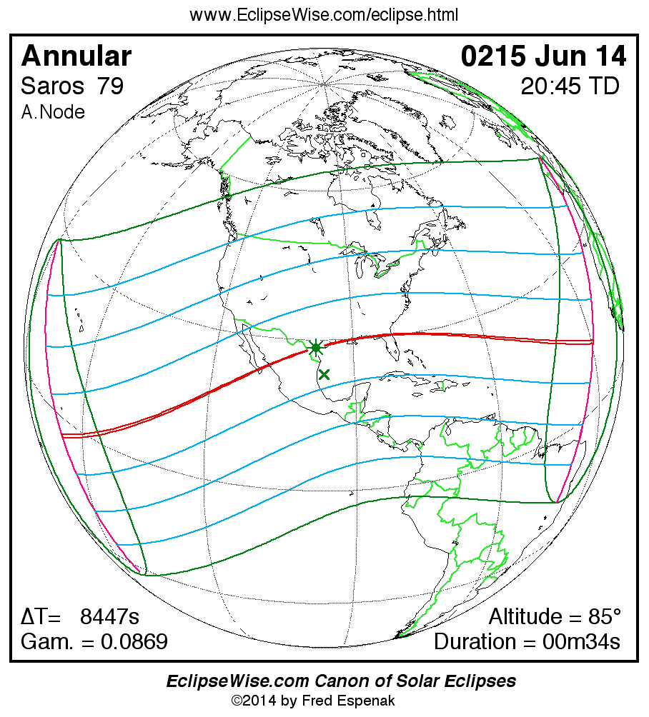 A panorama of all solar eclipses belonging to Saros 79 is presented here. Each map depicts the geographic region of visibility for a single eclipse. For central eclipses, the total or annular path is plotted in either blue (total) or red (annular). The date and time is given for the instant of Greatest Eclipse. Every map serves as a hyperlink to the EclipseWise Prime page for that eclipse where a larger map and complete details for the eclipse can be found. Visit the Key to Solar Eclipse Maps for a detailed explanation of these maps. Near the bottom of the page are a series of hyperlinks for more on solar eclipses.