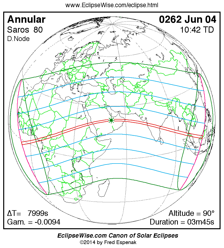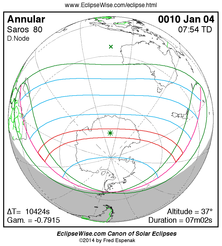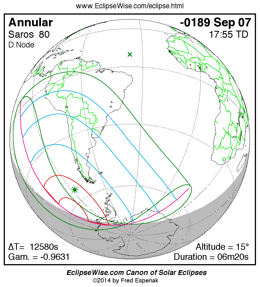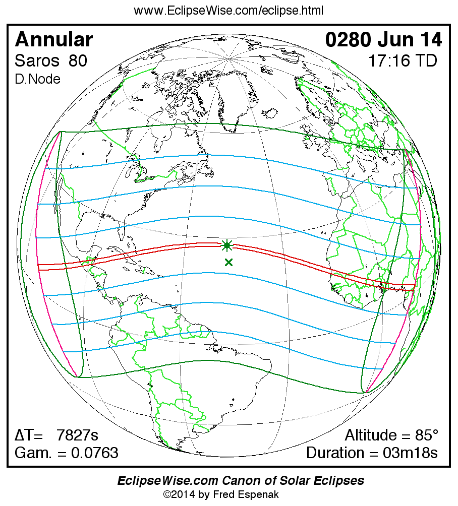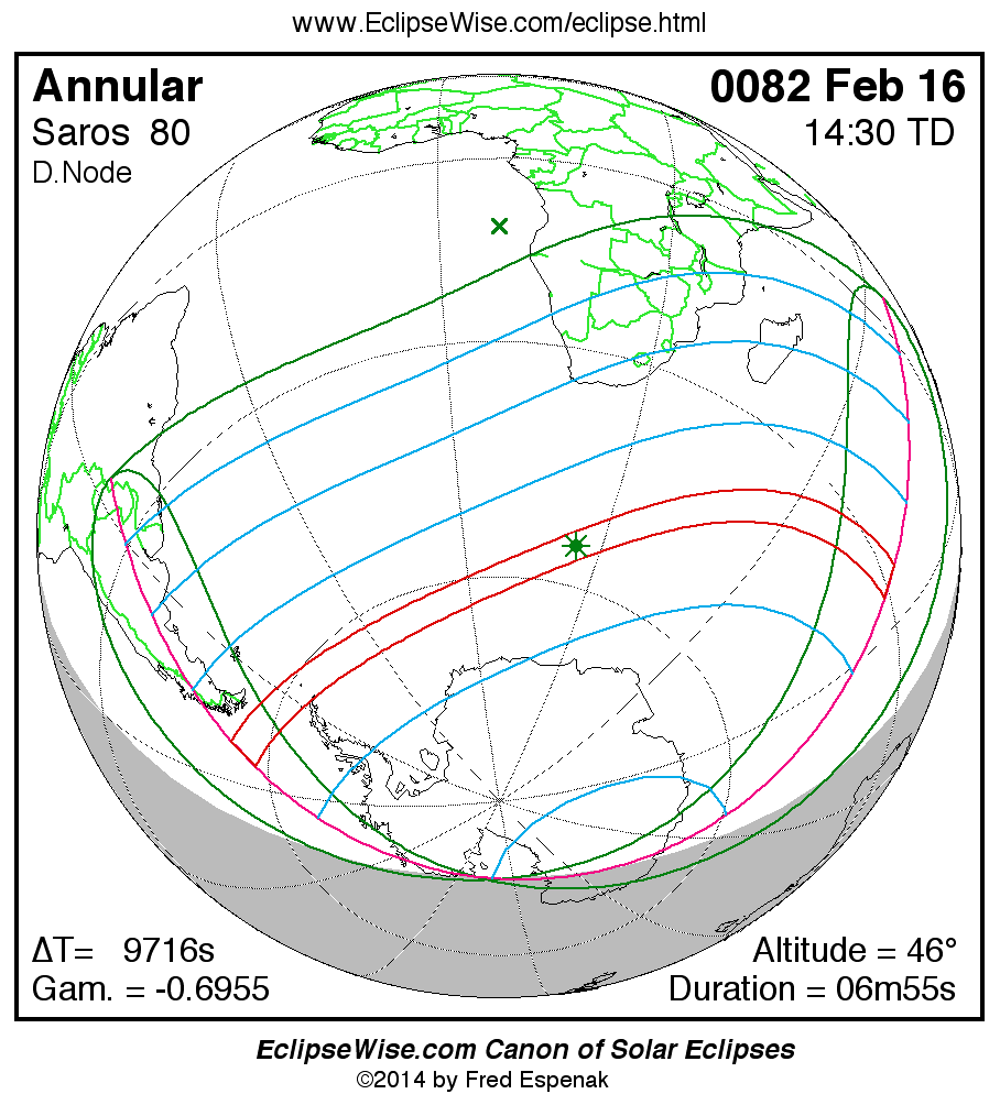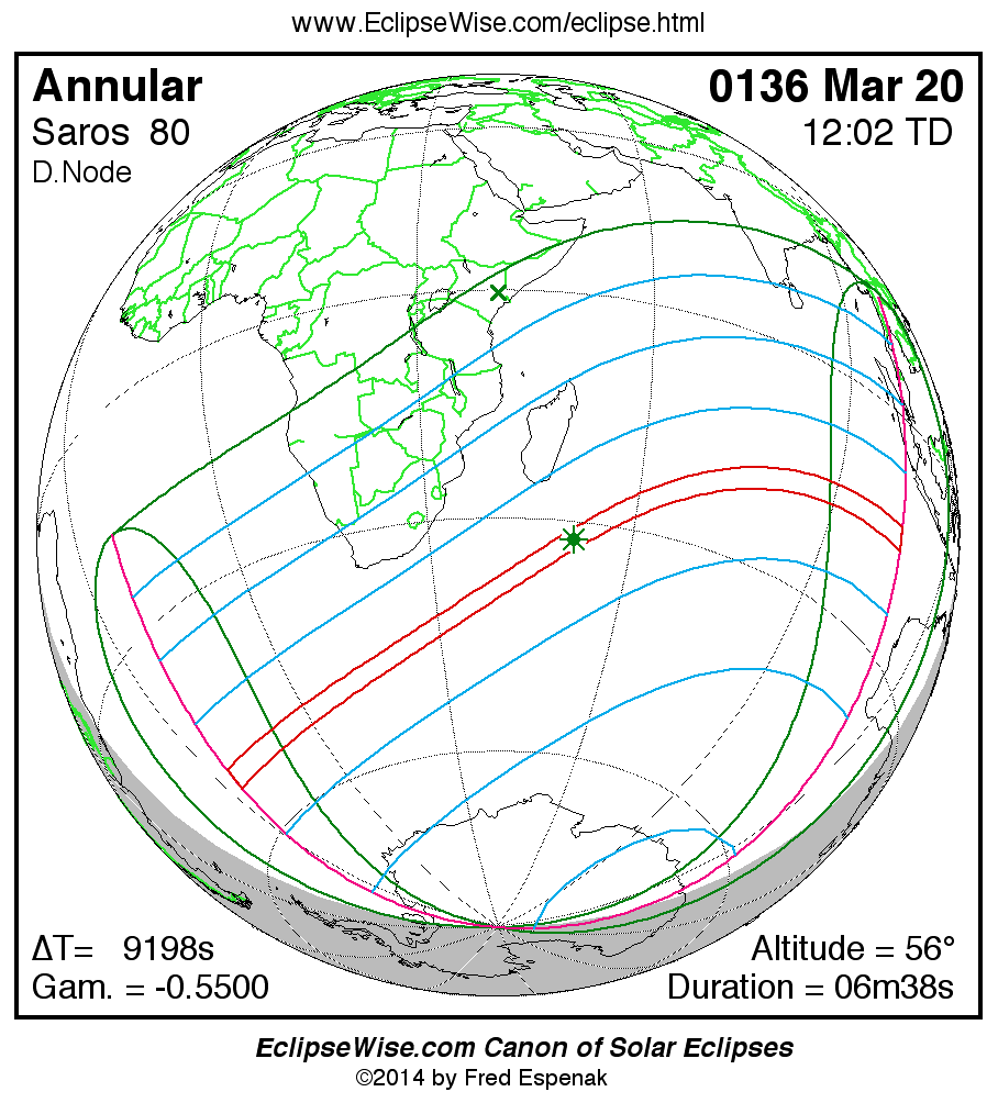 A panorama of all solar eclipses belonging to Saros 80 is presented here. Each map depicts the geographic region of visibility for a single eclipse. For central eclipses, the total or annular path is plotted in either blue (total) or red (annular). The date and time is given for the instant of Greatest Eclipse. Every map serves as a hyperlink to the EclipseWise Prime page for that eclipse where a larger map and complete details for the eclipse can be found. Visit the Key to Solar Eclipse Maps for a detailed explanation of these maps. Near the bottom of the page are a series of hyperlinks for more on solar eclipses.