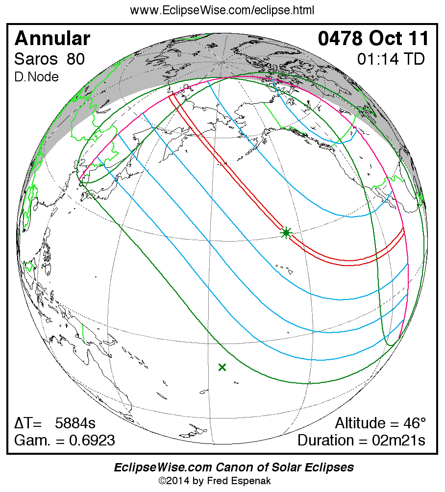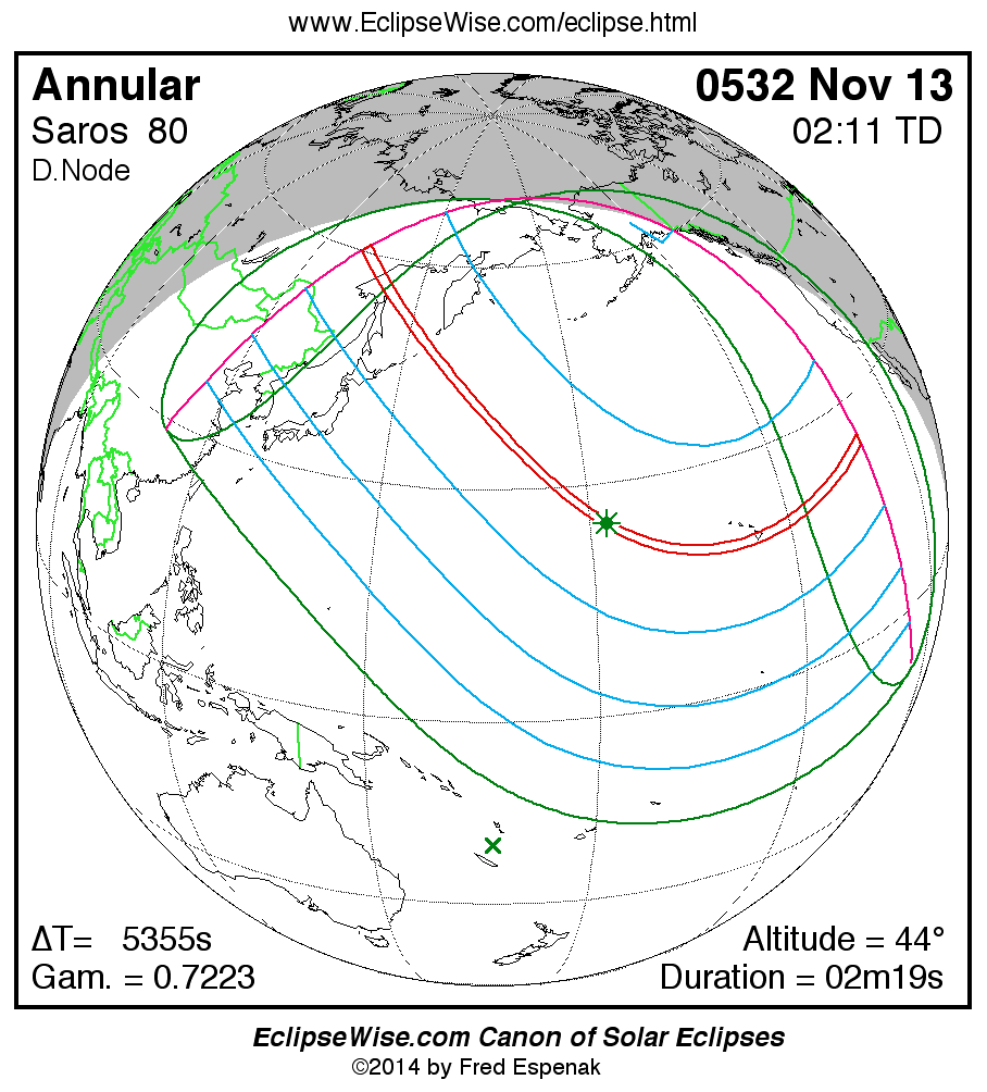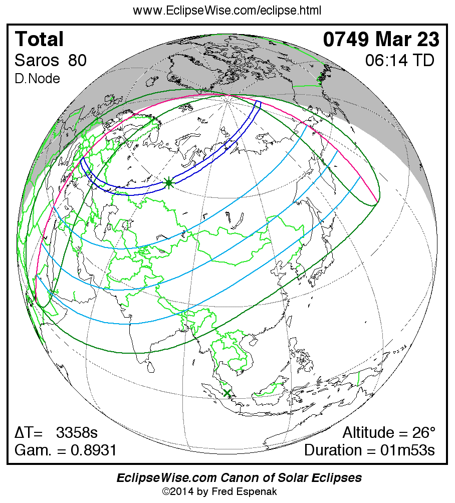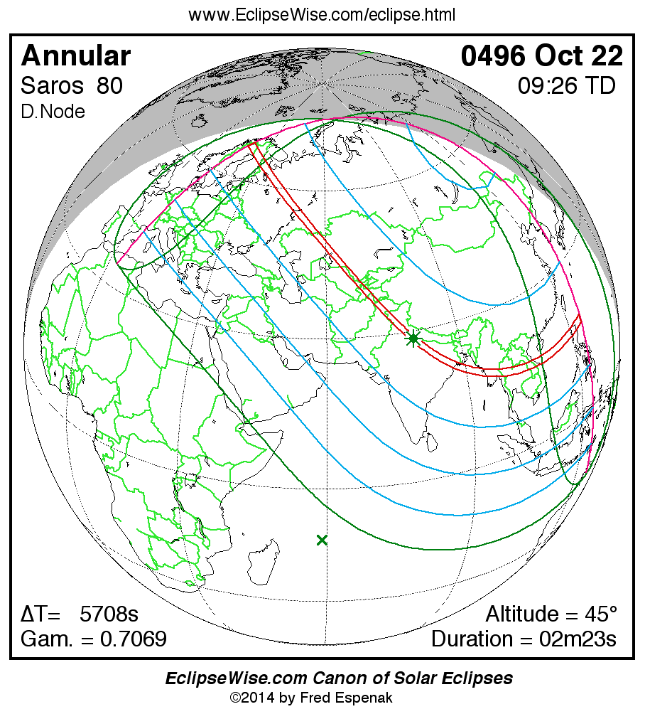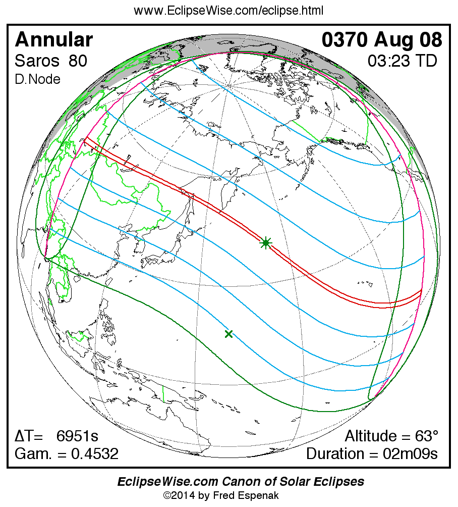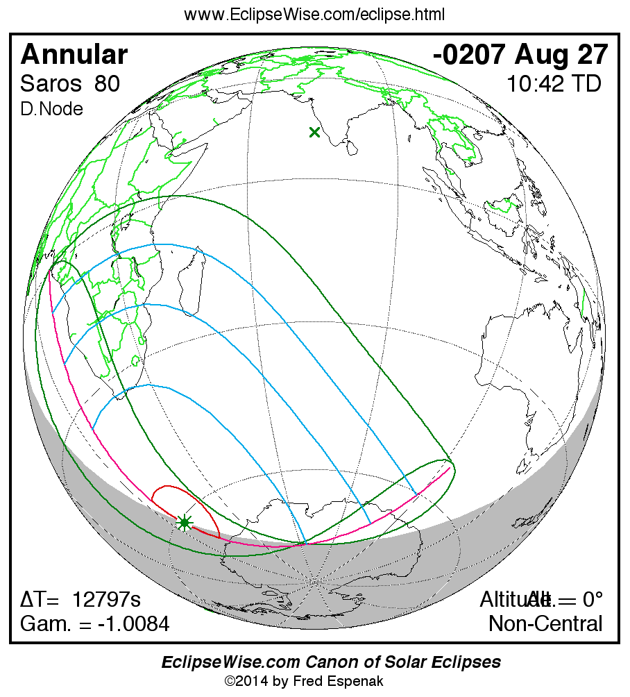 A panorama of all solar eclipses belonging to Saros 80 is presented here. Each map depicts the geographic region of visibility for a single eclipse. For central eclipses, the total or annular path is plotted in either blue (total) or red (annular). The date and time is given for the instant of Greatest Eclipse. Every map serves as a hyperlink to the EclipseWise Prime page for that eclipse where a larger map and complete details for the eclipse can be found. Visit the Key to Solar Eclipse Maps for a detailed explanation of these maps. Near the bottom of the page are a series of hyperlinks for more on solar eclipses.