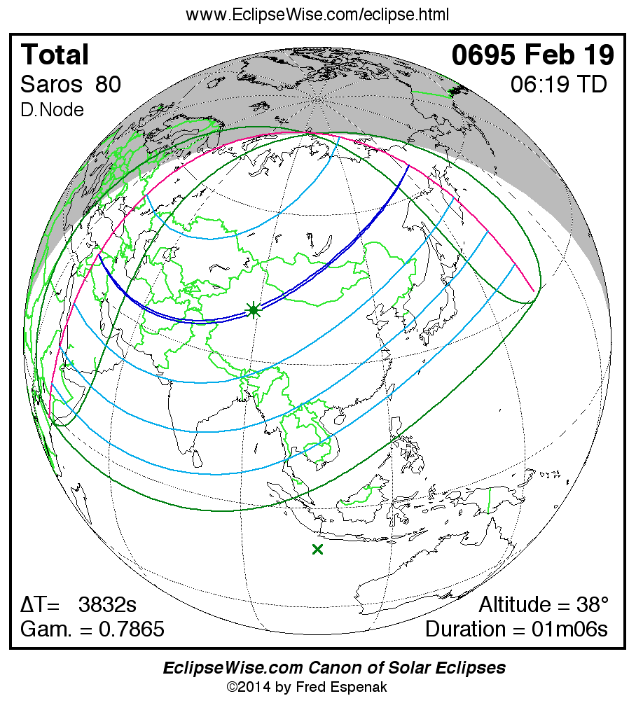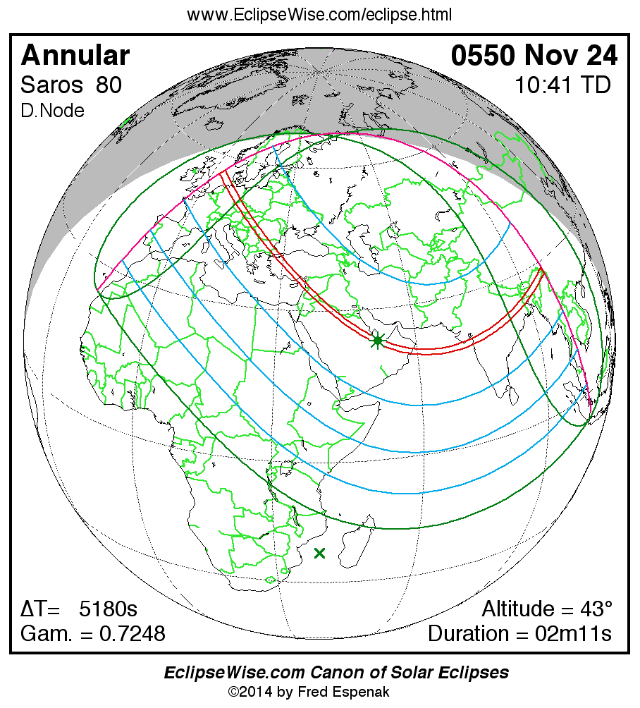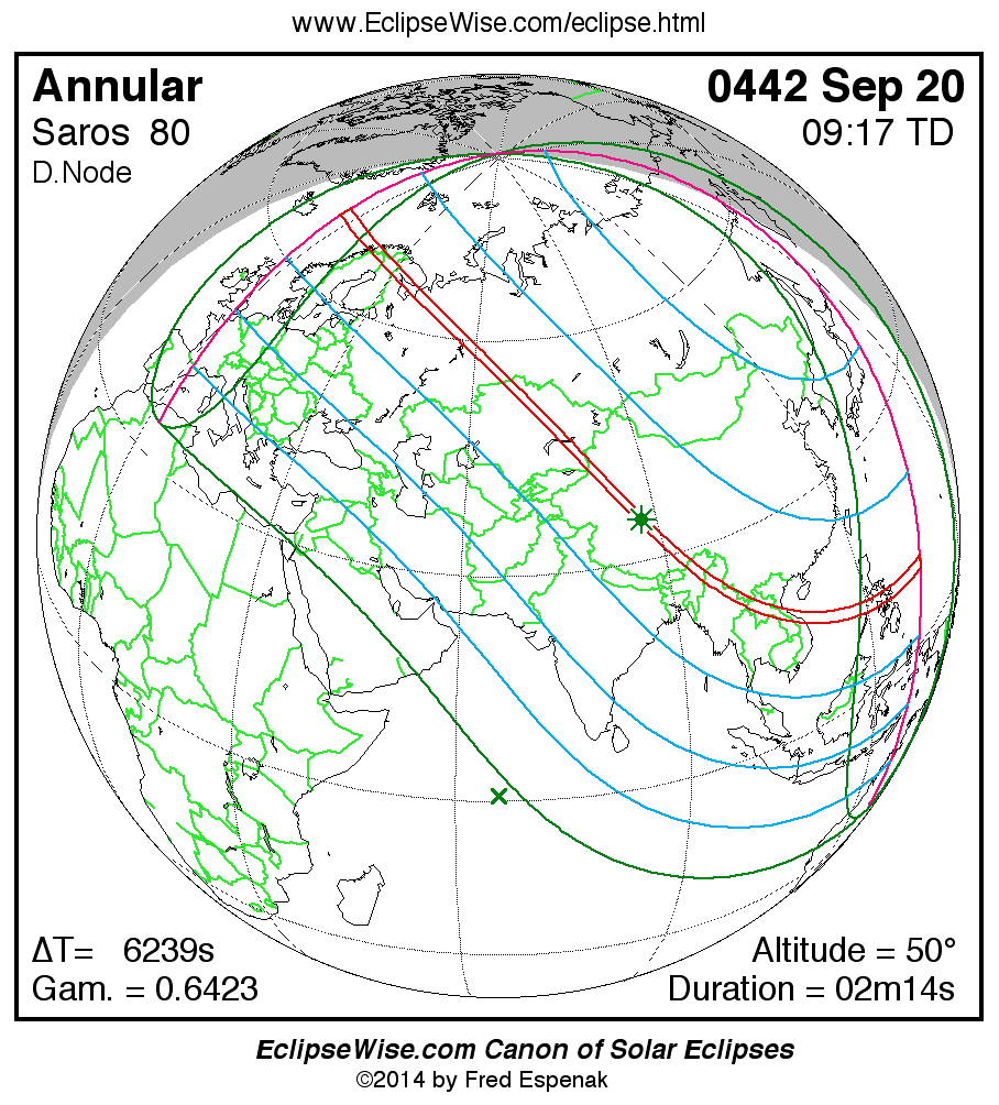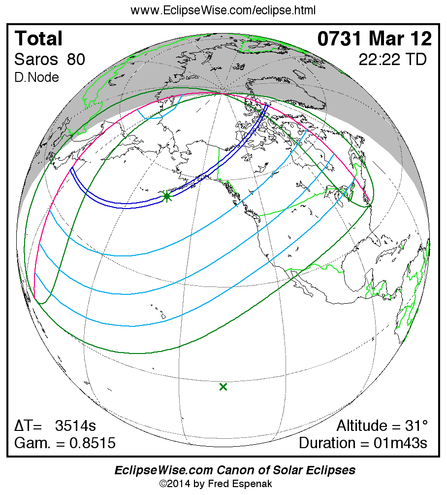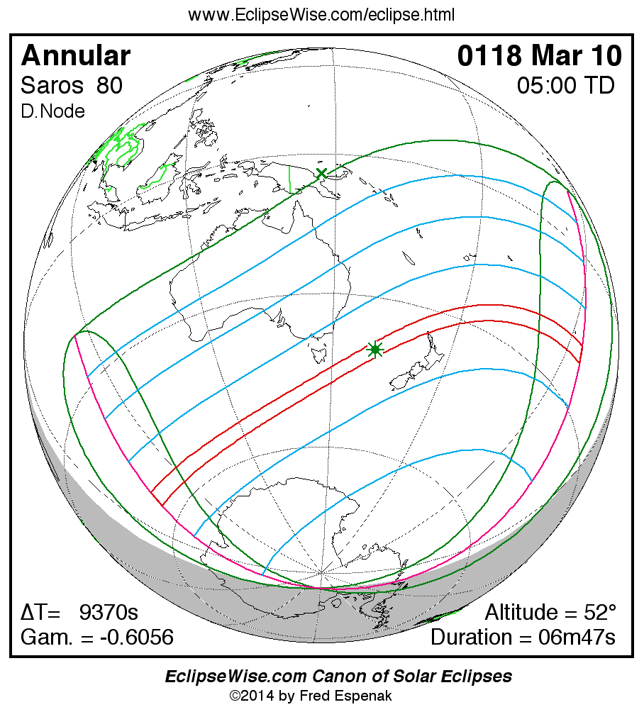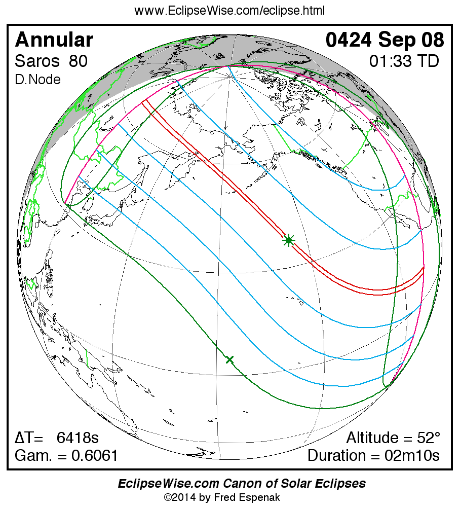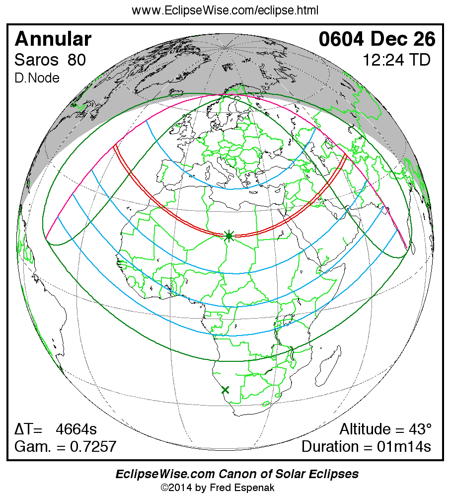 A panorama of all solar eclipses belonging to Saros 80 is presented here. Each map depicts the geographic region of visibility for a single eclipse. For central eclipses, the total or annular path is plotted in either blue (total) or red (annular). The date and time is given for the instant of Greatest Eclipse. Every map serves as a hyperlink to the EclipseWise Prime page for that eclipse where a larger map and complete details for the eclipse can be found. Visit the Key to Solar Eclipse Maps for a detailed explanation of these maps. Near the bottom of the page are a series of hyperlinks for more on solar eclipses.