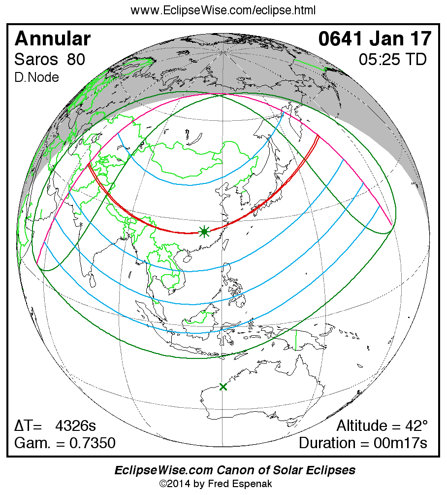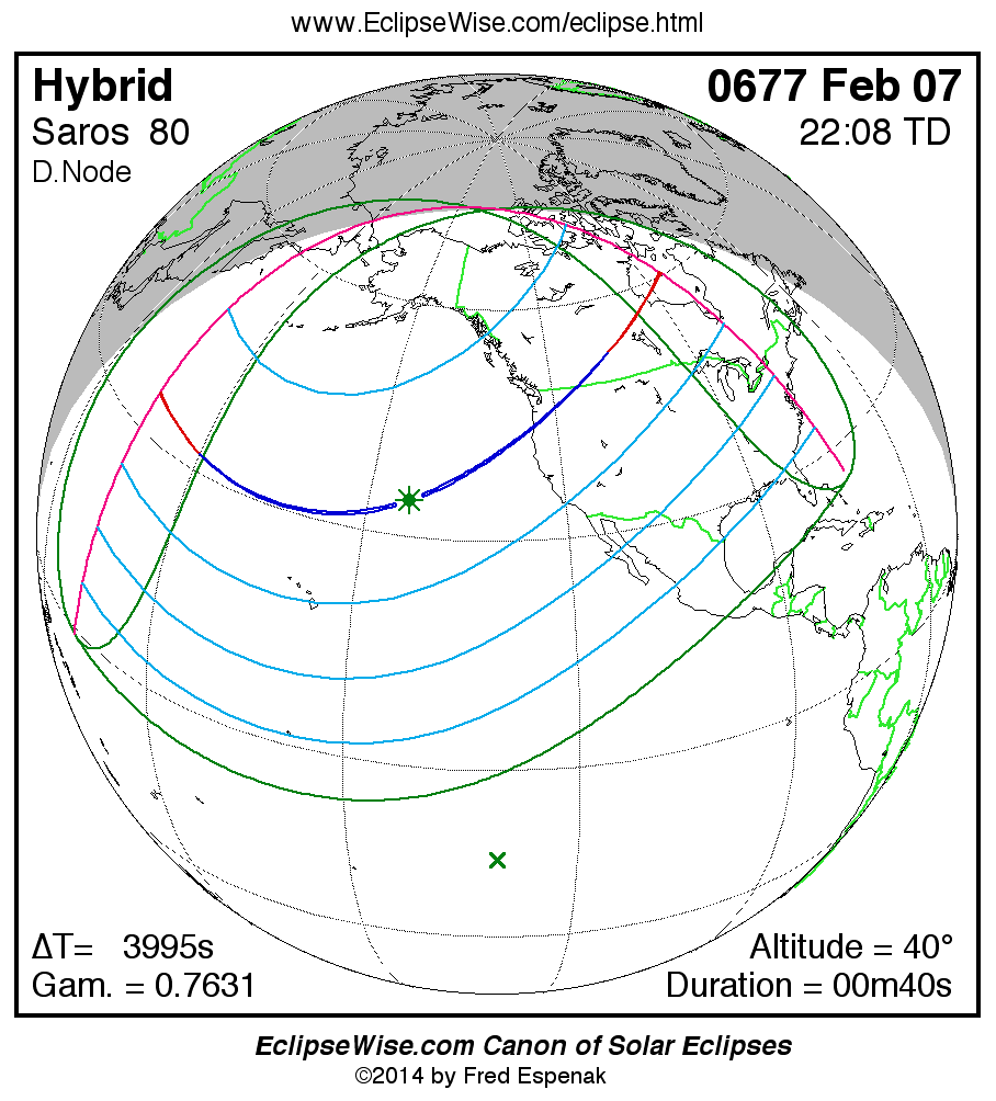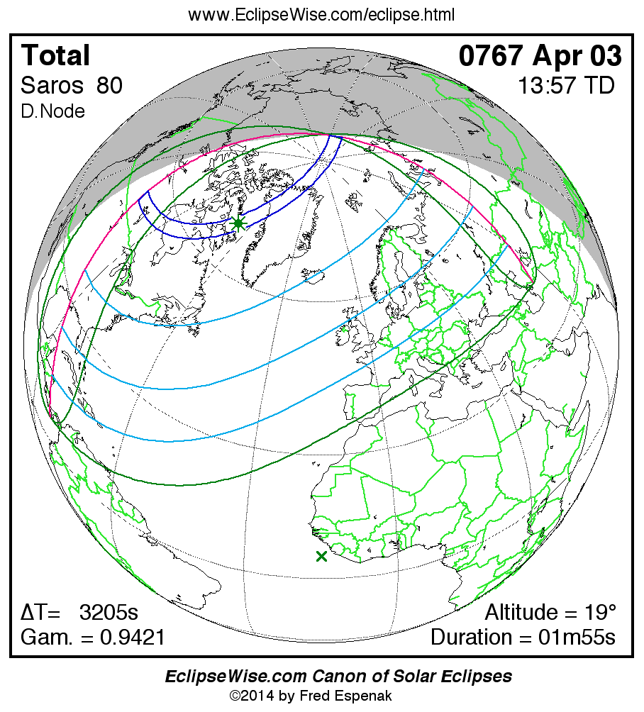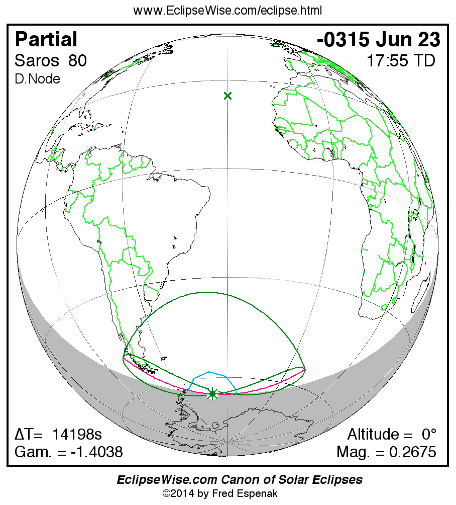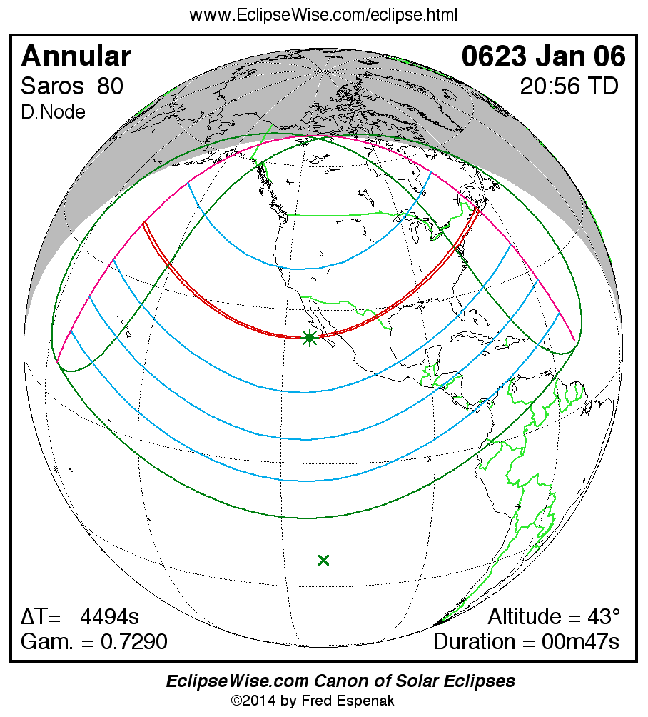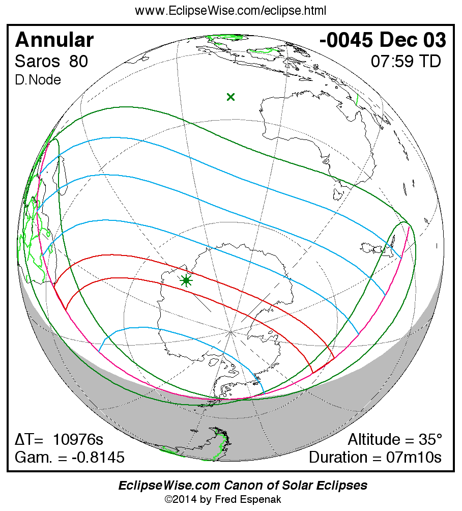 A panorama of all solar eclipses belonging to Saros 80 is presented here. Each map depicts the geographic region of visibility for a single eclipse. For central eclipses, the total or annular path is plotted in either blue (total) or red (annular). The date and time is given for the instant of Greatest Eclipse. Every map serves as a hyperlink to the EclipseWise Prime page for that eclipse where a larger map and complete details for the eclipse can be found. Visit the Key to Solar Eclipse Maps for a detailed explanation of these maps. Near the bottom of the page are a series of hyperlinks for more on solar eclipses.