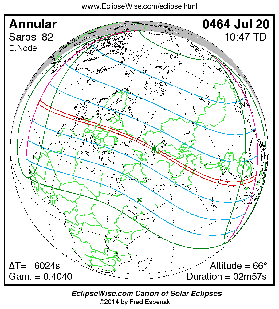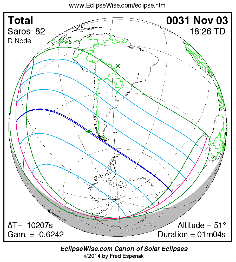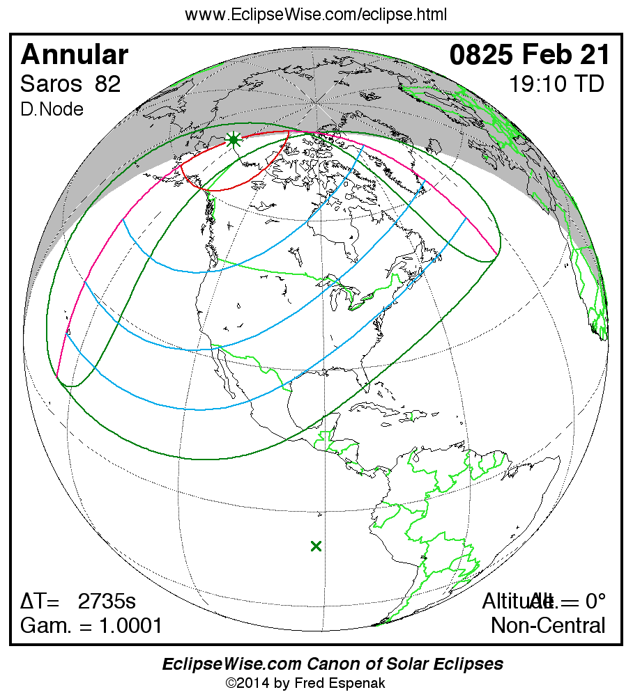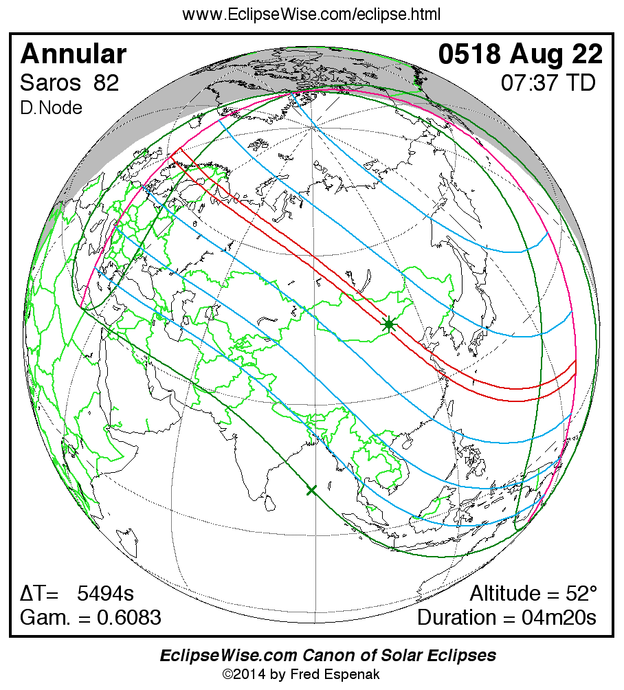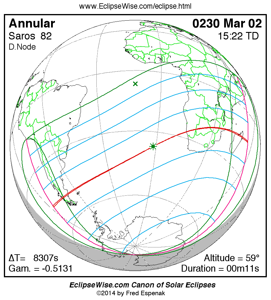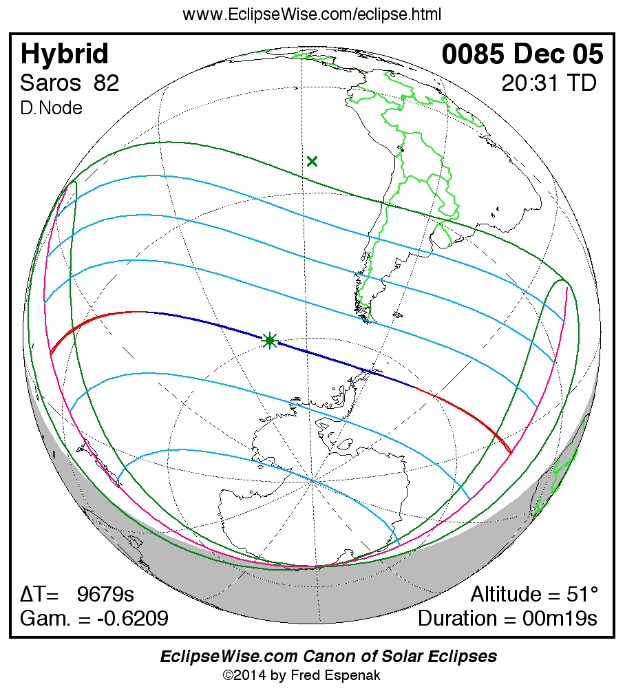 A panorama of all solar eclipses belonging to Saros 82 is presented here. Each map depicts the geographic region of visibility for a single eclipse. For central eclipses, the total or annular path is plotted in either blue (total) or red (annular). The date and time is given for the instant of Greatest Eclipse. Every map serves as a hyperlink to the EclipseWise Prime page for that eclipse where a larger map and complete details for the eclipse can be found. Visit the Key to Solar Eclipse Maps for a detailed explanation of these maps. Near the bottom of the page are a series of hyperlinks for more on solar eclipses.