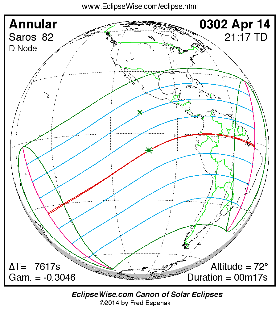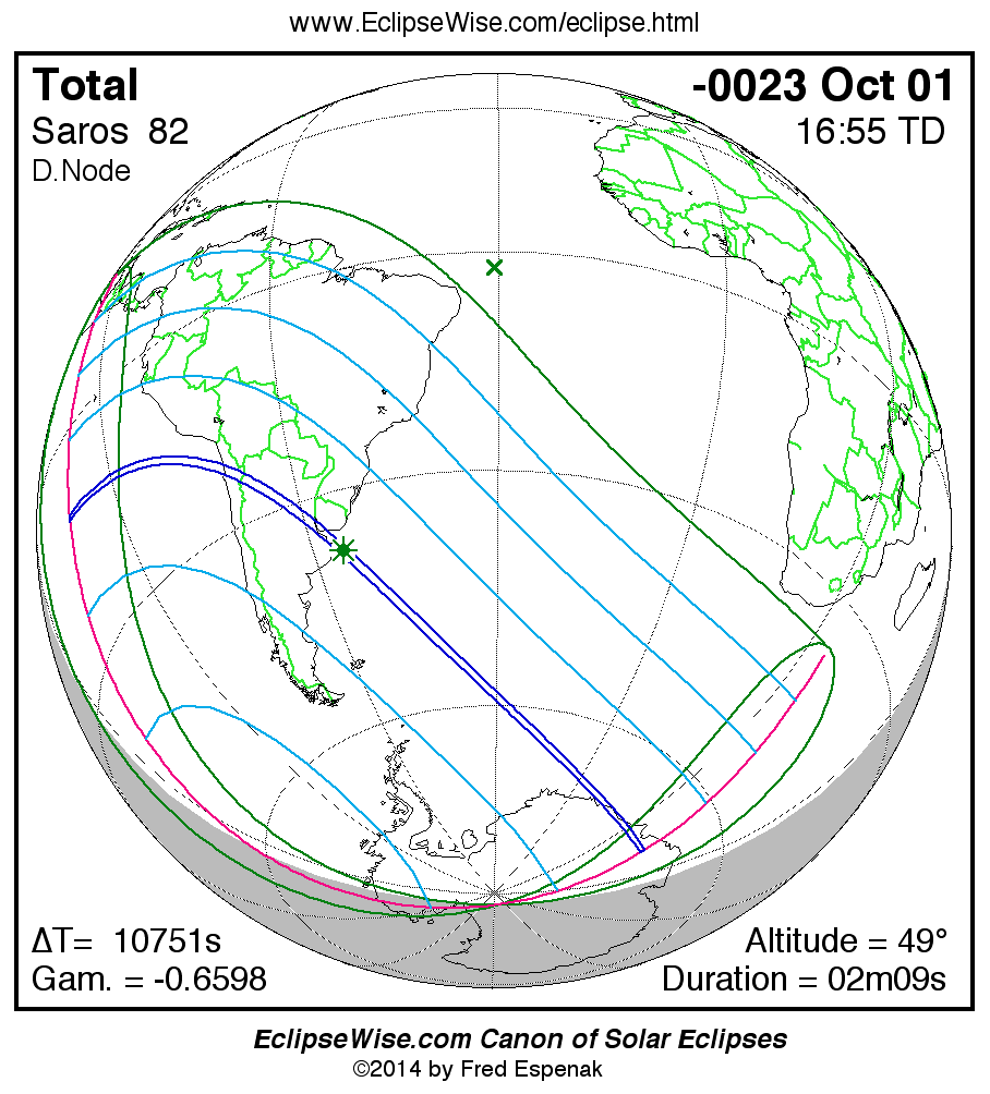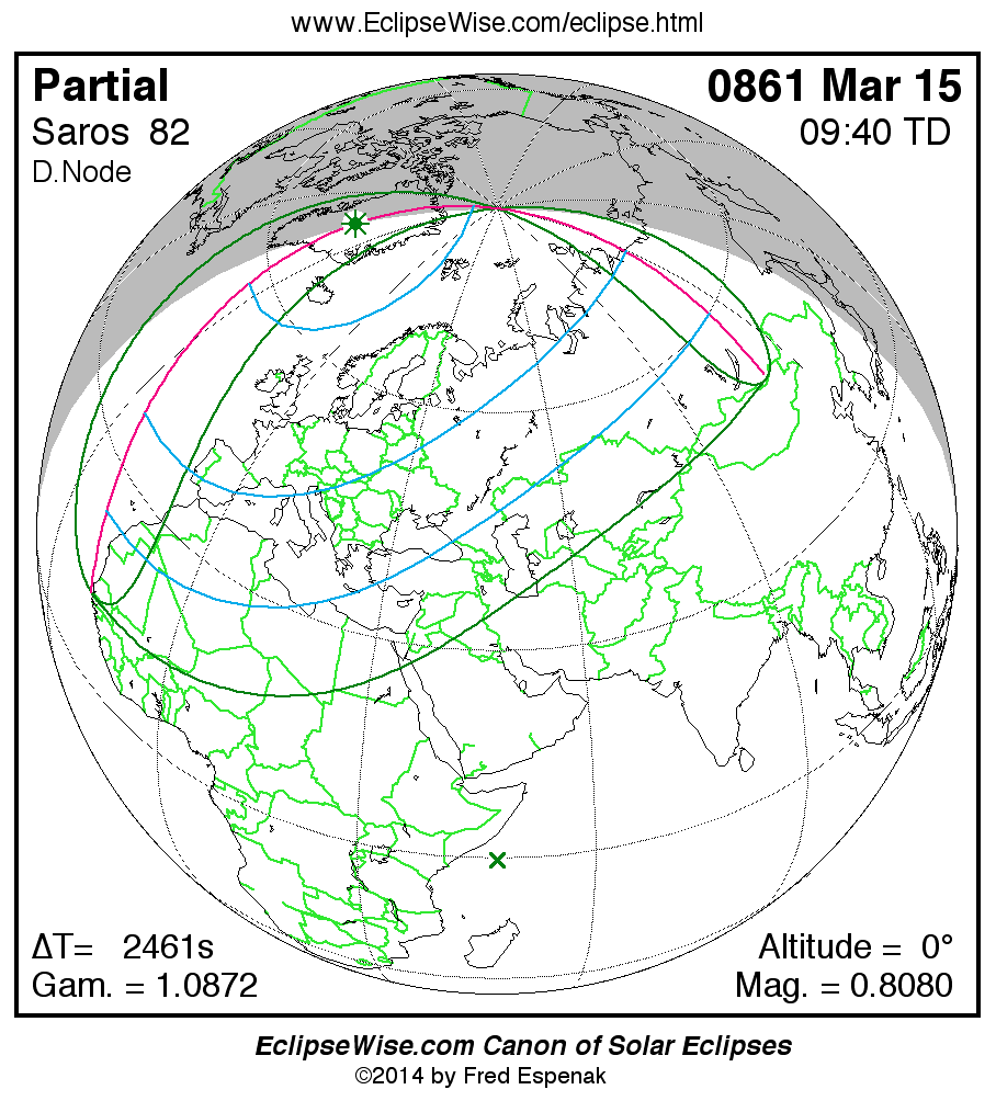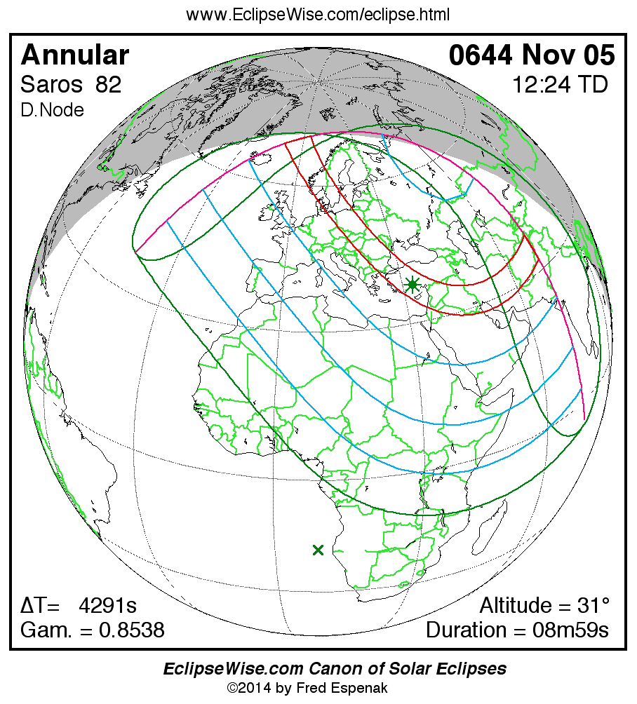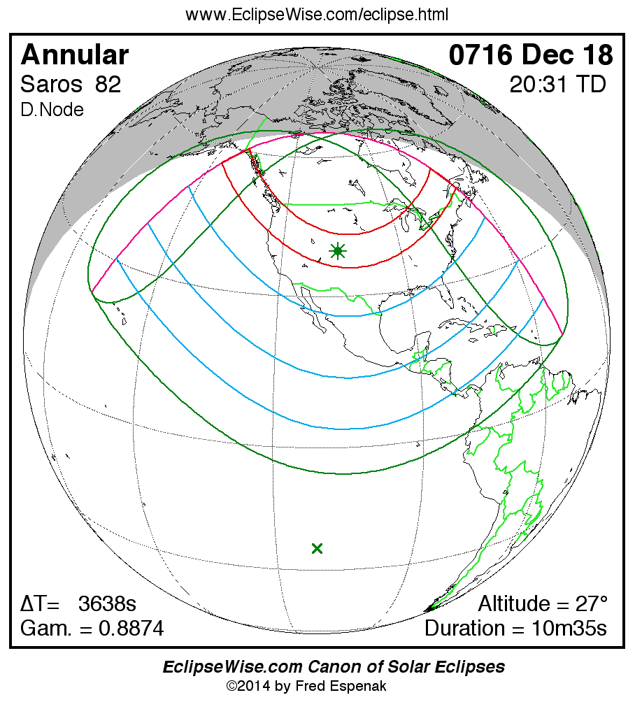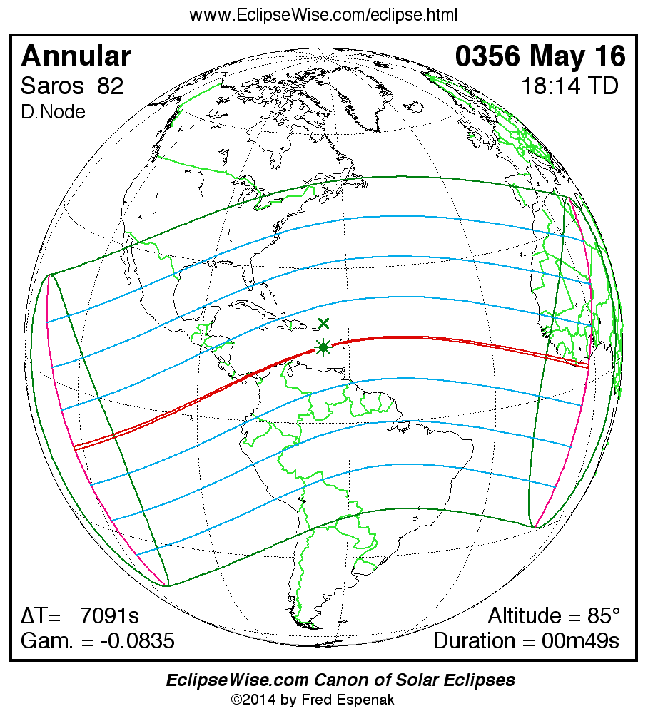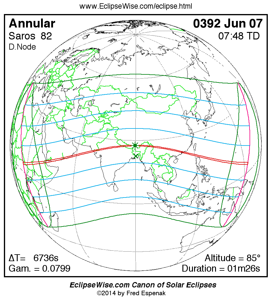 A panorama of all solar eclipses belonging to Saros 82 is presented here. Each map depicts the geographic region of visibility for a single eclipse. For central eclipses, the total or annular path is plotted in either blue (total) or red (annular). The date and time is given for the instant of Greatest Eclipse. Every map serves as a hyperlink to the EclipseWise Prime page for that eclipse where a larger map and complete details for the eclipse can be found. Visit the Key to Solar Eclipse Maps for a detailed explanation of these maps. Near the bottom of the page are a series of hyperlinks for more on solar eclipses.