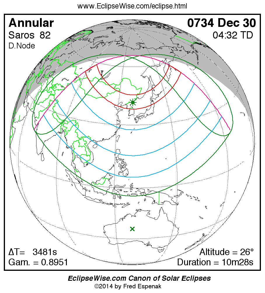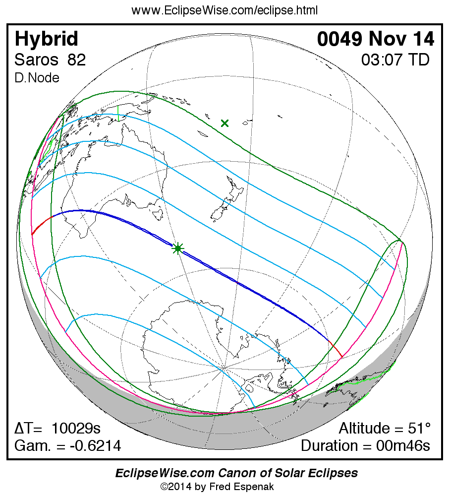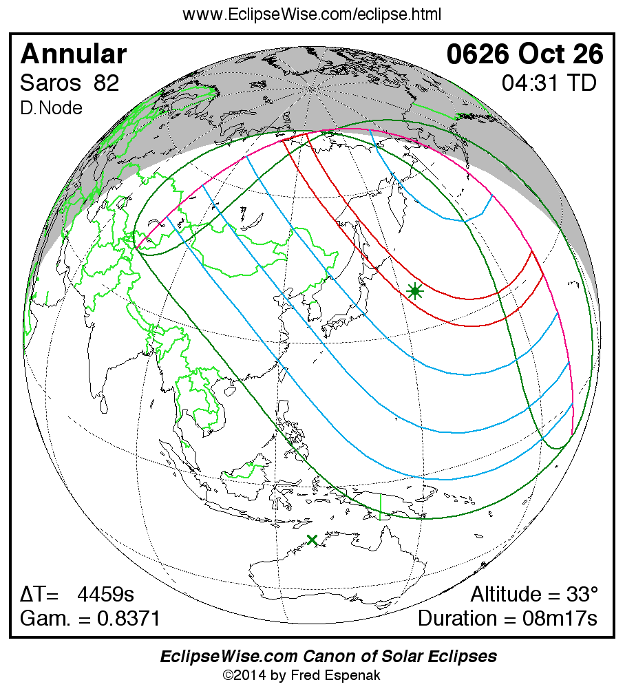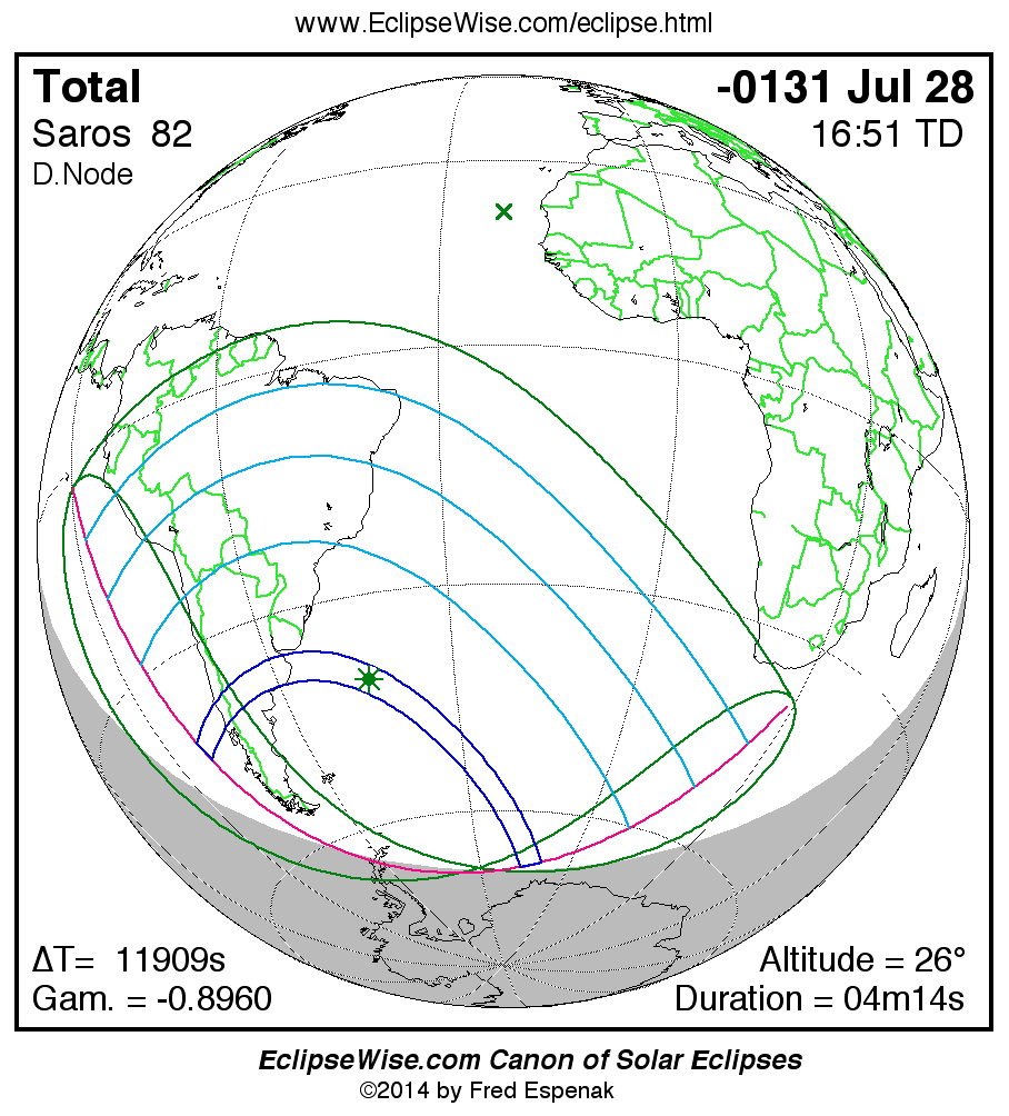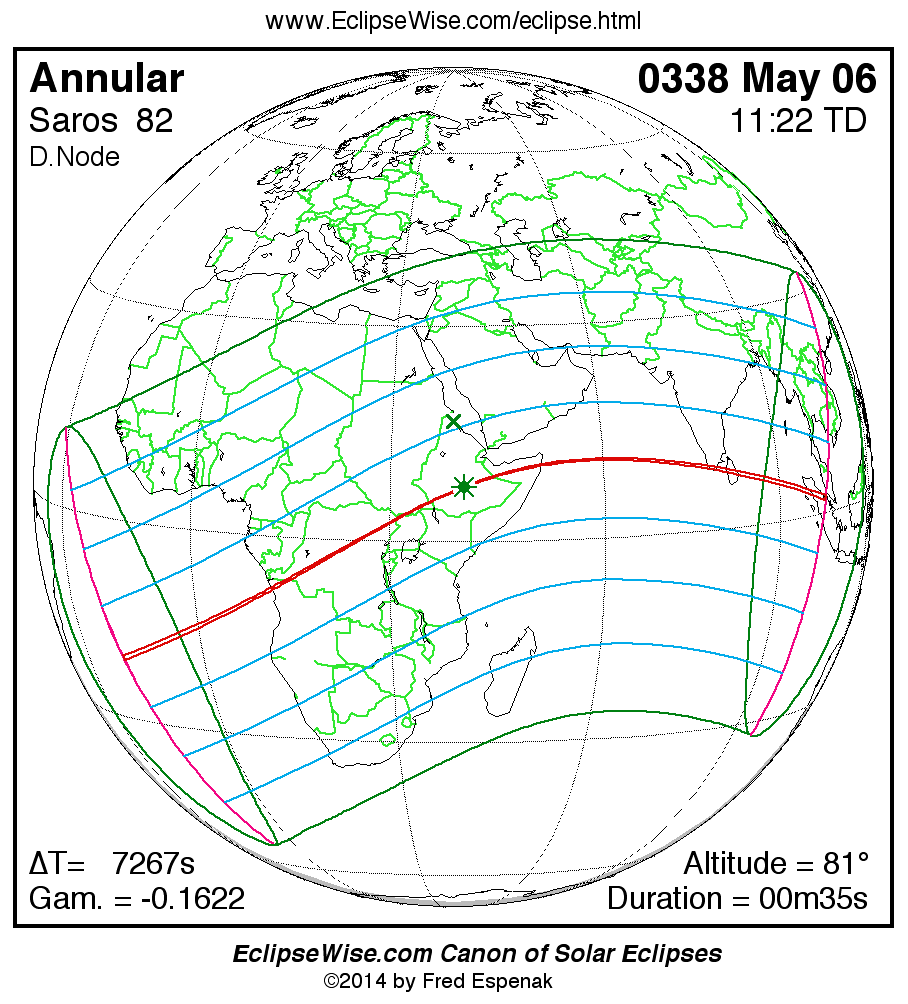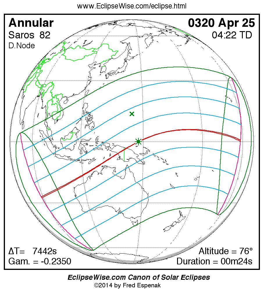 A panorama of all solar eclipses belonging to Saros 82 is presented here. Each map depicts the geographic region of visibility for a single eclipse. For central eclipses, the total or annular path is plotted in either blue (total) or red (annular). The date and time is given for the instant of Greatest Eclipse. Every map serves as a hyperlink to the EclipseWise Prime page for that eclipse where a larger map and complete details for the eclipse can be found. Visit the Key to Solar Eclipse Maps for a detailed explanation of these maps. Near the bottom of the page are a series of hyperlinks for more on solar eclipses.