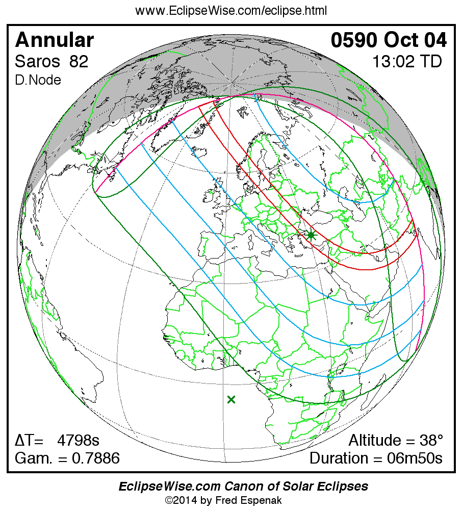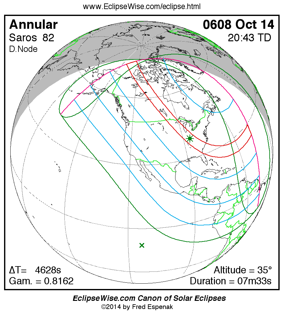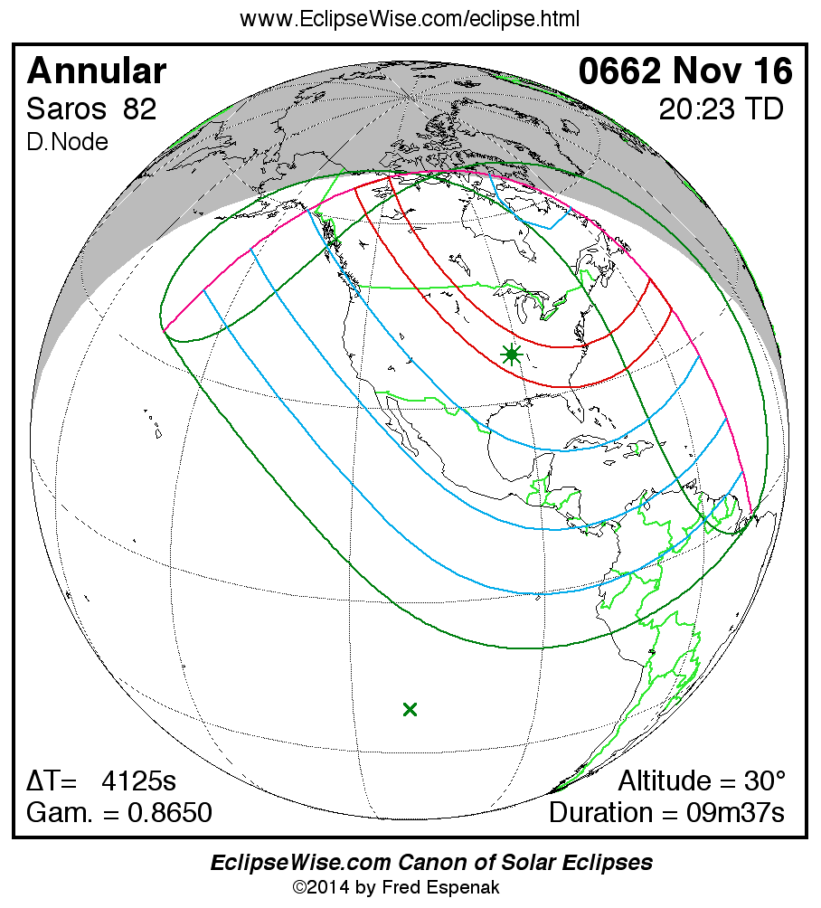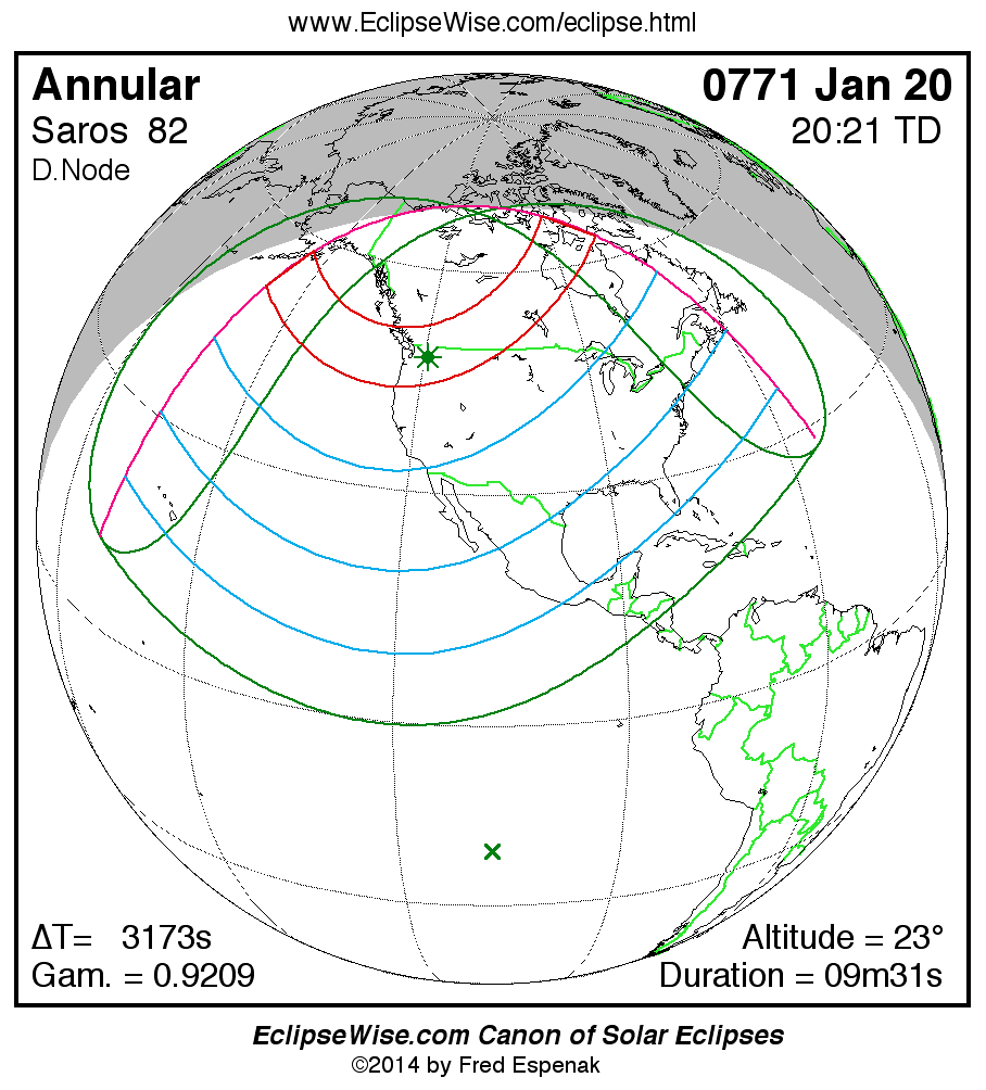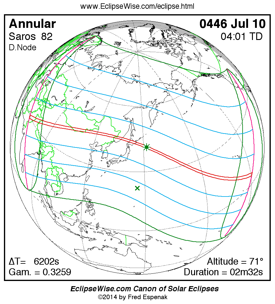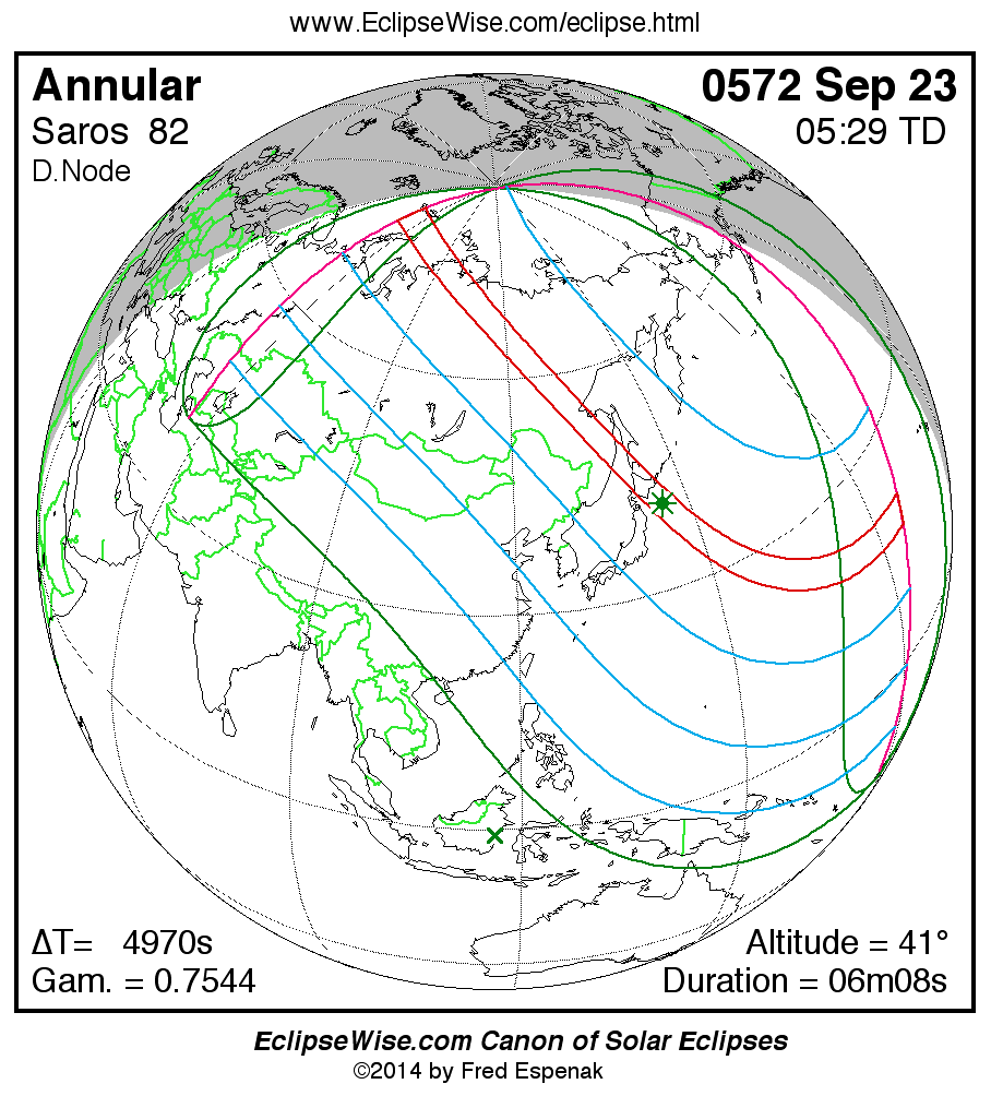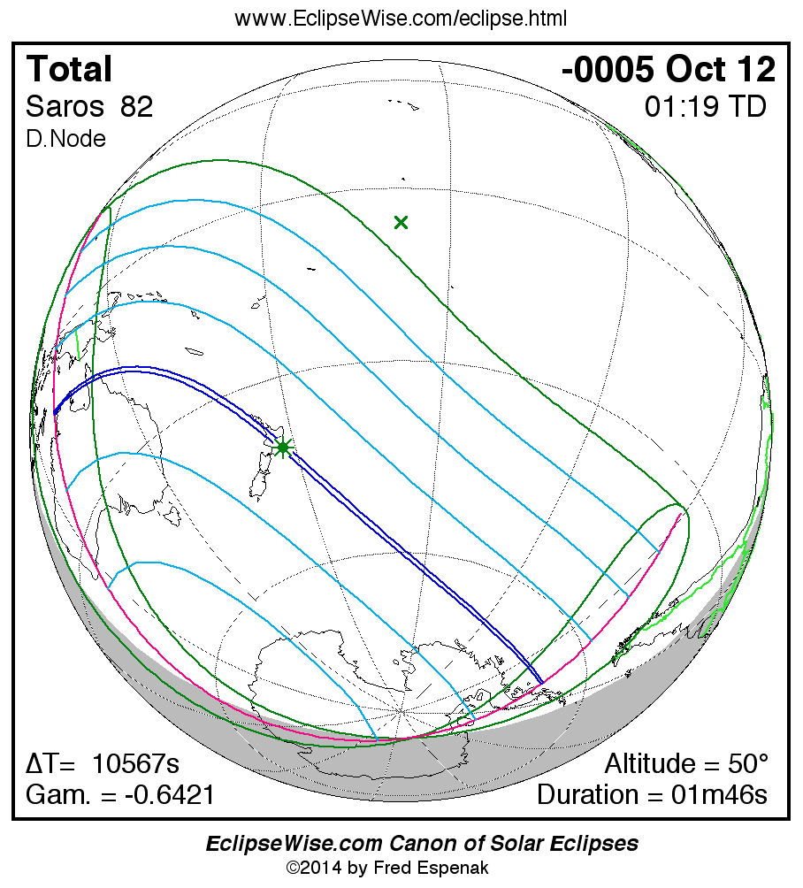 A panorama of all solar eclipses belonging to Saros 82 is presented here. Each map depicts the geographic region of visibility for a single eclipse. For central eclipses, the total or annular path is plotted in either blue (total) or red (annular). The date and time is given for the instant of Greatest Eclipse. Every map serves as a hyperlink to the EclipseWise Prime page for that eclipse where a larger map and complete details for the eclipse can be found. Visit the Key to Solar Eclipse Maps for a detailed explanation of these maps. Near the bottom of the page are a series of hyperlinks for more on solar eclipses.