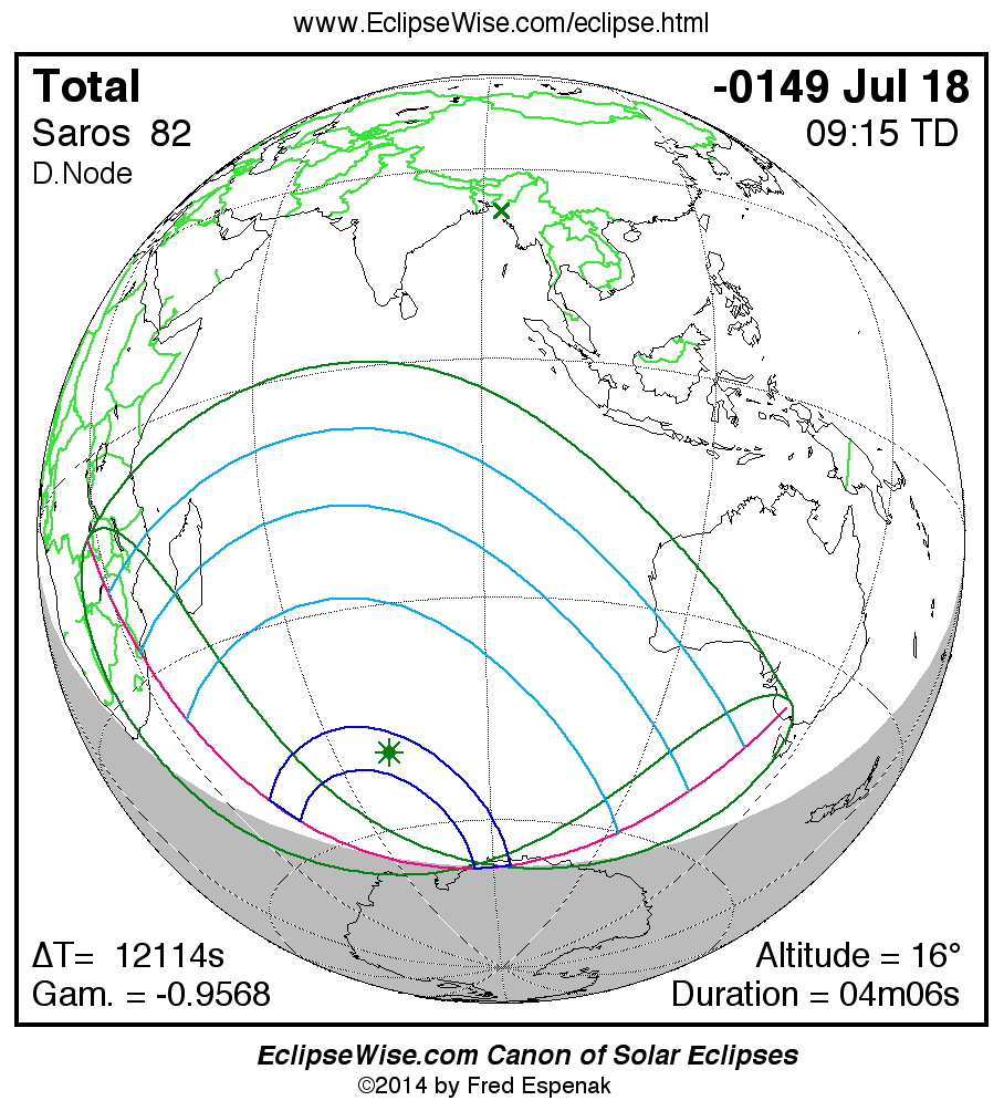 The Saros panorama below is arranged in horizontal rows of 3 eclipses. So one eclipse to the left or right is a difference of 1 Saros cycle, and one eclipse above or below is a difference of 1 exeligmos. By scanning a column of the table, it reveals how the geographic visibility of eclipses separated by an exeligmos slowly changes.