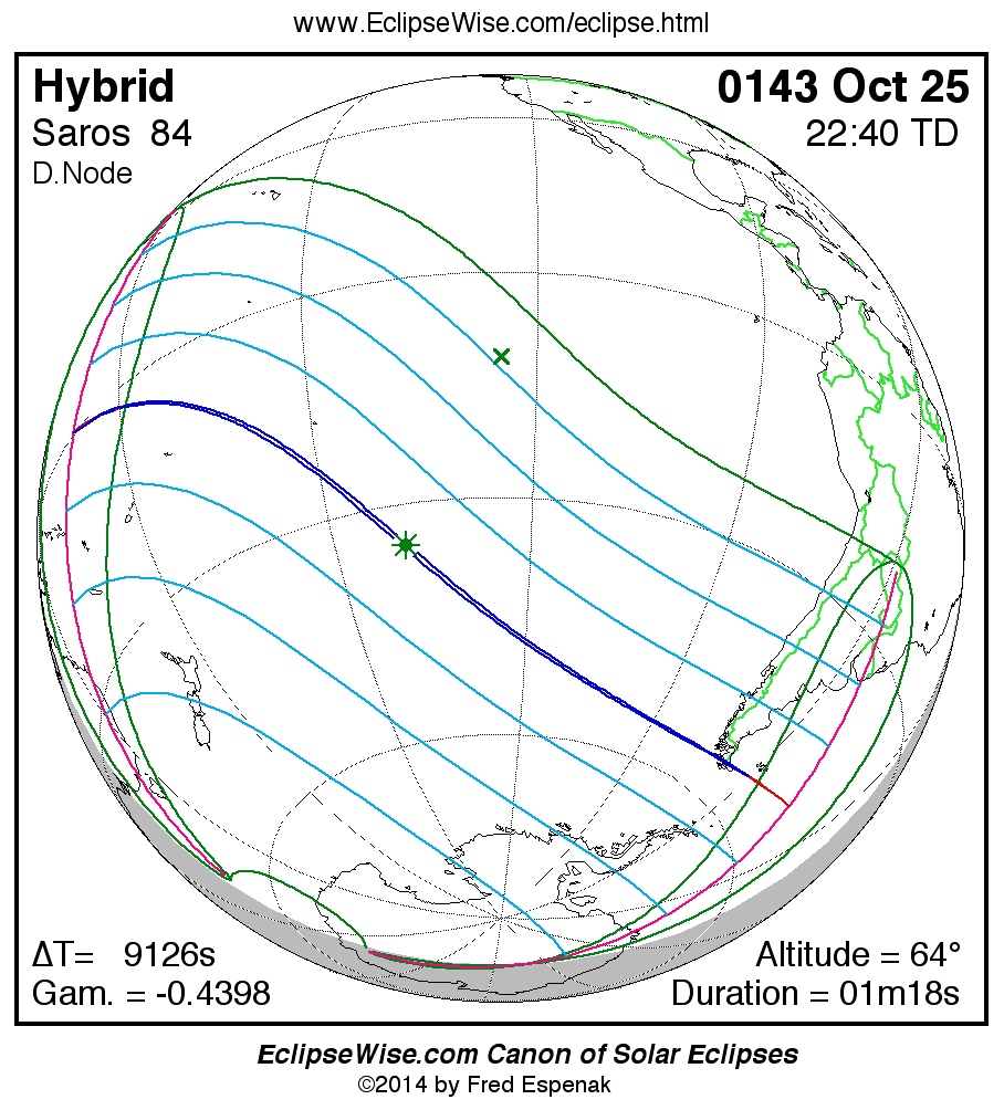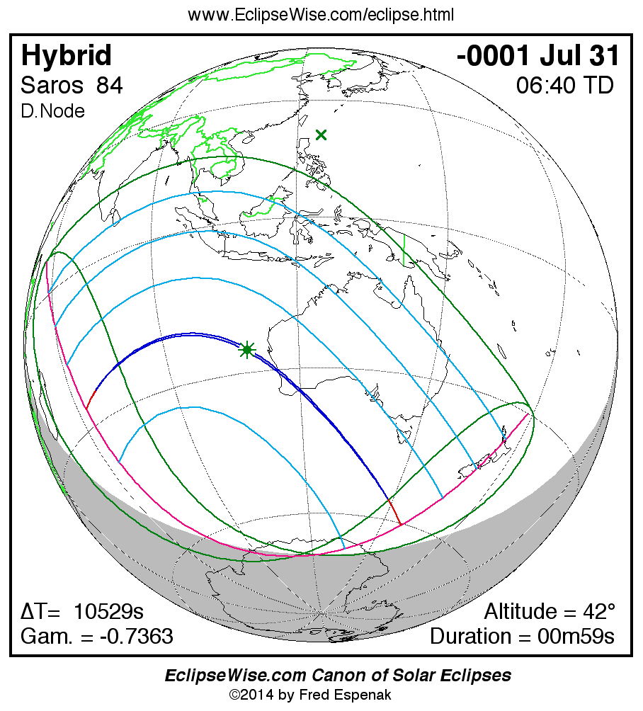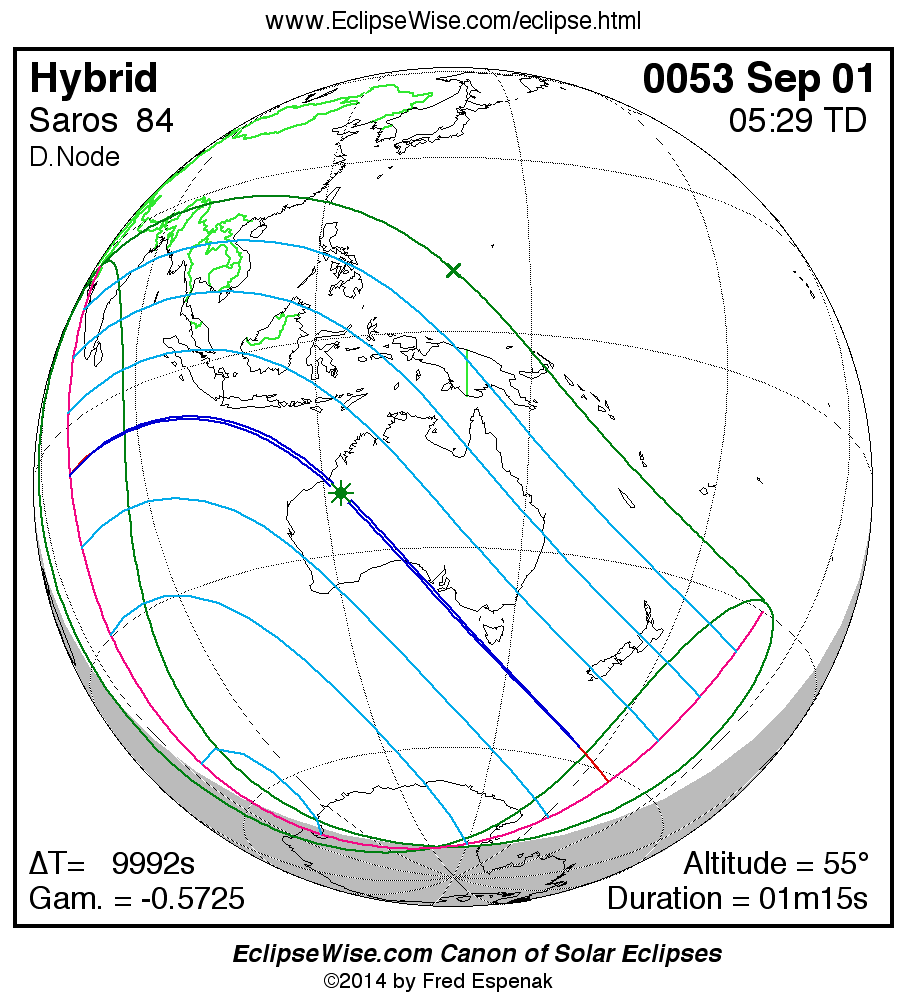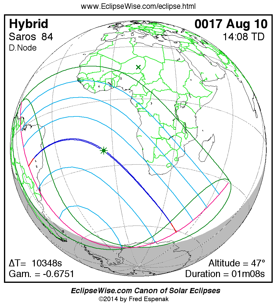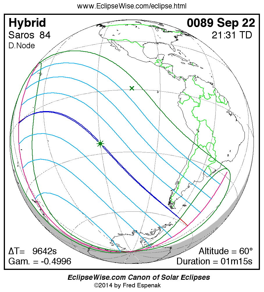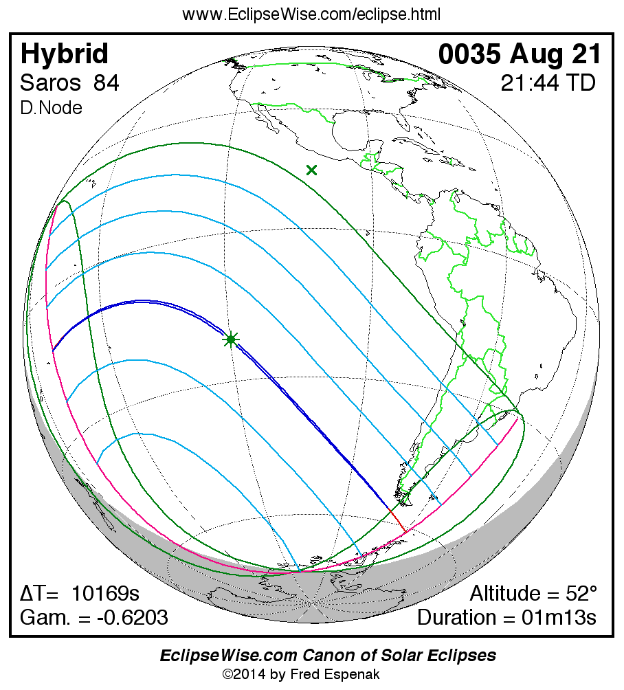 A panorama of all solar eclipses belonging to Saros 84 is presented here. Each map depicts the geographic region of visibility for a single eclipse. For central eclipses, the total or annular path is plotted in either blue (total) or red (annular). The date and time is given for the instant of Greatest Eclipse. Every map serves as a hyperlink to the EclipseWise Prime page for that eclipse where a larger map and complete details for the eclipse can be found. Visit the Key to Solar Eclipse Maps for a detailed explanation of these maps. Near the bottom of the page are a series of hyperlinks for more on solar eclipses.