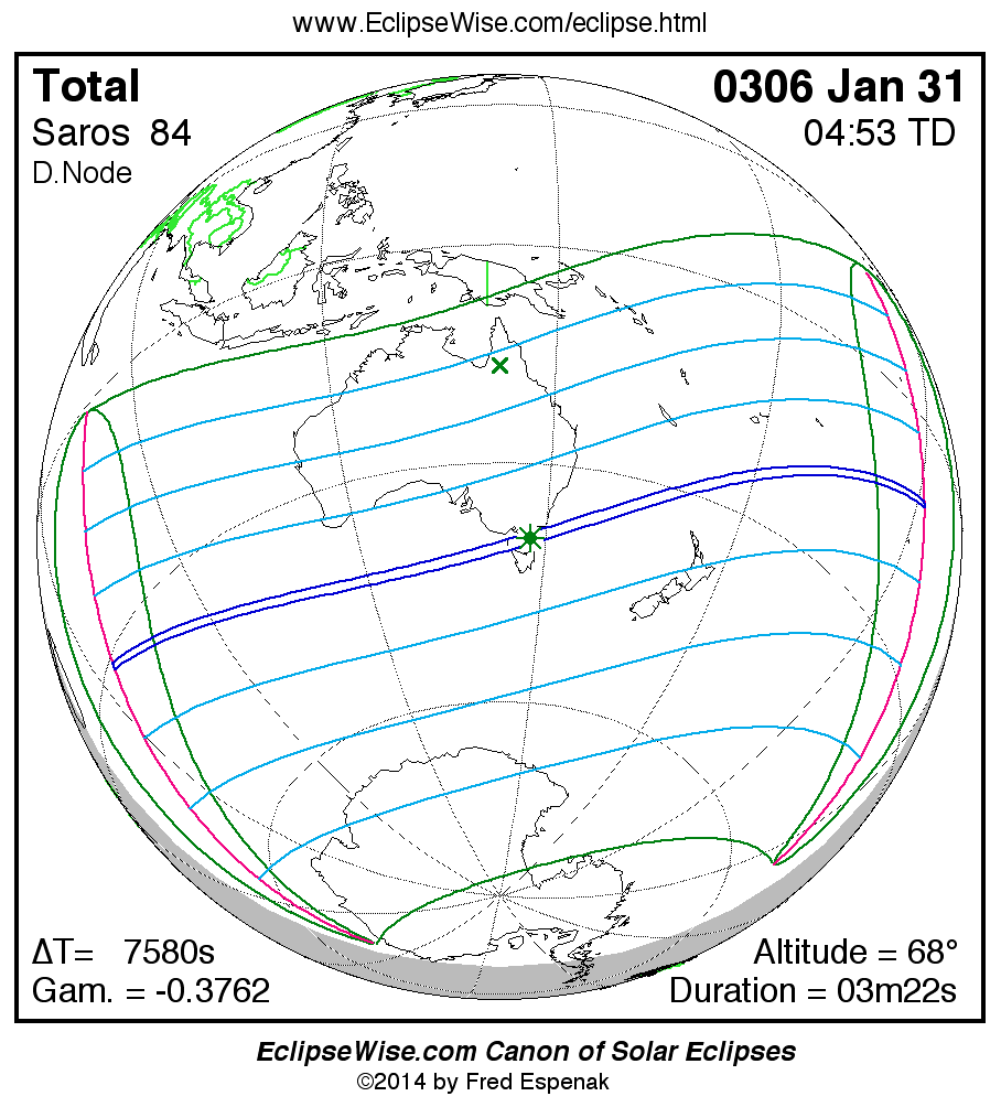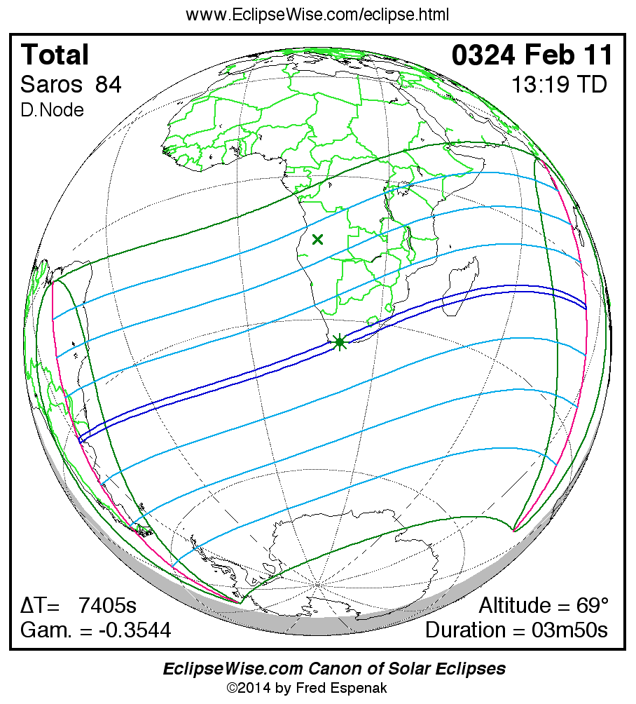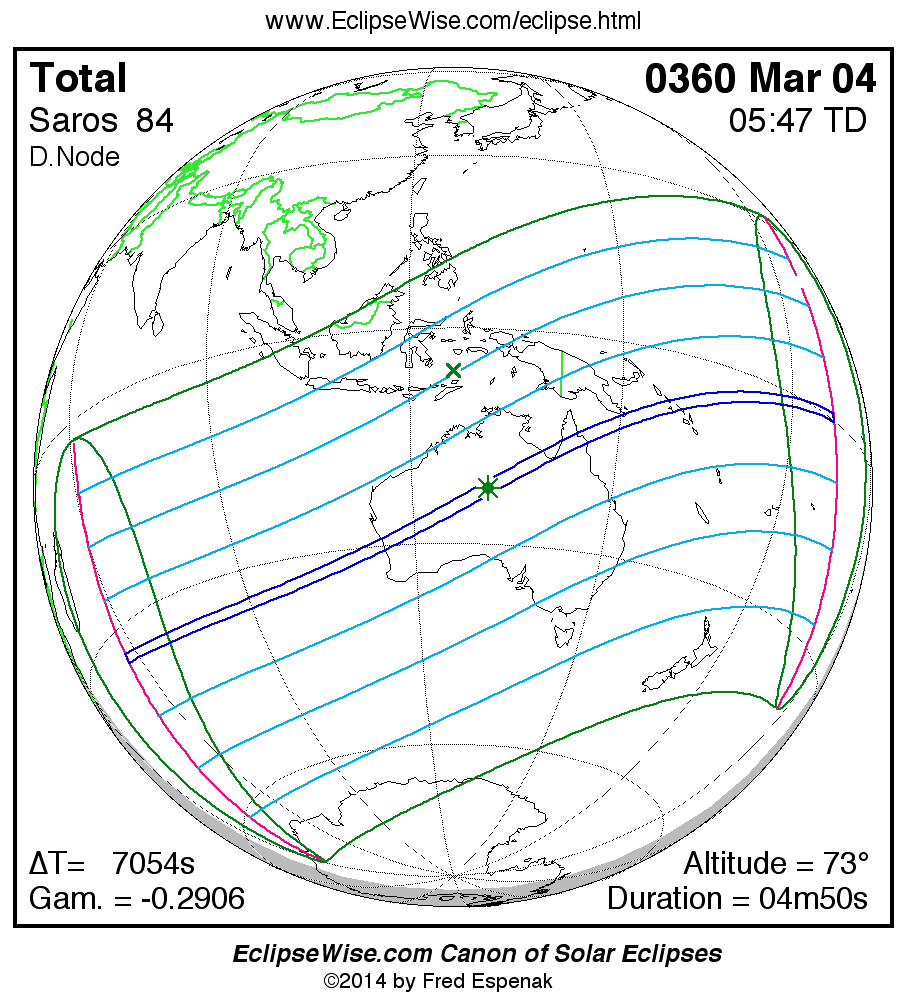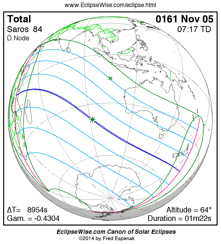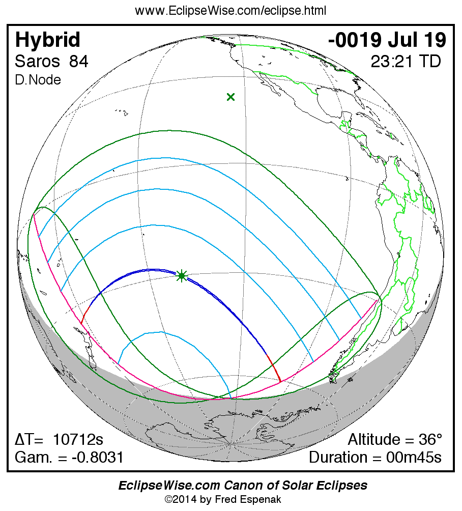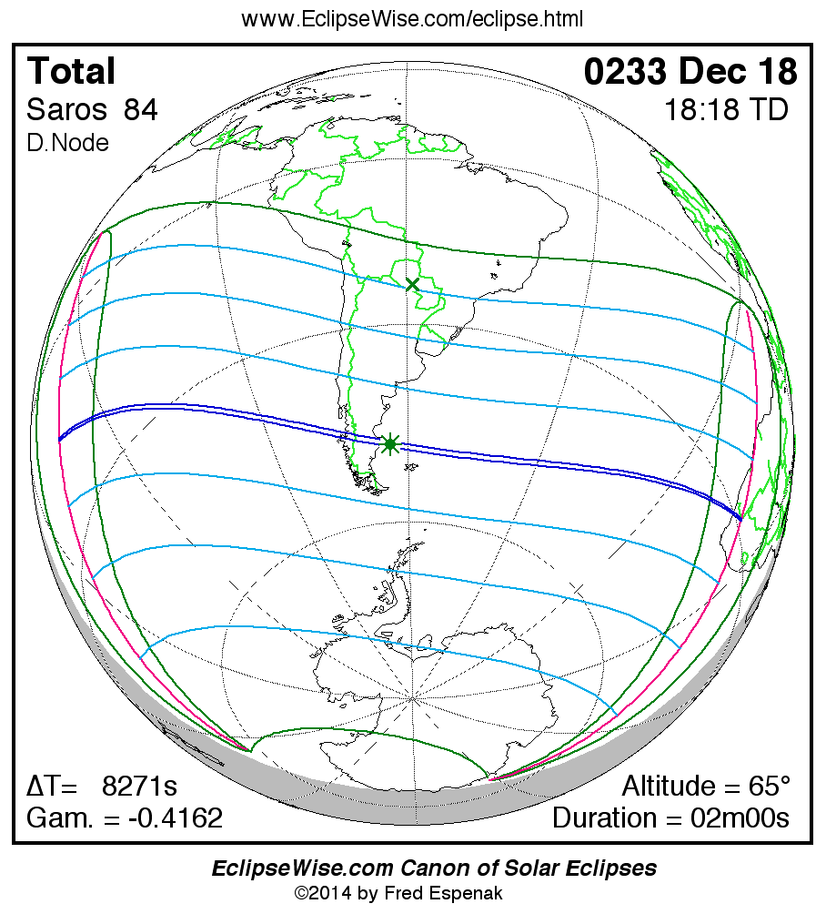 A panorama of all solar eclipses belonging to Saros 84 is presented here. Each map depicts the geographic region of visibility for a single eclipse. For central eclipses, the total or annular path is plotted in either blue (total) or red (annular). The date and time is given for the instant of Greatest Eclipse. Every map serves as a hyperlink to the EclipseWise Prime page for that eclipse where a larger map and complete details for the eclipse can be found. Visit the Key to Solar Eclipse Maps for a detailed explanation of these maps. Near the bottom of the page are a series of hyperlinks for more on solar eclipses.