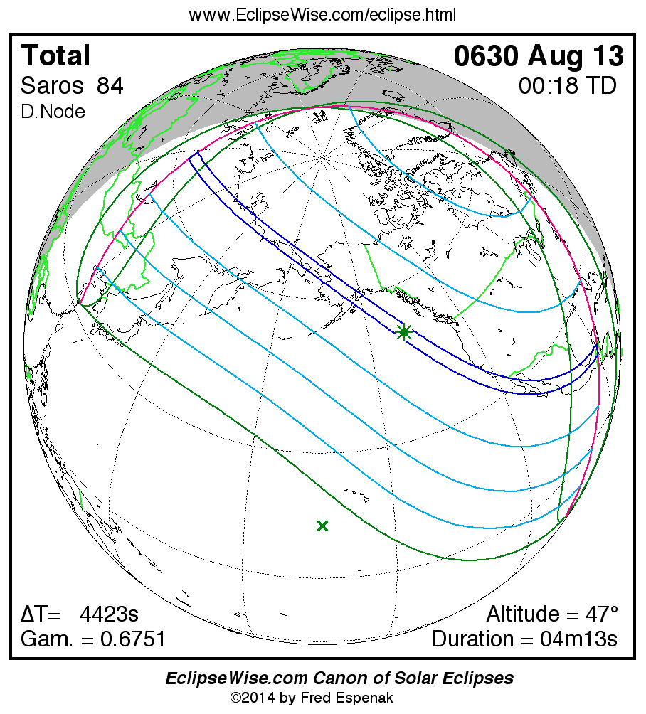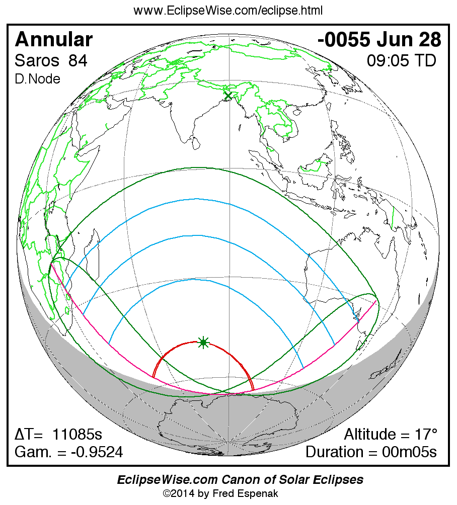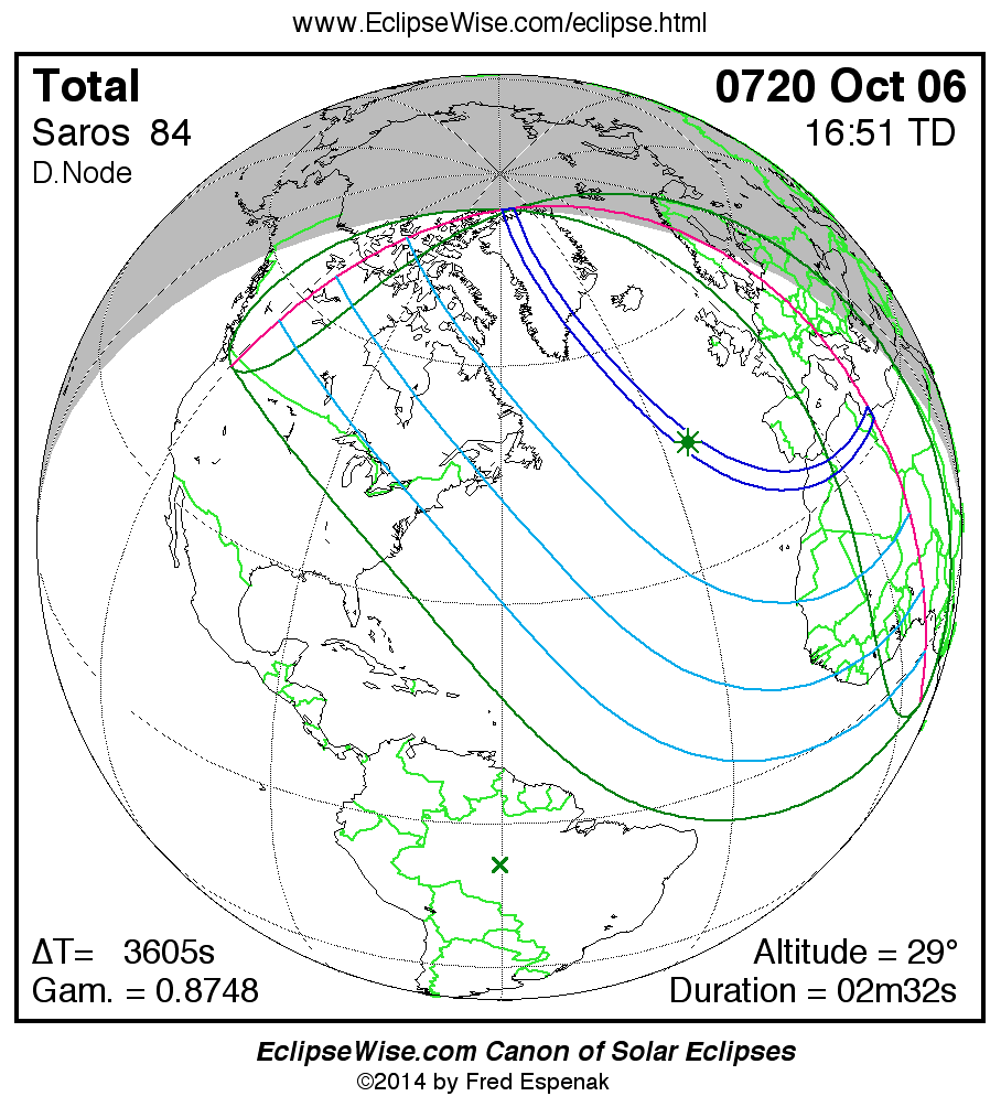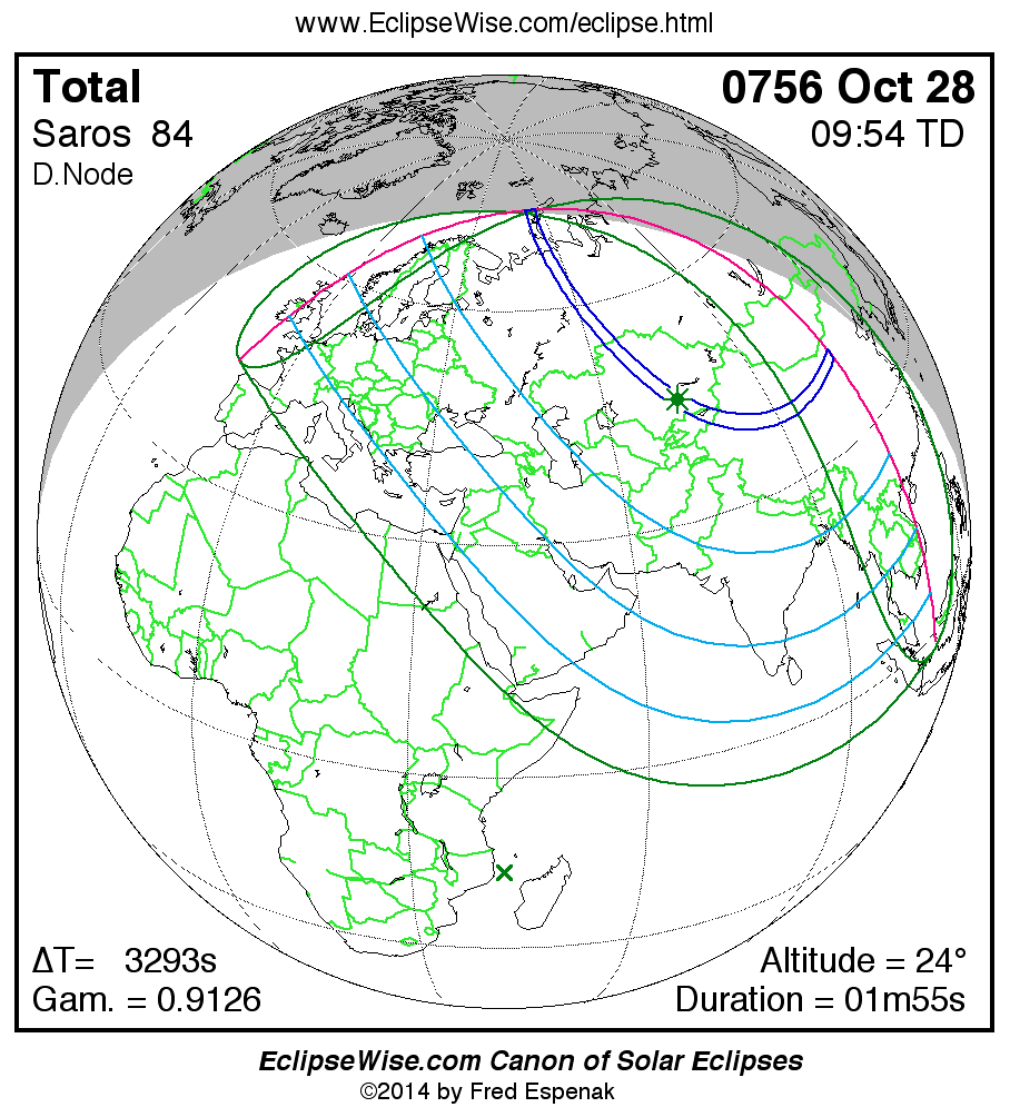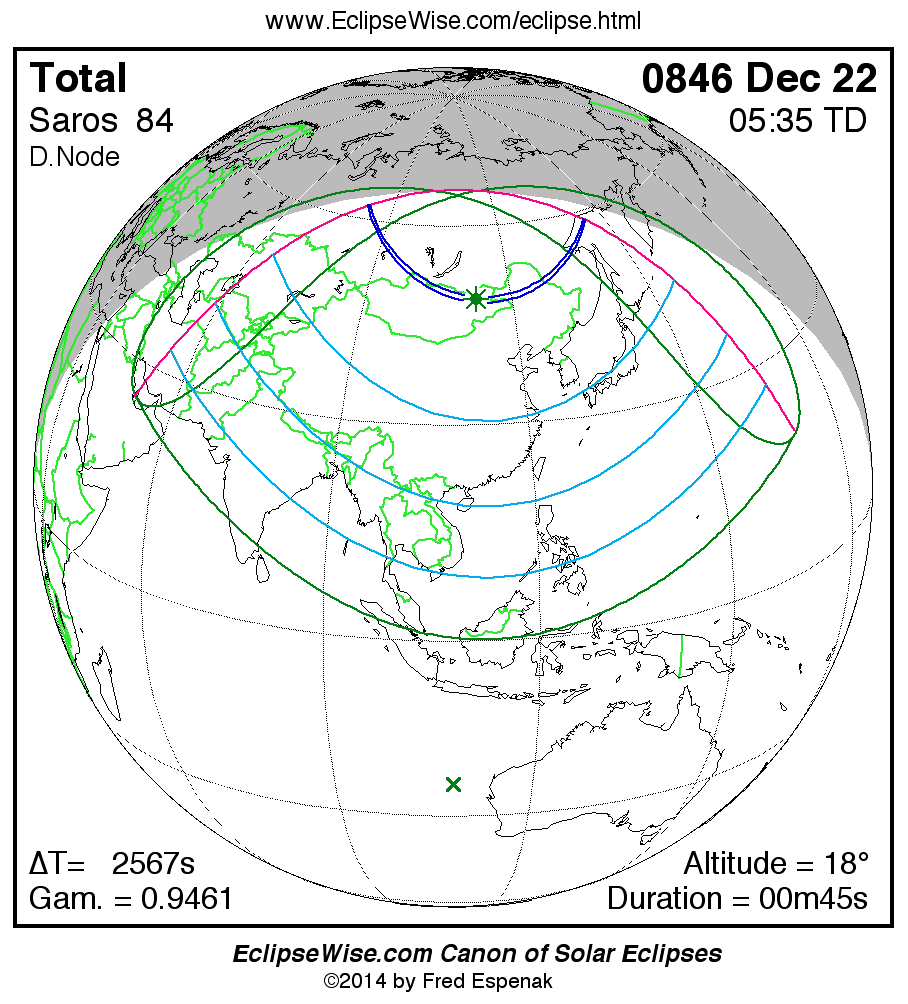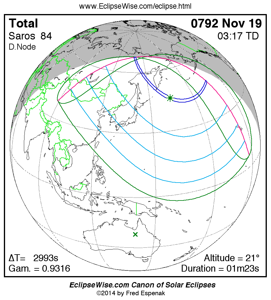 A panorama of all solar eclipses belonging to Saros 84 is presented here. Each map depicts the geographic region of visibility for a single eclipse. For central eclipses, the total or annular path is plotted in either blue (total) or red (annular). The date and time is given for the instant of Greatest Eclipse. Every map serves as a hyperlink to the EclipseWise Prime page for that eclipse where a larger map and complete details for the eclipse can be found. Visit the Key to Solar Eclipse Maps for a detailed explanation of these maps. Near the bottom of the page are a series of hyperlinks for more on solar eclipses.