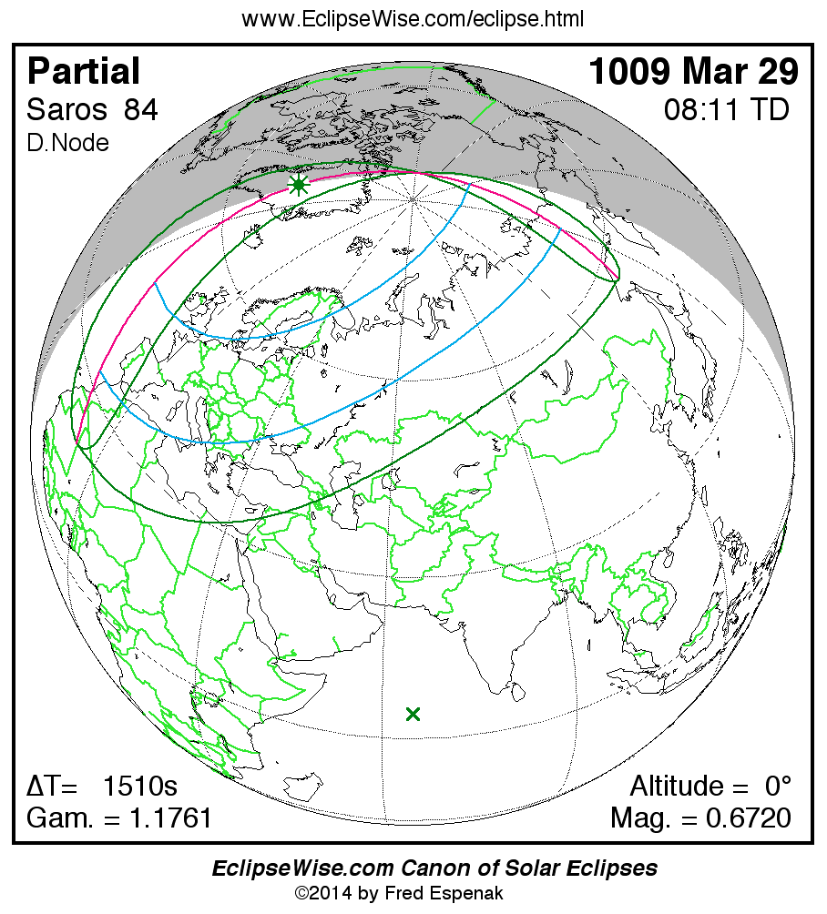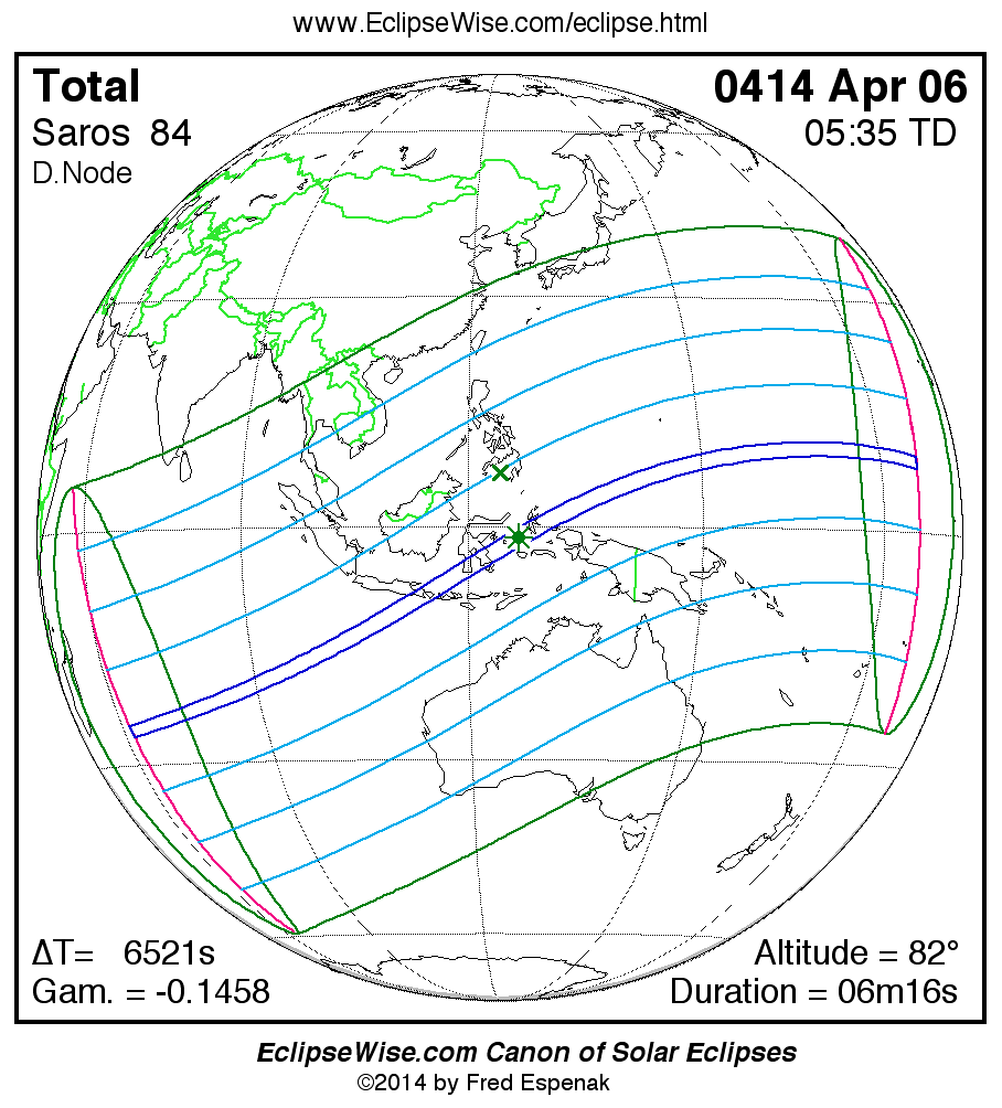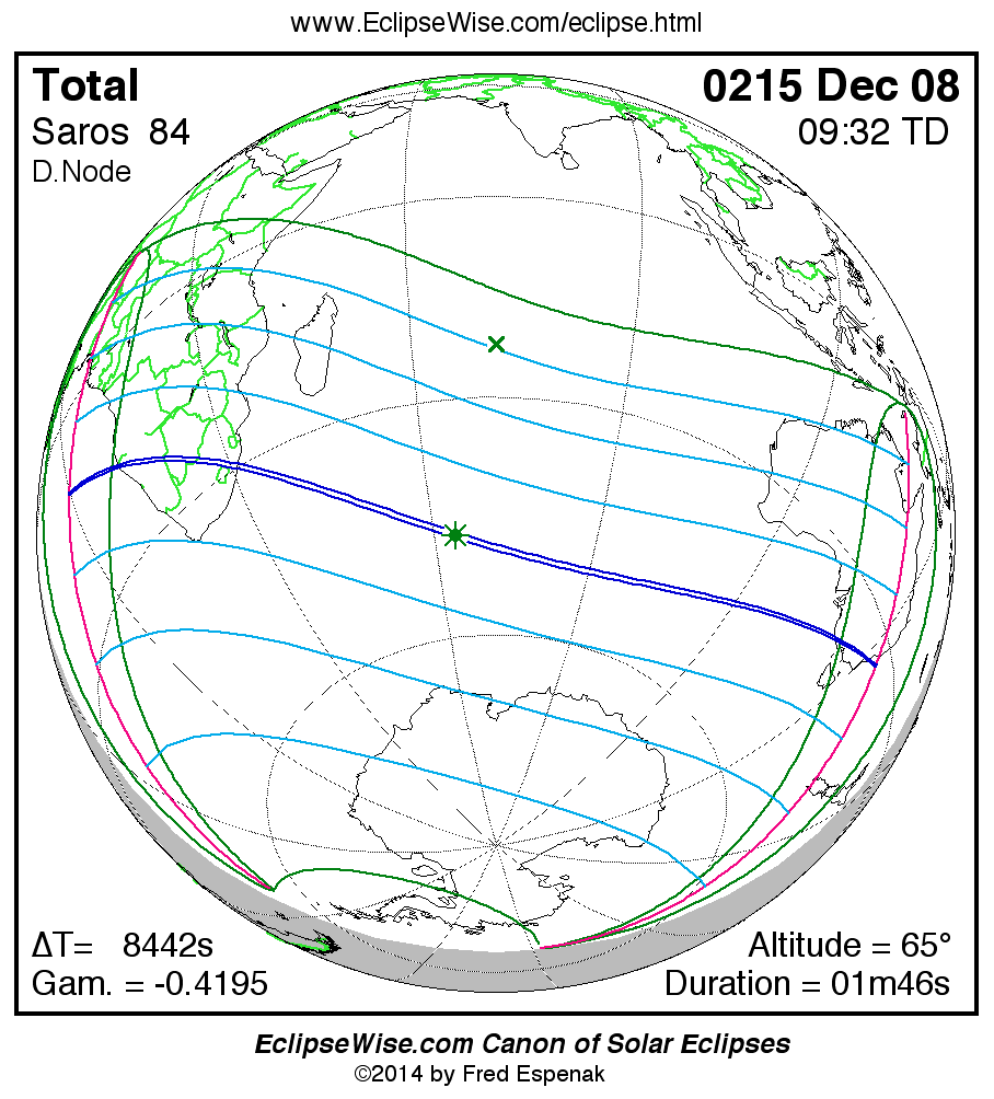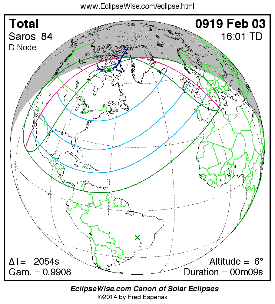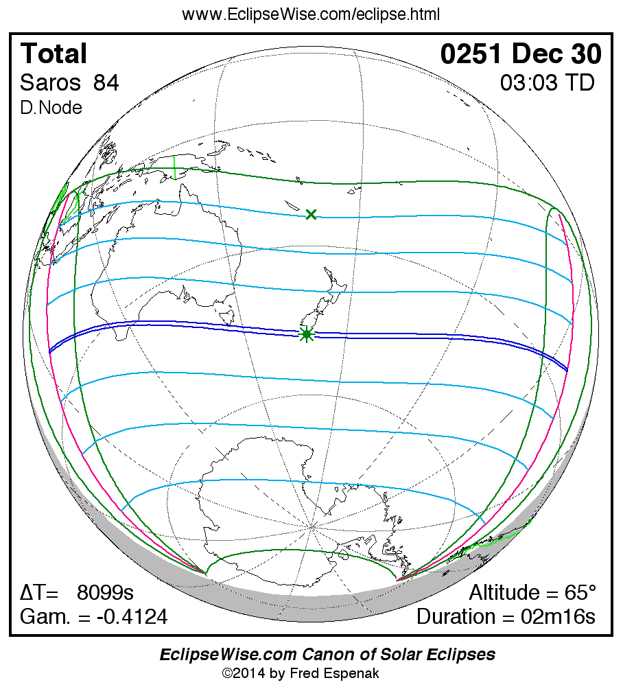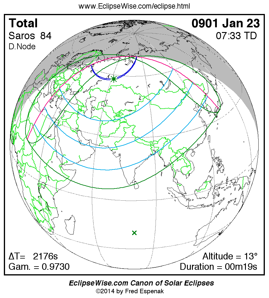 A panorama of all solar eclipses belonging to Saros 84 is presented here. Each map depicts the geographic region of visibility for a single eclipse. For central eclipses, the total or annular path is plotted in either blue (total) or red (annular). The date and time is given for the instant of Greatest Eclipse. Every map serves as a hyperlink to the EclipseWise Prime page for that eclipse where a larger map and complete details for the eclipse can be found. Visit the Key to Solar Eclipse Maps for a detailed explanation of these maps. Near the bottom of the page are a series of hyperlinks for more on solar eclipses.