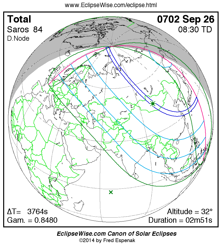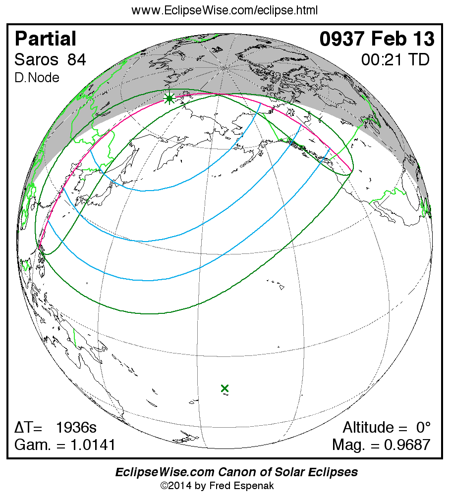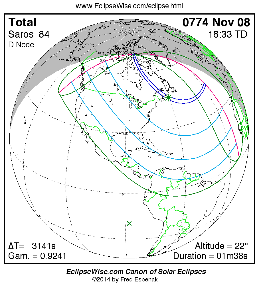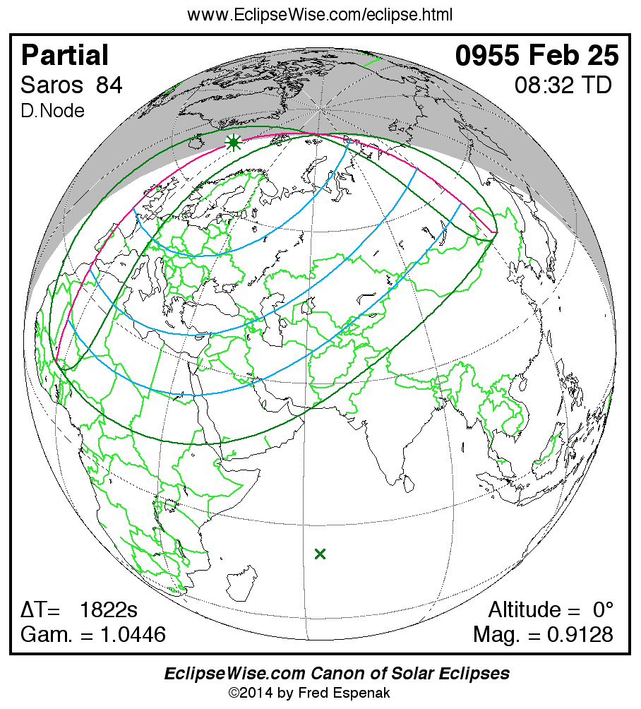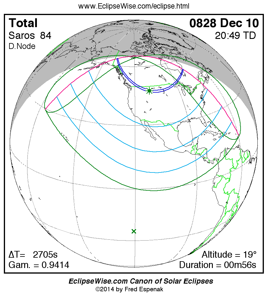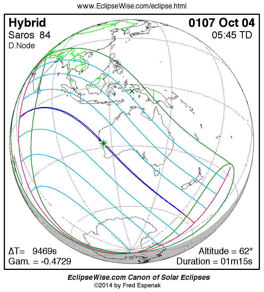A panorama of all solar eclipses belonging to Saros 84 is presented here. Each map depicts the geographic region of visibility for a single eclipse. For central eclipses, the total or annular path is plotted in either blue (total) or red (annular). The date and time is given for the instant of Greatest Eclipse. Every map serves as a hyperlink to the EclipseWise Prime page for that eclipse where a larger map and complete details for the eclipse can be found. Visit the Key to Solar Eclipse Maps for a detailed explanation of these maps. Near the bottom of the page are a series of hyperlinks for more on solar eclipses.