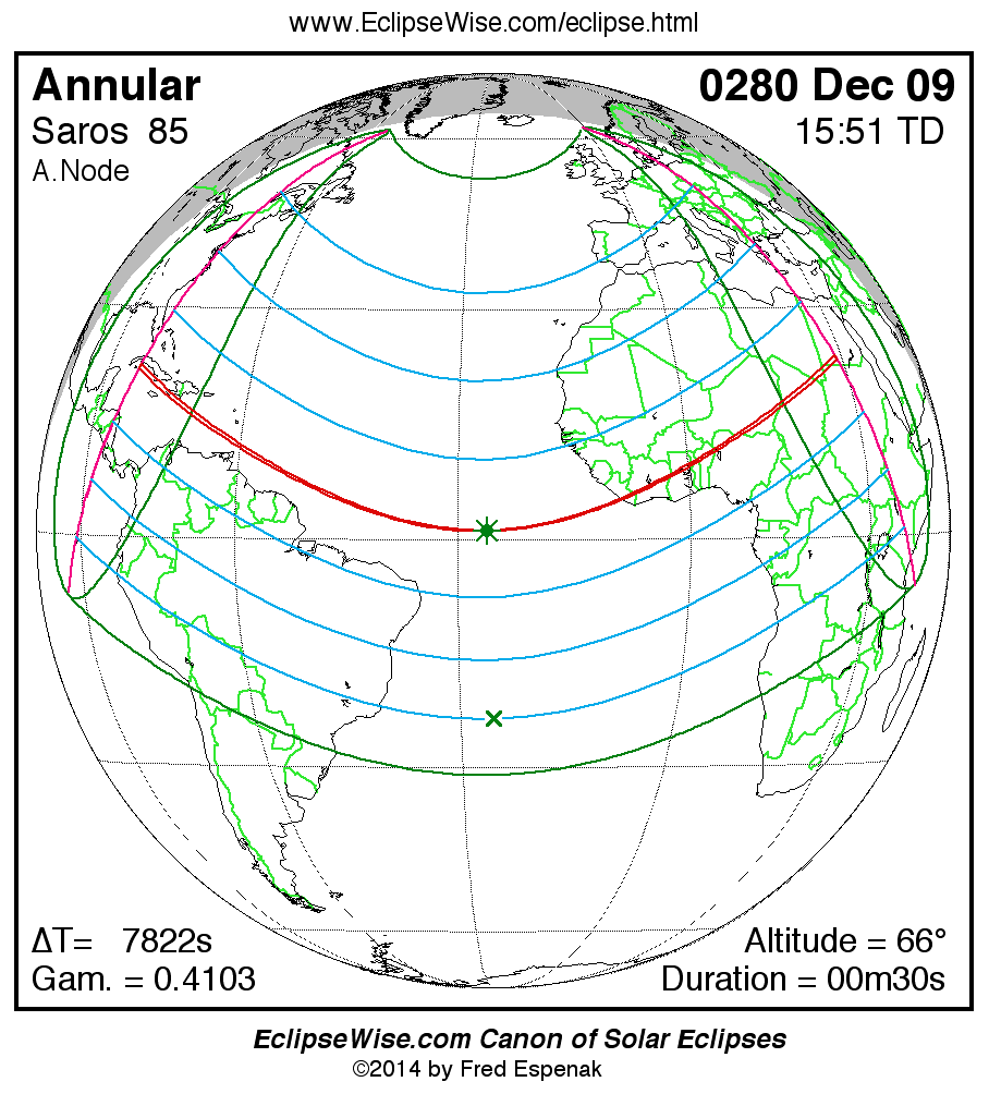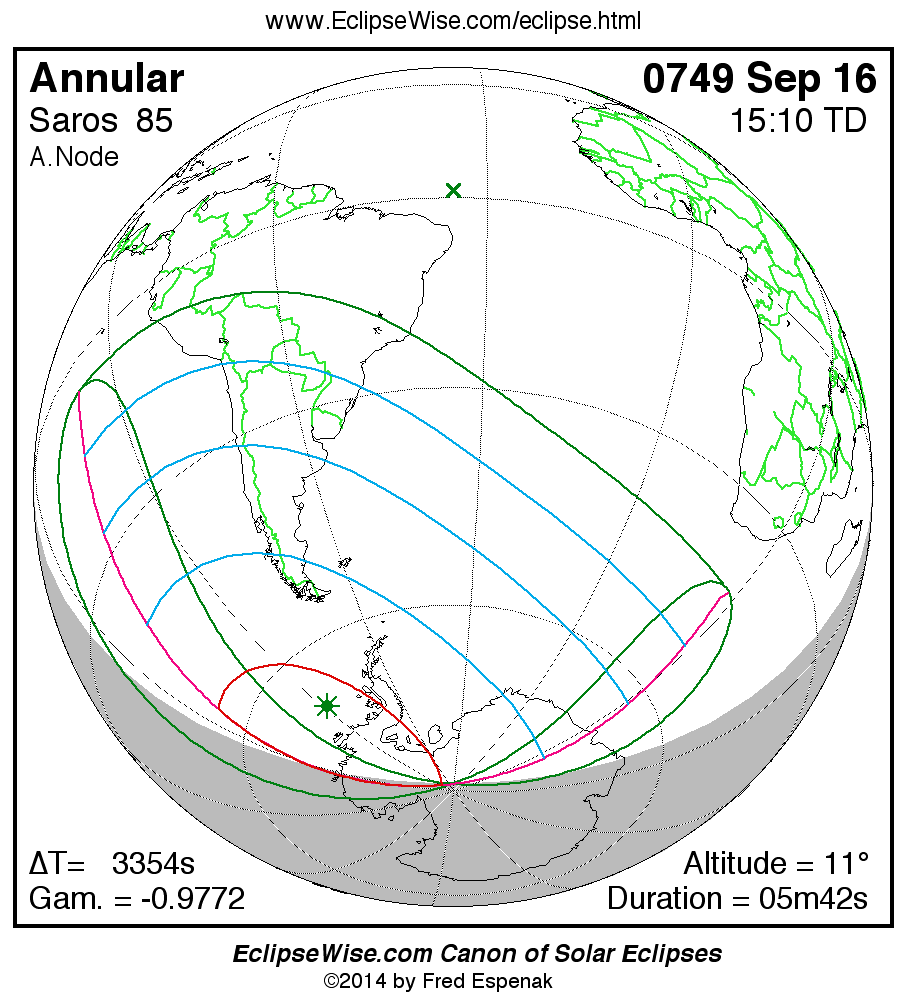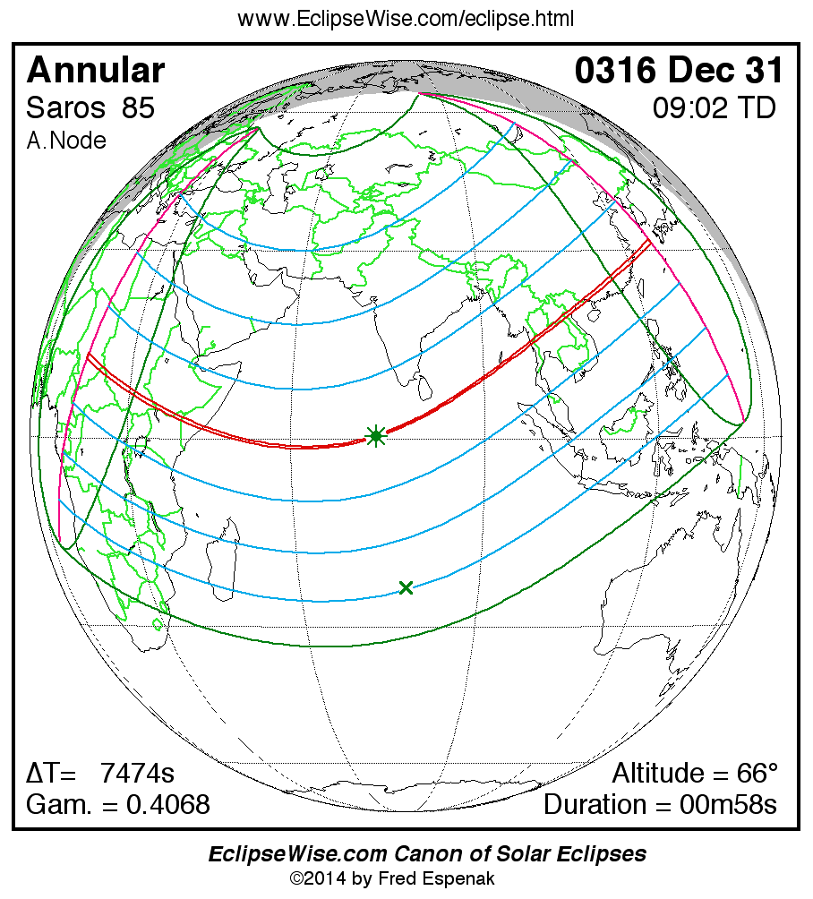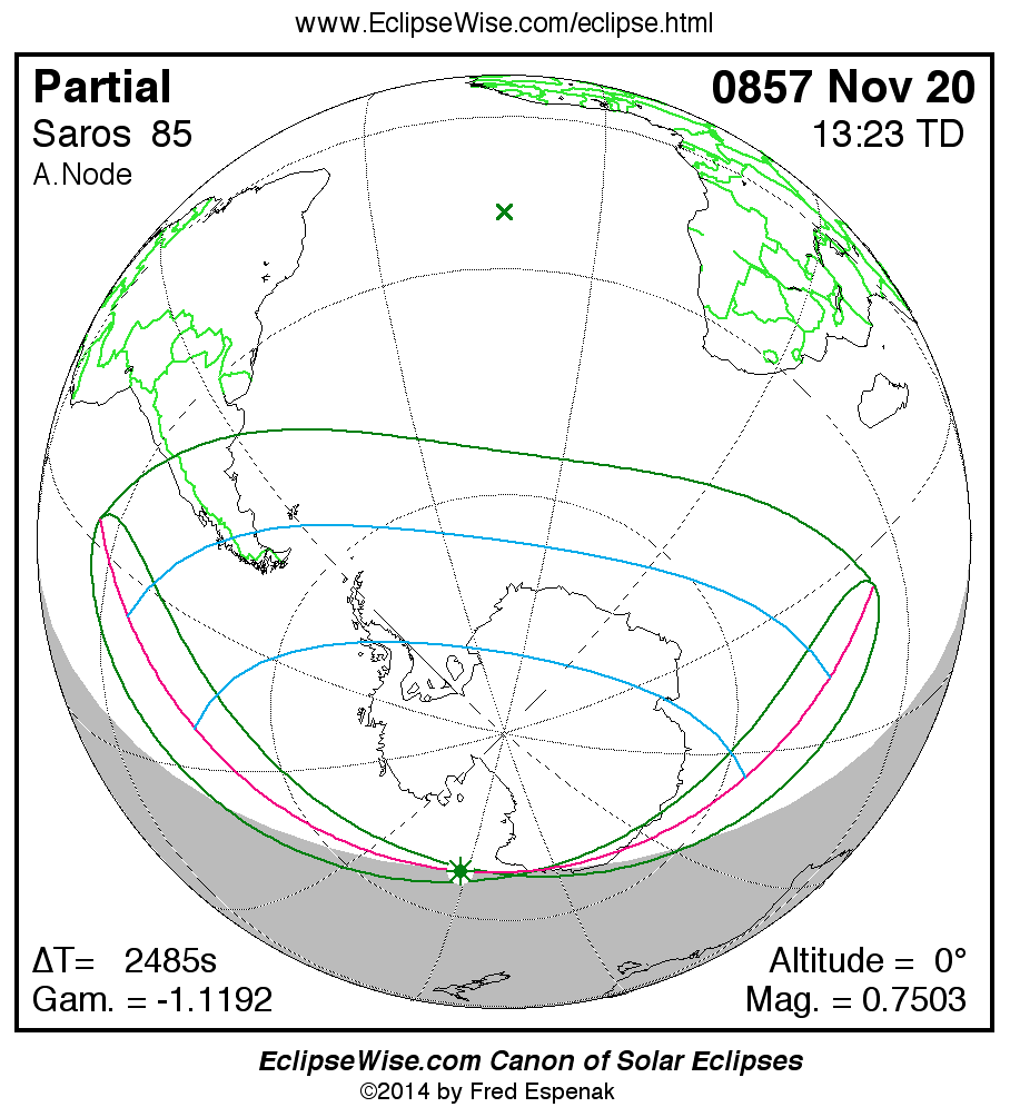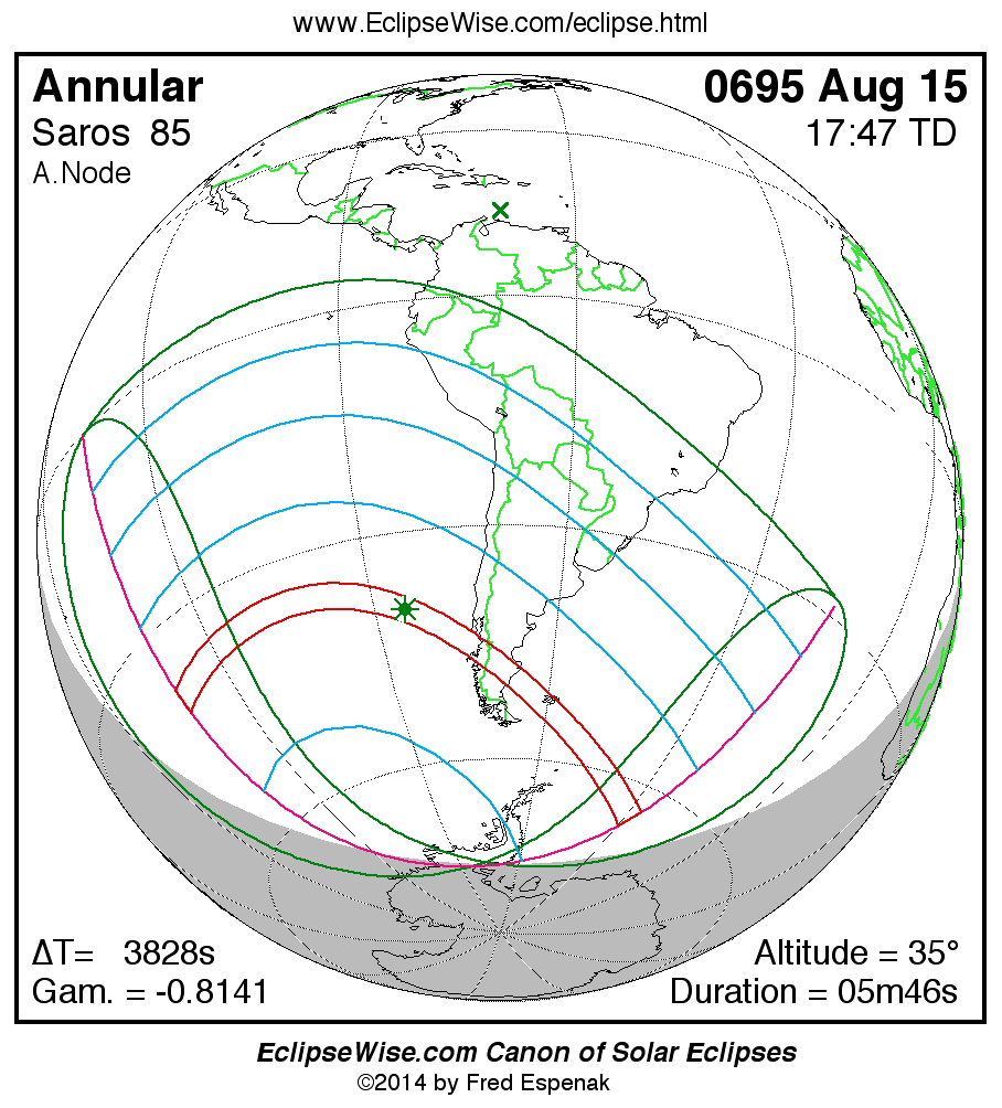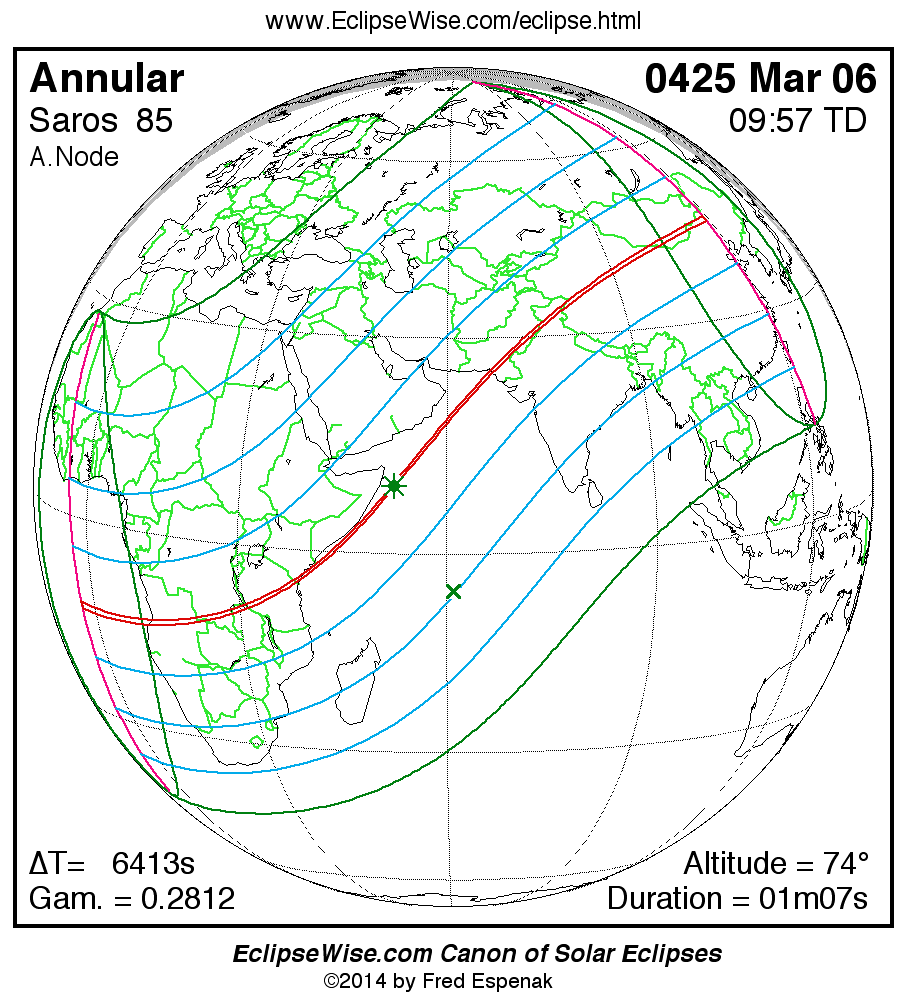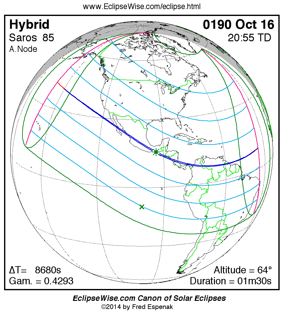 A panorama of all solar eclipses belonging to Saros 85 is presented here. Each map depicts the geographic region of visibility for a single eclipse. For central eclipses, the total or annular path is plotted in either blue (total) or red (annular). The date and time is given for the instant of Greatest Eclipse. Every map serves as a hyperlink to the EclipseWise Prime page for that eclipse where a larger map and complete details for the eclipse can be found. Visit the Key to Solar Eclipse Maps for a detailed explanation of these maps. Near the bottom of the page are a series of hyperlinks for more on solar eclipses.
