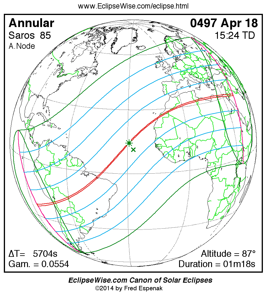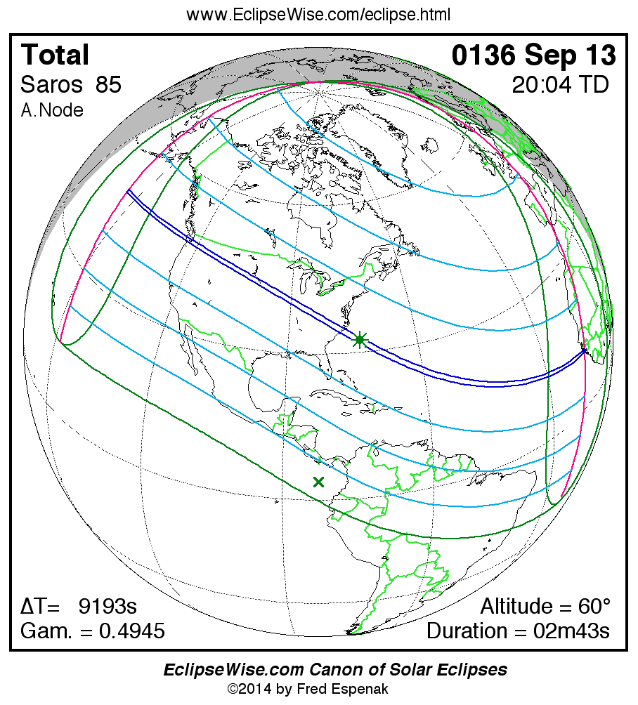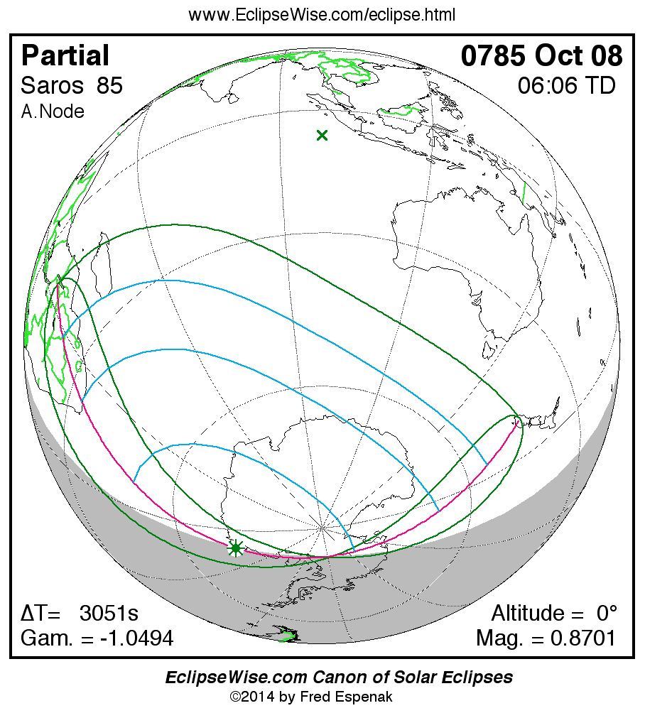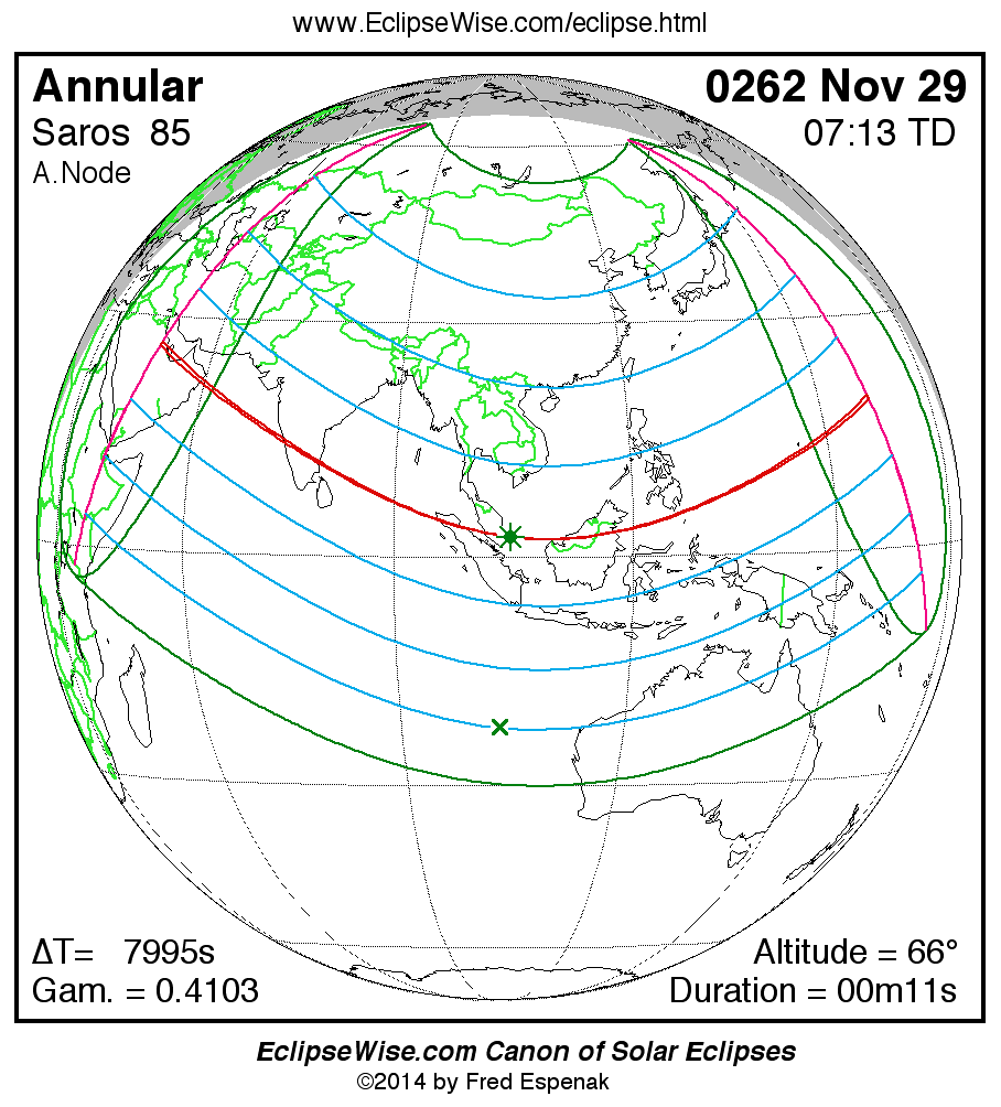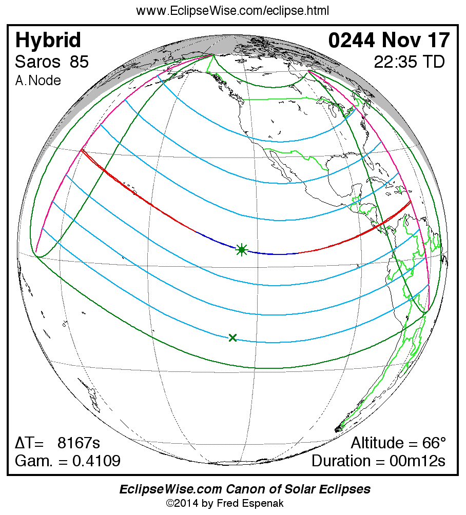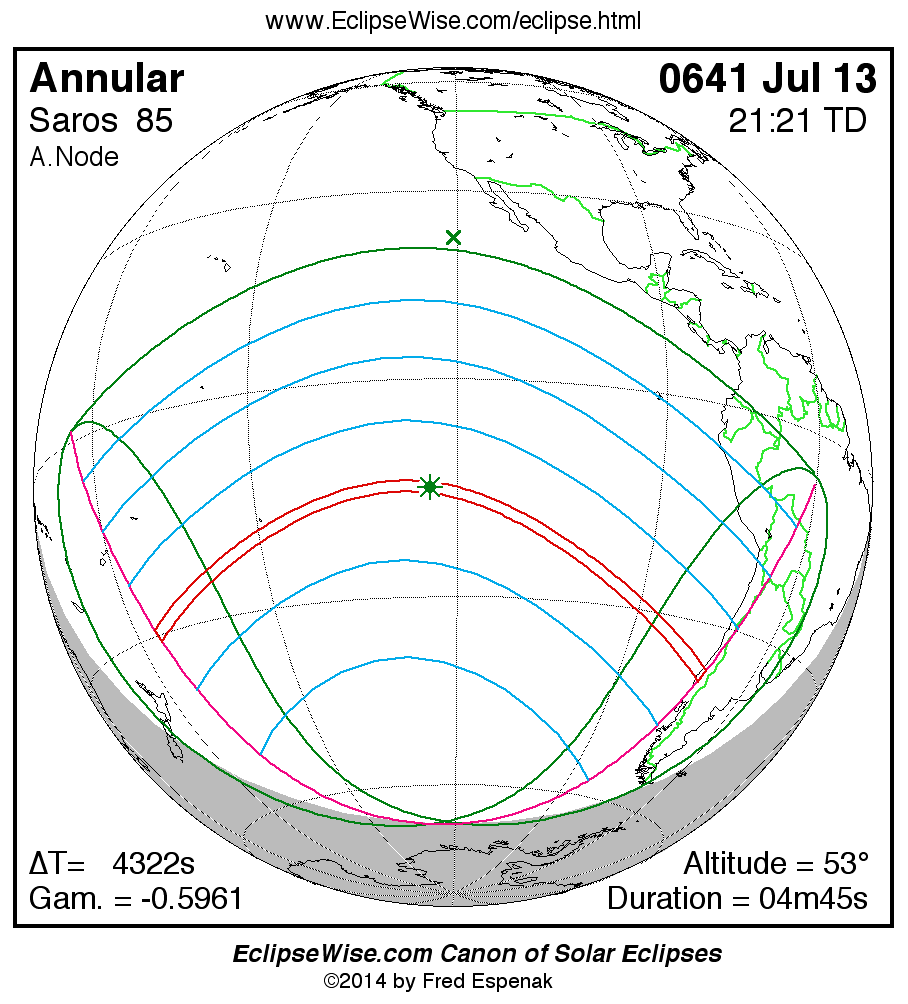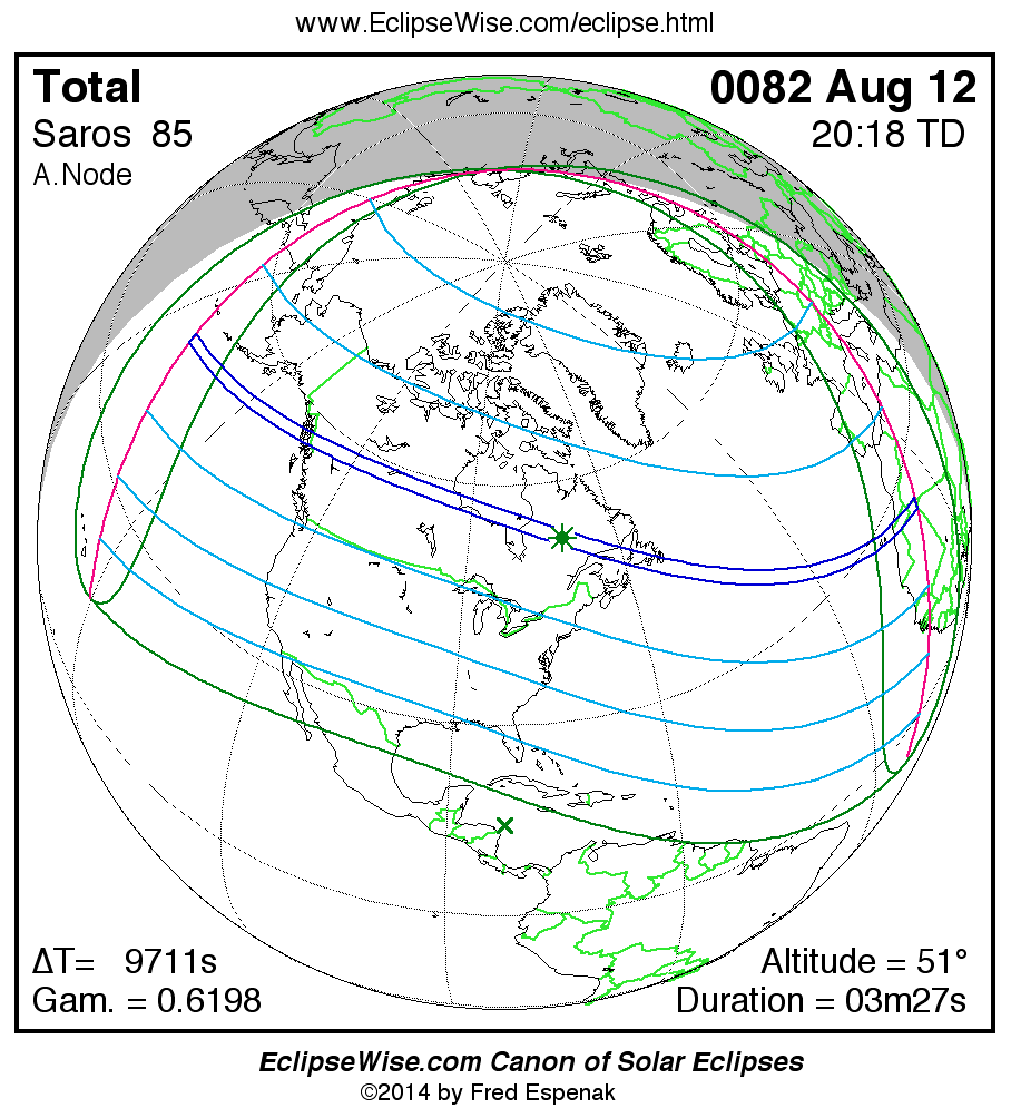 A panorama of all solar eclipses belonging to Saros 85 is presented here. Each map depicts the geographic region of visibility for a single eclipse. For central eclipses, the total or annular path is plotted in either blue (total) or red (annular). The date and time is given for the instant of Greatest Eclipse. Every map serves as a hyperlink to the EclipseWise Prime page for that eclipse where a larger map and complete details for the eclipse can be found. Visit the Key to Solar Eclipse Maps for a detailed explanation of these maps. Near the bottom of the page are a series of hyperlinks for more on solar eclipses.