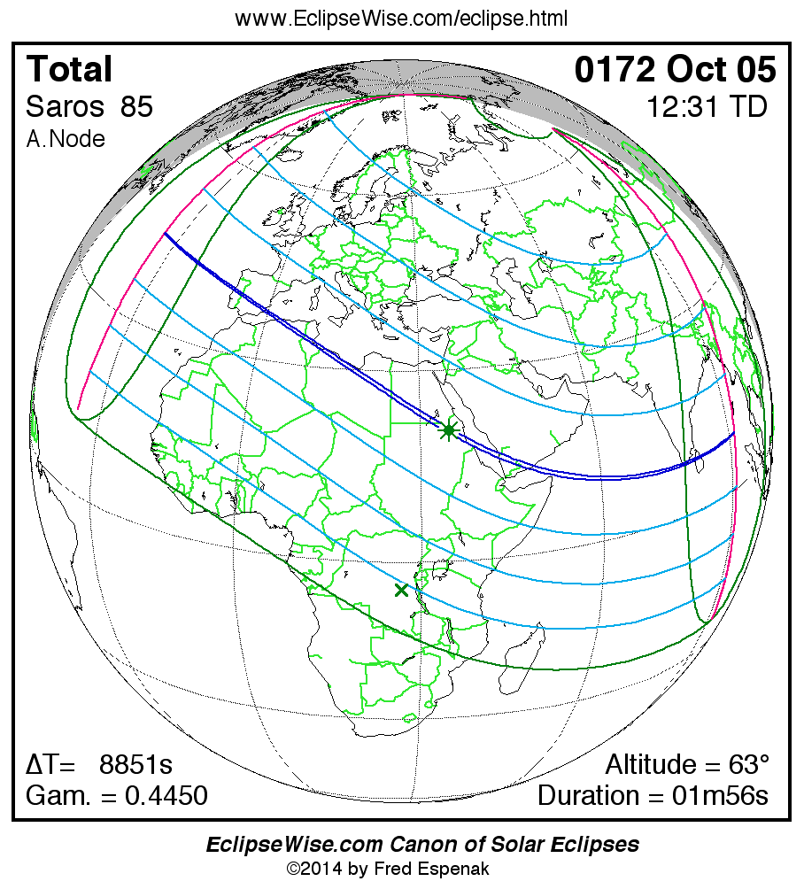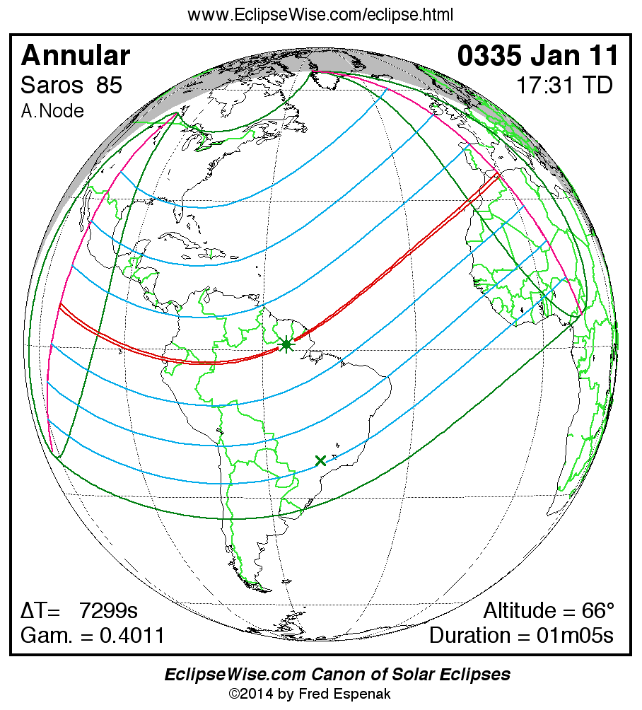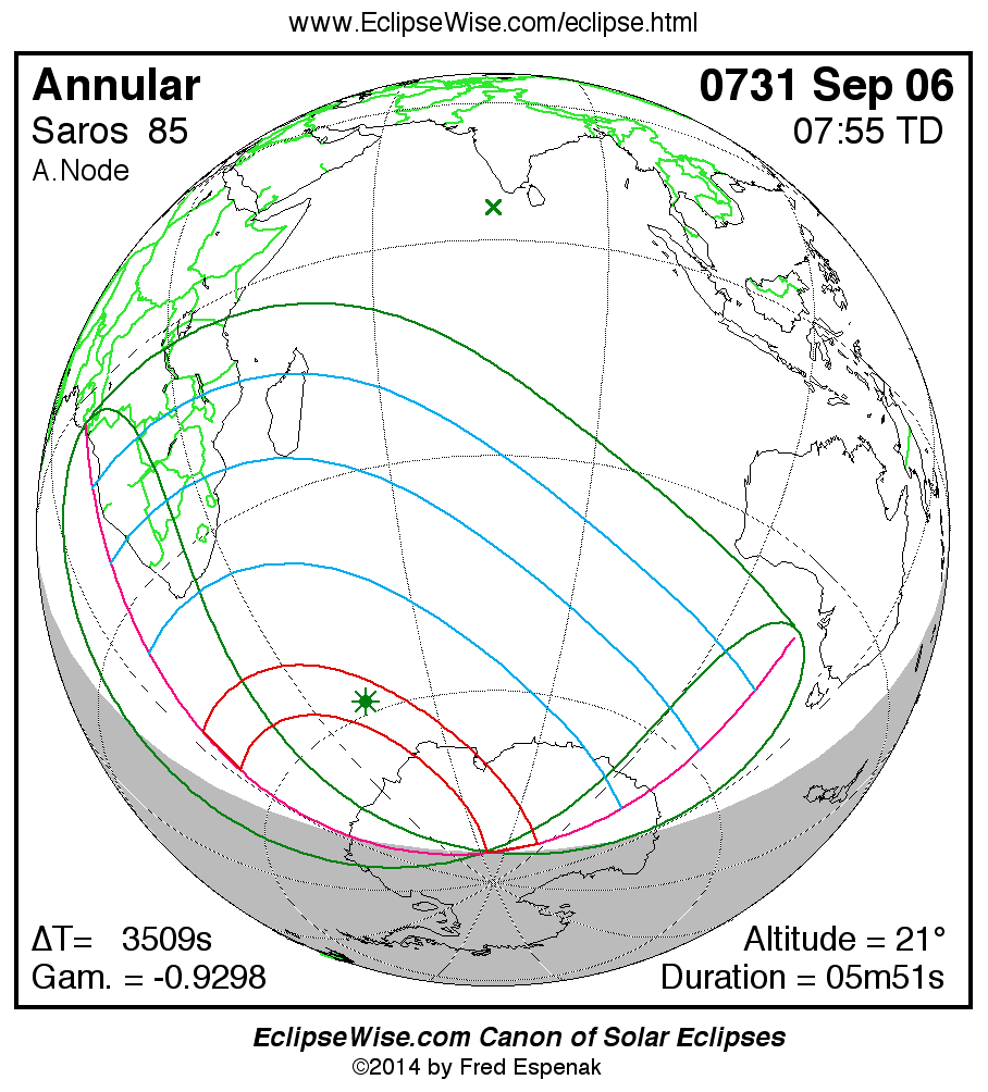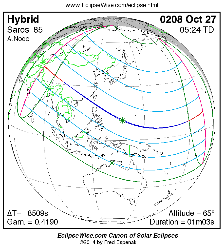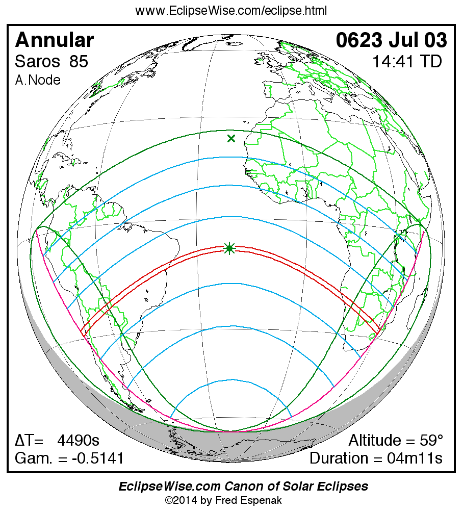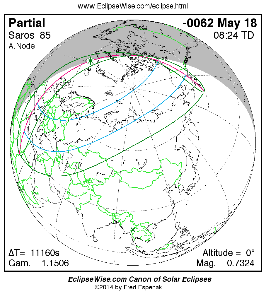 A panorama of all solar eclipses belonging to Saros 85 is presented here. Each map depicts the geographic region of visibility for a single eclipse. For central eclipses, the total or annular path is plotted in either blue (total) or red (annular). The date and time is given for the instant of Greatest Eclipse. Every map serves as a hyperlink to the EclipseWise Prime page for that eclipse where a larger map and complete details for the eclipse can be found. Visit the Key to Solar Eclipse Maps for a detailed explanation of these maps. Near the bottom of the page are a series of hyperlinks for more on solar eclipses.