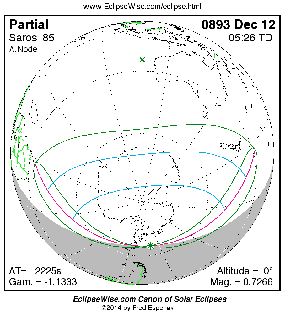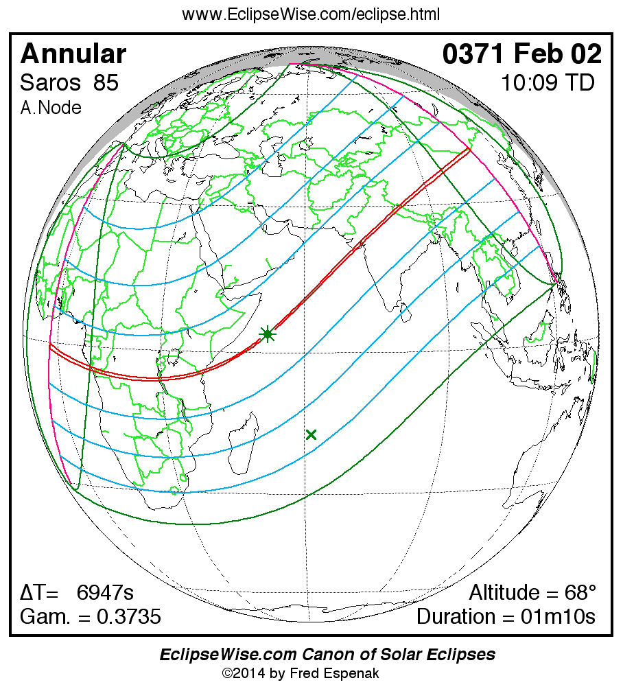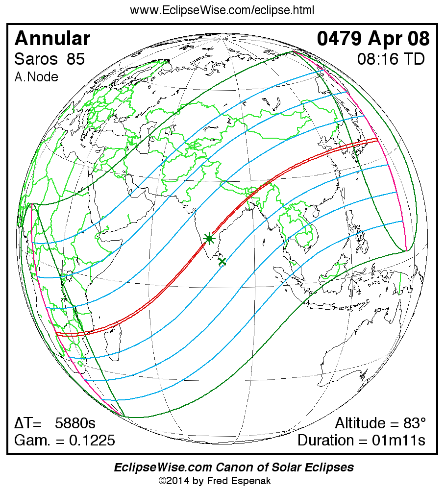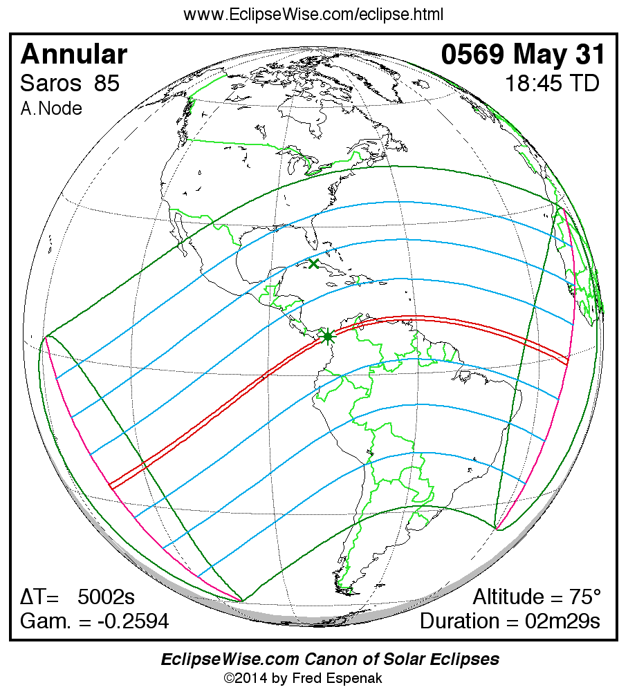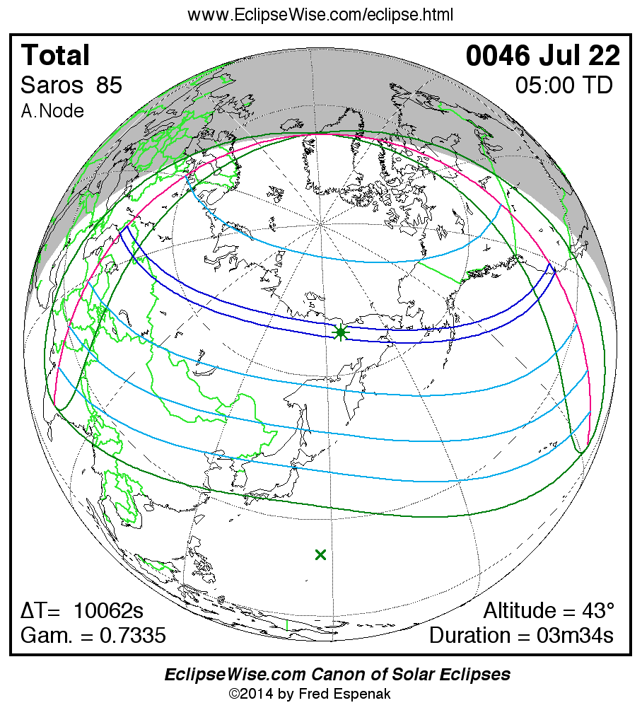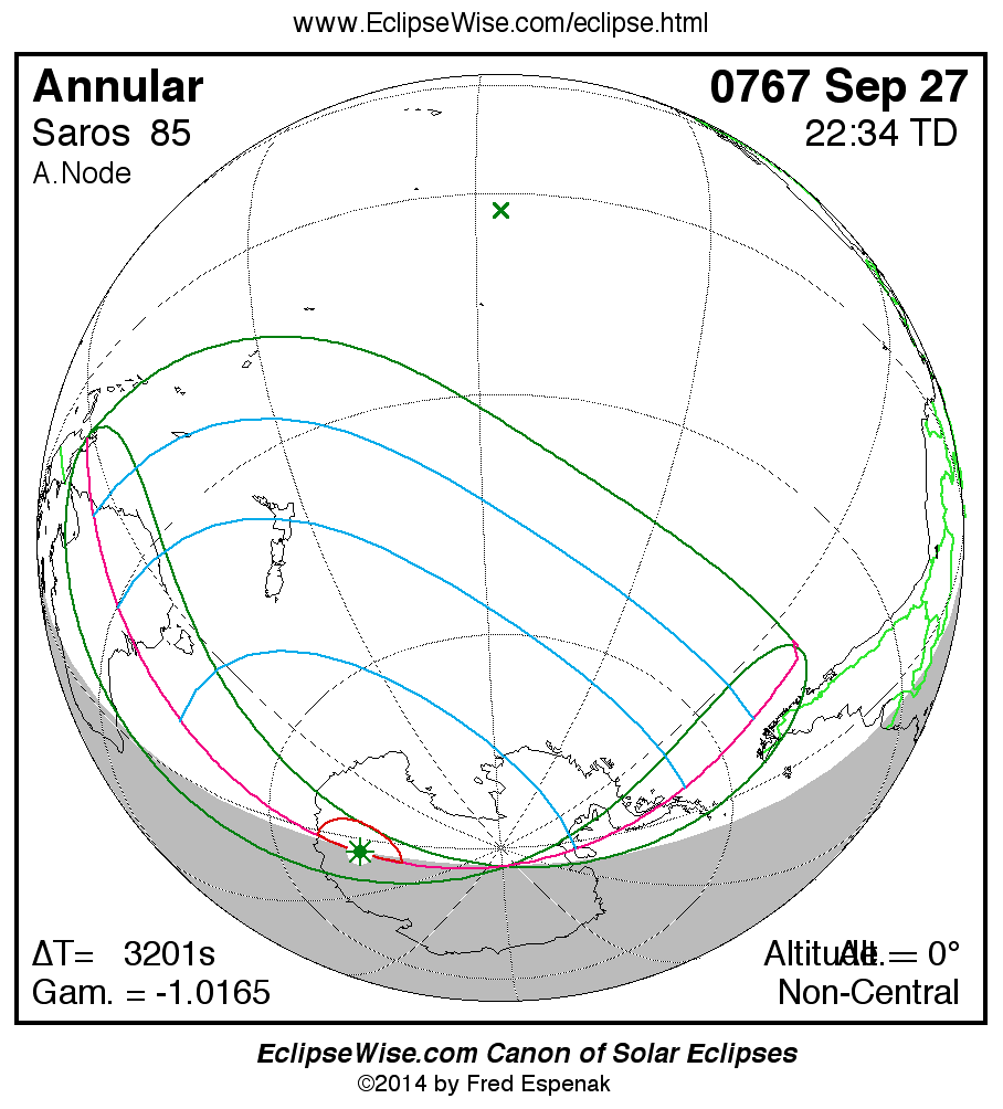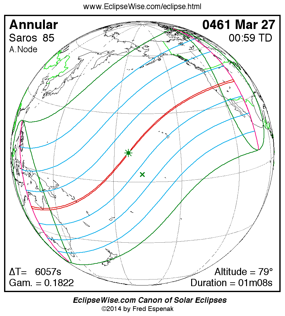 A panorama of all solar eclipses belonging to Saros 85 is presented here. Each map depicts the geographic region of visibility for a single eclipse. For central eclipses, the total or annular path is plotted in either blue (total) or red (annular). The date and time is given for the instant of Greatest Eclipse. Every map serves as a hyperlink to the EclipseWise Prime page for that eclipse where a larger map and complete details for the eclipse can be found. Visit the Key to Solar Eclipse Maps for a detailed explanation of these maps. Near the bottom of the page are a series of hyperlinks for more on solar eclipses.