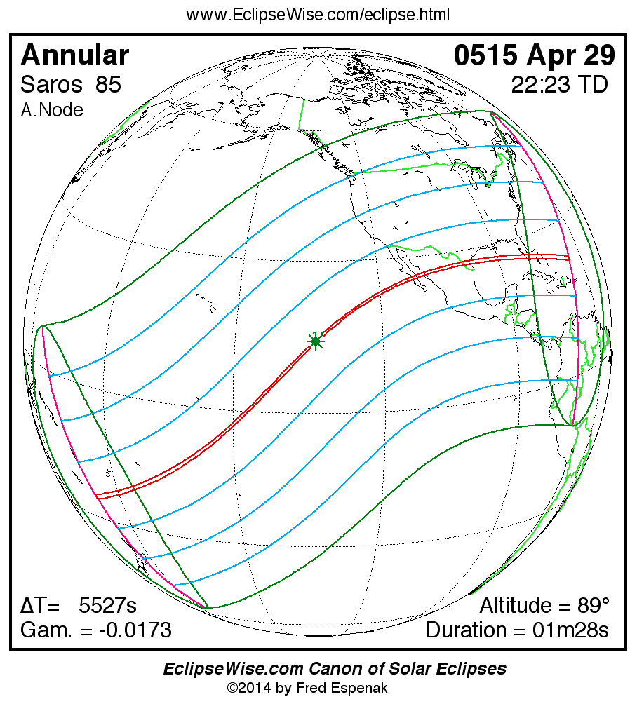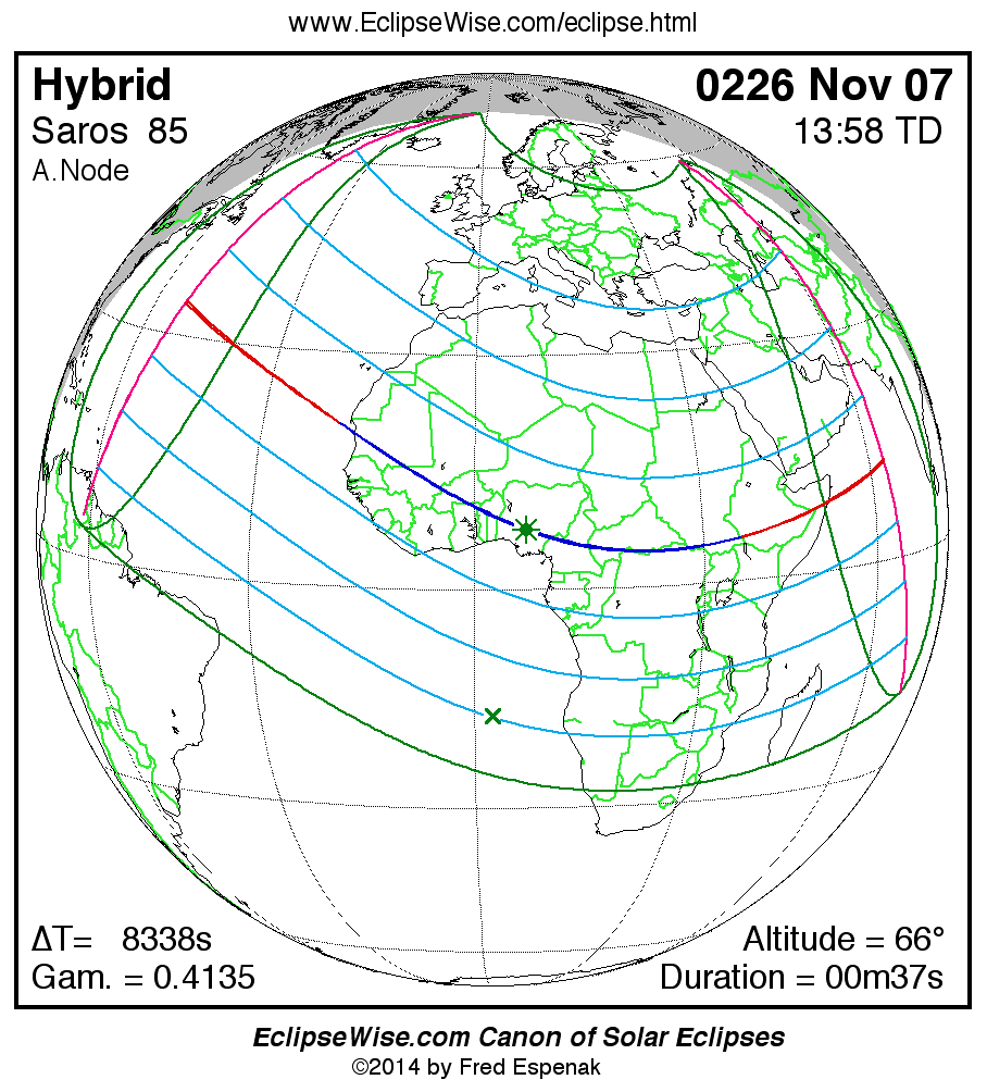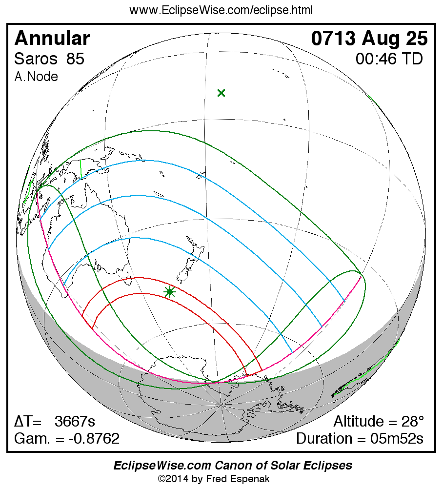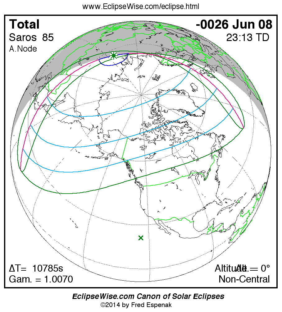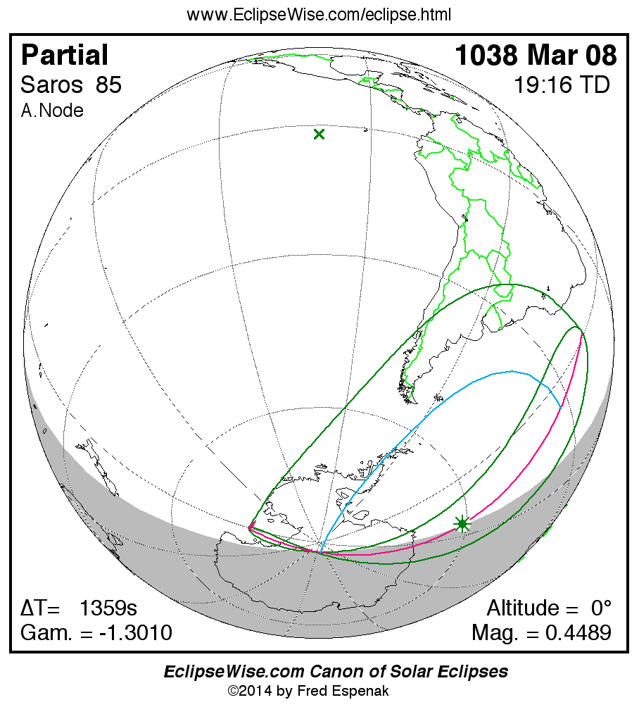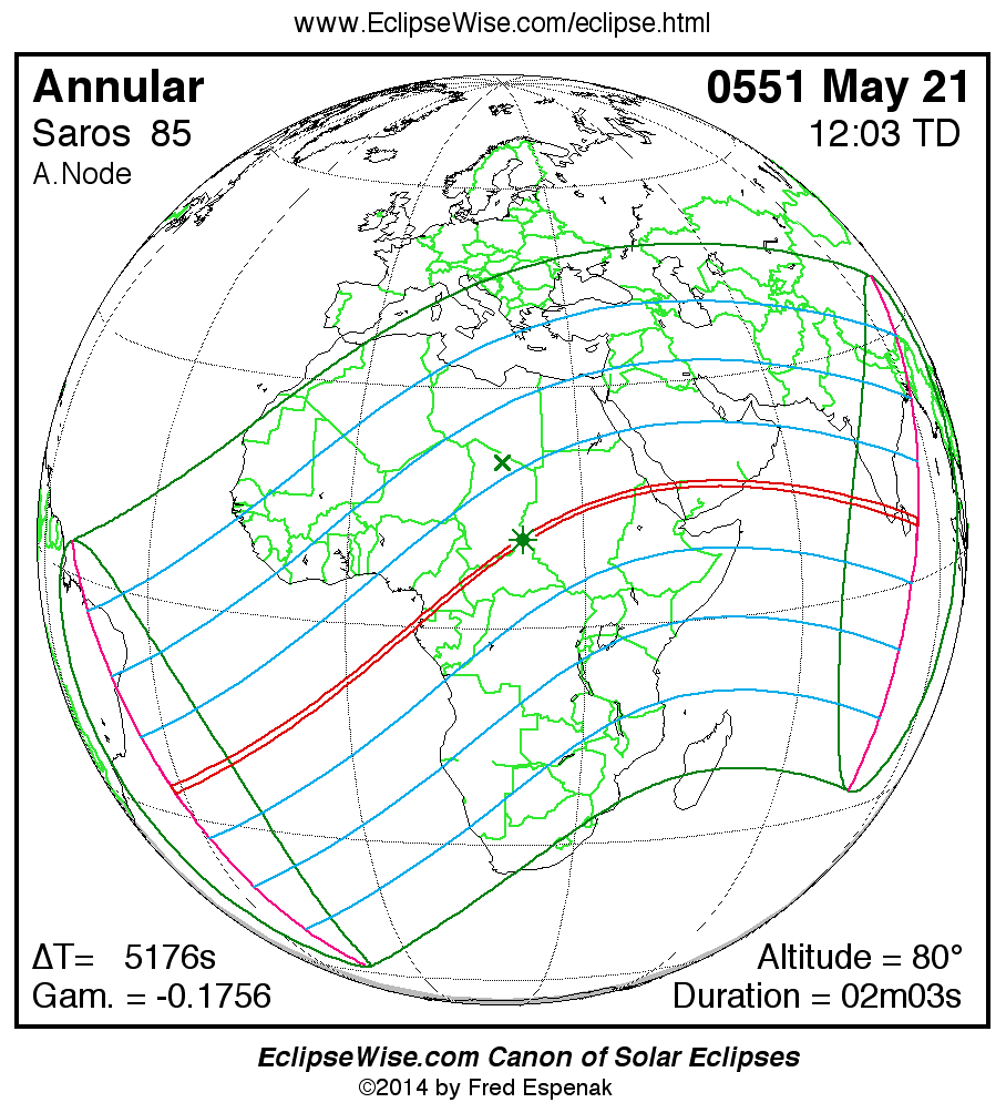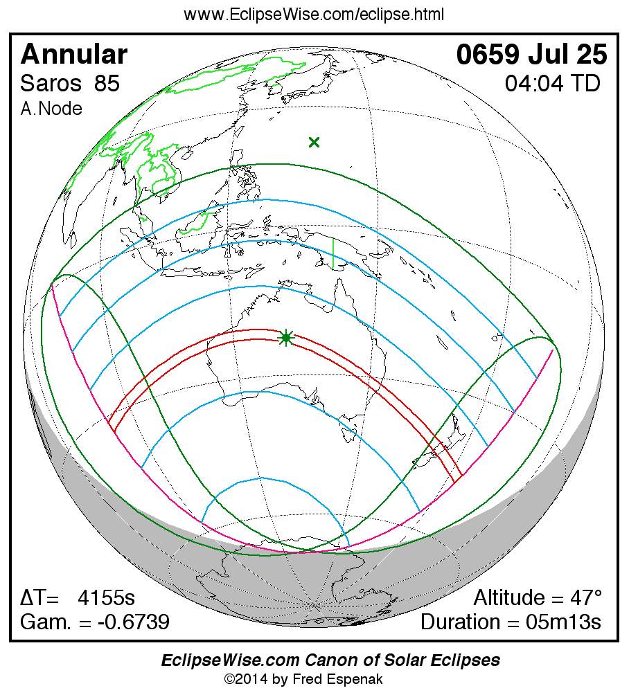 A panorama of all solar eclipses belonging to Saros 85 is presented here. Each map depicts the geographic region of visibility for a single eclipse. For central eclipses, the total or annular path is plotted in either blue (total) or red (annular). The date and time is given for the instant of Greatest Eclipse. Every map serves as a hyperlink to the EclipseWise Prime page for that eclipse where a larger map and complete details for the eclipse can be found. Visit the Key to Solar Eclipse Maps for a detailed explanation of these maps. Near the bottom of the page are a series of hyperlinks for more on solar eclipses.