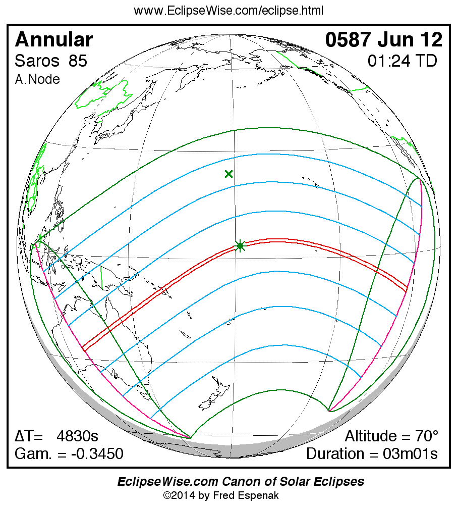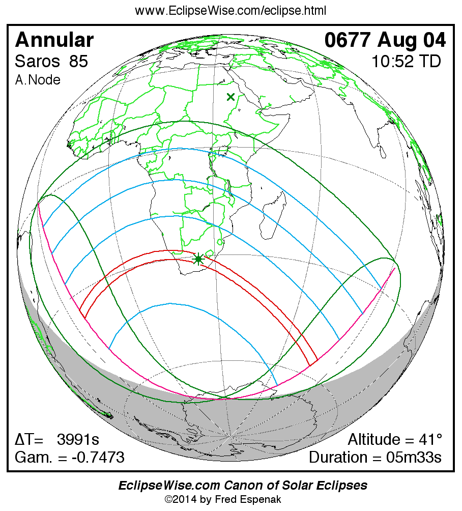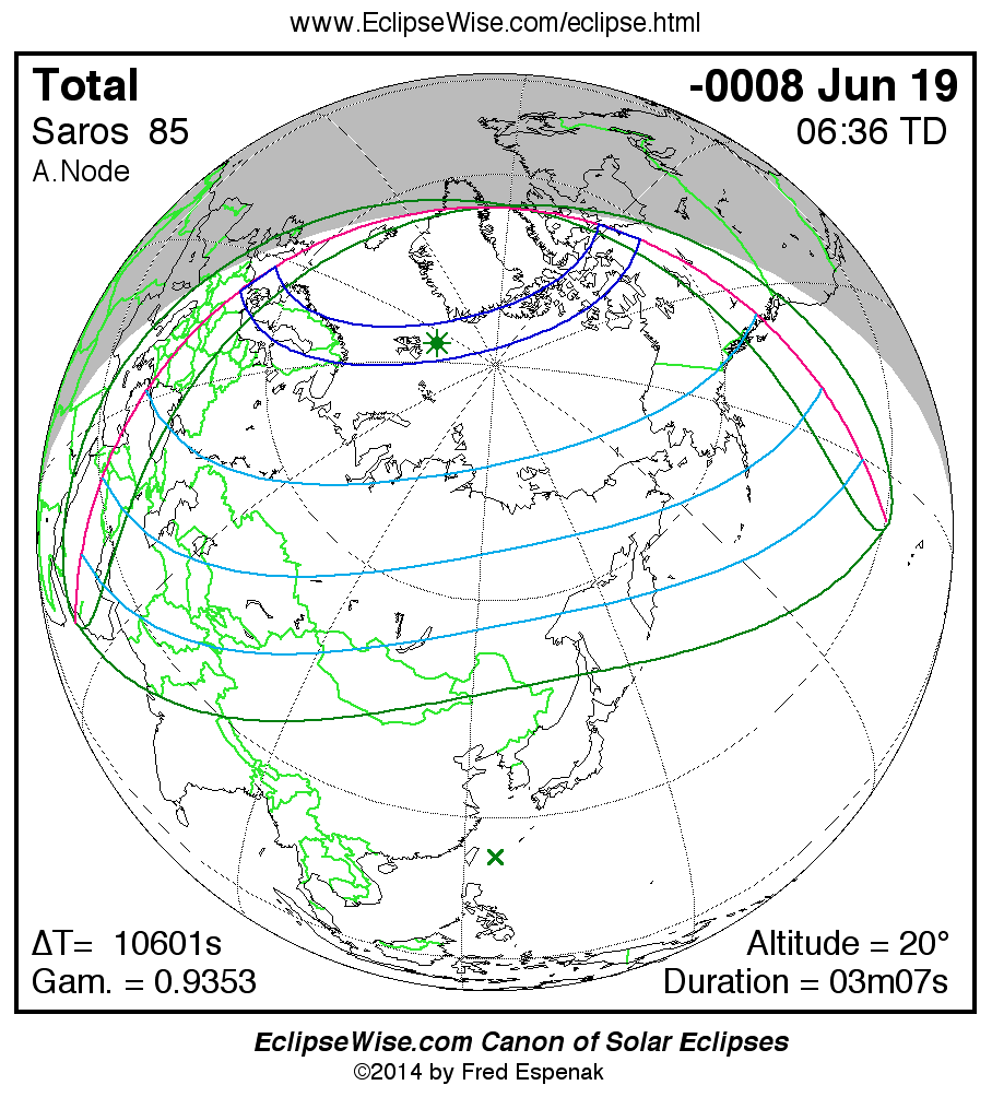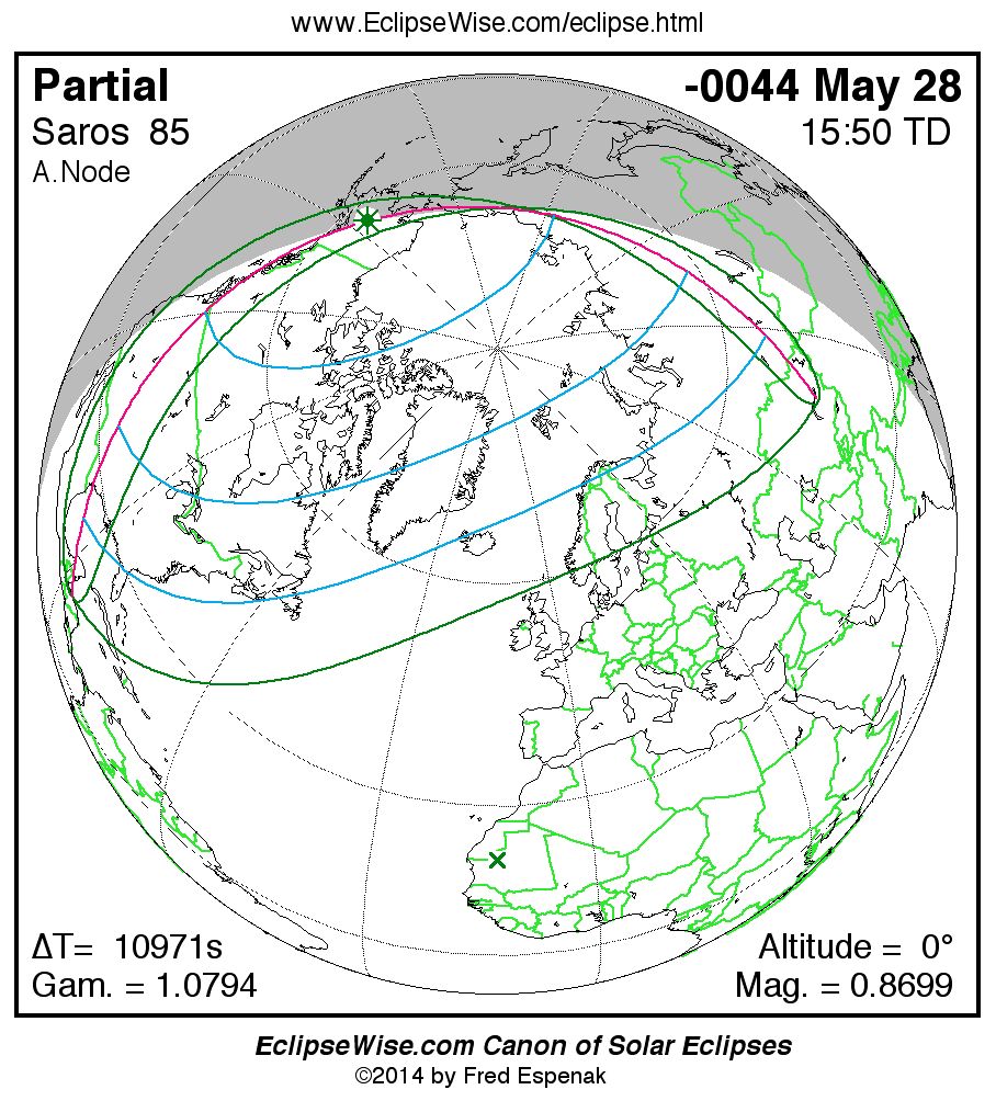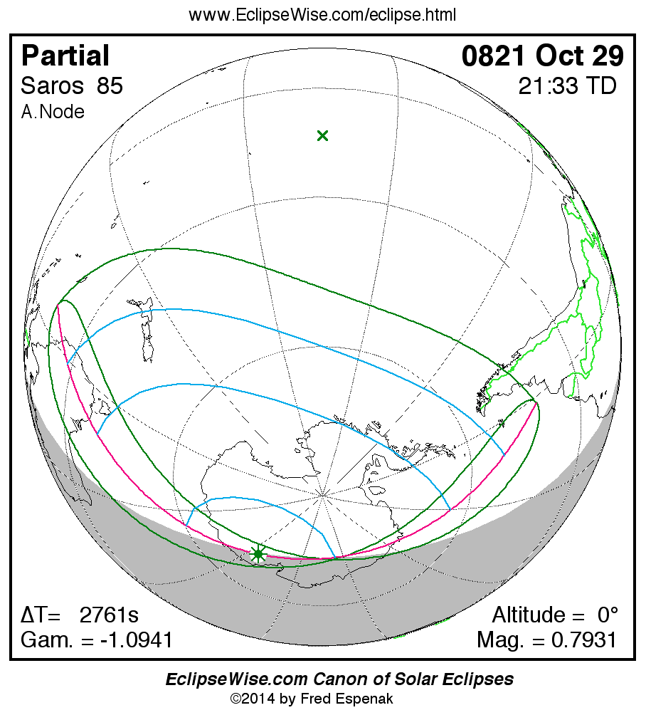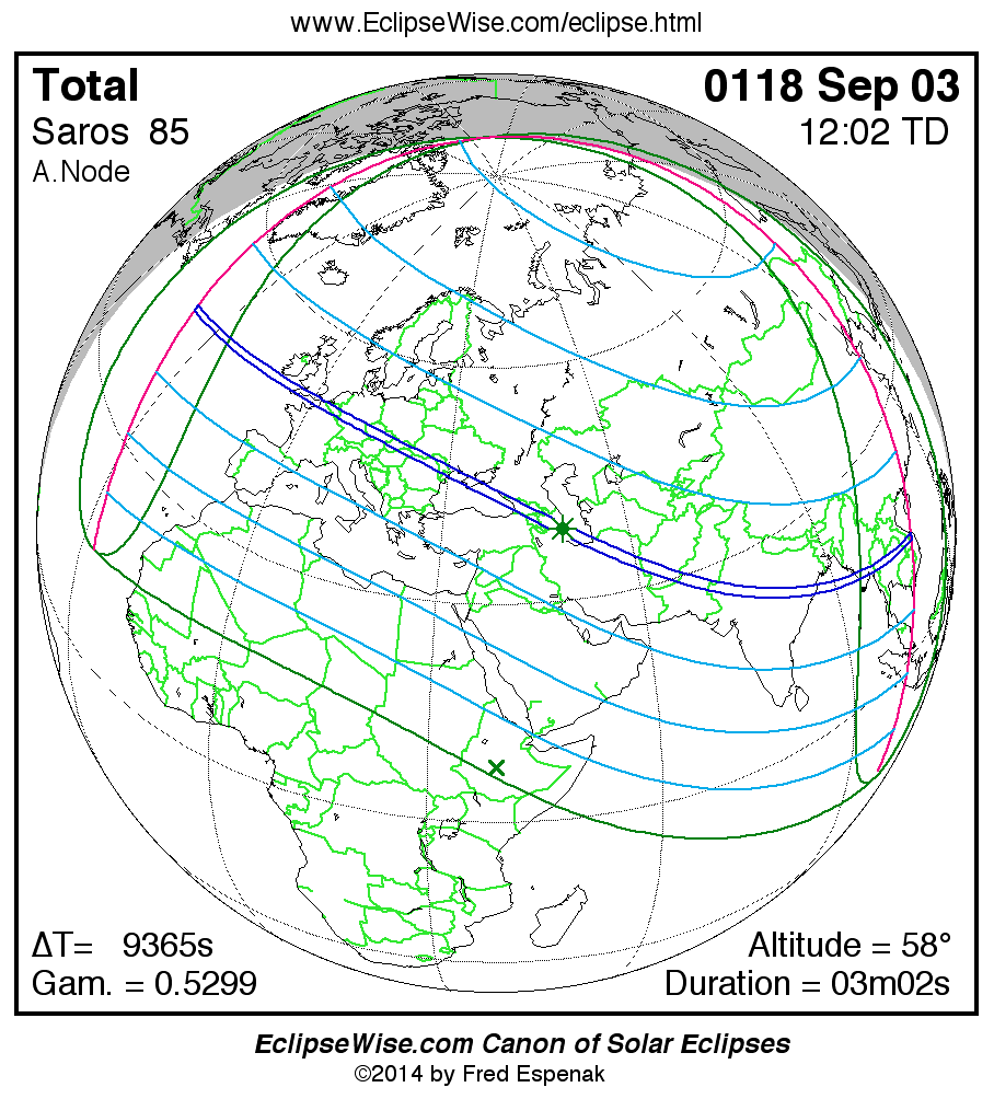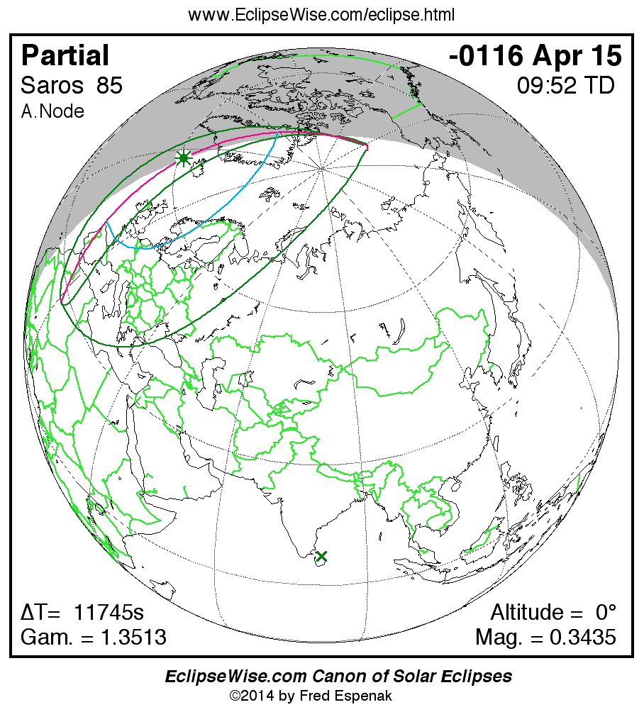 A panorama of all solar eclipses belonging to Saros 85 is presented here. Each map depicts the geographic region of visibility for a single eclipse. For central eclipses, the total or annular path is plotted in either blue (total) or red (annular). The date and time is given for the instant of Greatest Eclipse. Every map serves as a hyperlink to the EclipseWise Prime page for that eclipse where a larger map and complete details for the eclipse can be found. Visit the Key to Solar Eclipse Maps for a detailed explanation of these maps. Near the bottom of the page are a series of hyperlinks for more on solar eclipses.