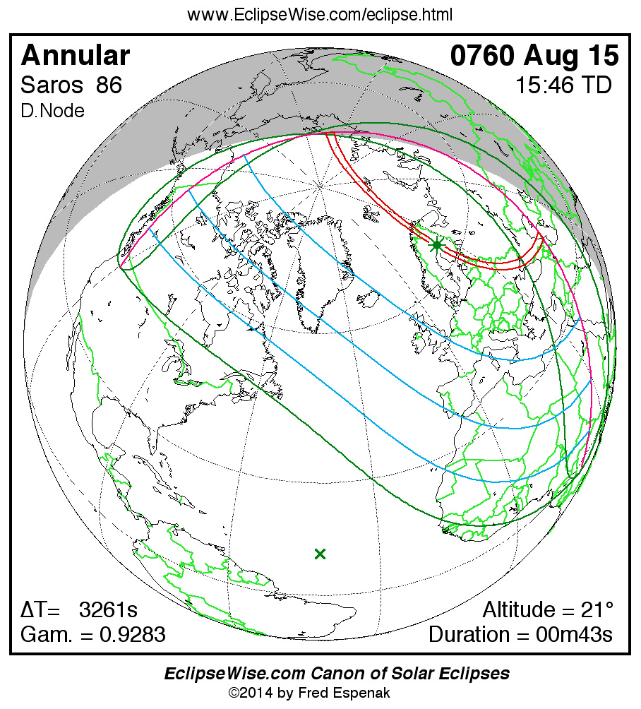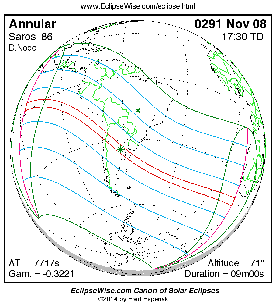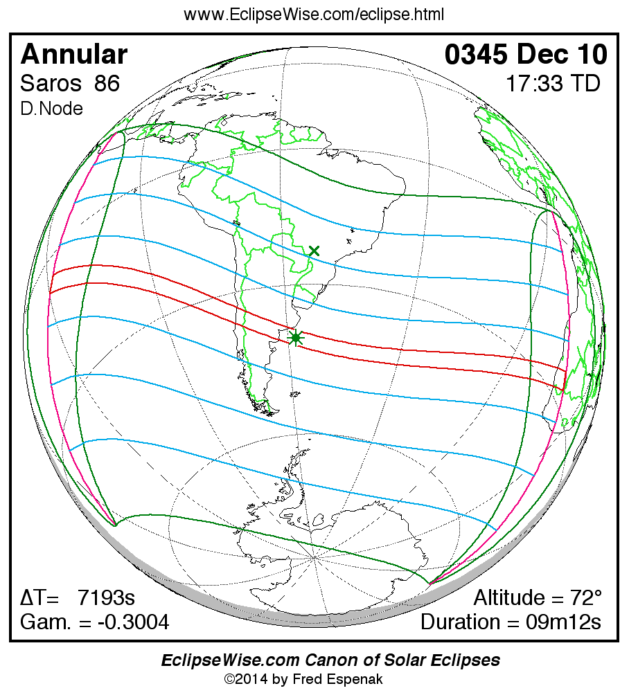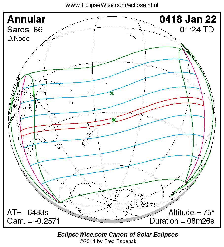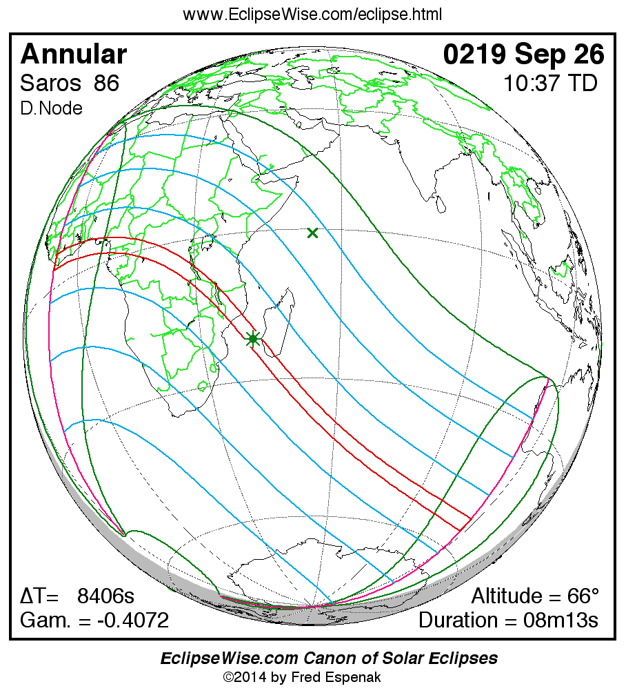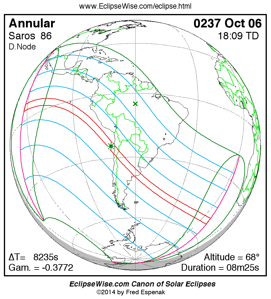 A panorama of all solar eclipses belonging to Saros 86 is presented here. Each map depicts the geographic region of visibility for a single eclipse. For central eclipses, the total or annular path is plotted in either blue (total) or red (annular). The date and time is given for the instant of Greatest Eclipse. Every map serves as a hyperlink to the EclipseWise Prime page for that eclipse where a larger map and complete details for the eclipse can be found. Visit the Key to Solar Eclipse Maps for a detailed explanation of these maps. Near the bottom of the page are a series of hyperlinks for more on solar eclipses.